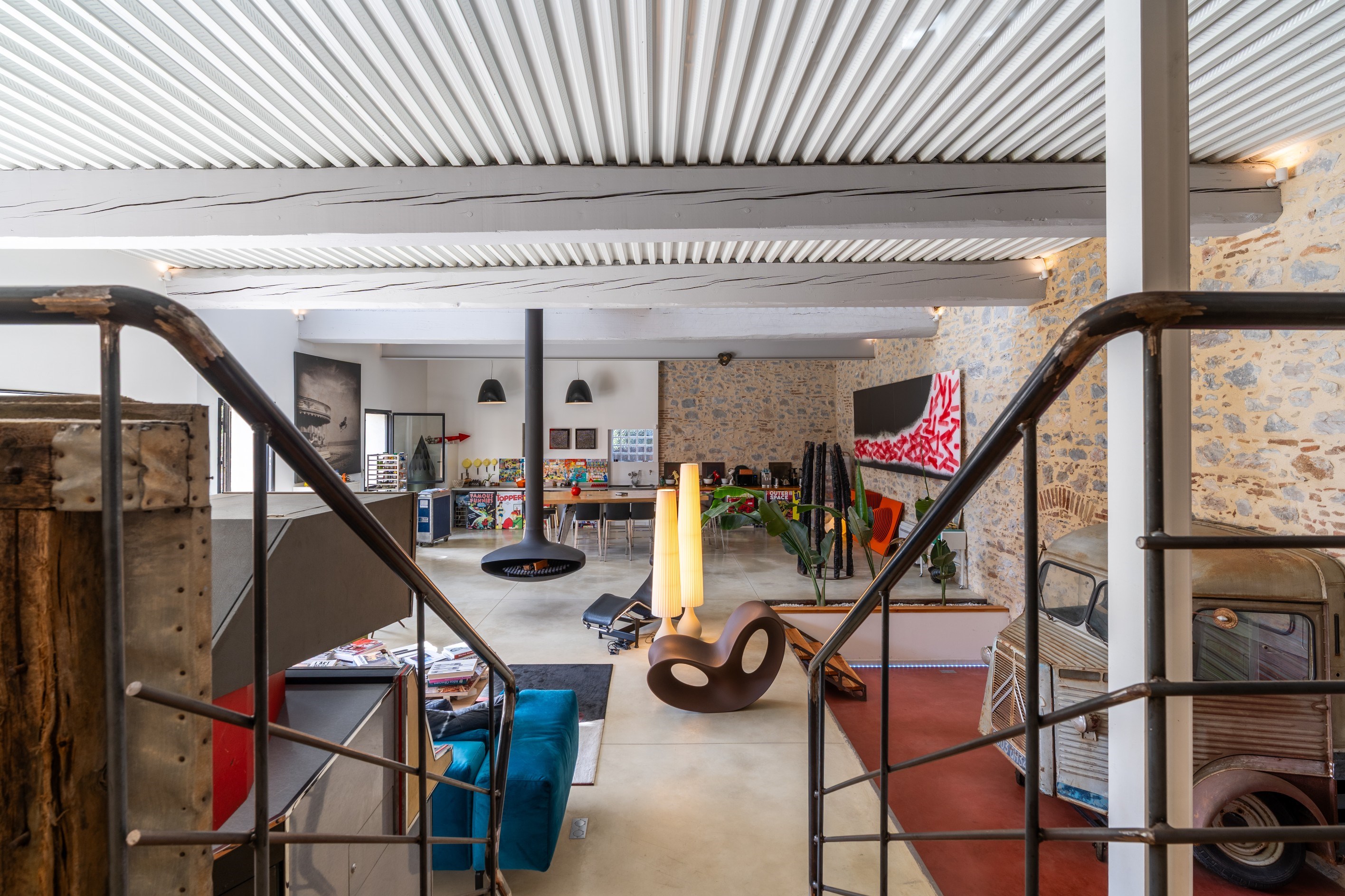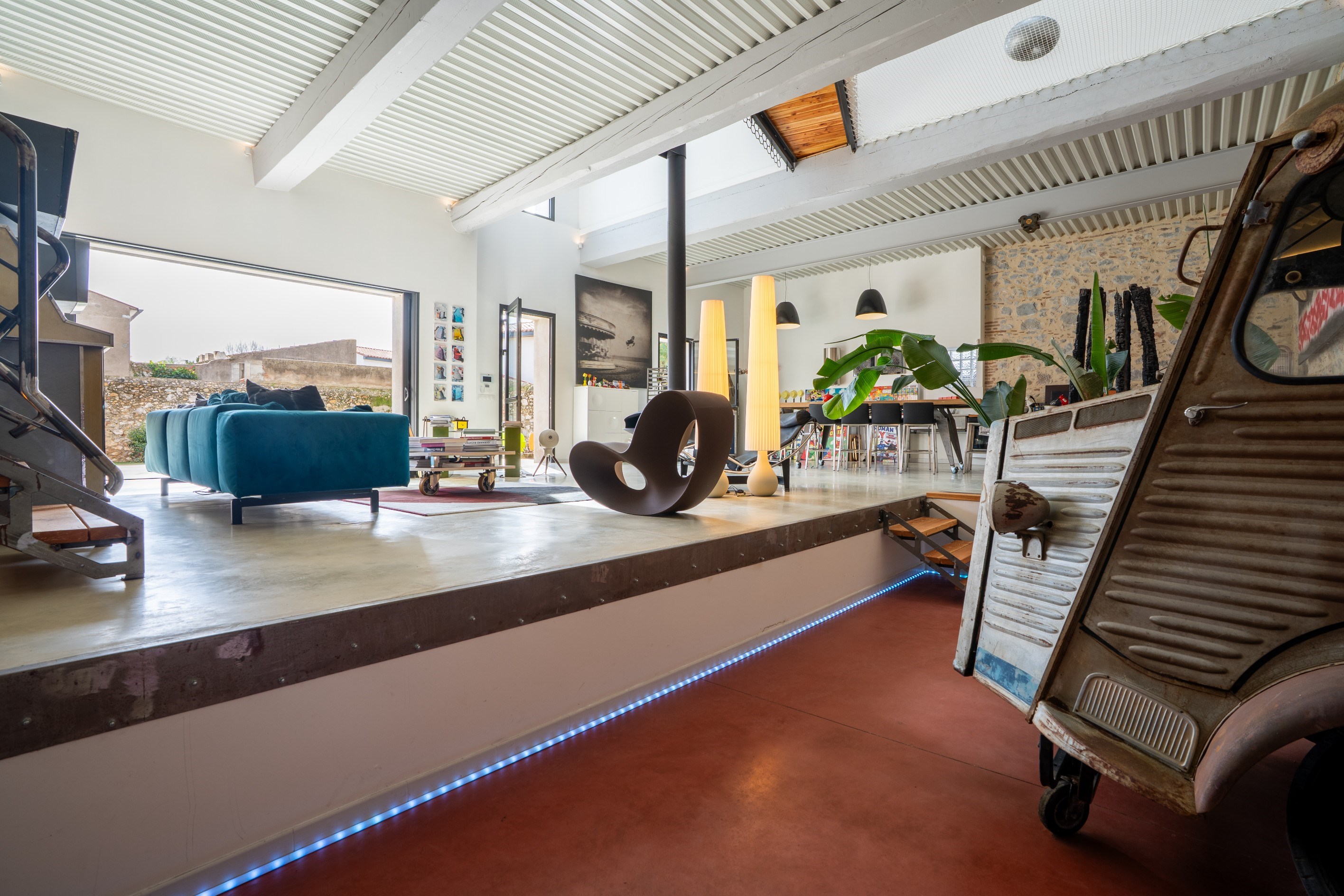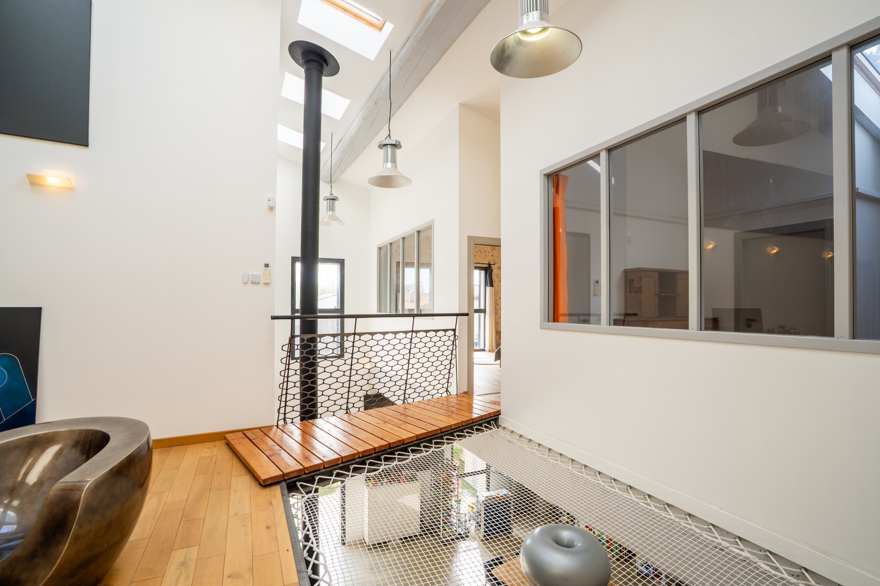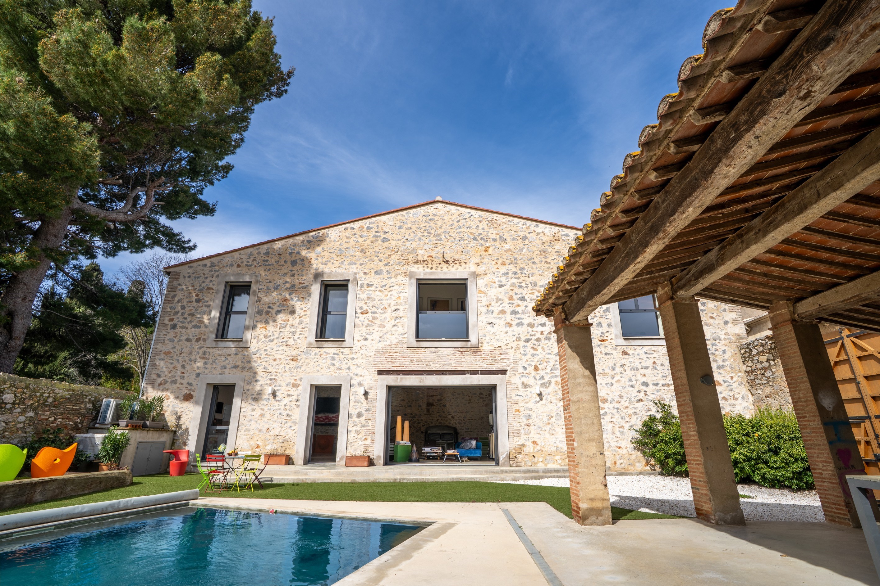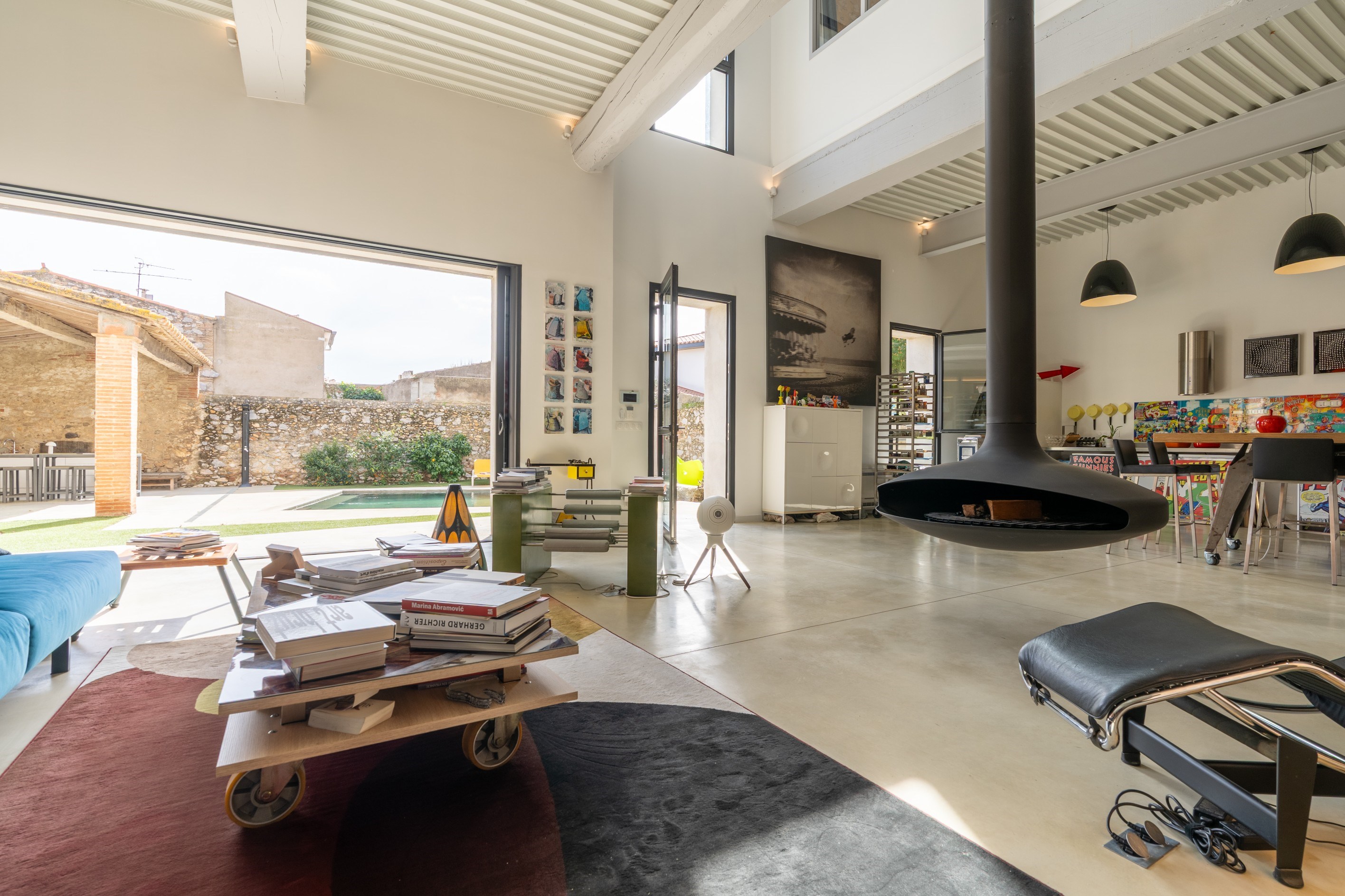 in the heart of a lively village, near the sea, offering all amenities, this former barn has been beautifully and meticulously renovated. It offers more than 375 sqm of living space, including a spectacular 200 sqm living area, full of character and style, set on a generous plot with swimming pool, covered summer kitchen, and complete privacy. The property also benefits from a large garage of over 60 sqm, comfortably accommodating three to four vehicles. The architecture successfully blends the soul of the original building with a contemporary spirit. The impressive volumes open onto a reception area of more than 200 sqm, where polished concrete floors interact with natural light, creating a warm and fluid living space that opens directly onto the sun-drenched terrace and pool area. Upstairs, the home features five spacious suites, a relaxation area for reading or TV, as well as a playful feature: a suspended net overlooking the living room more than 4 meters below. A rare property thanks to its recent high-quality renovation and its peaceful, private setting in the very center of the village.