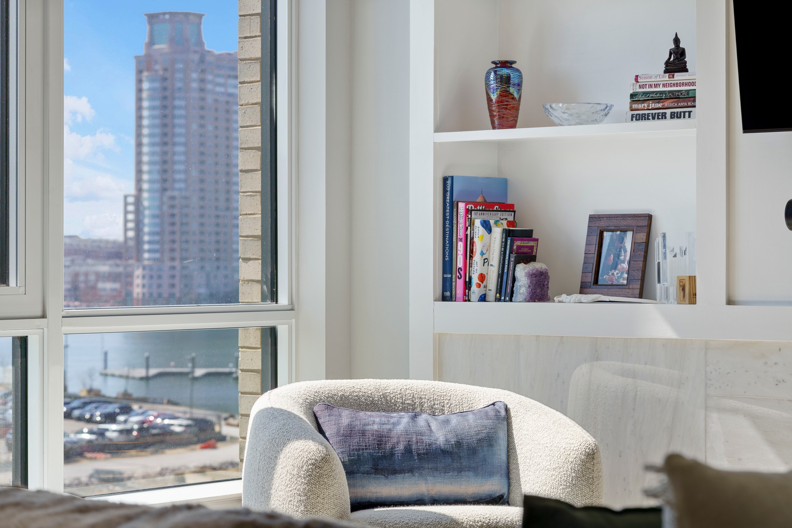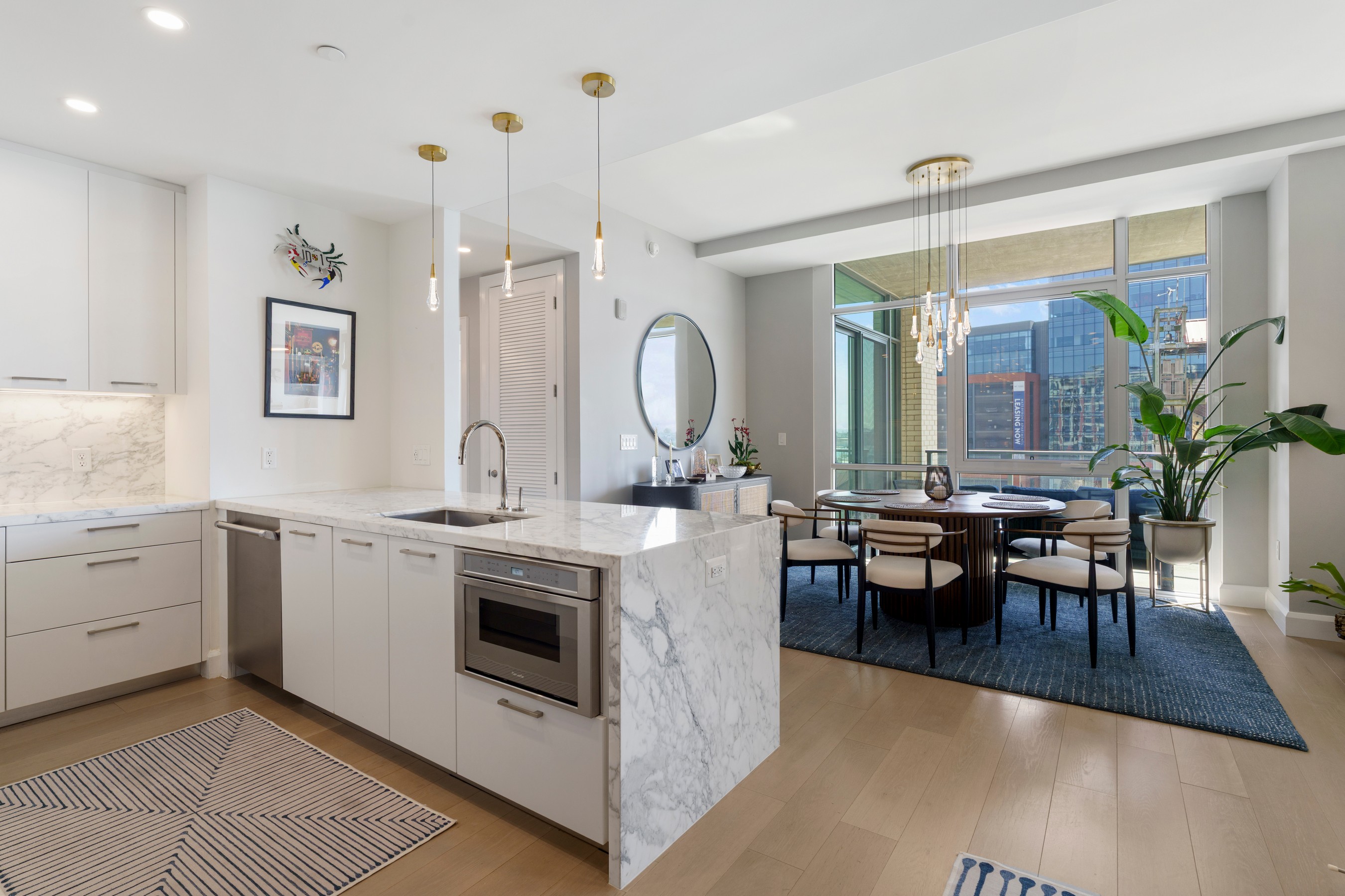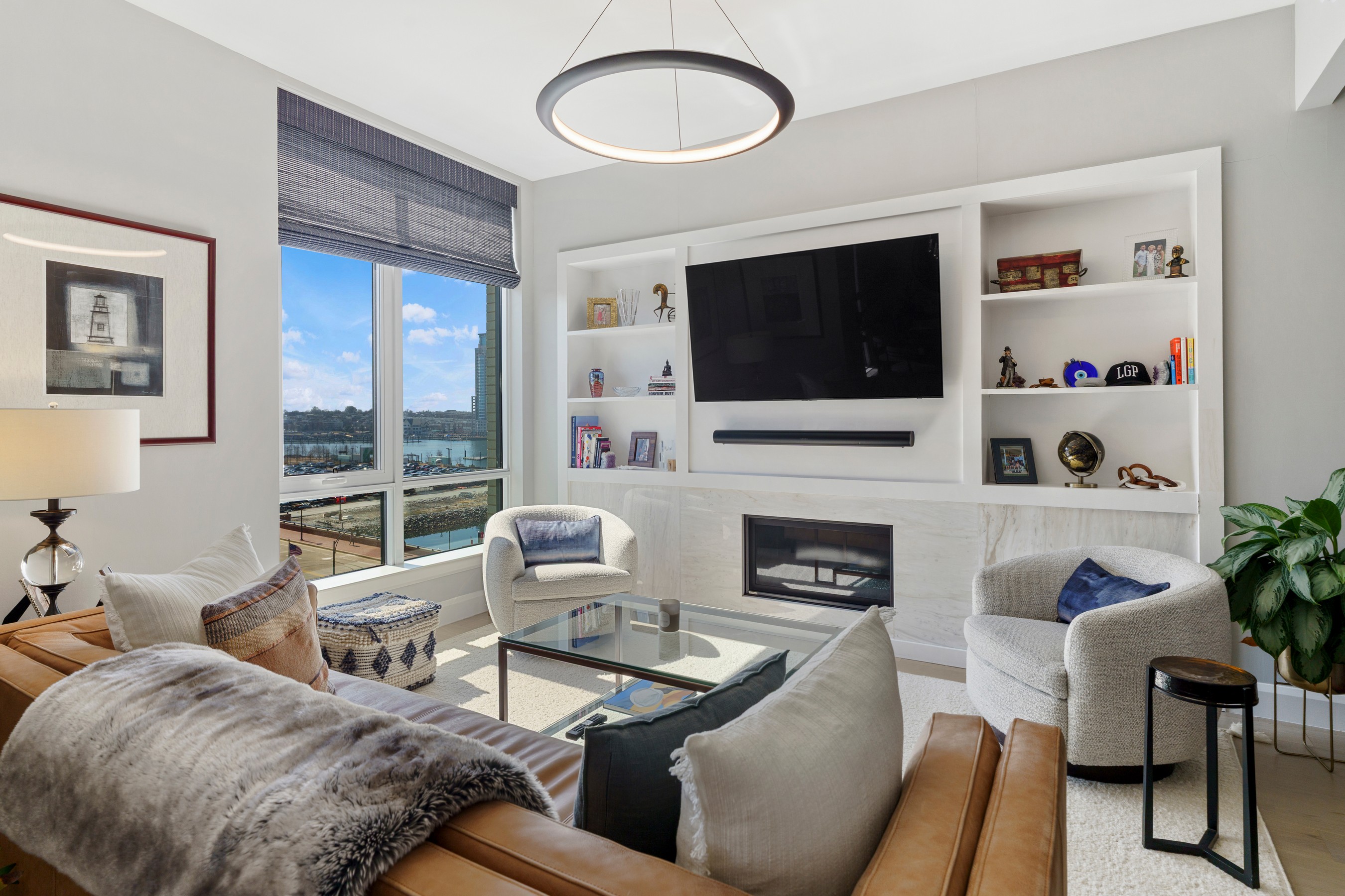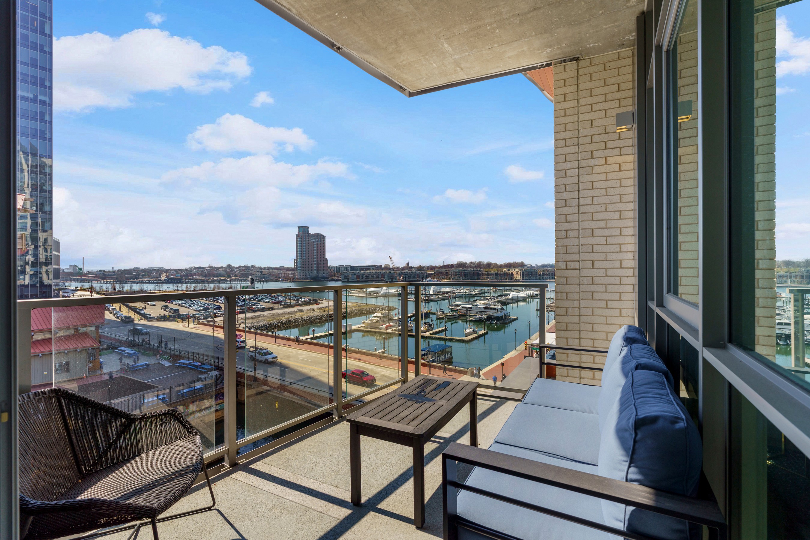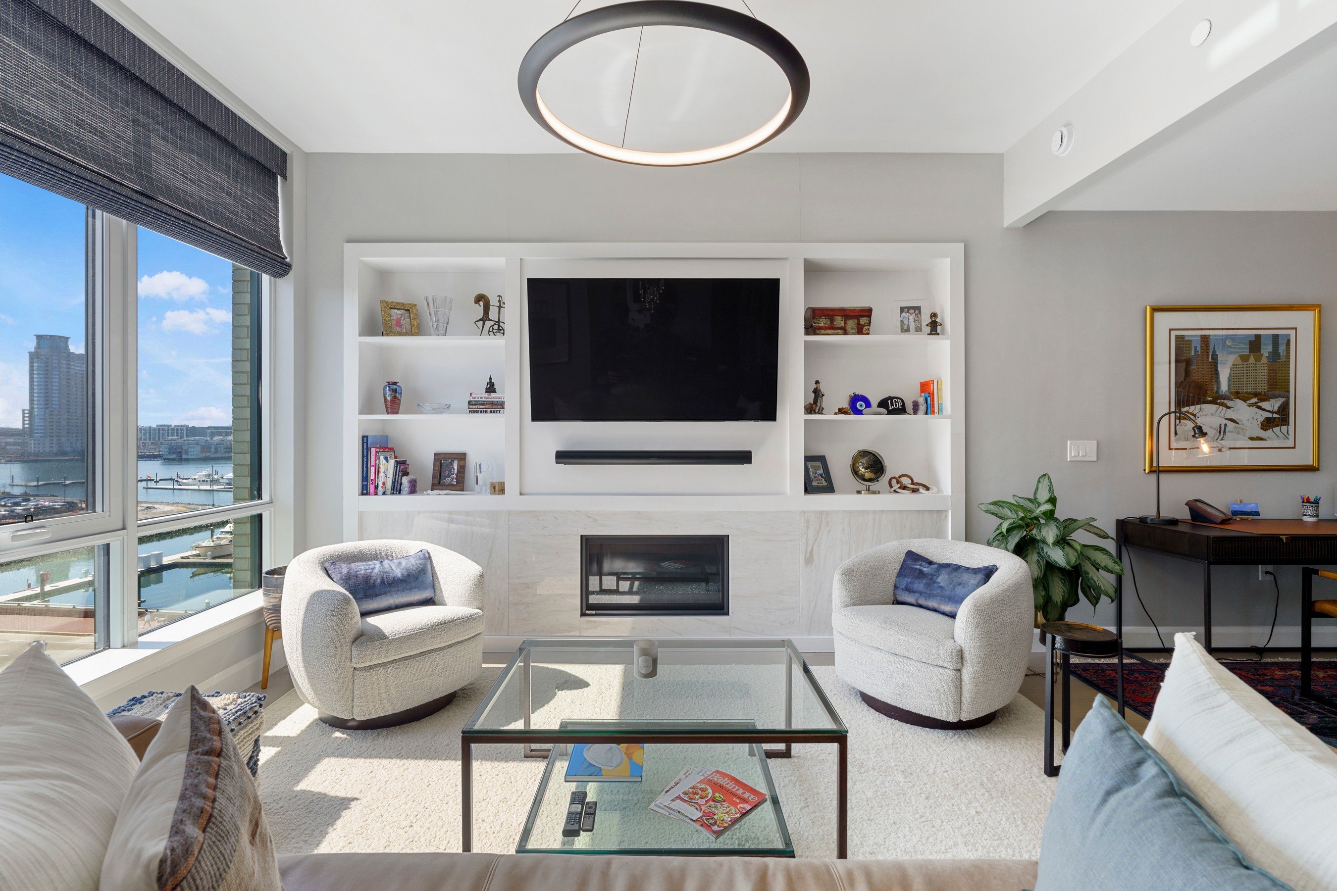 Welcome to waterfront, elevated city living at The Liberty Harbor East, one of the most sought-after boutique residences in Harbor East, where modern design meets vibrant waterfront energy. This extraordinary fifth-floor residence, built in 2019, offers 1,163 square feet of refined living space with one bedroom, one full bath, and a versatile den. Recently enhanced with thoughtful, high-end upgrades, the home now features fresh designer paint, new modern lighting with Lutron smart lighting system, and custom built-ins that elevate both style and functionality. The layout has been reimagined with the removal of the wall between the den and living area, creating an even more open and expansive living space, perfect for today's lifestyle. From the moment you enter, you're greeted by soaring ten-foot ceilings and dramatic floor-to-ceiling windows that flood the home with natural light while showcasing breathtaking southwest views of downtown Baltimore. New custom blinds, fully integrated with Alexa for smart home convenience, add both luxury and ease of living. The living and dining areas flow seamlessly into a chef's kitchen featuring sleek Italkraft cabinetry, premium Thermador appliances, and a striking Calacatta marble waterfall island, ideal for entertaining. Tucked privately beyond the foyer, the spacious primary suite has been elevated with a stunning custom wood-paneled accent wall and offers access to a private balcony overlooking the iconic Inner Harbor. The spa-inspired bath is a true retreat, featuring Carrara marble, Kallista and Kohler fixtures, an expansive walk-in shower, and a custom dual vanity, while the oversized walk-in closet provides abundant storage. Additional upgrades include a whole-house water filtration system and a new hot water heater, ensuring comfort and peace of mind. Residents of The Liberty enjoy a full suite of resort-style amenities, including a rooftop infinity pool with cabanas, a state-of-the-art fitness center and yoga studio, pet park with agility equipment, and beautifully designed social spaces such as a clubroom with indoor and outdoor bar, private dining rooms, and a concierge lounge. Additional conveniences include a secure package room, ButterflyMX smart intercom system, conference rooms, EV charging stations, and garage parking availability. Adding to the unmatched lifestyle, The Liberty offers direct access to a flagship Whole Foods Market, making everyday living effortless. Just steps away, Harbor East is home to some of Baltimore's finest dining, boutique shopping, and scenic waterfront promenades, placing the very best of the city right outside your door. This is more than a home, it's a lifestyle defined by luxury, convenience, and sophistication in one of Baltimore's premier waterfront communities.