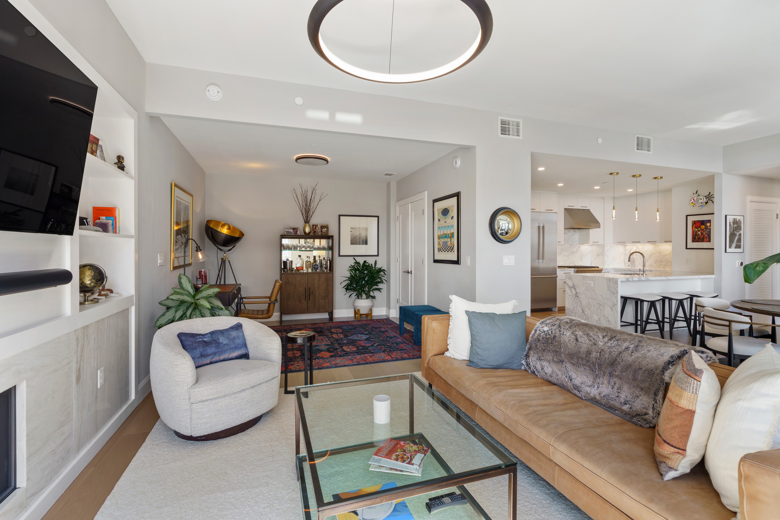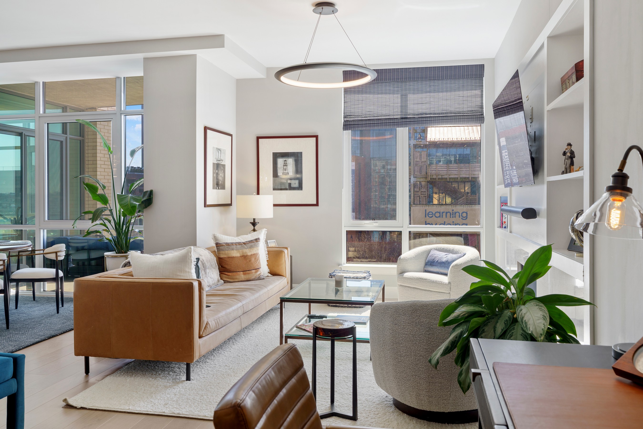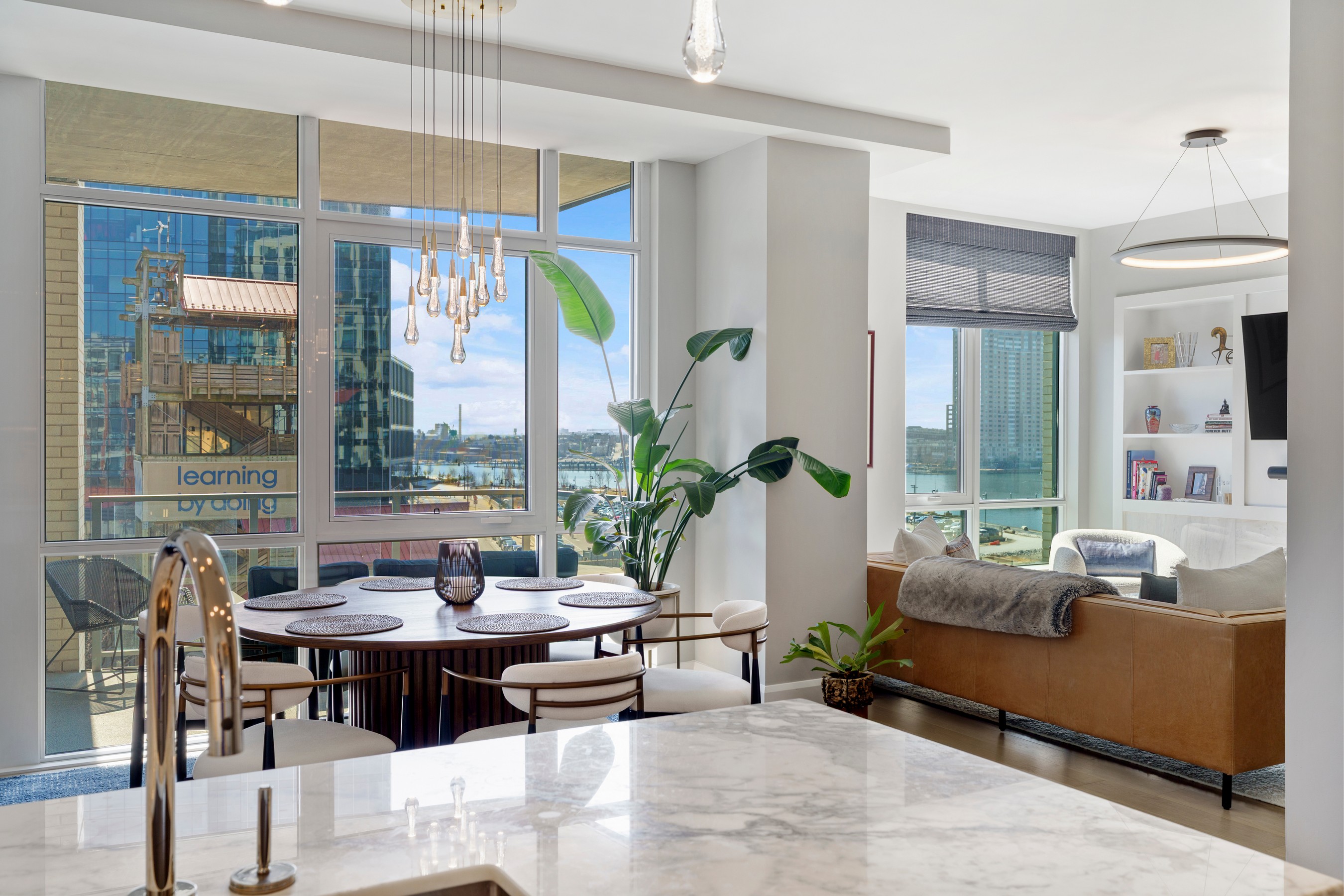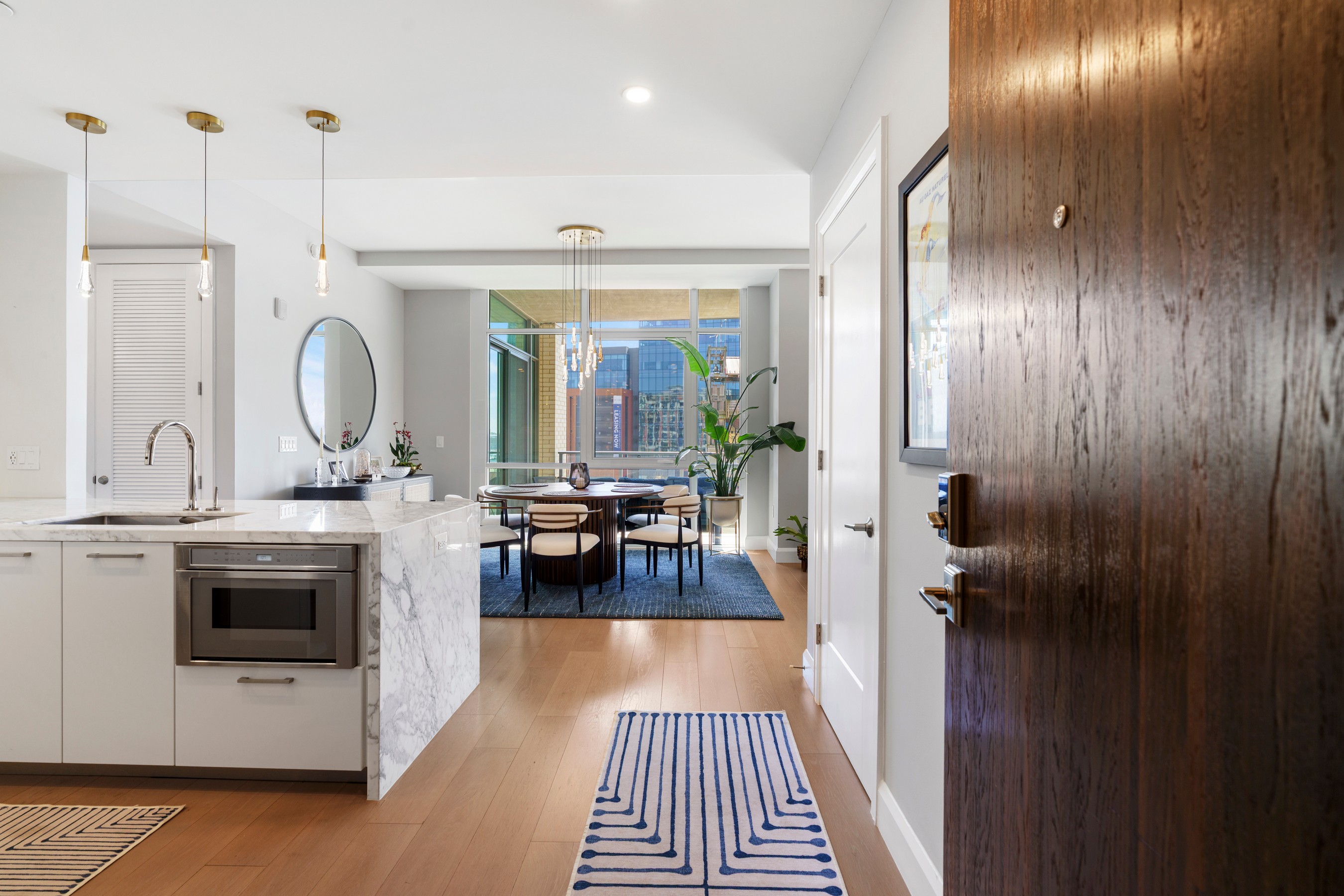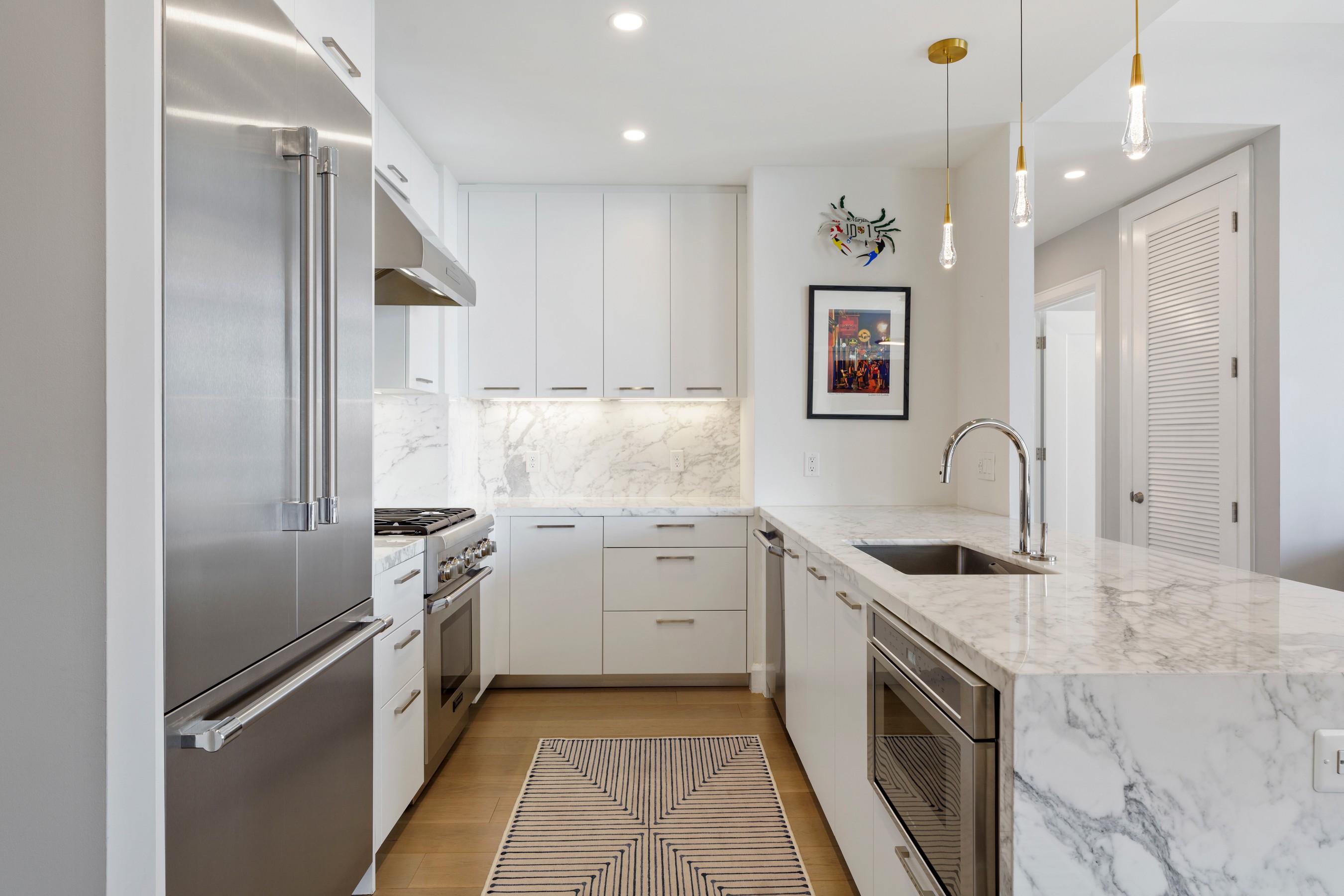 Welcome to waterfront, elevated city living at The Liberty Harbor East, one of the most sought-after boutique residences in Harbor East, where modern design meets vibrant waterfront energy. This extraordinary fifth-floor residence, built in 2019, offers 1,163 square feet of refined living space with one bedroom, one full bath, and a versatile den. Recently enhanced with thoughtful, high-end upgrades, the home now features fresh designer paint, new modern lighting with Lutron smart lighting system, and custom built-ins that elevate both style and functionality. The layout has been reimagined with the removal of the wall between the den and living area, creating an even more open and expansive living space, perfect for today's lifestyle. From the moment you enter, you're greeted by soaring ten-foot ceilings and dramatic floor-to-ceiling windows that flood the home with natural light while showcasing breathtaking southwest views of downtown Baltimore. New custom blinds, fully integrated with Alexa for smart home convenience, add both luxury and ease of living. The living and dining areas flow seamlessly into a chef's kitchen featuring sleek Italkraft cabinetry, premium Thermador appliances, and a striking Calacatta marble waterfall island, ideal for entertaining. Tucked privately beyond the foyer, the spacious primary suite has been elevated with a stunning custom wood-paneled accent wall and offers access to a private balcony overlooking the iconic Inner Harbor. The spa-inspired bath is a true retreat, featuring Carrara marble, Kallista and Kohler fixtures, an expansive walk-in shower, and a custom dual vanity, while the oversized walk-in closet provides abundant storage. Additional upgrades include a whole-house water filtration system and a new hot water heater, ensuring comfort and peace of mind. Residents of The Liberty enjoy a full suite of resort-style amenities, including a rooftop infinity pool with cabanas, a state-of-the-art fitness center and yoga studio, pet park with agility equipment, and beautifully designed social spaces such as a clubroom with indoor and outdoor bar, private dining rooms, and a concierge lounge. Additional conveniences include a secure package room, ButterflyMX smart intercom system, conference rooms, EV charging stations, and garage parking availability. Adding to the unmatched lifestyle, The Liberty offers direct access to a flagship Whole Foods Market, making everyday living effortless. Just steps away, Harbor East is home to some of Baltimore's finest dining, boutique shopping, and scenic waterfront promenades, placing the very best of the city right outside your door. This is more than a home, it's a lifestyle defined by luxury, convenience, and sophistication in one of Baltimore's premier waterfront communities.
