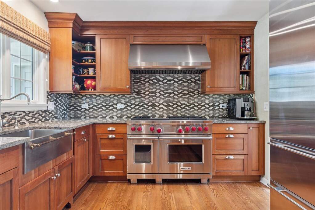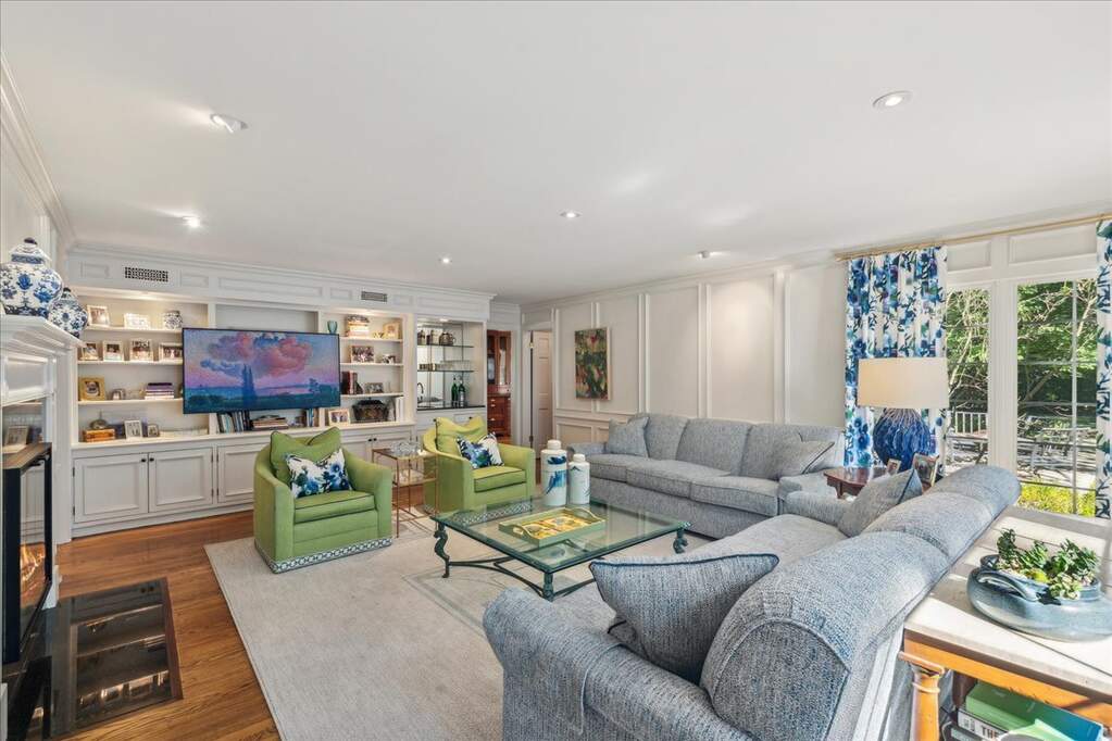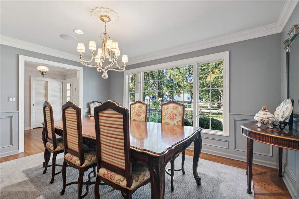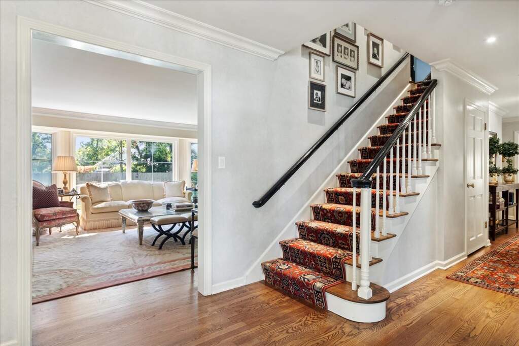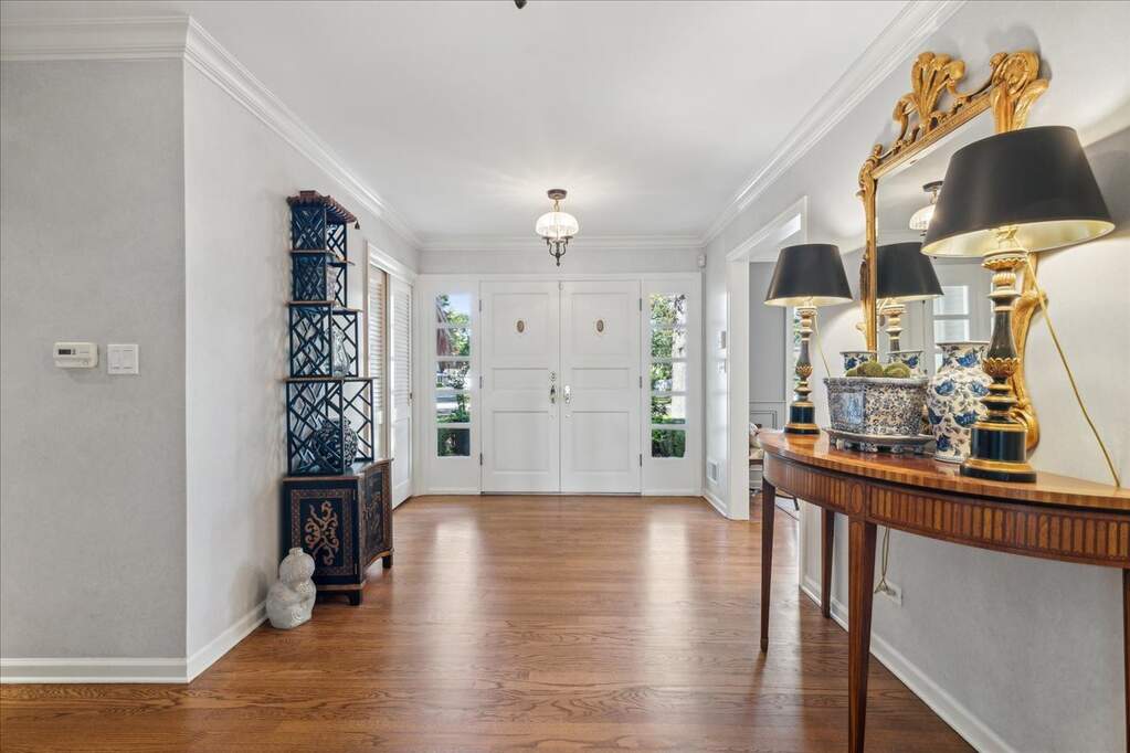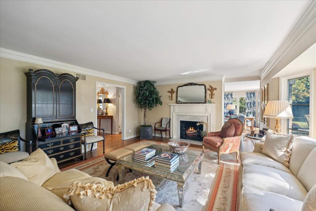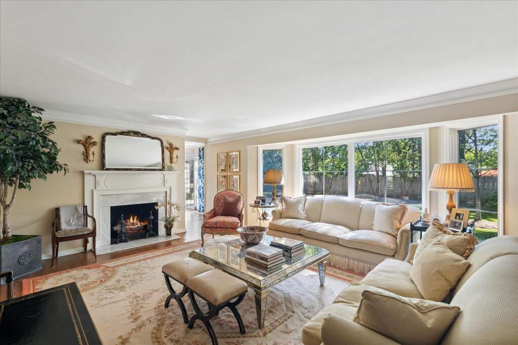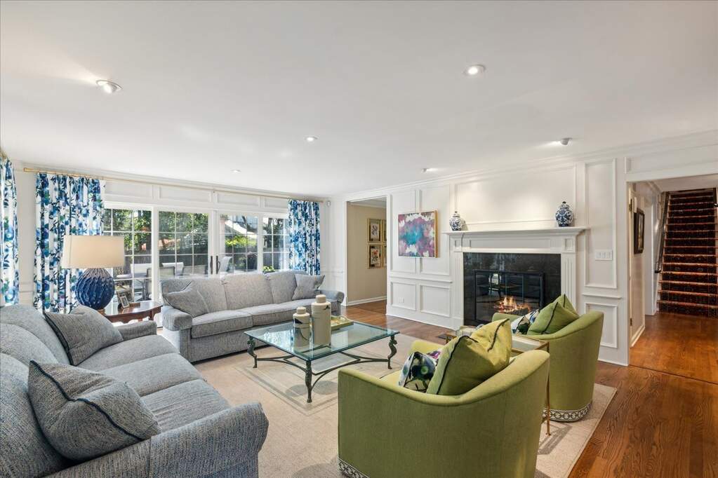 Set on over an acre with a graceful circular driveway, this beautifully updated residence blends timeless elegance with modern livability. Sun-filled interiors showcase hardwood floors, custom moldings, and refined architectural details throughout. The welcoming foyer opens to an inviting living room with fireplace and an elegant dining room, creating wonderful spaces for everyday living and entertaining. The remodeled family room features built-in cabinetry, a fireplace, and sliding doors that open to the patio for seamless indoor-outdoor living. The kitchen is appointed with high-end stainless steel appliances and designed for both casual meals and inspired cooking. The home lives beautifully like a ranch with a first-floor primary suite and two additional bedrooms. Two more bedrooms upstairs bring the total to five, offering flexible space for family, guests, or a home office. A finished basement with a spacious recreation room provides additional room to relax or entertain. Meticulously maintained and move-in ready, all in a convenient location near town, shopping, and restaurants.