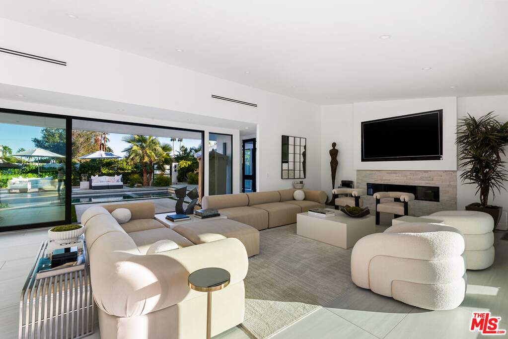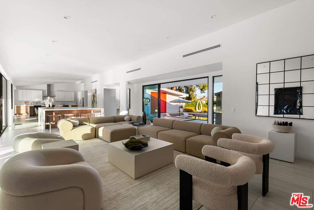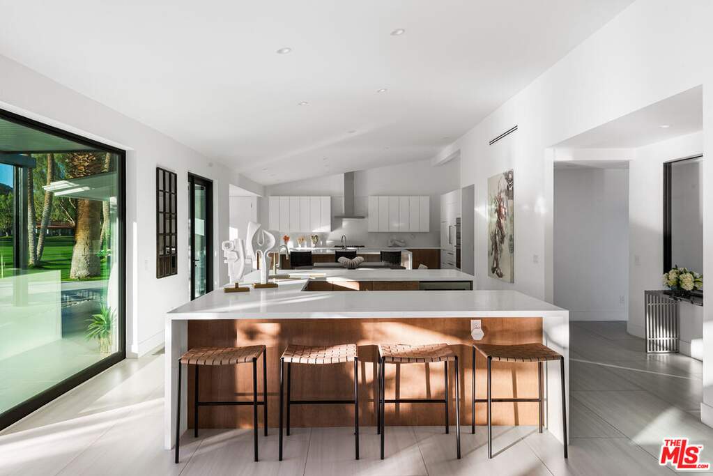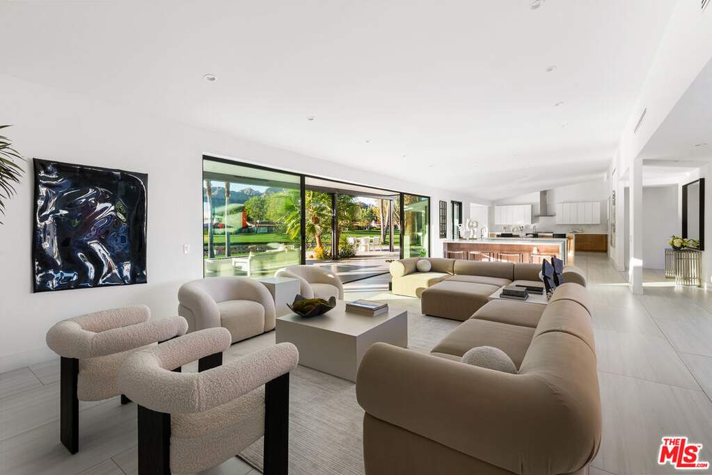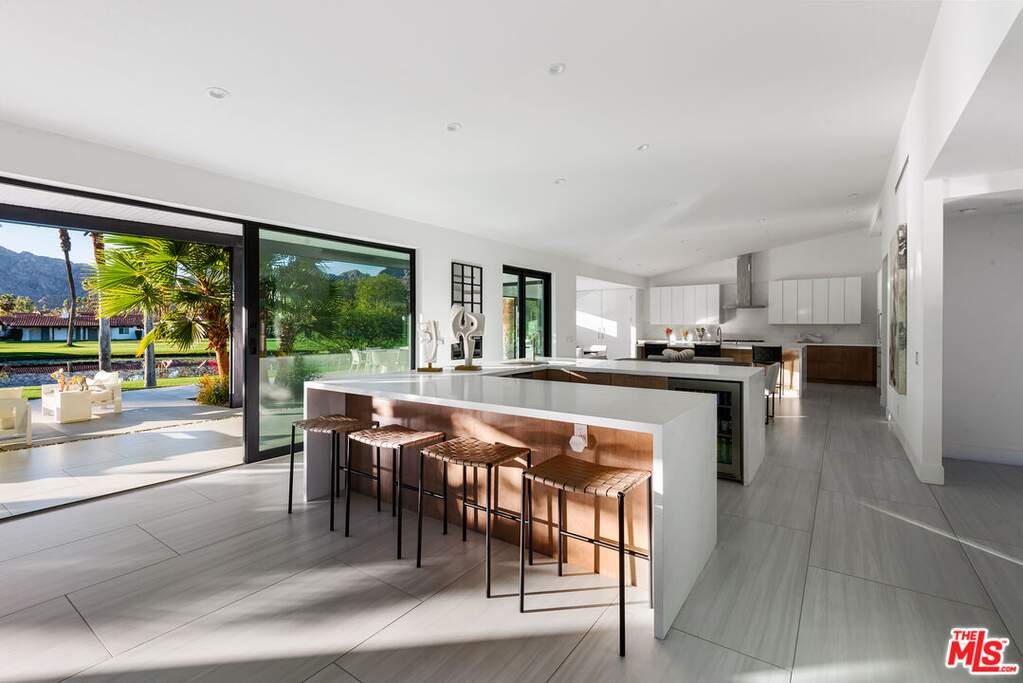This contemporary desert masterpiece seamlessly blends modern luxury with wellness focused living. Set on a rare double lot overlooking the 4th fairway of The La Quinta Country Club, this nearly 5,000 square foot retreat offers five en suite bedrooms, six baths, and sweeping mountain views. Originally built in 1970, this iconic Steve Chase residence has been thoughtfully reimagined with sleek finishes and state of the art upgrades throughout. Expansive Fleetwood sliding doors create effortless indoor outdoor living, opening to a private courtyard featuring a saltwater pool with tanning ledge, four fountain features, spa, cold plunge, and infrared sauna. The chef's kitchen is equipped with Thermador appliances including double ovens, dual dishwashers, a gas cooktop, and built in refrigerator, complemented by European cabinetry and a walk-in pantry. A sophisticated wet bar with wine refrigerator, ice maker, and dual beverage refrigerators makes entertaining both elegant and effortless. Two spacious guest suites are located in the southern wing, while the northern wing hosts the primary suite along with two additional suites, ideal for use as a den, office, or media room. The primary suite is a true sanctuary, offering a soaking tub, oversized shower, steam shower, private outdoor spa and garden, and a custom walk-in closet. Offered turnkey, this architectural gem delivers luxurious amenities, impeccable design, and breathtaking views. The expansive double lot of nearly half an acre provides ample space for a casita, ADU, or secondary garage, making this an exceptional opportunity within one of the Coachella Valley's most coveted golf communities.