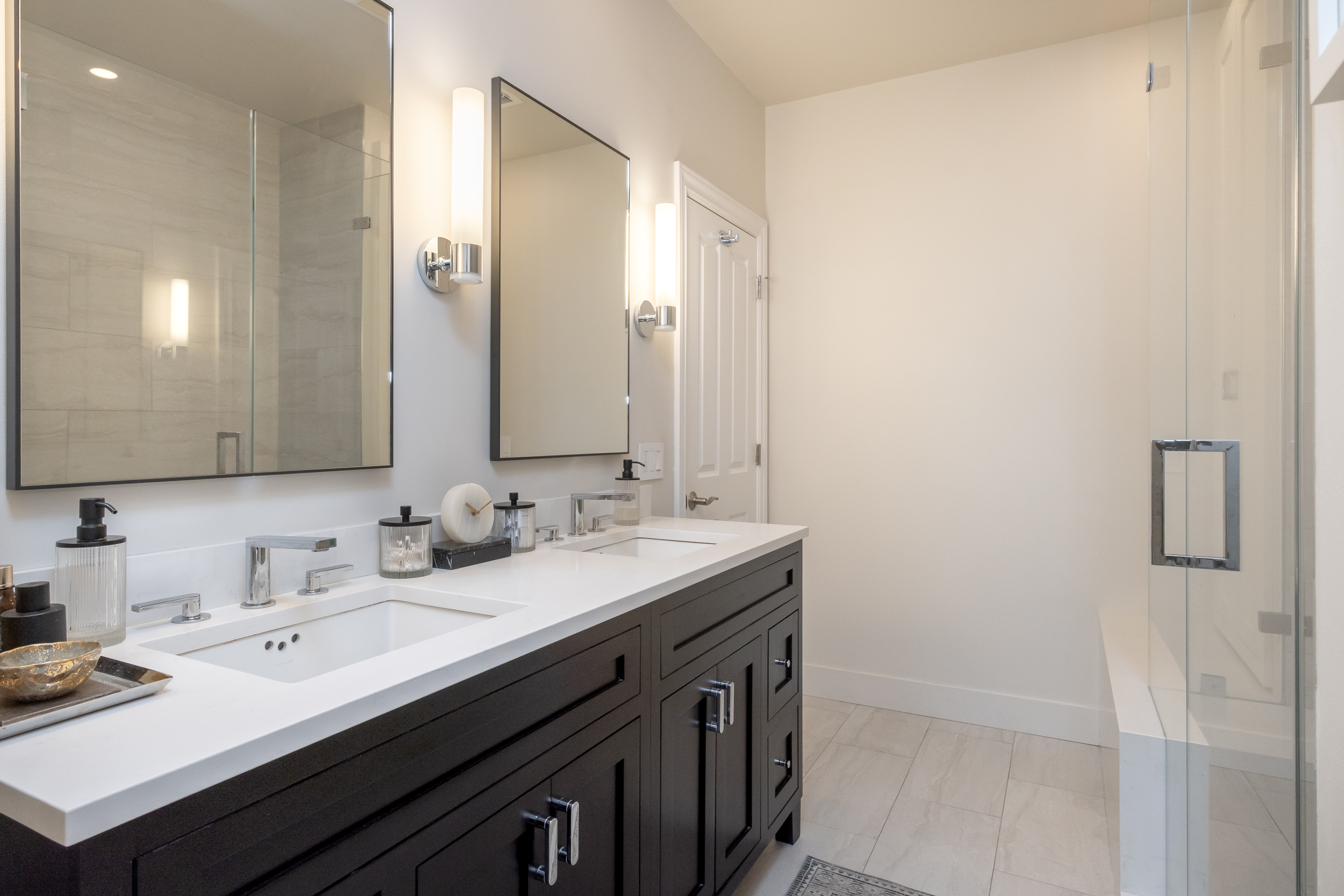 with double vanity, quartz countertops, custom glass shower doors, and linen/laundry storage