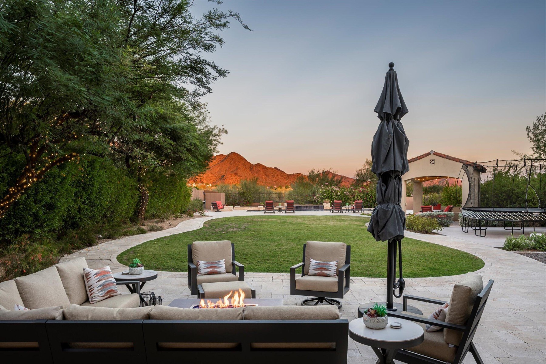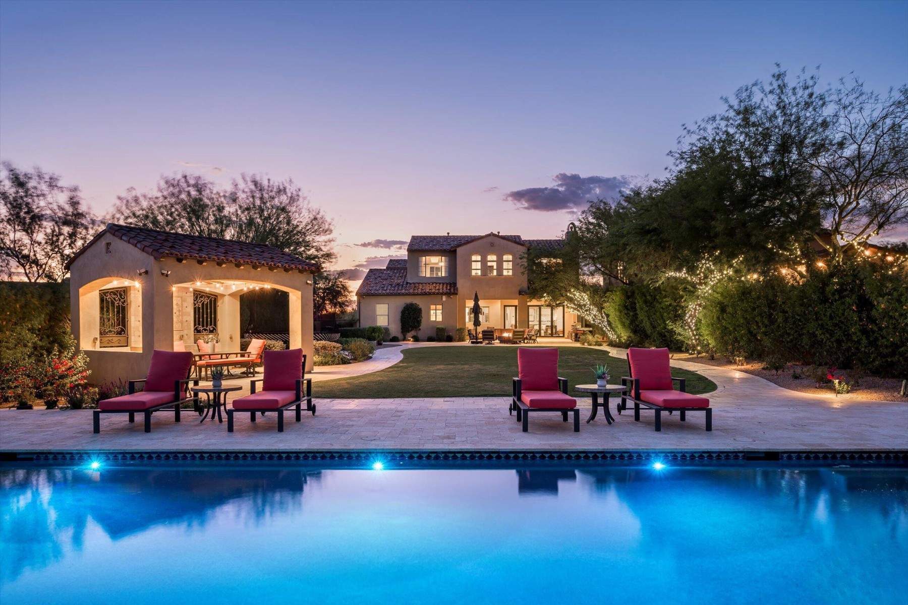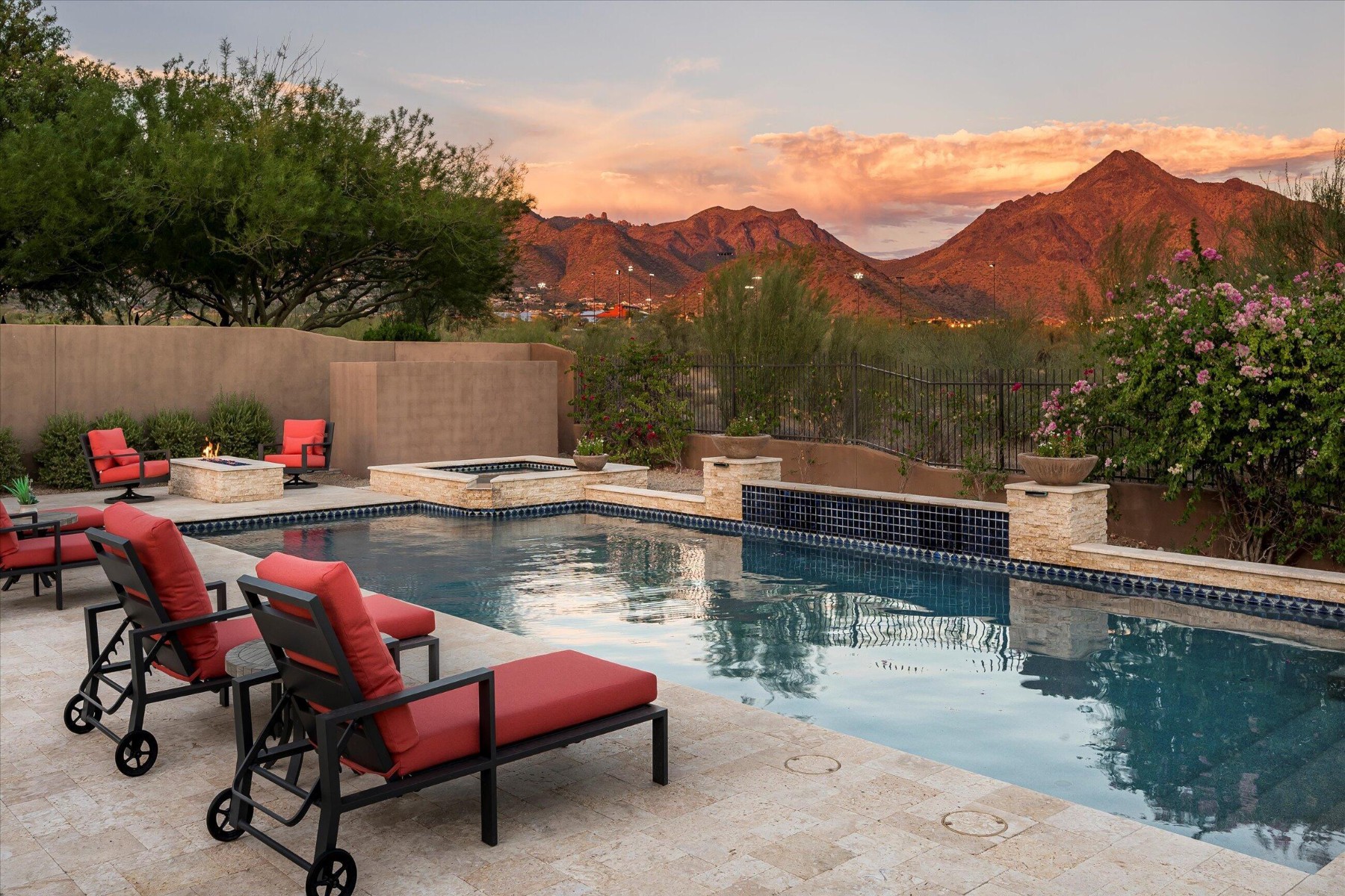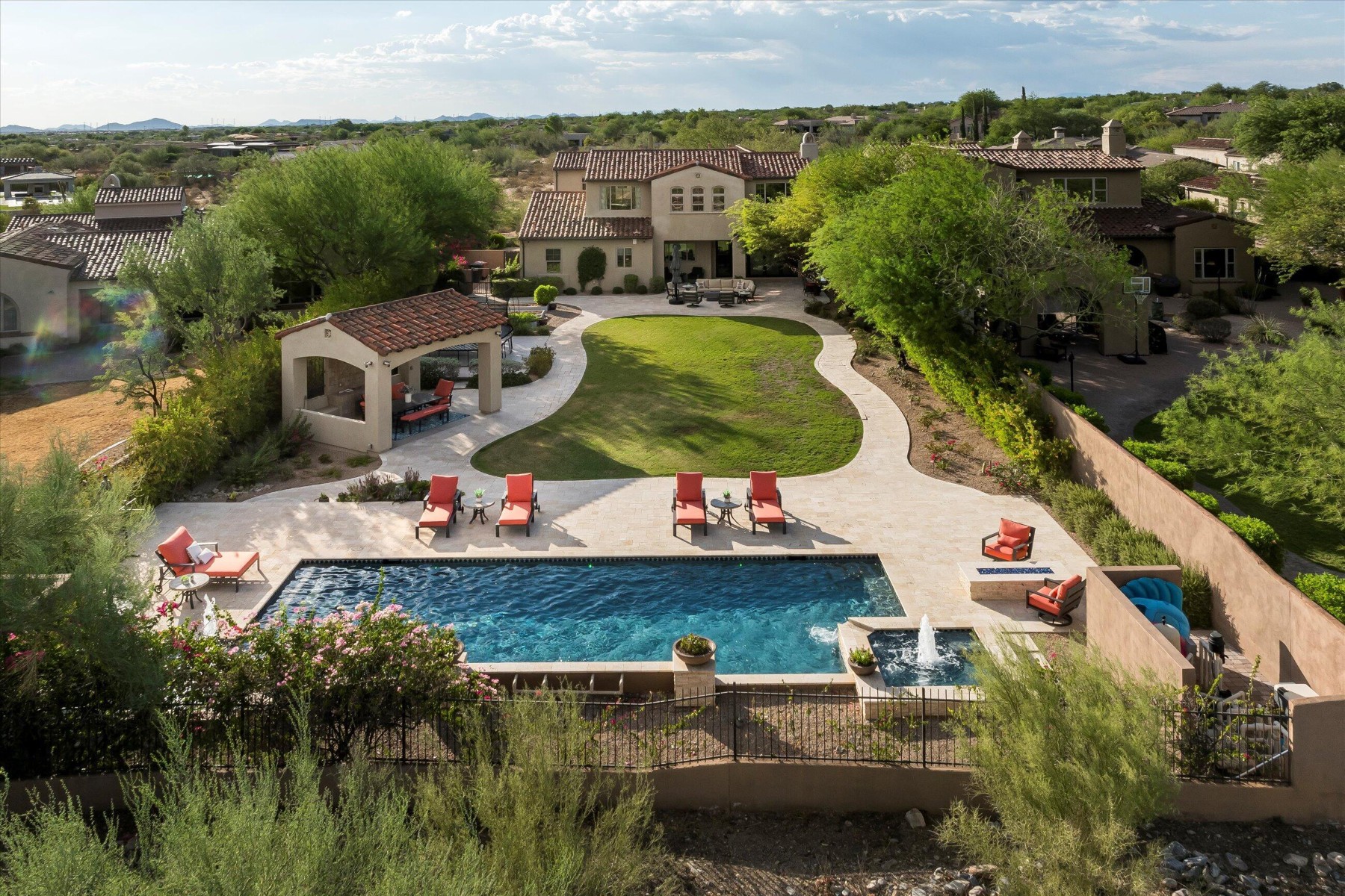 Highly sought after, gated DC Ranch Hacienda on one of a kind, oversized lot is tucked on an exterior cul de sac street with amazing curb appeal, faces open preserve and backs to natural area with picturesque McDowell mountains. Capture serene mountain and city light views from multiple areas of the home. Desirable great room home plan features 5 bedrooms, 4 baths, downstairs office and plus an upstairs office/den with wine fridge bar, and an expansive flex bonus room upstairs, with charming interior courtyard for entertaining. Enjoy seamless indoor/outdoor AZ living with a telescoping glass door from great room to picture perfect resort style backyard with scenic mountain backdrop, featuring oversized grassy area plus garden planters, outdoor covered ramada adjacent to generous heated pool and spa, and linear firepit, built-in BBQ with seating, covered patio, with ample hardscape space for seating/lounging. Stunning designer finishes including oak hardwood flooring throughout the home, light and bright oversized eat-in kitchen island, chic statement vent over gas range overlooking backyard, refined marble and tile selections throughout for a polished sophisticated appeal. Breathtaking views from second level primary suite with sitting area overlooking majestic McDowell Mountains, enjoy generous wardrobe, and spa like bath with freestanding bubble soaker tub. Convenient utility room with hall tree, three car tandem garage with cooling unit, plus spacious additional paved parking for four more cars. Quaint neighborhood park nearby. This showstopper is a unique opportunity in the coveted DC Ranch Haciendas.