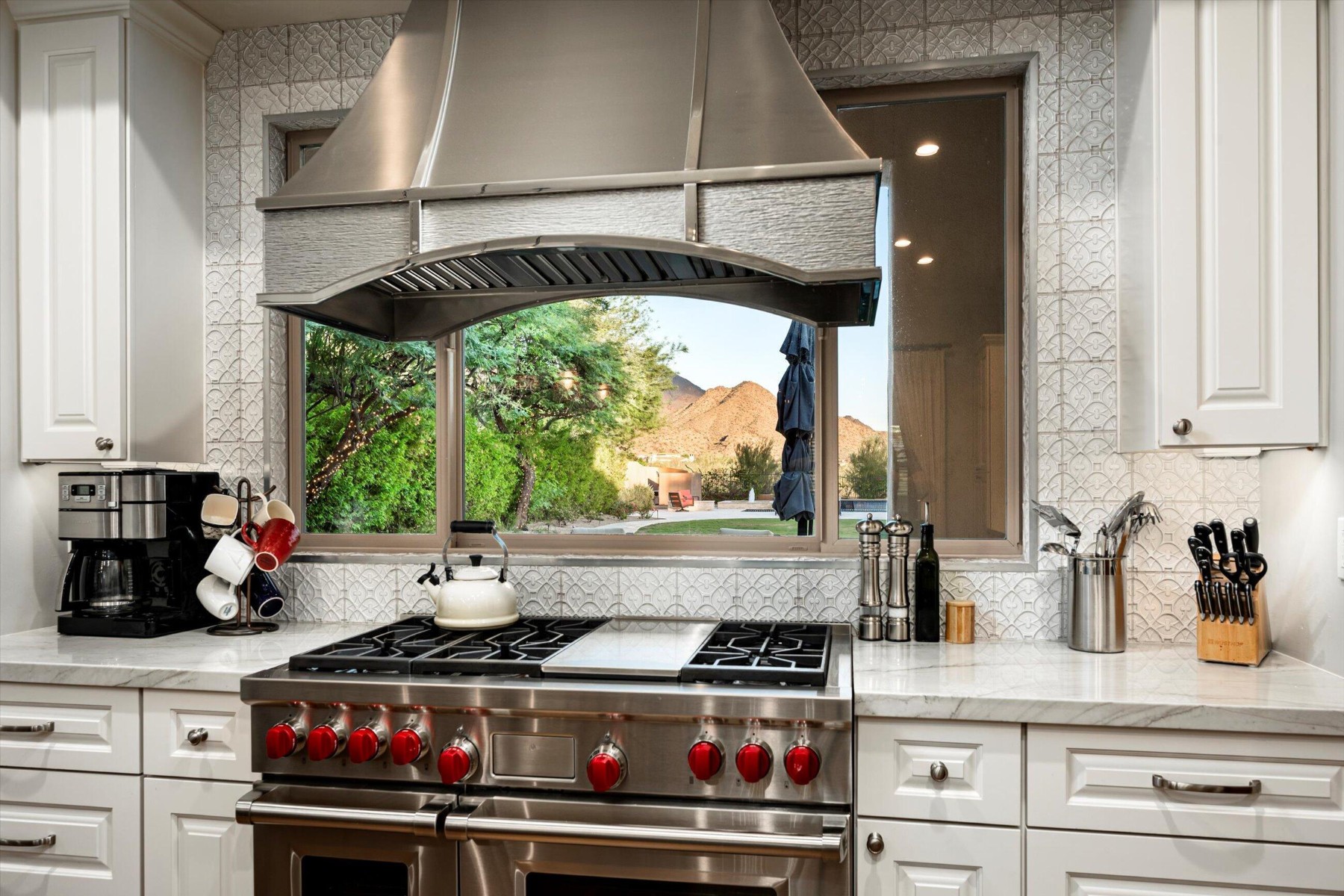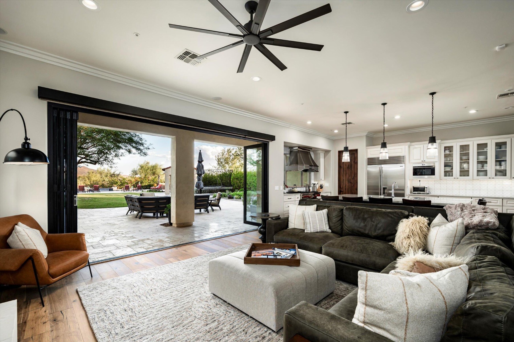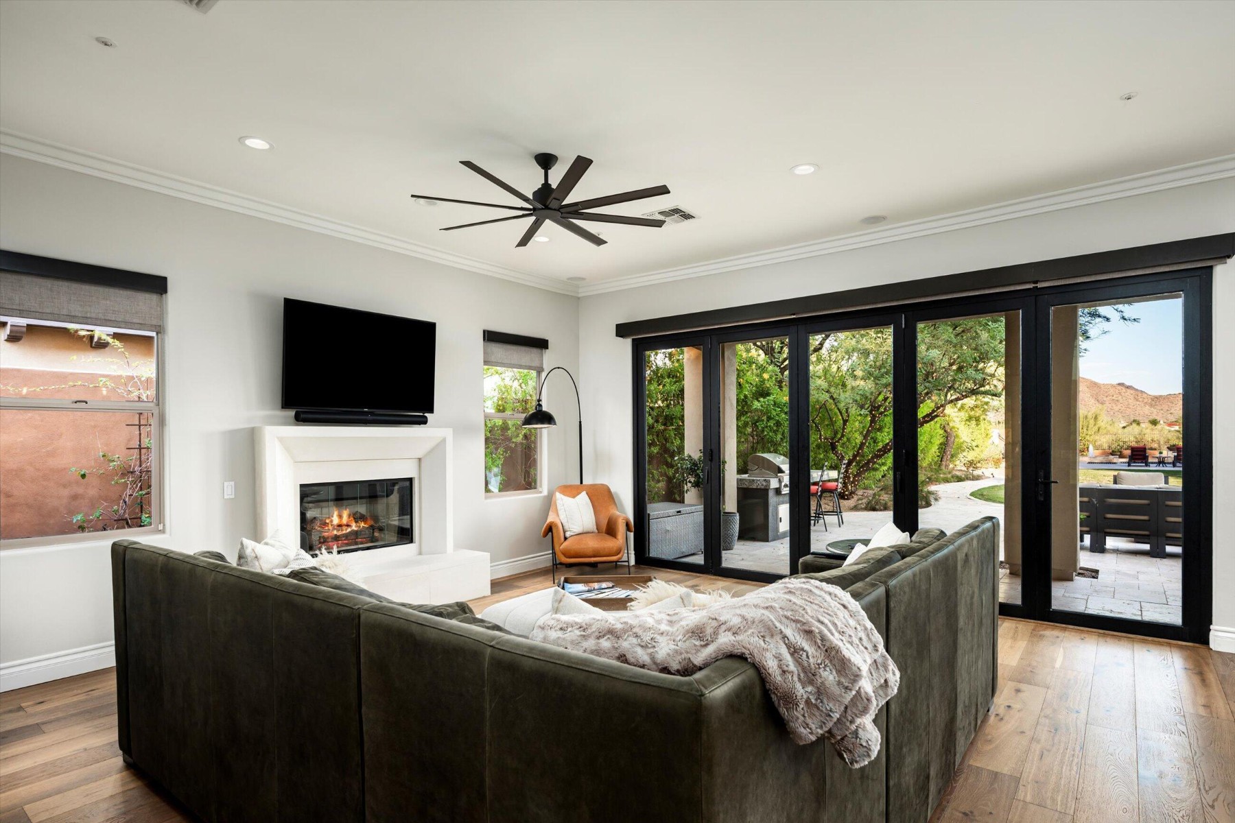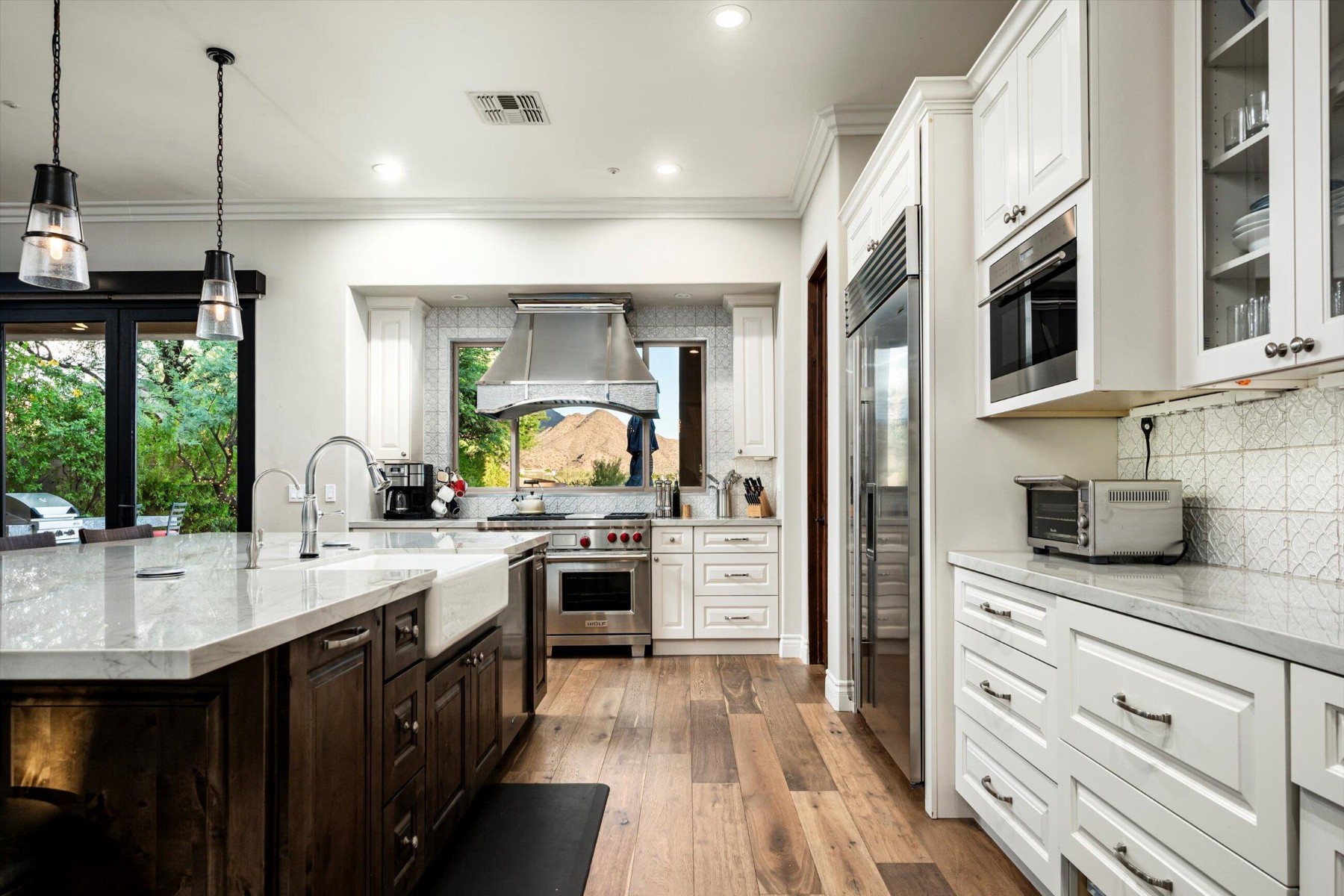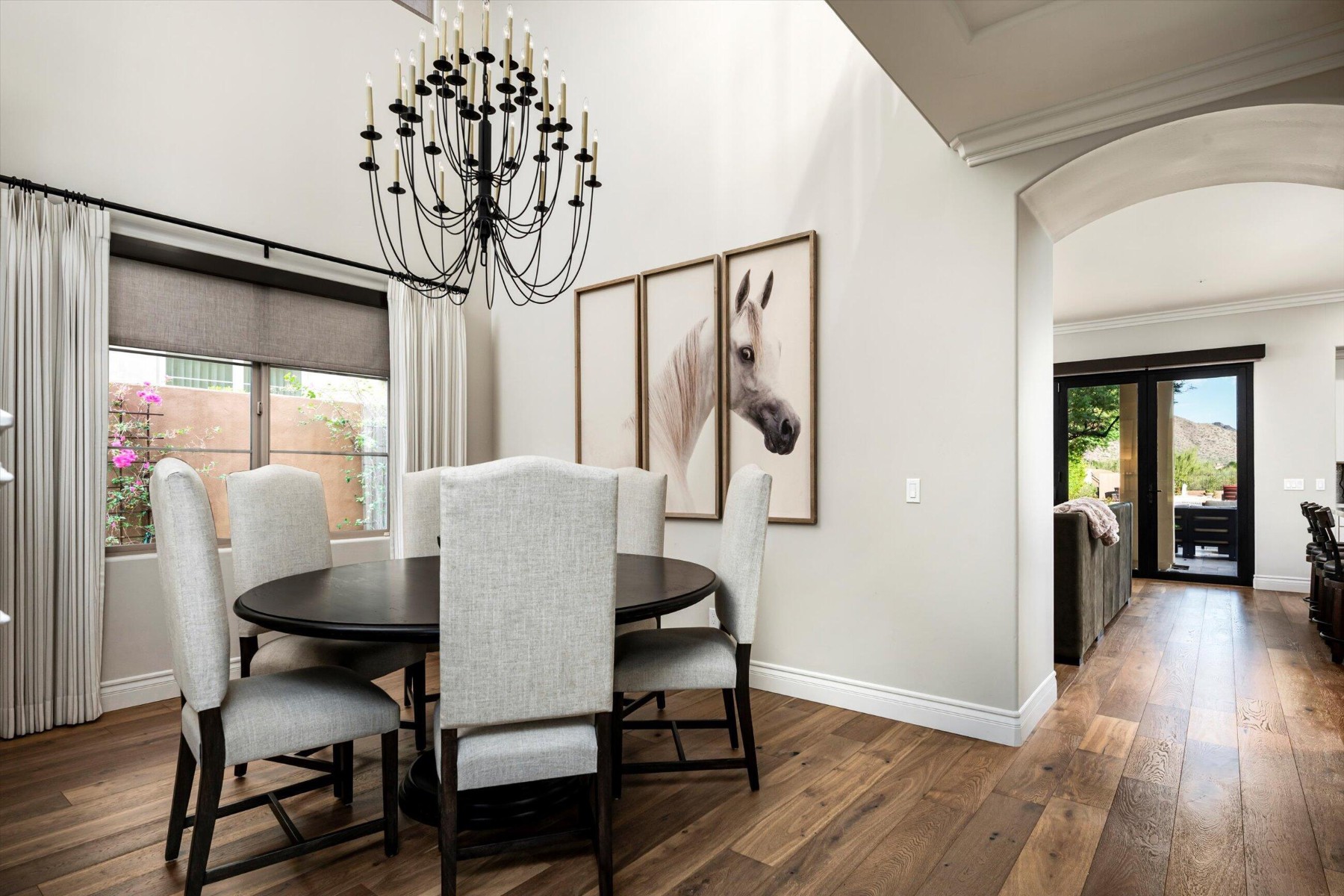 Highly sought after, gated DC Ranch Hacienda on one of a kind, oversized lot is tucked on an exterior cul de sac street with amazing curb appeal, faces open preserve and backs to natural area with picturesque McDowell mountains. Capture serene mountain and city light views from multiple areas of the home. Desirable great room home plan features 5 bedrooms, 4 baths, downstairs office and plus an upstairs office/den with wine fridge bar, and an expansive flex bonus room upstairs, with charming interior courtyard for entertaining. Enjoy seamless indoor/outdoor AZ living with a telescoping glass door from great room to picture perfect resort style backyard with scenic mountain backdrop, featuring oversized grassy area plus garden planters, outdoor covered ramada adjacent to generous heated pool and spa, and linear firepit, built-in BBQ with seating, covered patio, with ample hardscape space for seating/lounging. Stunning designer finishes including oak hardwood flooring throughout the home, light and bright oversized eat-in kitchen island, chic statement vent over gas range overlooking backyard, refined marble and tile selections throughout for a polished sophisticated appeal. Breathtaking views from second level primary suite with sitting area overlooking majestic McDowell Mountains, enjoy generous wardrobe, and spa like bath with freestanding bubble soaker tub. Convenient utility room with hall tree, three car tandem garage with cooling unit, plus spacious additional paved parking for four more cars. Quaint neighborhood park nearby. This showstopper is a unique opportunity in the coveted DC Ranch Haciendas.