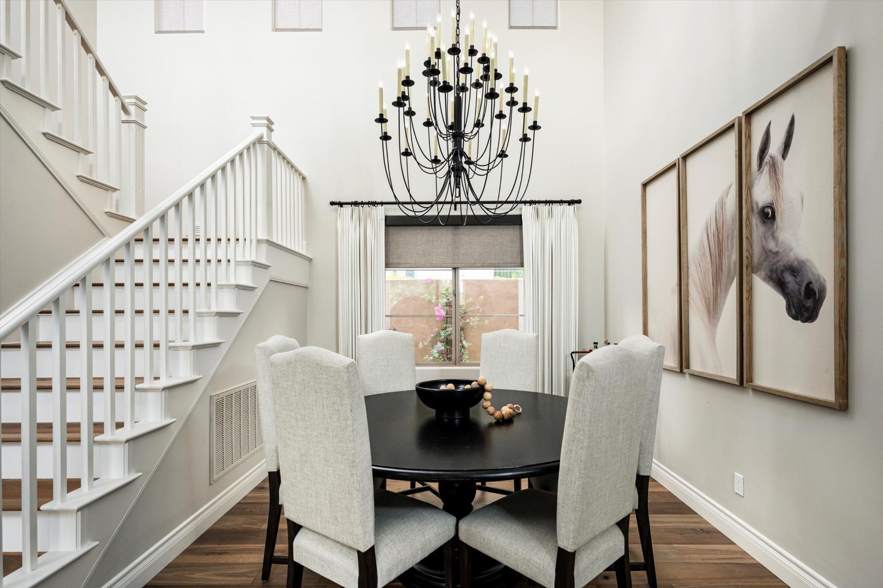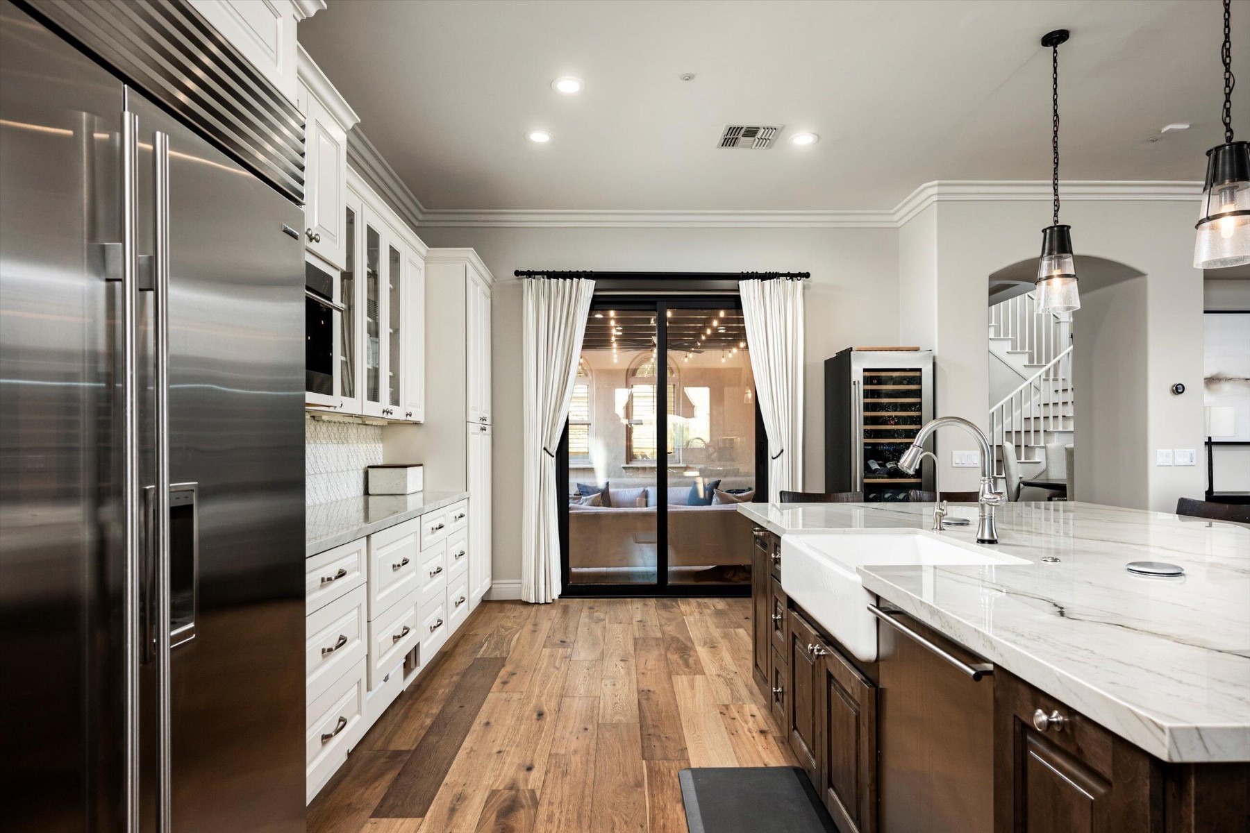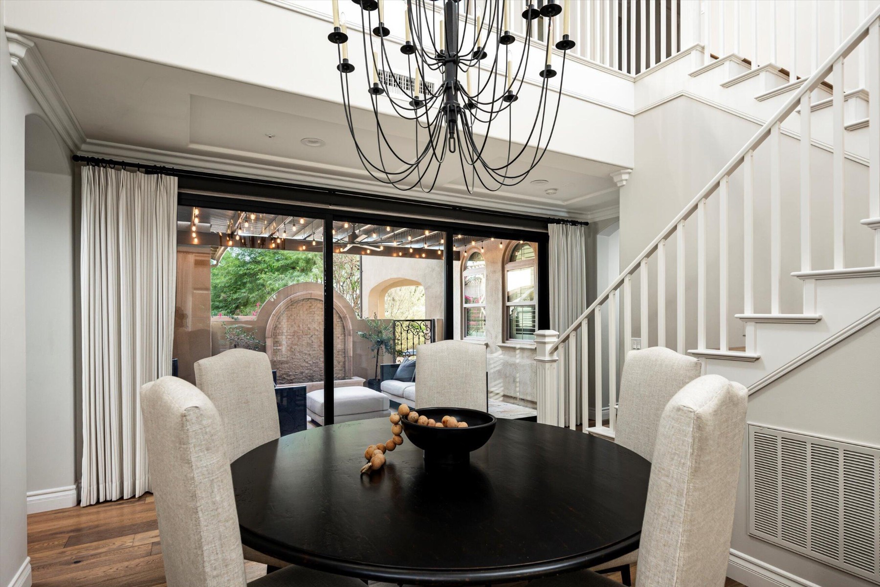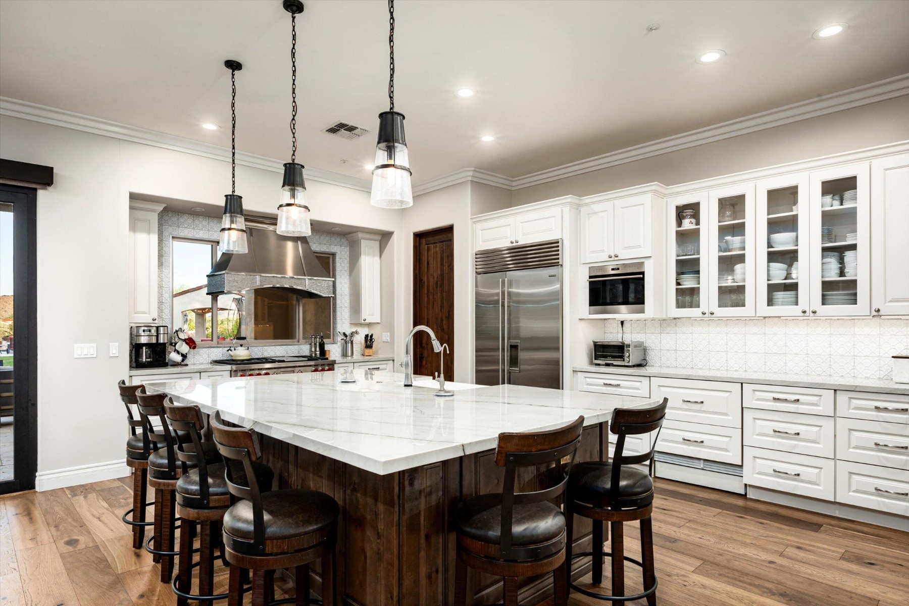 Highly sought after, gated DC Ranch Hacienda on one of a kind, oversized lot is tucked on an exterior cul de sac street with amazing curb appeal, faces open preserve and backs to natural area with picturesque McDowell mountains. Capture serene mountain and city light views from multiple areas of the home. Desirable great room home plan features 5 bedrooms, 4 baths, downstairs office and plus an upstairs office/den with wine fridge bar, and an expansive flex bonus room upstairs, with charming interior courtyard for entertaining. Enjoy seamless indoor/outdoor AZ living with a telescoping glass door from great room to picture perfect resort style backyard with scenic mountain backdrop, featuring oversized grassy area plus garden planters, outdoor covered ramada adjacent to generous heated pool and spa, and linear firepit, built-in BBQ with seating, covered patio, with ample hardscape space for seating/lounging. Stunning designer finishes including oak hardwood flooring throughout the home, light and bright oversized eat-in kitchen island, chic statement vent over gas range overlooking backyard, refined marble and tile selections throughout for a polished sophisticated appeal. Breathtaking views from second level primary suite with sitting area overlooking majestic McDowell Mountains, enjoy generous wardrobe, and spa like bath with freestanding bubble soaker tub. Convenient utility room with hall tree, three car tandem garage with cooling unit, plus spacious additional paved parking for four more cars. Quaint neighborhood park nearby. This showstopper is a unique opportunity in the coveted DC Ranch Haciendas.