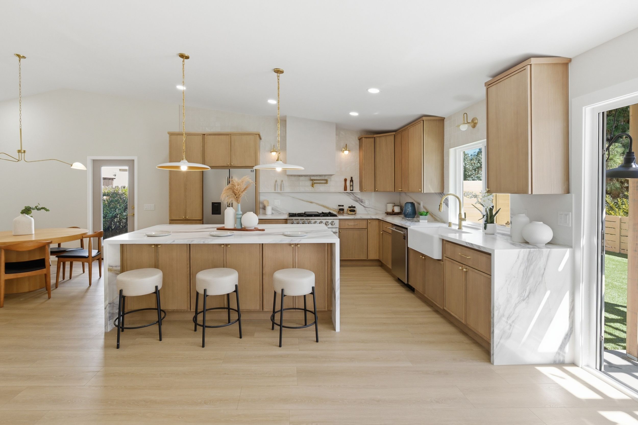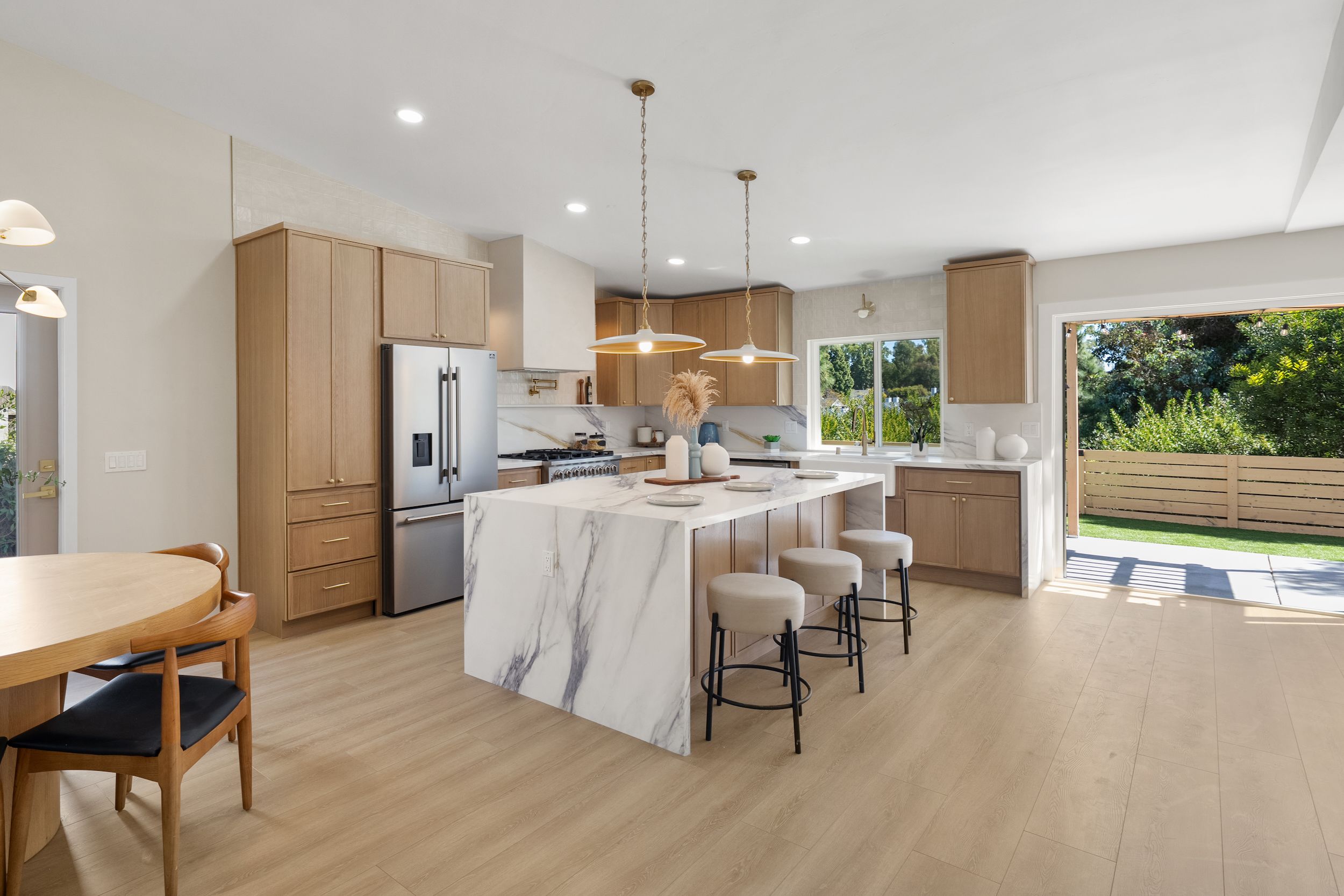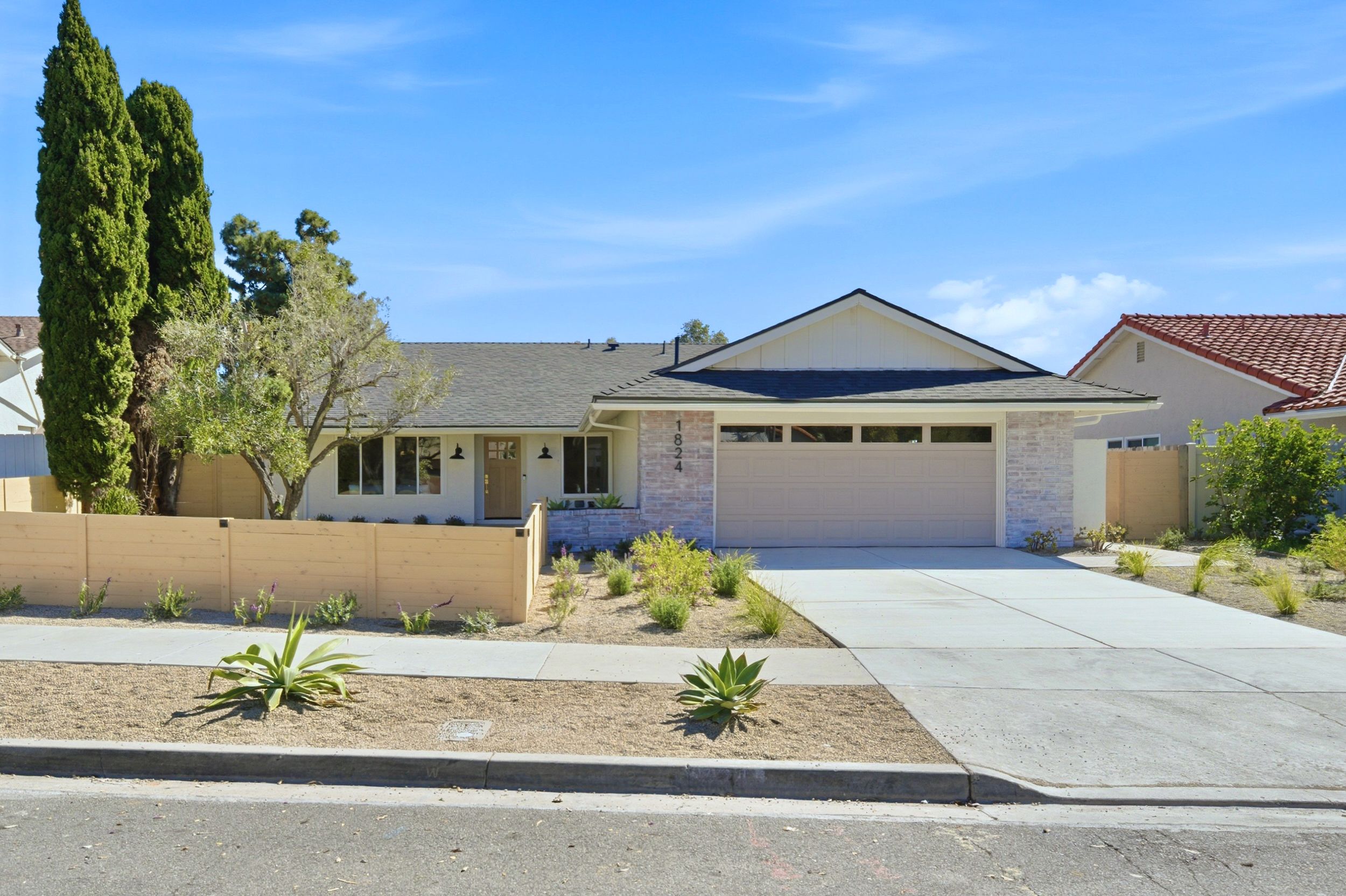 Completely reimagined from the ground up, this stunning single-story Fire Mountain home in Oceanside delivers the modern, move-in-ready lifestyle today's buyers are searching for. Set in one of North County San Diego's most sought-after neighborhoods, this 4-bedroom, 2-bathroom gem sits just minutes from the beach, top-rated schools, and the vibrant energy of downtown Oceanside. Every inch of this home has been thoughtfully updated. A brand-new roof, drought resistant plants, low maintenance turf and fresh exterior give the curb appeal to match the sophisticated interior, while new wood fencing creates privacy and a polished outdoor space. Step inside to wide-plank new flooring that flows seamlessly throughout the open-concept layout, with both a living room and family room space complete with a cozy fireplace— the perfect backdrop for the showstopping kitchen. The heart of the home is the fully redesigned kitchen, featuring a dramatic waterfall quartz island, quartz countertops in warm neutral tones, brand new shaker cabinets with modern brass finishings and even a pot filler faucet help to create a clean modern aesthetic that is equal parts functional and magazine-worthy. Whether entertaining guests or enjoying a quiet morning coffee, this kitchen was designed to impress. With an attached two car garage and single-story layout, this home checks every box for effortless California living especially with the cantina doors in both the primary bedroom and off of the family room giving an easy indoor-outdoor flow to the home. Fire Mountain is known for its hilltop character, tree-lined streets, and a strong sense of community — and this home puts you right in the center of it all. This is North County San Diego remodeled living at its finest.