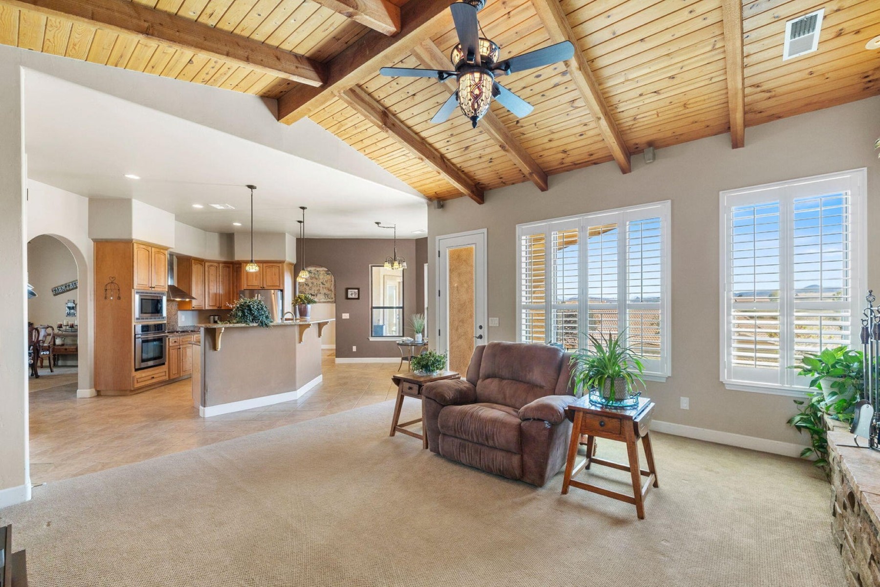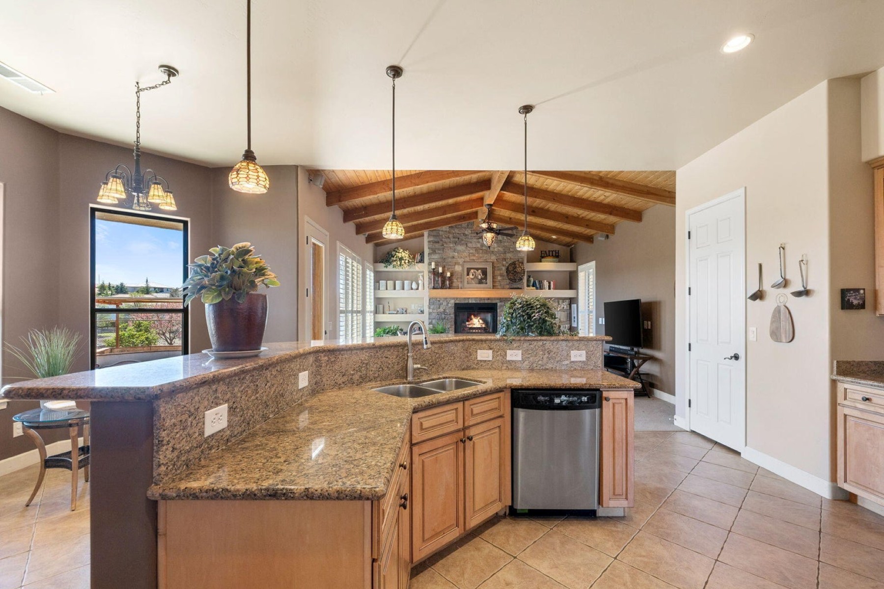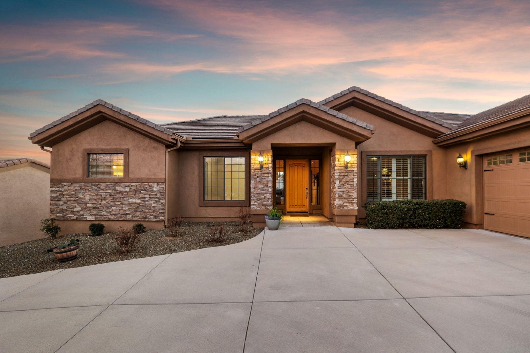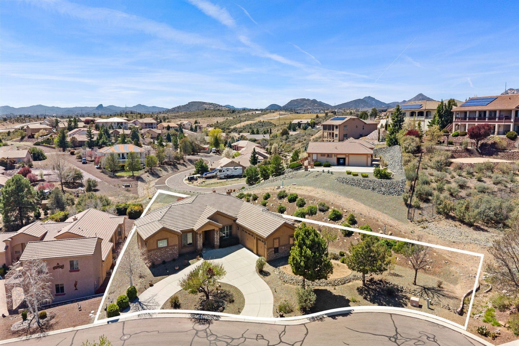 Positioned at the end of a quiet cul de sac in the established Pinon Oaks area this custom Prescott residence sits on an expansive .71 acre homesite offering privacy space & sweeping mountain and sky views. A circular driveway creates an elegant arrival leading to an oversized three car garage & welcoming entry. Step inside to a spacious foyer that opens into a dedicated music reception library room with French doors leading to a covered patio perfect for sunset views. Tiffany lighting adds character throughout while arched passages guide you into the great room featuring a tongue and groove pine ceiling with exposed beams & a framed stone gas fireplace with built in shelving. The open kitchen offers granite countertops Jenn Aire appliances including a gas cooktop wall oven & convection microwave a walk in pantry & an expansive island with seating for seven that flows into the breakfast nook & great room. A formal dining room provides additional space for gatherings. The primary suite is generously sized with room for full furnishings & features an ensuite bath with garden tub separate shower dual vanities & dual walk in closets. Two guest bedrooms share a Jack & Jill bath with one offering a walk in closet. The backyard offers covered patio spaces for sunset viewing, turf, & mature landscaping for easy outdoor living with plenty of producing fruit trees. There is easy access from Pinon Oaks to Hwy's 69 & 89 for an easy drive to Phoenix or Flagstaff.