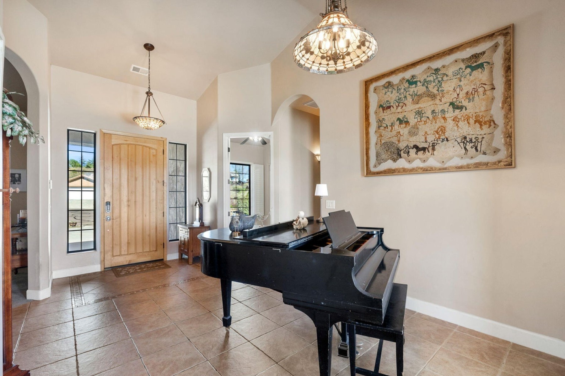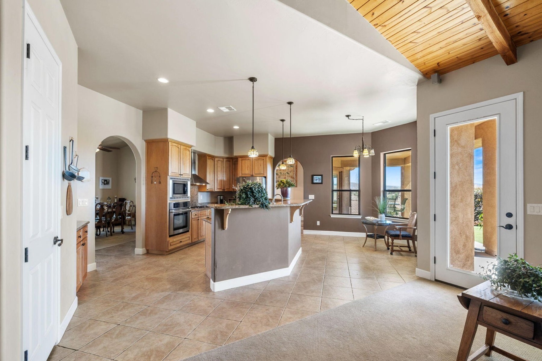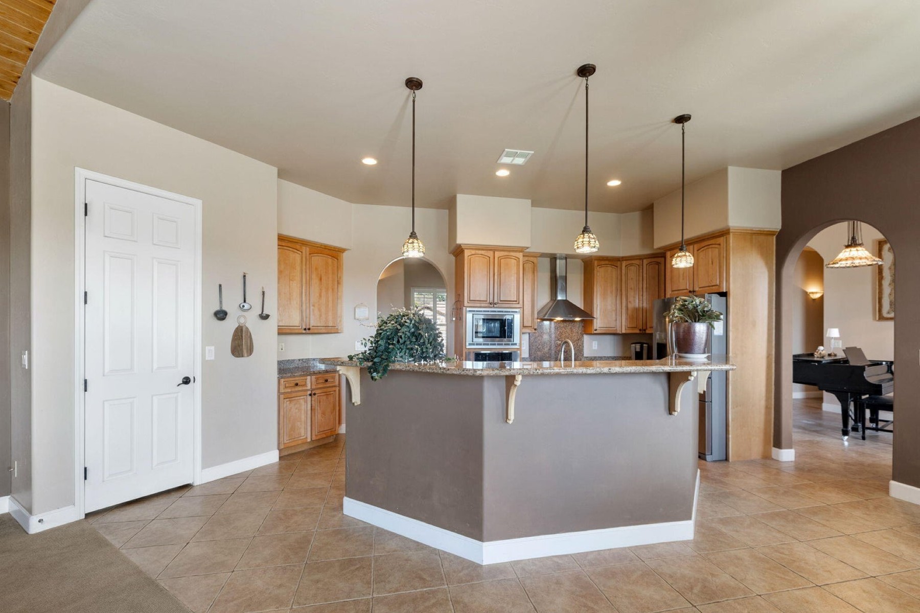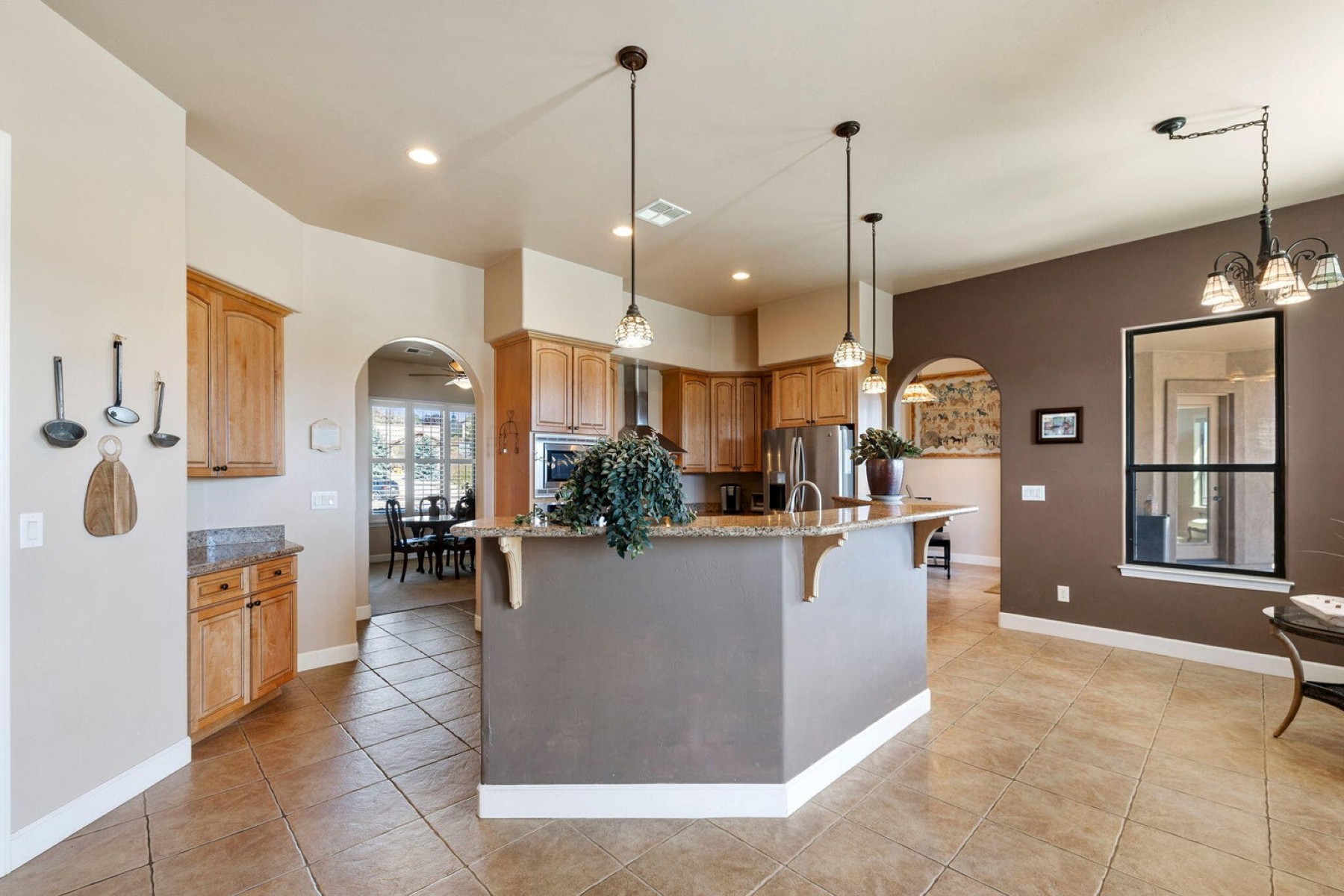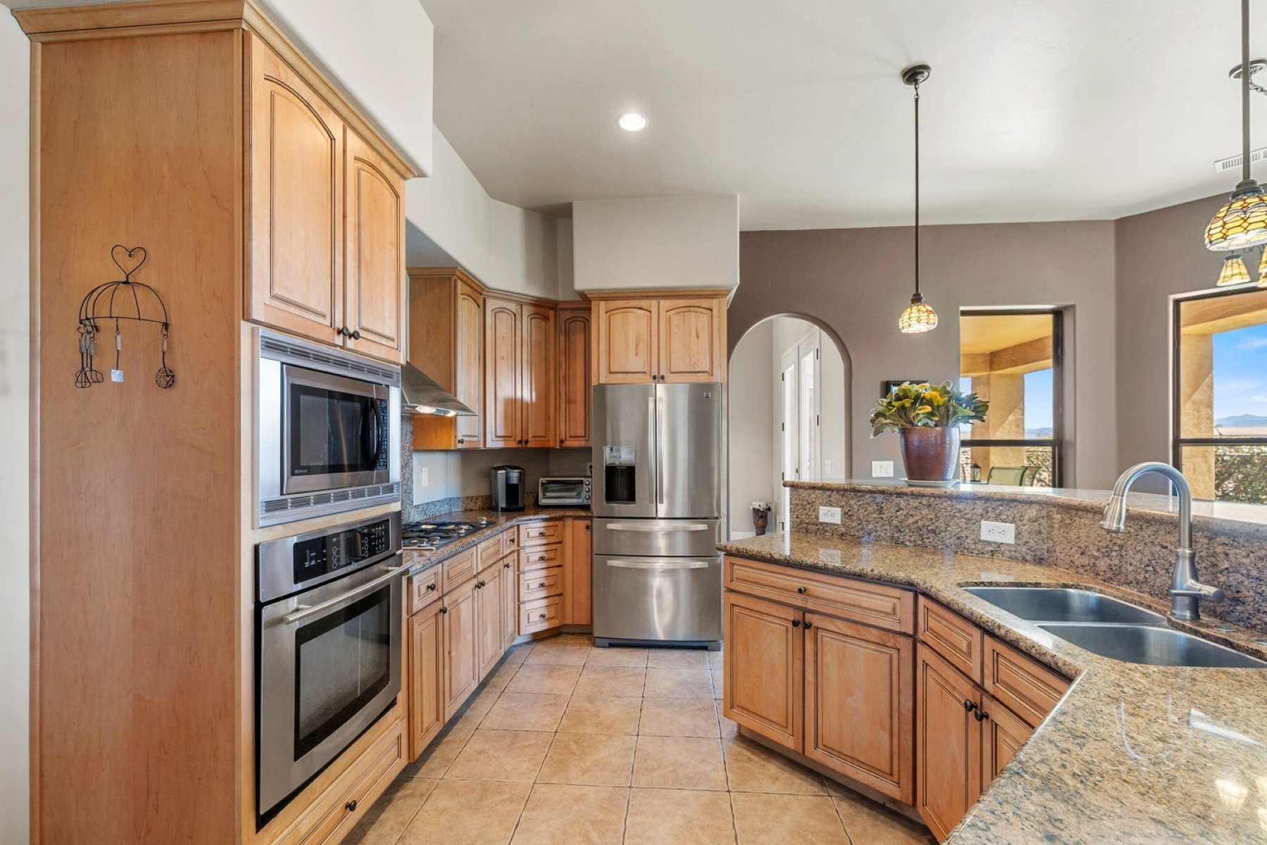 Positioned at the end of a quiet cul de sac in the established Pinon Oaks area this custom Prescott residence sits on an expansive .71 acre homesite offering privacy space & sweeping mountain and sky views. A circular driveway creates an elegant arrival leading to an oversized three car garage & welcoming entry. Step inside to a spacious foyer that opens into a dedicated music reception library room with French doors leading to a covered patio perfect for sunset views. Tiffany lighting adds character throughout while arched passages guide you into the great room featuring a tongue and groove pine ceiling with exposed beams & a framed stone gas fireplace with built in shelving. The open kitchen offers granite countertops Jenn Aire appliances including a gas cooktop wall oven & convection microwave a walk in pantry & an expansive island with seating for seven that flows into the breakfast nook & great room. A formal dining room provides additional space for gatherings. The primary suite is generously sized with room for full furnishings & features an ensuite bath with garden tub separate shower dual vanities & dual walk in closets. Two guest bedrooms share a Jack & Jill bath with one offering a walk in closet. The backyard offers covered patio spaces for sunset viewing, turf, & mature landscaping for easy outdoor living with plenty of producing fruit trees. There is easy access from Pinon Oaks to Hwy's 69 & 89 for an easy drive to Phoenix or Flagstaff.