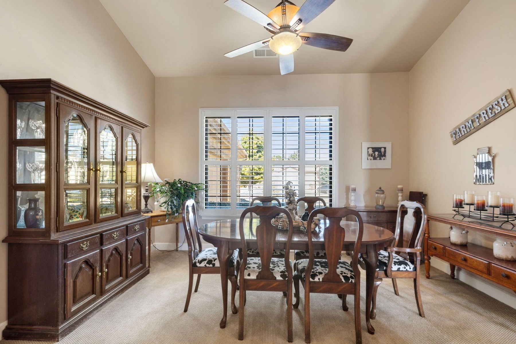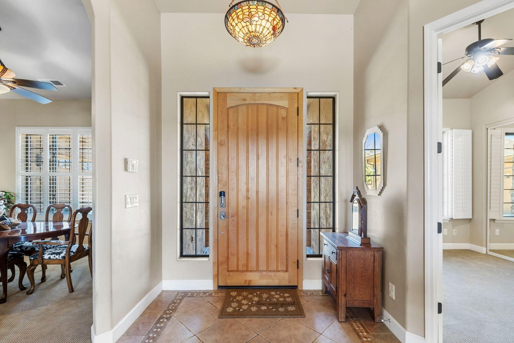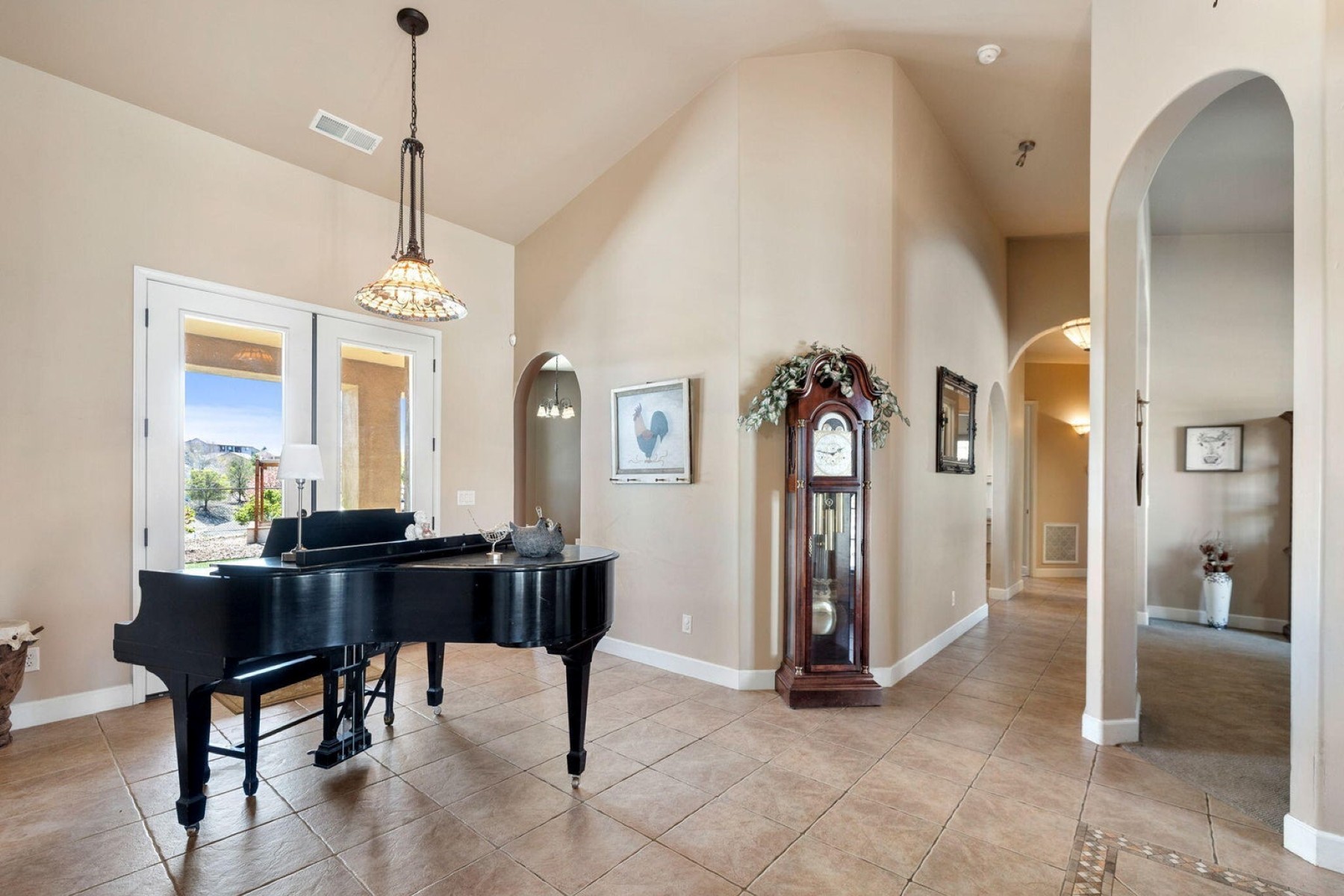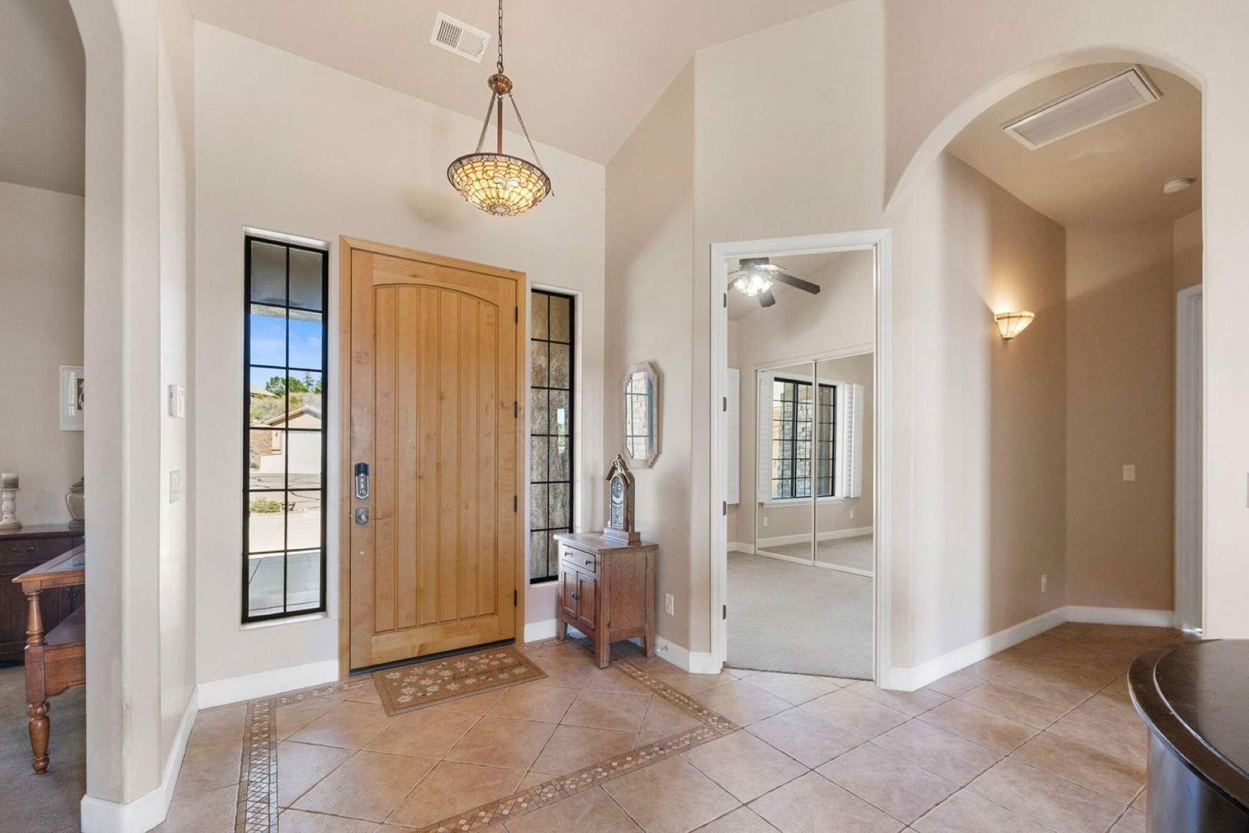 Positioned at the end of a quiet cul de sac in the established Pinon Oaks area this custom Prescott residence sits on an expansive .71 acre homesite offering privacy space & sweeping mountain and sky views. A circular driveway creates an elegant arrival leading to an oversized three car garage & welcoming entry. Step inside to a spacious foyer that opens into a dedicated music reception library room with French doors leading to a covered patio perfect for sunset views. Tiffany lighting adds character throughout while arched passages guide you into the great room featuring a tongue and groove pine ceiling with exposed beams & a framed stone gas fireplace with built in shelving. The open kitchen offers granite countertops Jenn Aire appliances including a gas cooktop wall oven & convection microwave a walk in pantry & an expansive island with seating for seven that flows into the breakfast nook & great room. A formal dining room provides additional space for gatherings. The primary suite is generously sized with room for full furnishings & features an ensuite bath with garden tub separate shower dual vanities & dual walk in closets. Two guest bedrooms share a Jack & Jill bath with one offering a walk in closet. The backyard offers covered patio spaces for sunset viewing, turf, & mature landscaping for easy outdoor living with plenty of producing fruit trees. There is easy access from Pinon Oaks to Hwy's 69 & 89 for an easy drive to Phoenix or Flagstaff.