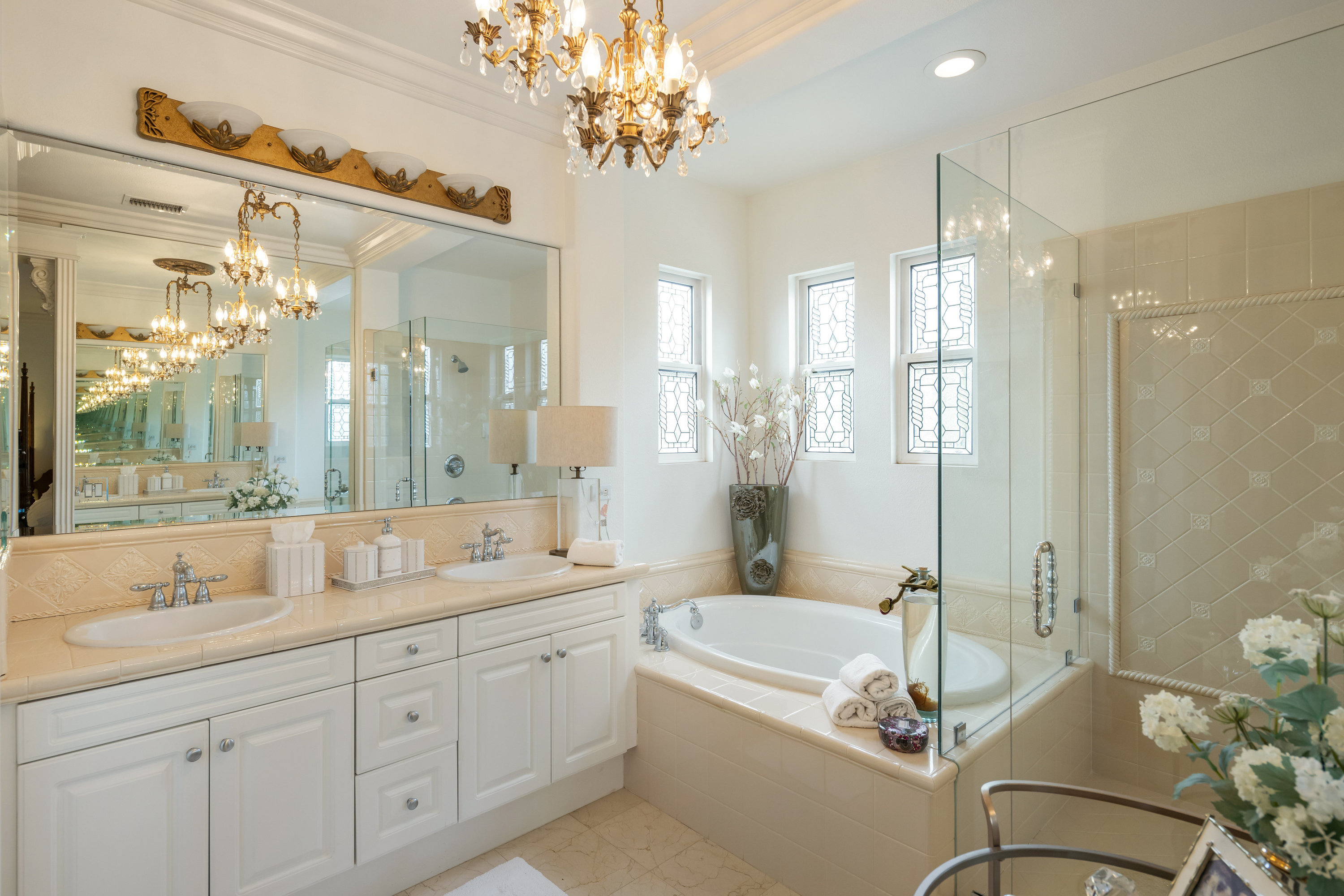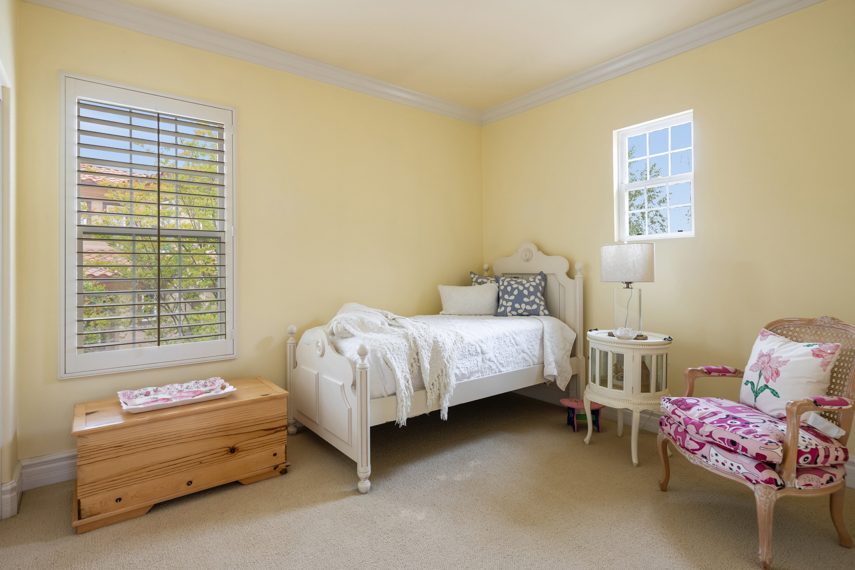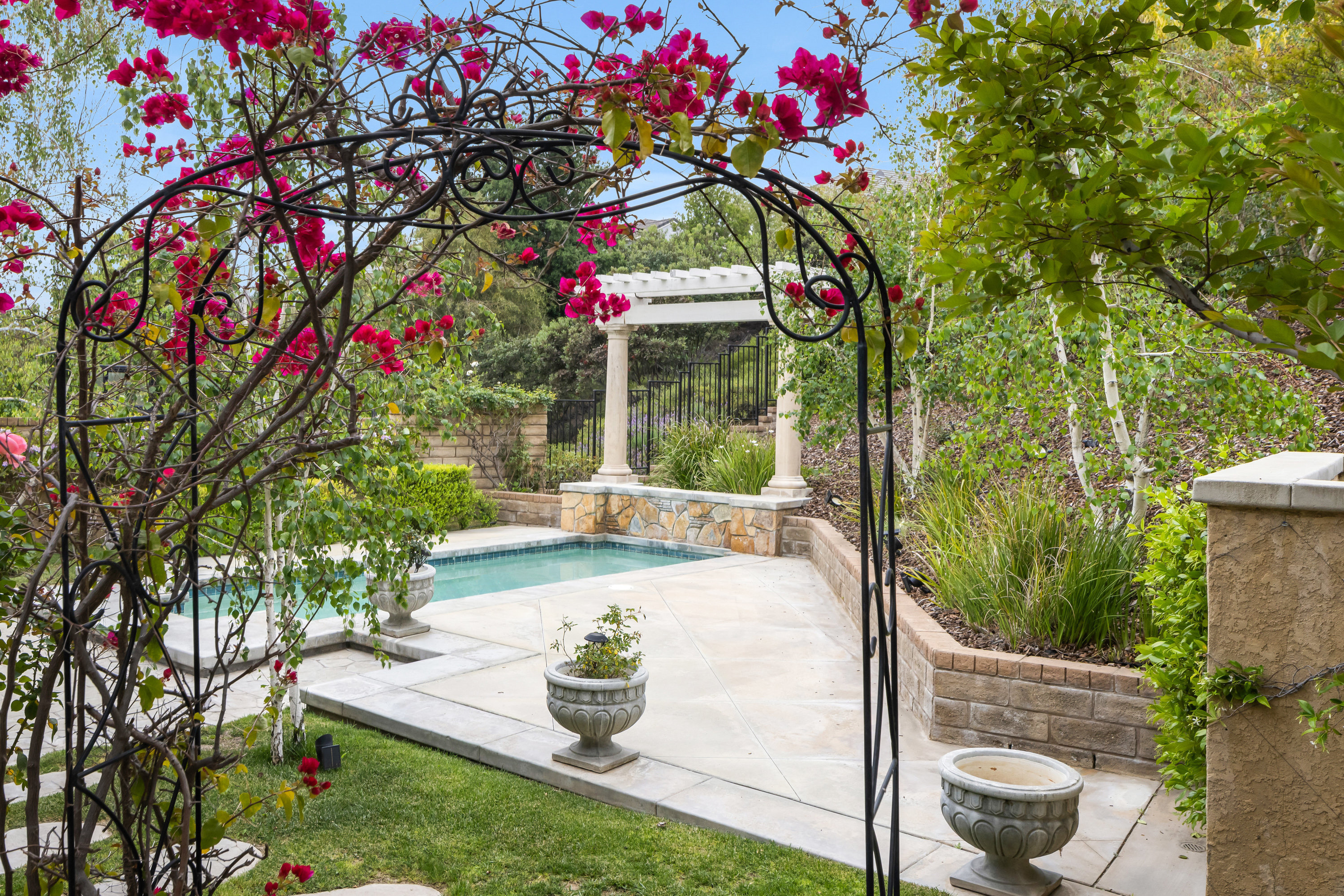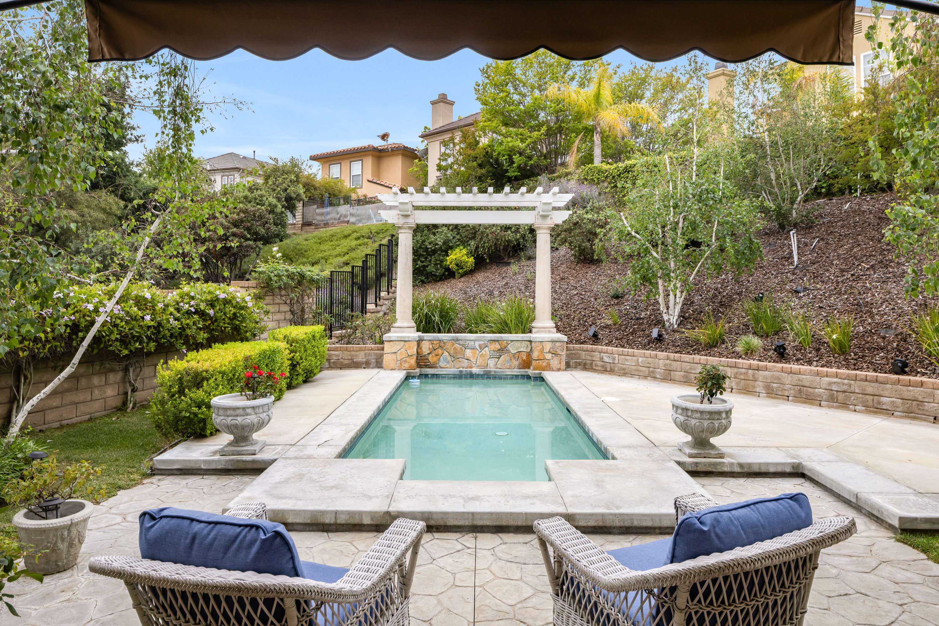 Welcome to this stunning residence situated within the highly sought-after gated community of Westridge in Valencia. Upon entry, you are greeted by soaring double-height ceilings and an abundance of natural light that flows effortlessly throughout the home, creating a warm and inviting atmosphere. This spacious floor plan features 5 bedrooms and 3 full bathrooms, including a desirable downstairs bedroom, currently used as a den and a full bath perfect for guests or multi-generational living. The open-concept design connects the formal dining room, cozy family room, and chef's kitchen, making it ideal for entertaining. The white and bright kitchen is beautifully appointed with a large island, built-in refrigerator, dishwasher, and custom cabinetry with pull-out drawers. French doors open to a private backyard retreat featuring a sparkling pool, tranquil fountains, and a large patio space designed for effortless indoor-outdoor living. Additional highlights include hardwood flooring, wood shutters, crown molding, a pre-hardwired security system, a downstairs laundry room with washer and dryer, and a spacious 2-car garage with direct entrance. Enjoy resort-style amenities including two Jr. Olympic-size pools, spas, a clubhouse, parks, tennis courts, basketball courts, and BBQ areas all with no Mello Roos and a low HOA. Located within walking distance to top-rated schools, golf at The Oaks Club, shops, dining, and just minutes from the 5 Freeway, this home truly has it all.