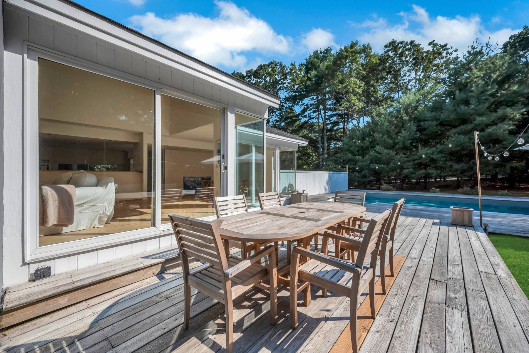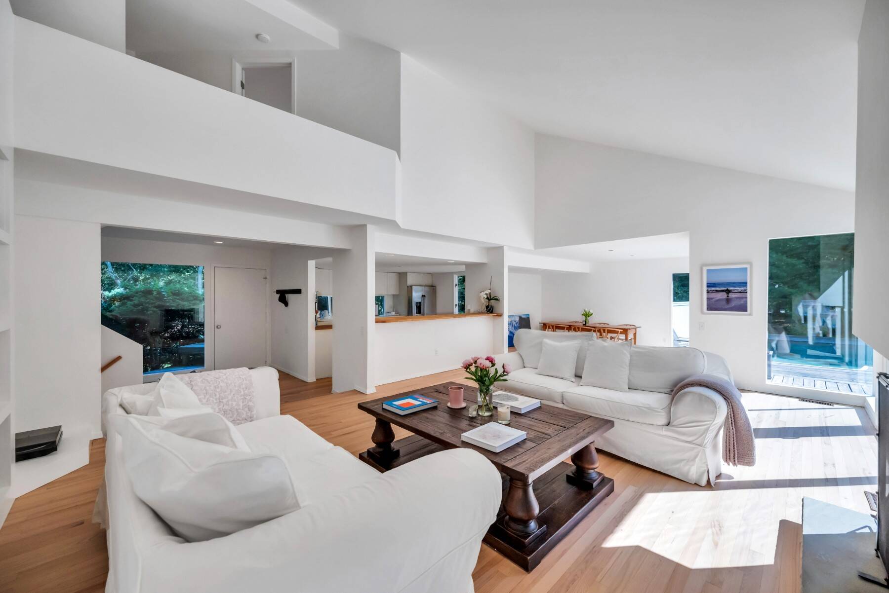 3 Lynda Lane | East Hampton Ideally located just north of East Hampton Village and moments from Amagansett, this sophisticated modern residence showcases striking linear architecture and a seamless connection between indoor and outdoor living. Welcome to 3 Lynda Lane, an architectural retreat set on a private shy-acre property. Defined by clean lines and a minimalist aesthetic, the home features meticulous craftsmanship and high-end finishes throughout. A bluestone pathway leads to the entrance, opening into a dramatic double-height great room anchored by a fireplace and an open-plan chef's kitchen designed for effortless entertaining. Oversized windows and skylights fill the space with natural light, enhancing the home's airy and contemporary atmosphere. Outdoor living is equally impressive, with multiple decks that extend the living space into the landscape. The property features a newly installed deer fence and a 20 x 40 pool, creating a perfect setting for relaxing summer days or hosting gatherings with friends and family. The second-floor primary suite offers exceptional privacy and includes a luxurious spa-style bath with soaking tub, double-vanity, and two walk-in closets. A dedicated office overlooking the great room provides a quiet and inspiring workspace. On the main level, two additional generously sized bedrooms provide comfortable accommodations for guests. The finished lower level includes a laundry room with washer and dryer along with additional flexible space. Additional amenities include central air conditioning and parking, ensuring comfort and convenience throughout the season. With its modernist design, elegant finishes, and prime location between East Hampton Village and Amagansett, 3 Lynda Lane offers a refined Hamptons retreat that perfectly balances privacy, style, and accessibility.