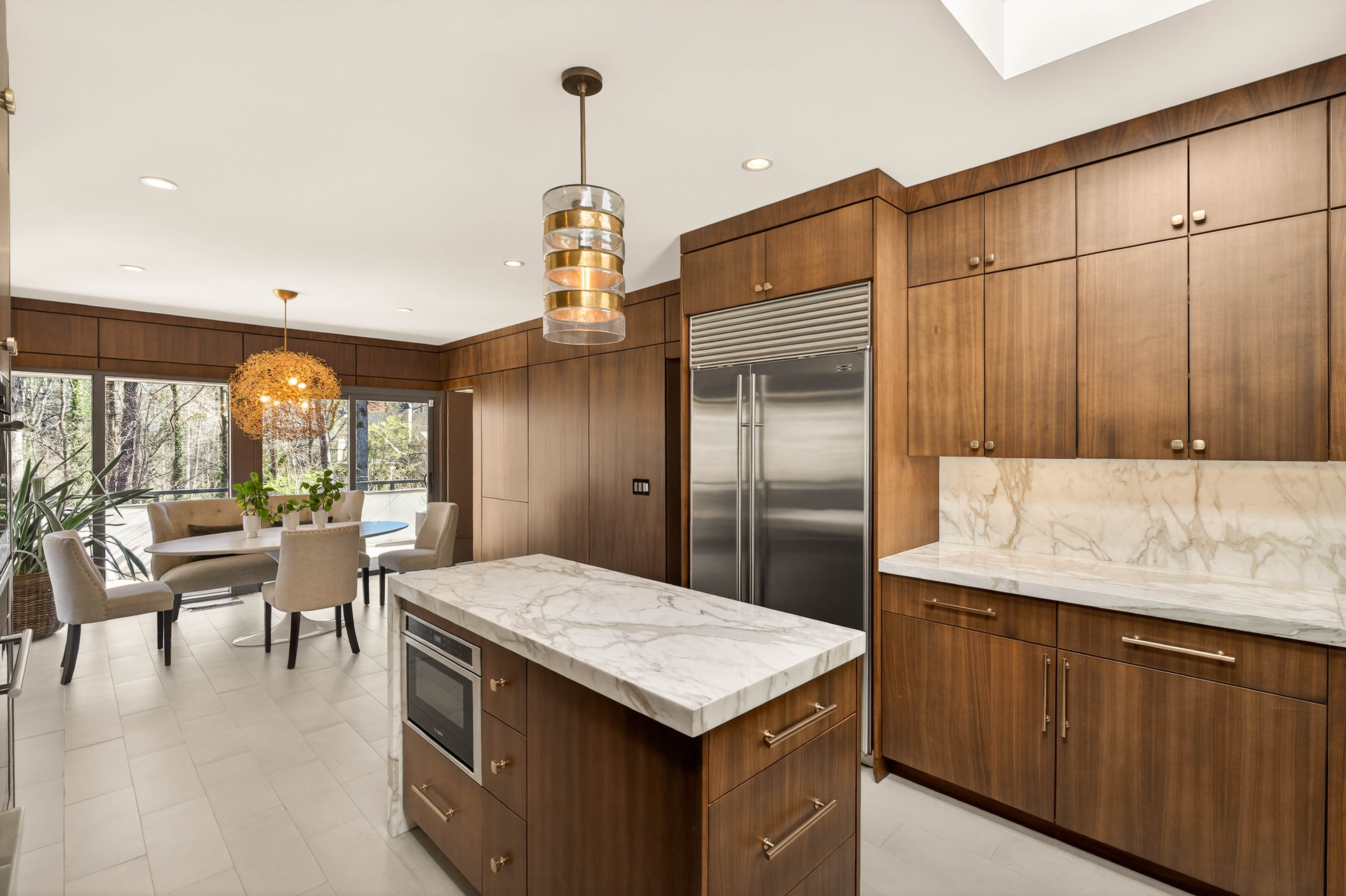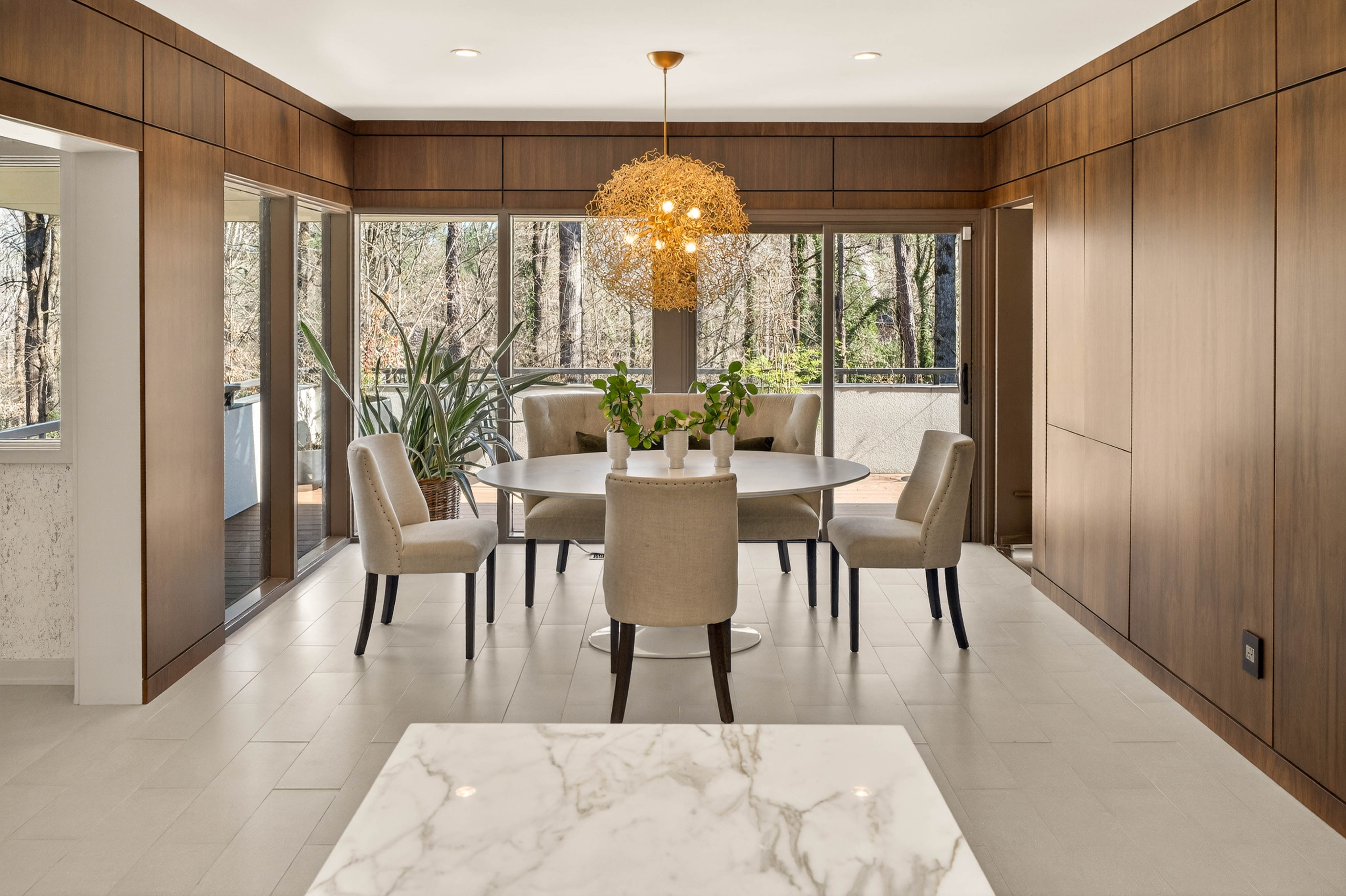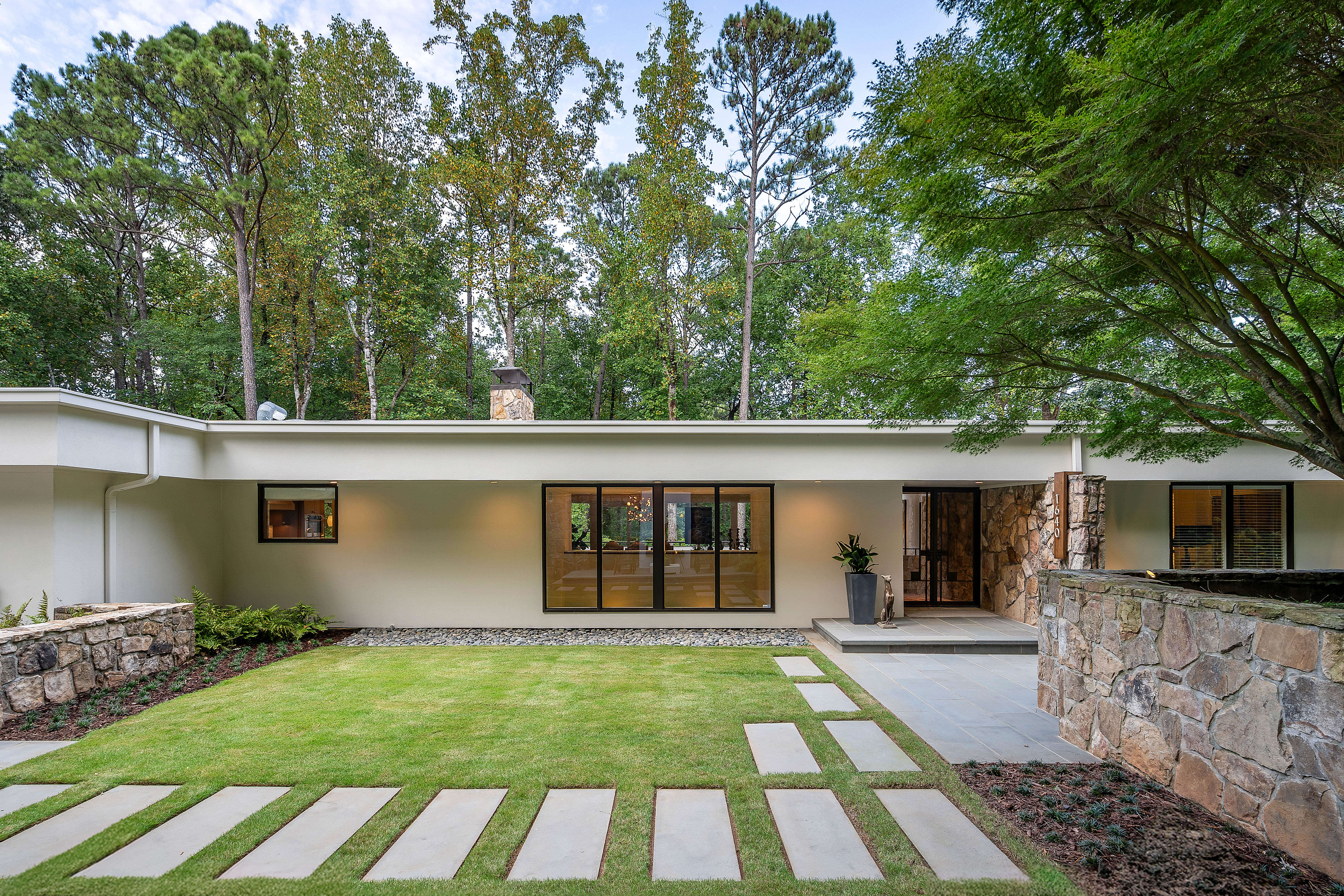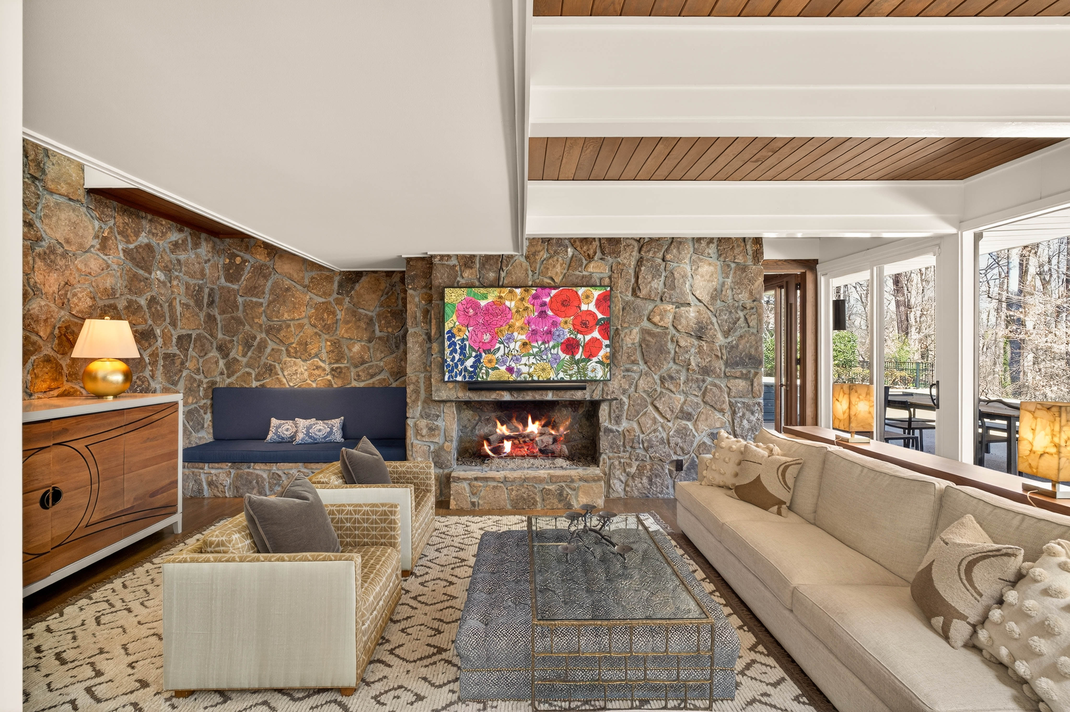 Nestled on an extraordinarily private 2.33-acre estate in the coveted Winterthur community, this architectural jewel is discreetly positioned in the heart of Sandy Springs—offering a rare convergence of provenance, design pedigree, and resort-caliber grounds. Originally conceived as the personal residence of renowned architect Robert Green, protégé and direct understudy of Frank Lloyd Wright, the home has been masterfully reimagined under the direction of acclaimed architect Rodolfo Castro—preserving its midcentury integrity while elevating it to a standard of modern luxury. A gated approach and a long and meandering newly constructed driveway set the tone for the arrival experience, framed by extensive, thoughtfully executed landscape and hardscape design by Bellwether Landscapes. The grounds are nothing short of extraordinary—featuring newly installed stone walls, expansive patios, a courtyard terrace with a statement fireplace, an extended level lawn, and a breathtaking 75-foot heated lap pool that anchors the outdoor living experience. Upon entry through striking steel and glass doors, interiors are immediately illuminated by an oversized skylight, casting natural light across the home’s refined architectural lines. The fully renovated kitchen is appointed with custom solid walnut cabinetry, Calacatta Gold countertops, and a suite of professional-grade appliances. Seamlessly integrated, the kitchen flows into an inviting breakfast room, a fireside keeping room, and an adjoining office. Four generously proportioned bedrooms reside on the main floor, each served by two impeccably renovated full baths. A dramatic stair hall descends to the terrace level, where the home’s architectural character is on full display. Here, original wood paneling has been meticulously preserved, showcased in a vintage wet bar, a raised living area, and a striking sunken family room centered around a stone fireplace with a built-in sectional—an iconic midcentury design moment. The terrace level also hosts a richly paneled fireside den, ideal as a private study or retreat, complete with a newly installed sauna. Tucked away for ultimate privacy, the primary suite is a true sanctuary—featuring dual walk-in closets and a spa-caliber bath with dual vanities, a freestanding soaking tub, and a frameless glass shower, all executed with a refined, contemporary sensibility. Every principal room along the rear elevation opens to the exceptional outdoor environment, blurring the line between interior and exterior living. Expansive patios provide ample space for dining and lounging, while the manicured lawn offers a rare, usable expanse ideal for recreation. With five bedrooms, three full and one half baths, approximately 4,500 square feet, and a three-car garage, this residence represents a once-in-a-generation opportunity to own one of metro Atlanta’s most architecturally significant midcentury homes—thoughtfully restored, meticulously curated, and impossibly private.