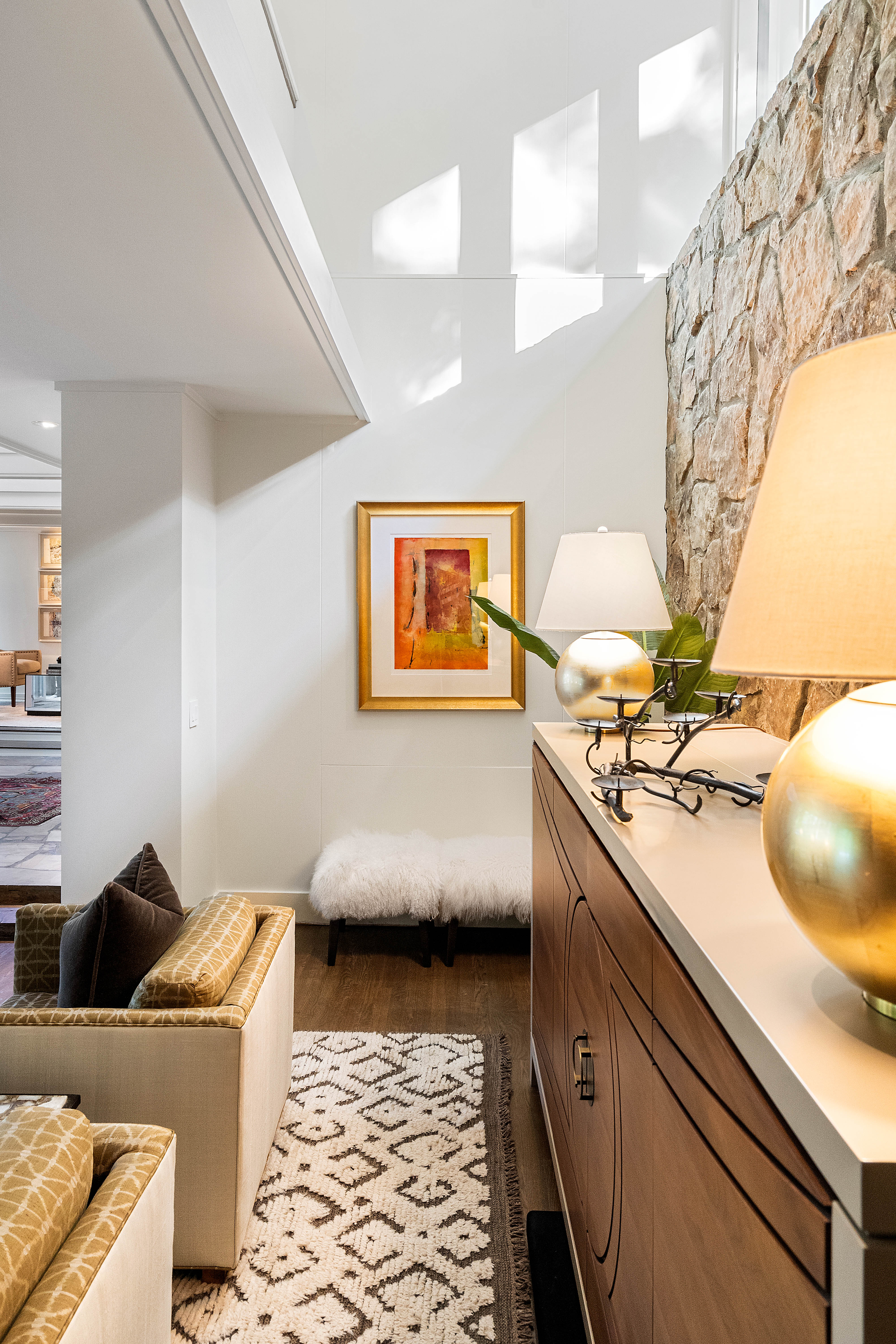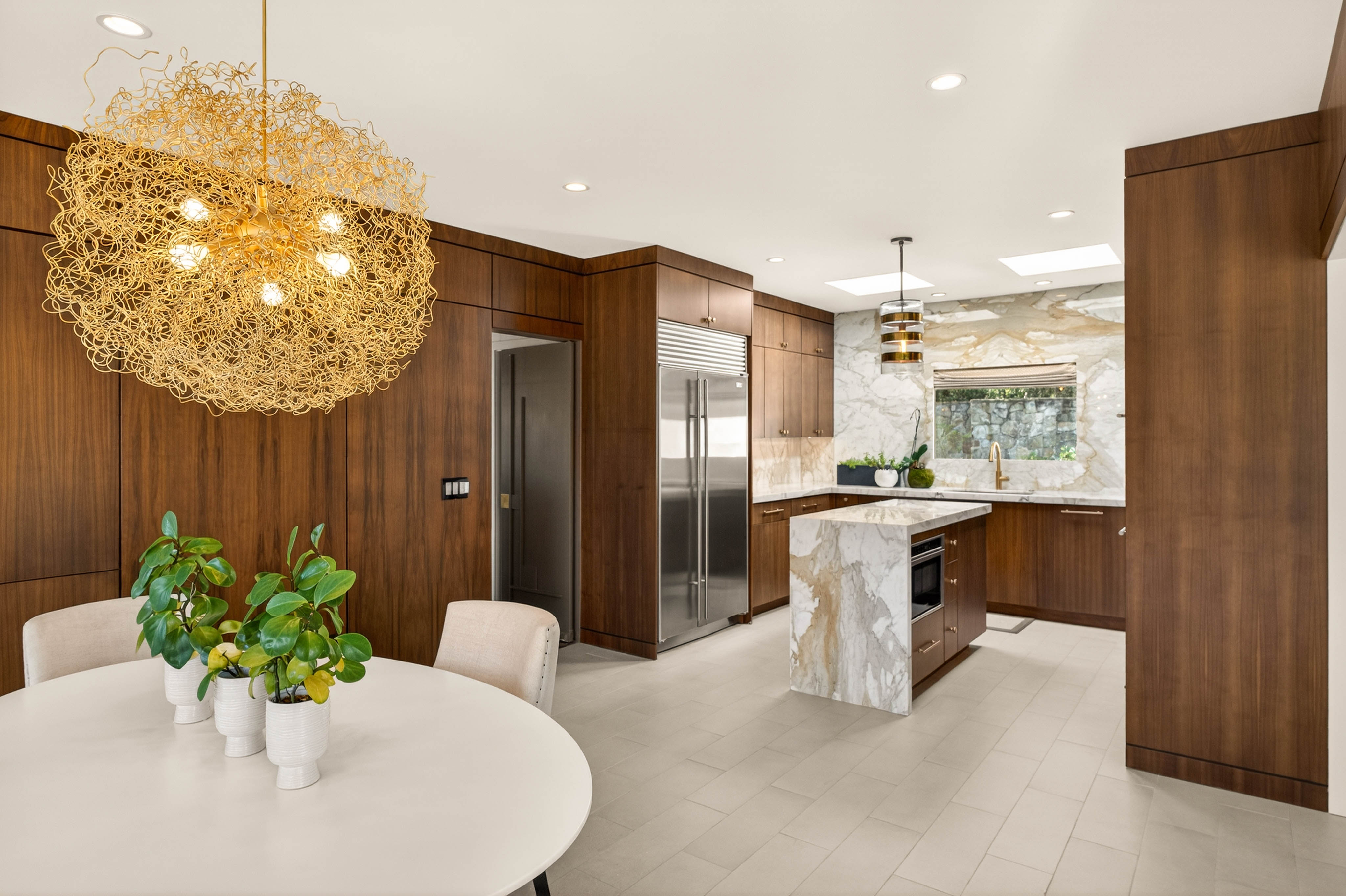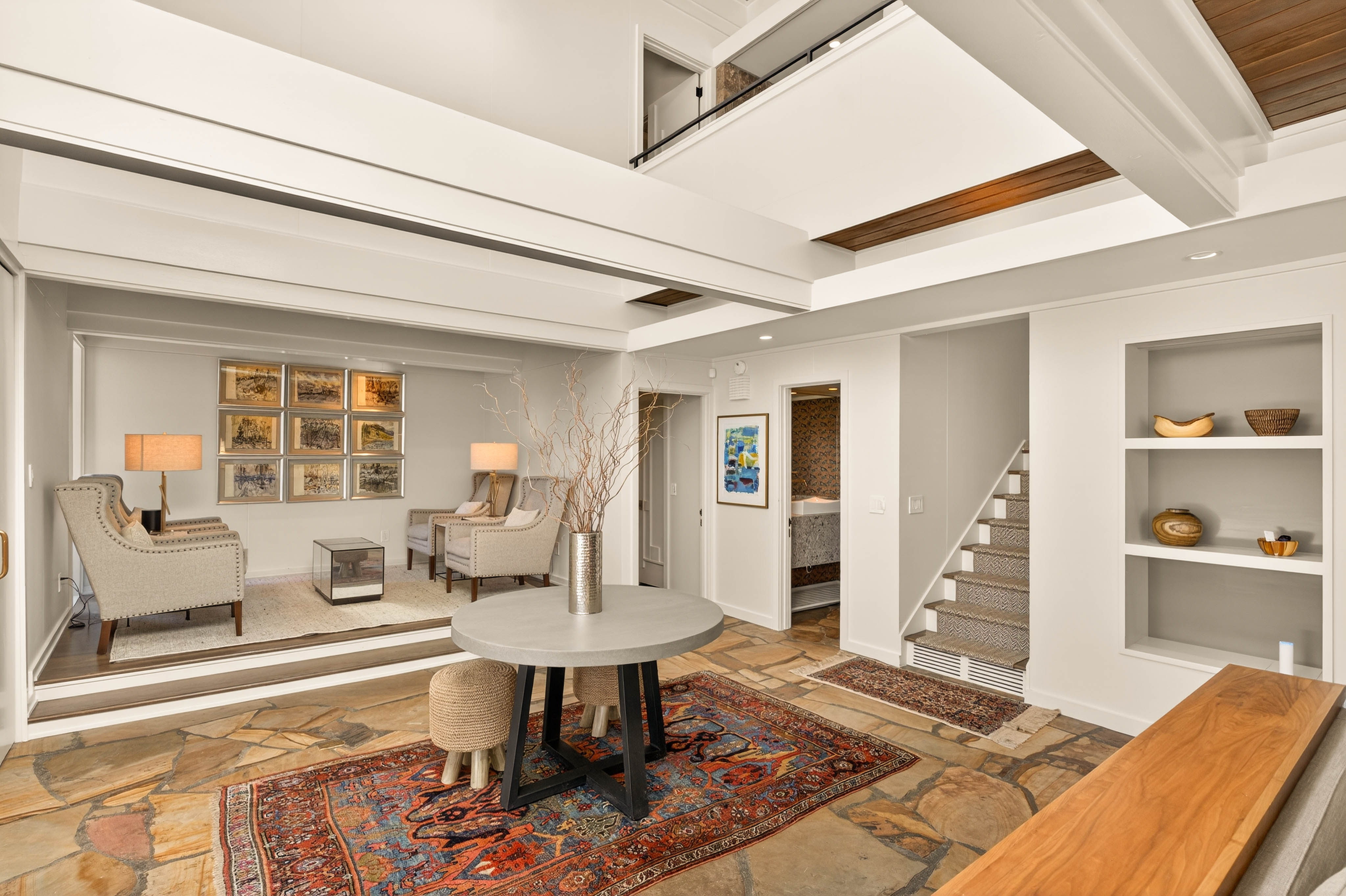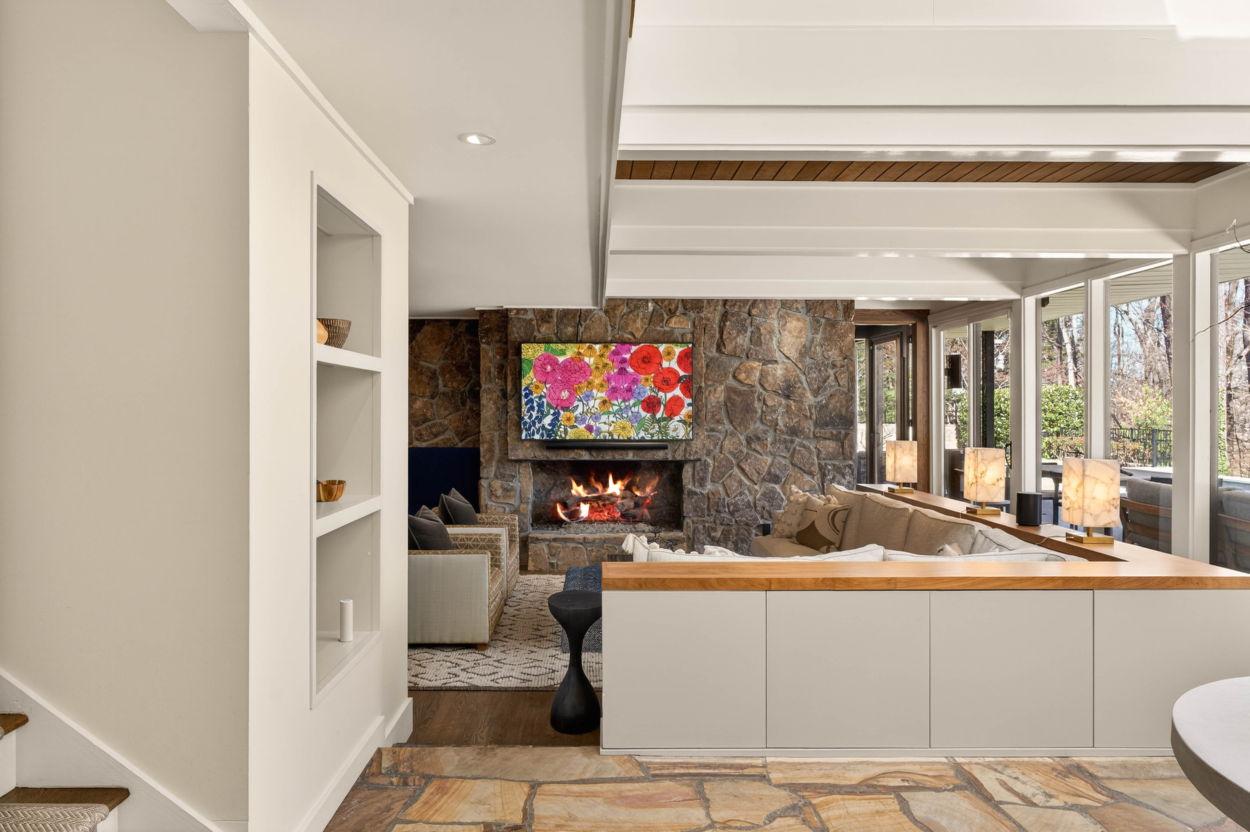 Nestled on an extraordinarily private 2.33-acre estate in the coveted Winterthur community, this architectural jewel is discreetly positioned in the heart of Sandy Springs—offering a rare convergence of provenance, design pedigree, and resort-caliber grounds. Originally conceived as the personal residence of renowned architect Robert Green, protégé and direct understudy of Frank Lloyd Wright, the home has been masterfully reimagined under the direction of acclaimed architect Rodolfo Castro—preserving its midcentury integrity while elevating it to a standard of modern luxury. A gated approach and a long and meandering newly constructed driveway set the tone for the arrival experience, framed by extensive, thoughtfully executed landscape and hardscape design by Bellwether Landscapes. The grounds are nothing short of extraordinary—featuring newly installed stone walls, expansive patios, a courtyard terrace with a statement fireplace, an extended level lawn, and a breathtaking 75-foot heated lap pool that anchors the outdoor living experience. Upon entry through striking steel and glass doors, interiors are immediately illuminated by an oversized skylight, casting natural light across the home’s refined architectural lines. The fully renovated kitchen is appointed with custom solid walnut cabinetry, Calacatta Gold countertops, and a suite of professional-grade appliances. Seamlessly integrated, the kitchen flows into an inviting breakfast room, a fireside keeping room, and an adjoining office. Four generously proportioned bedrooms reside on the main floor, each served by two impeccably renovated full baths. A dramatic stair hall descends to the terrace level, where the home’s architectural character is on full display. Here, original wood paneling has been meticulously preserved, showcased in a vintage wet bar, a raised living area, and a striking sunken family room centered around a stone fireplace with a built-in sectional—an iconic midcentury design moment. The terrace level also hosts a richly paneled fireside den, ideal as a private study or retreat, complete with a newly installed sauna. Tucked away for ultimate privacy, the primary suite is a true sanctuary—featuring dual walk-in closets and a spa-caliber bath with dual vanities, a freestanding soaking tub, and a frameless glass shower, all executed with a refined, contemporary sensibility. Every principal room along the rear elevation opens to the exceptional outdoor environment, blurring the line between interior and exterior living. Expansive patios provide ample space for dining and lounging, while the manicured lawn offers a rare, usable expanse ideal for recreation. With five bedrooms, three full and one half baths, approximately 4,500 square feet, and a three-car garage, this residence represents a once-in-a-generation opportunity to own one of metro Atlanta’s most architecturally significant midcentury homes—thoughtfully restored, meticulously curated, and impossibly private.