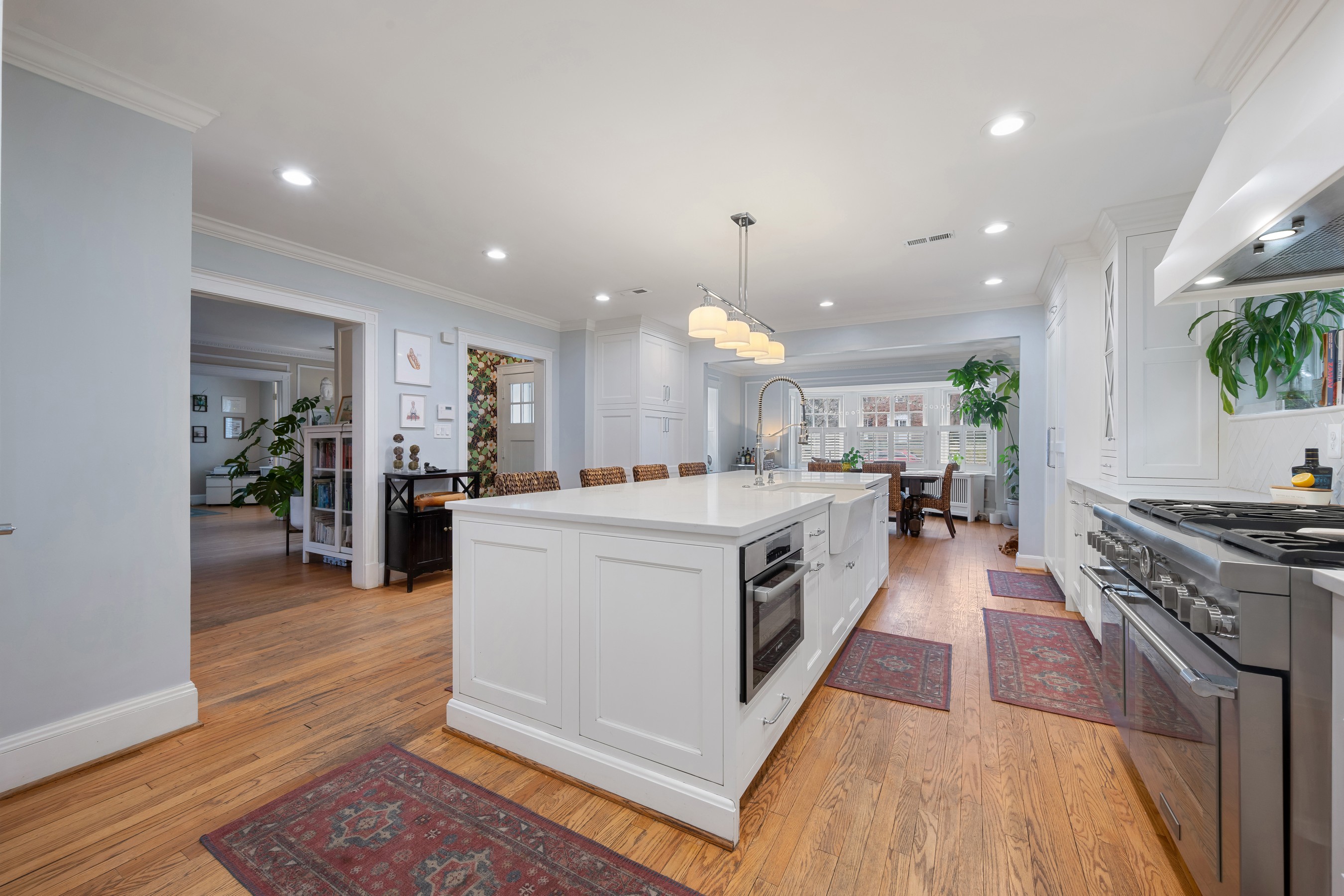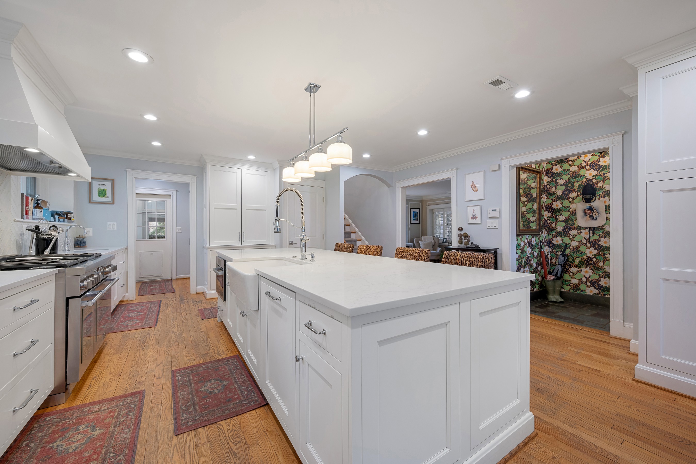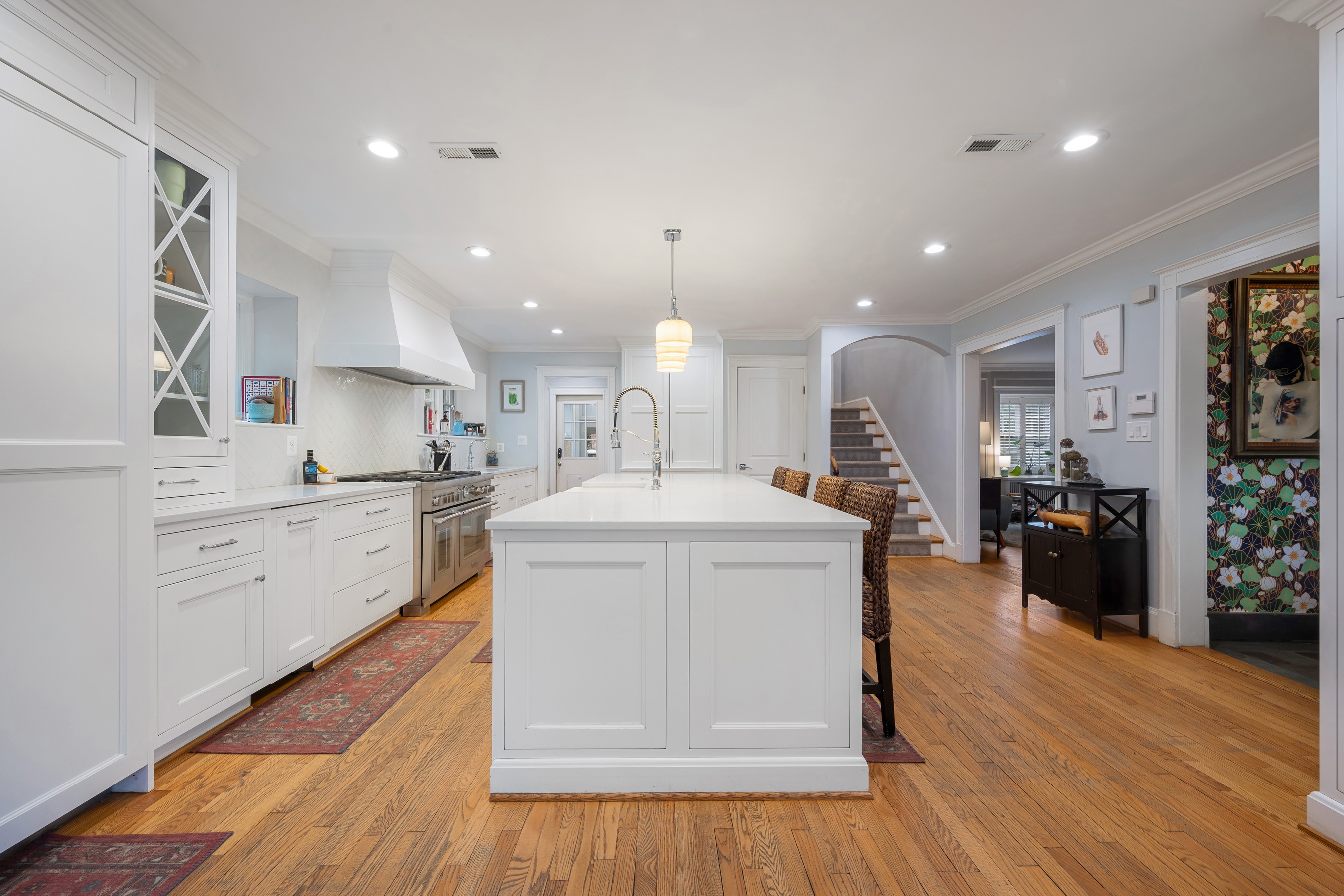 Elegant and distinguished stone residence offering five bedrooms, four full and two half baths, with attached garage in coveted Homeland. This refined home beautifully blends timeless architectural charm with modern luxury. The expansive, state of the art chef's kitchen serves as the heart of the home, featuring high end custom built in appliances, a restaurant grade six burner stainless gas range with griddle and double oven, quartz countertops, and an oversized island that anchors the space and opens to the dining area for effortless entertaining. A double mudroom just off the kitchen provides exceptional everyday convenience. The inviting family room with gas fireplace flows seamlessly into the den or home office, where French doors open to a wonderful screened porch, creating effortless indoor/outdoor living. The upper levels host five generously sized bedrooms and four beautifully appointed full baths, along with a convenient laundry area. The finished lower level offers an ideal entertaining space with a recreation room featuring a built in wet bar, abundant storage, an additional laundry area, and a half bath. Outside, enjoy the peaceful and private fenced rear yard with patio, perfect for relaxing or gathering with friends.