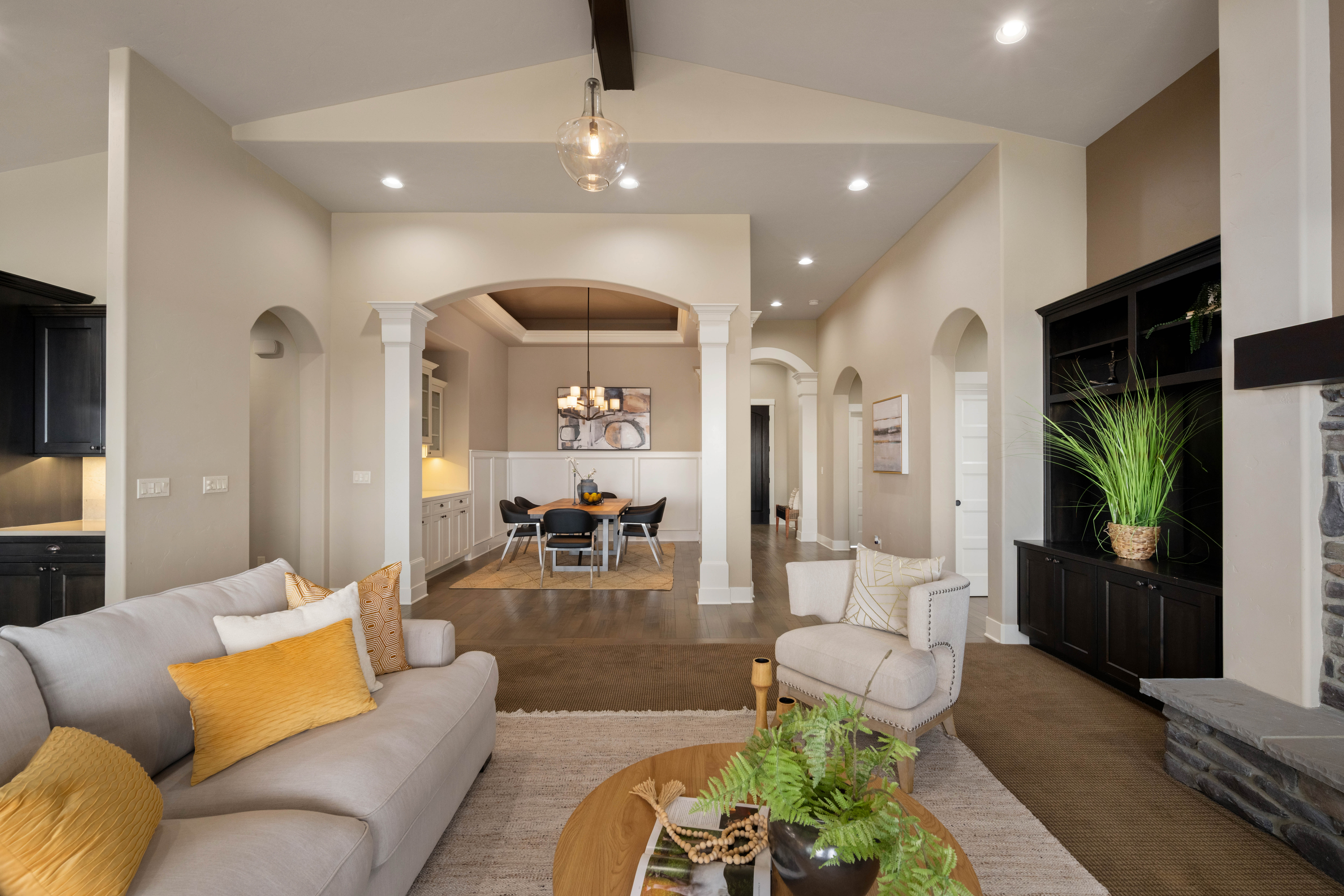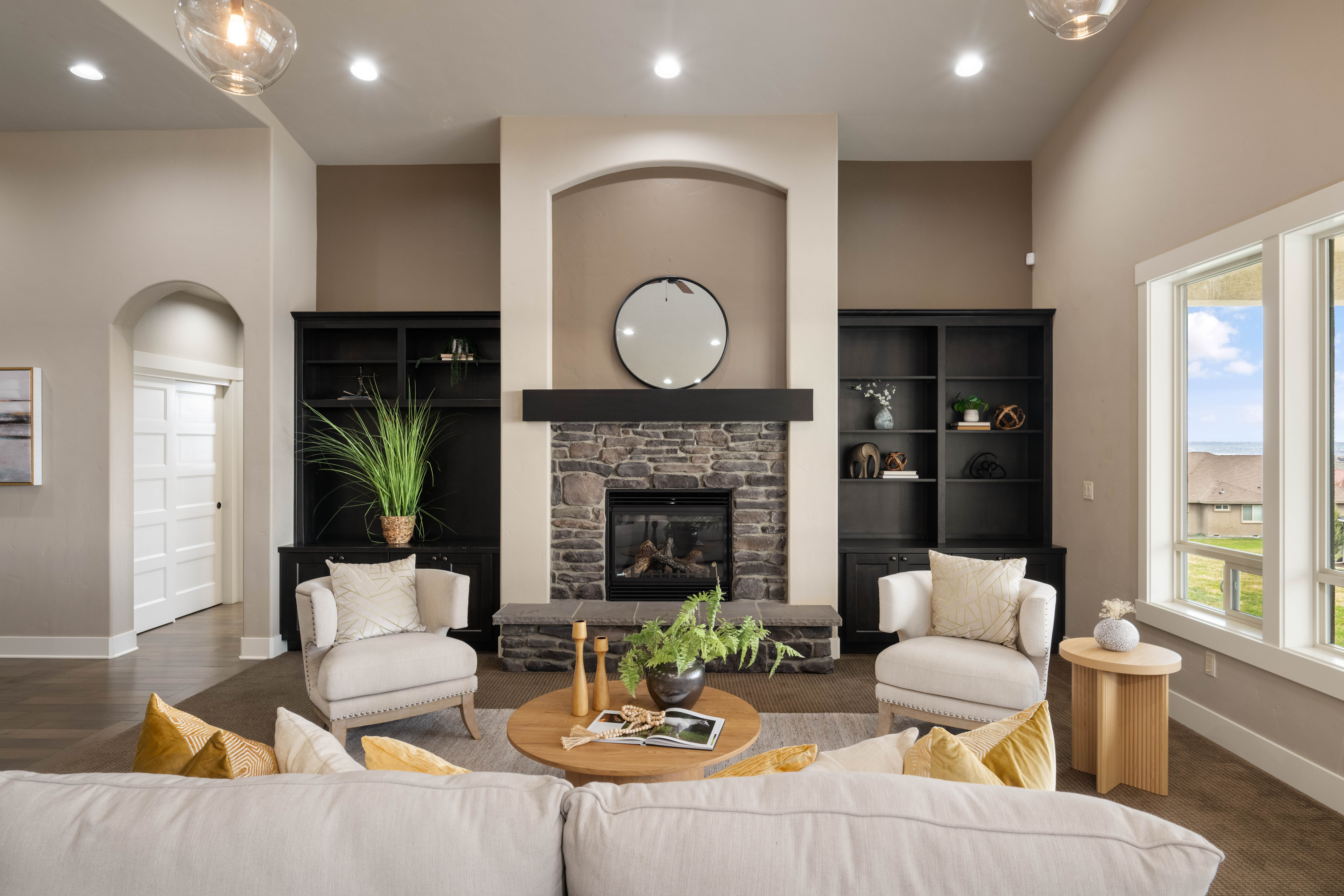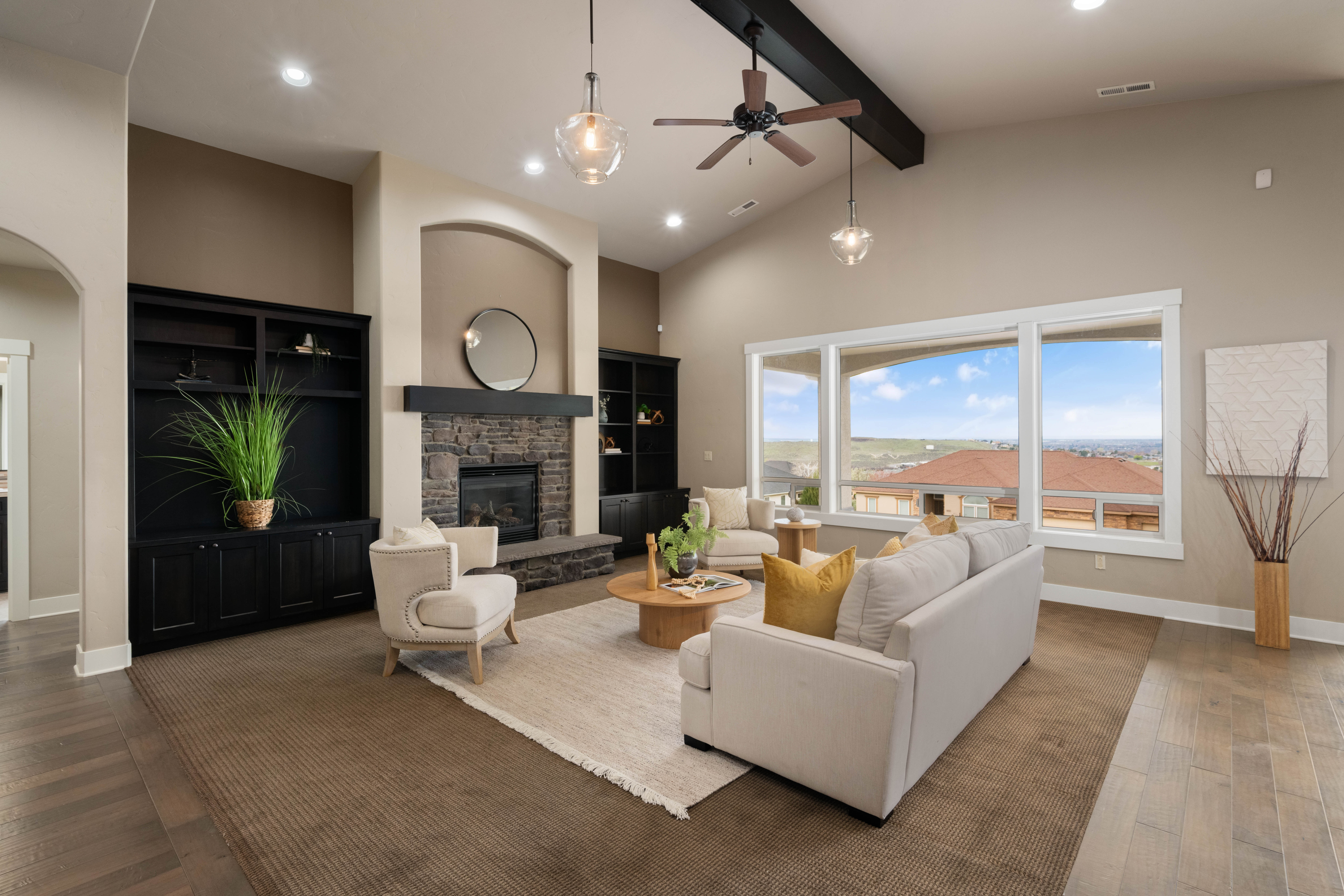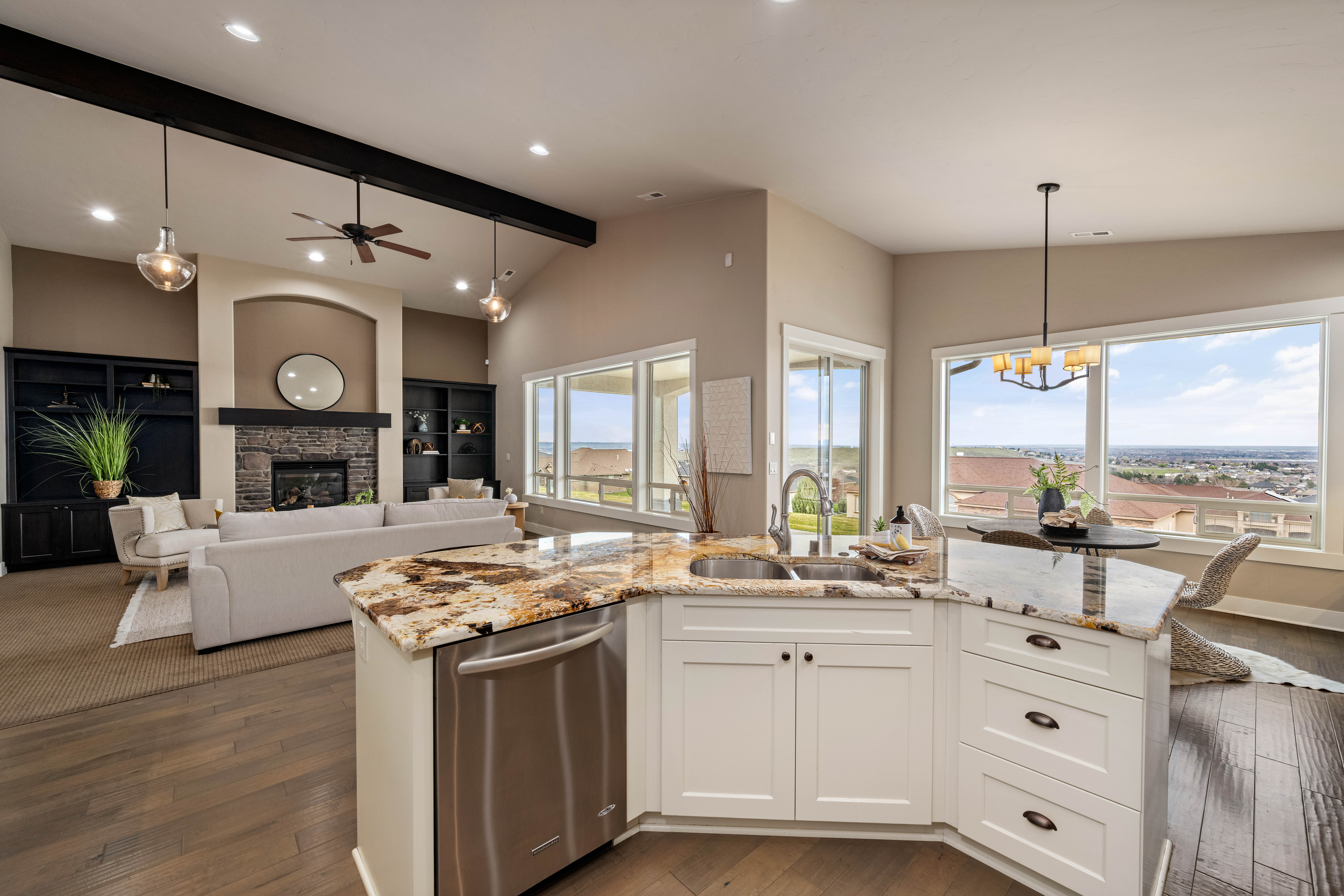 Set in South Richland’s highly sought-after Italy streets, this stunning home was designed to capture panoramic river and city views from the moment you walk in. Step inside and you’re welcomed by soaring vaulted ceilings, engineered hardwood flooring, wood-wrapped windows, and a warm, neutral palette that perfectly frames the views beyond, while the dining area makes a beautiful first impression with its coved, lit ceiling and built-in buffet, creating an inviting space for gatherings. From there, the home opens into a breathtaking great room featuring wood beams, custom built-ins, and a floor-to-ceiling stone fireplace, all designed to take in the sunsets and evening city lights. The kitchen flows seamlessly off the main living area and truly is the heart of the home, anchored by a massive granite slab island with abundant seating, stainless KitchenAid appliances, a six-burner range with vent hood, pot filler, mosaic tile backsplash, and a frosted glass walk-in pantry, plus a built-in wine station with chiller for effortless entertaining. Privately tucked away, the primary suite offers a quiet retreat with a tray ceiling and stunning river views, where you can imagine waking up to sunrises each morning, while the ensuite features a soaking tub, dual-head glass tile shower, and expansive counter space. The split-bedroom design continues with two additional bedrooms, including a front bedroom with its own private ensuite ideal for guests, along with a dedicated office and a total of three bathrooms. Step outside to a generously sized lot with a large, flat grassy side yard and a covered patio, perfect for relaxing or entertaining on a quiet street. Additional features include a tankless water heater and wired security system. Thoughtfully designed, beautifully maintained, and truly move-in ready with unforgettable views.