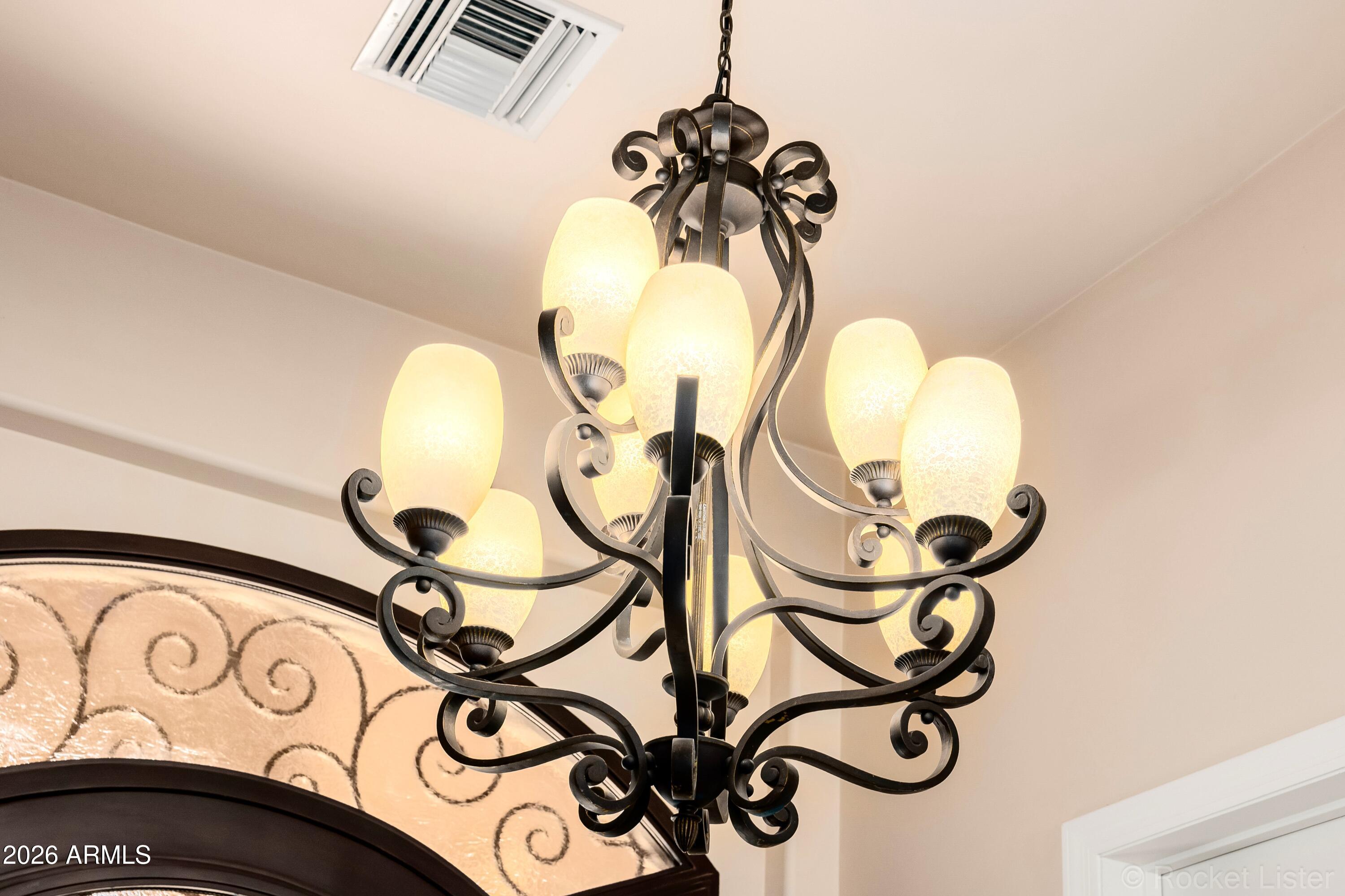Exceptional gated estate where luxury meets resort living. Nestled on nearly half an acre inside the prestigious gated Topaz community in Glendale. This stunning single-level custom estate delivers sophistication, scale, and unforgettable indoor-outdoor living. Spanning 4,215 square feet, the expansive open floor plan offers 4 bedrooms, 5 bathrooms, a private executive office, and a secondary primary suite -- perfect for multigenerational living or hosting guests in complete comfort and privacy. At the heart of the home, the gourmet kitchen makes a statement with rich cherry wood cabinetry, granite countertops, an oversized center island, and premium stainless steel KitchenAid appliances. Designer finishes elevate every space, including travertine flooring, high-grade hardwood in the kitchen and dining areas, dramatic coffered ceilings, skylights, plantation shutters, and two elegant marble fireplaces. A spacious wet bar and whole-home surround sound system create the ultimate entertaining environment, while a central vacuum system adds modern convenience. Step outside and experience true resort-style living. The backyard is a private oasis featuring a heated Pebble Tec pool with a waterfall grotto and spa, expansive travertine decking, exterior gas and wood-burning fireplaces, and a built-in BBQ designed for unforgettable gatherings. An RV gate and rare 4-car garage complete this exceptional property. Enjoy fully owned SolarEdge solar panels delivering long-term energy savings!
