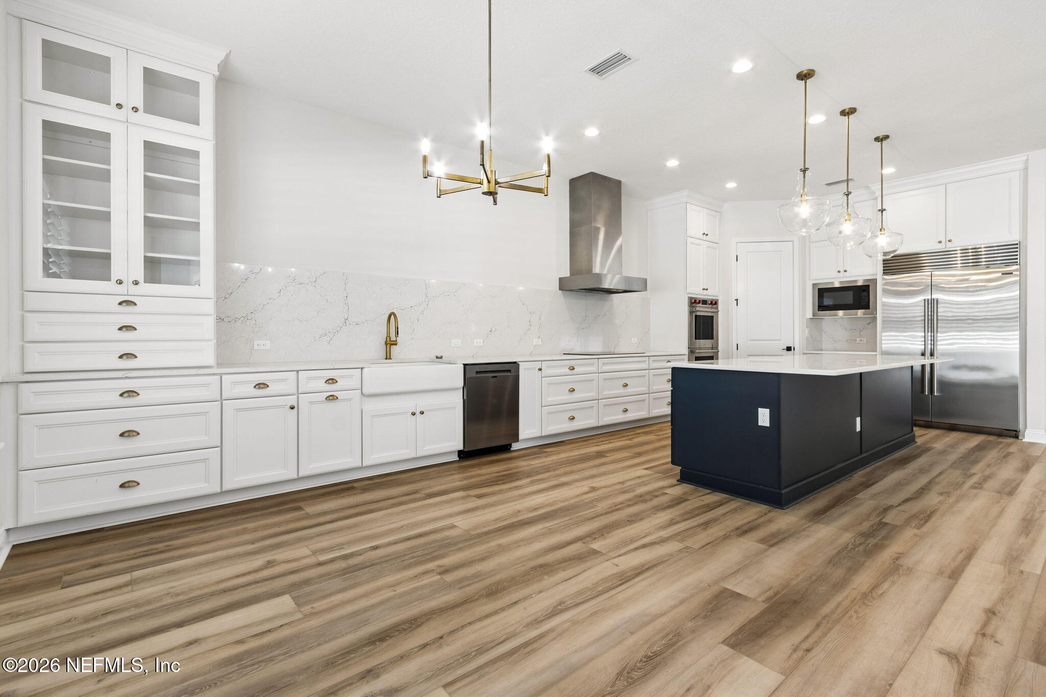 Welcome to this stunning luxury residence located in the highly sought-after gated community of Plantation Estates within Julington Creek Plantation. From the moment you step inside, you are greeted by soaring 22-foot ceilings in the grand foyer and expansive great room, creating a light-filled and impressive first impression. The open-concept floor plan features a beautifully designed living space highlighted by a floor-to-ceiling shiplap fireplace and triple sliding glass doors that seamlessly connect indoor and outdoor living. A private flex space with glass French doors offers the perfect setting for a home office or study. The chef's kitchen is a true showpiece, featuring a massive 10-foot island, Cambria quartz countertops, double-stacked Diamond Vibe cabinetry with soft-close drawers, and premium Wolf appliances. Elegant finishes and thoughtful design continue throughout, including Coretec luxury vinyl plank flooring with a 30 mil wear layer extending through the main living areas, upstairs loft, media room, and hallways. The first-floor primary suite provides a private retreat with a spa-like bathroom showcasing quartz countertops, a jetted soaking tub, and a spacious sit-in shower, complemented by Kohler fixtures. An additional bedroom and full bath on the first floor offer flexibility for guests or multi-generational living. Upstairs, you'll find additional bedrooms, a media space, and loft area, all designed with comfort and functionality in mind. Additional upgrades include 10-foot ceilings, plantation shutters, upgraded carpet padding in bedrooms, a fully equipped laundry room with new cabinetry, countertops, and sink, as well as a water softener system. Step outside to enjoy the generously sized 0.32-acre lot featuring a variety of mature fruit and nut trees including pecan, satsuma orange, navel orange, fig, and Joey avocado--creating a private and inviting backyard retreat. Residents of Julington Creek Plantation enjoy resort-style living with access to exceptional amenities including multiple aquatic facilities, a fitness center, tennis courts, sports fields, parks, playgrounds, and miles of walking and biking trails. The community also features a championship golf course, recreation center, and year-round events for all ages. Excitingly, a brand-new state-of-the-art aquatic center on Davis Pond Road is underway, featuring a resort-style family pool with slide tower, separate adult pool, competition pool, clubhouse, and gathering spaces--further elevating the lifestyle this community offers. This exceptional home combines luxury, space, and top-tier community amenities in one of St. Johns County's most desirable locations.