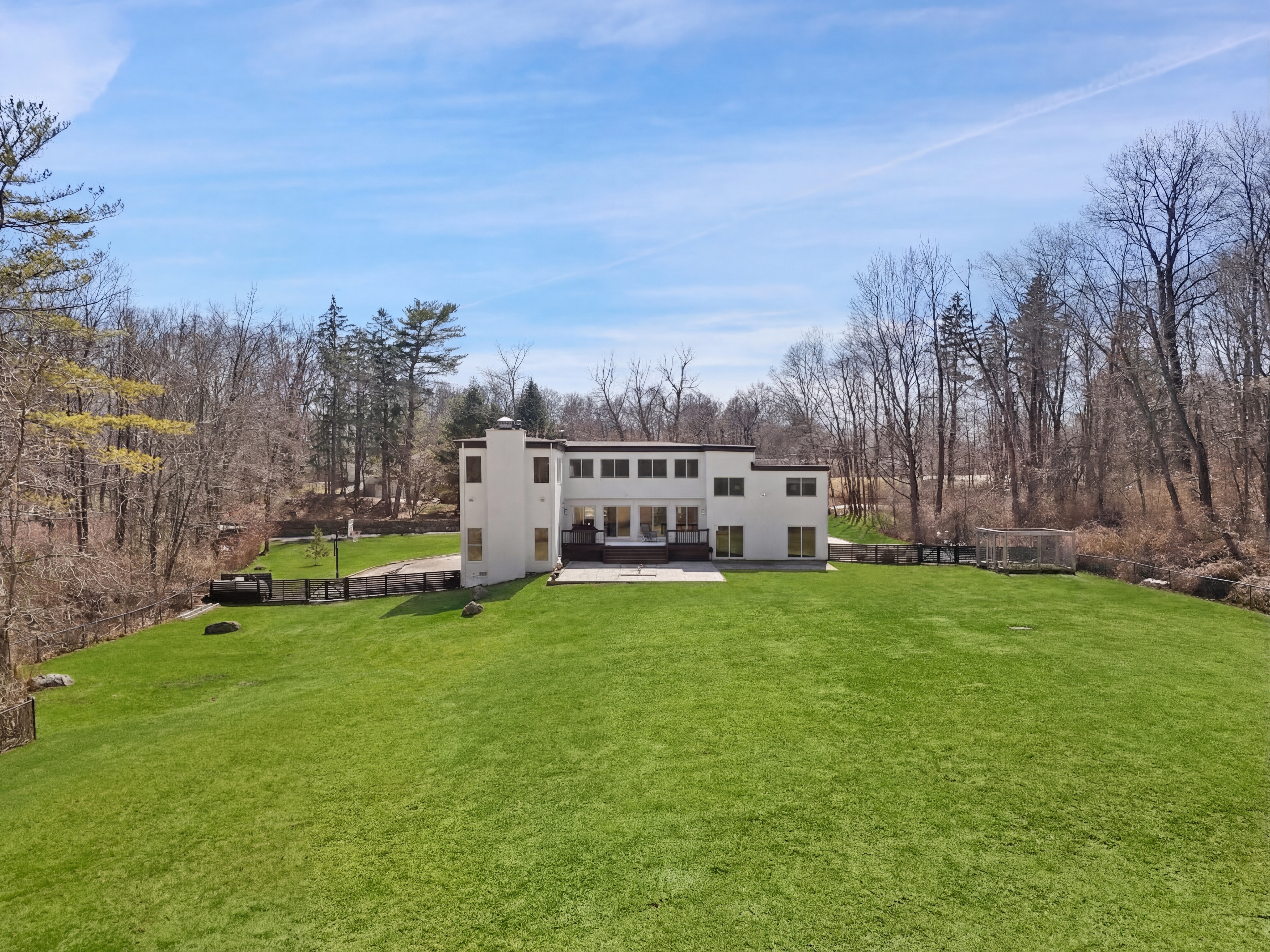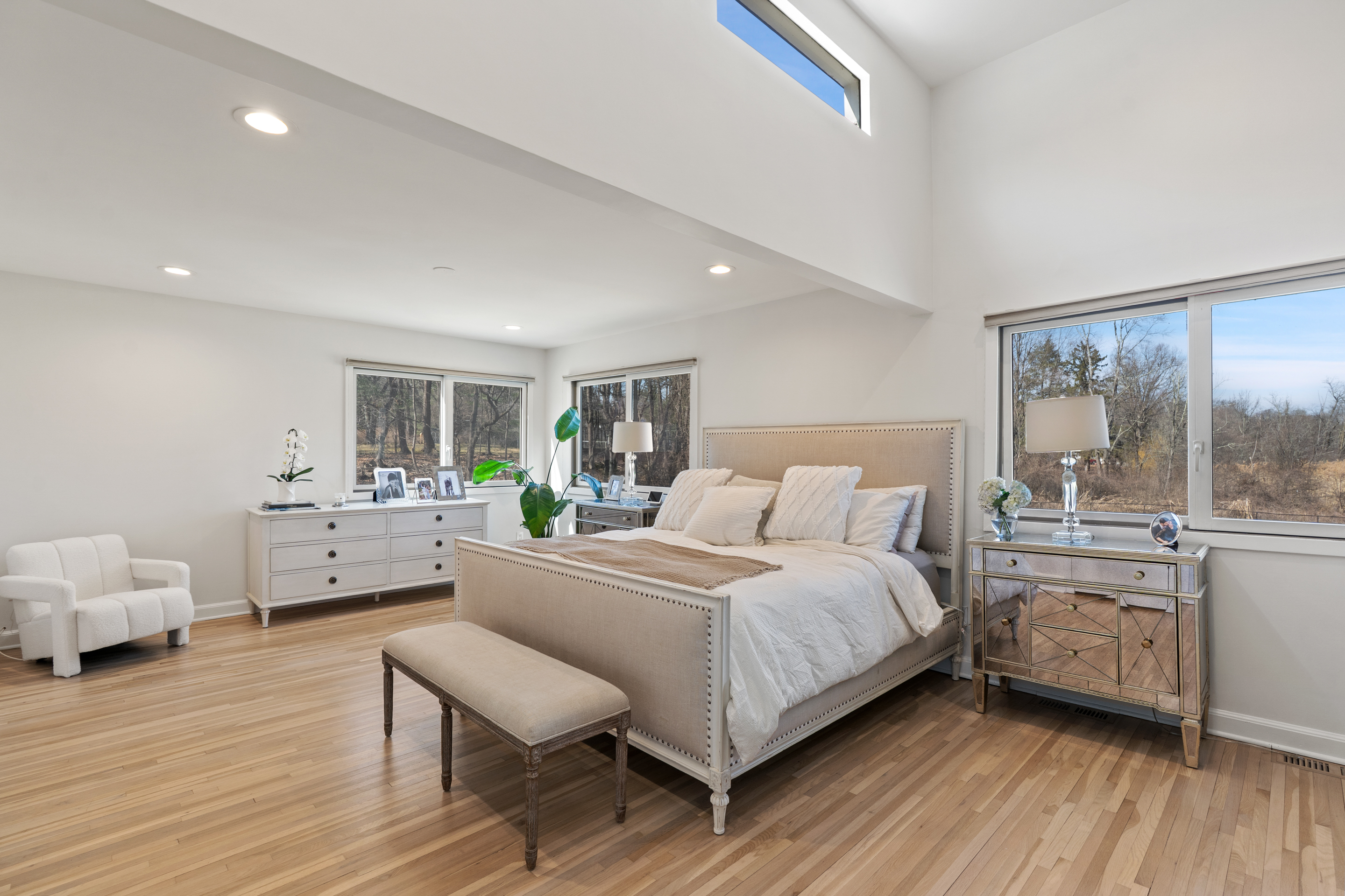 Set along a premier Chappaqua road on nearly three acres, the home is defined by its airy interiors, soaring ceilings, light hardwood floors throughout, and walls of windows that invite the outdoors in, framing tranquil, park-like views from nearly every vantage point.