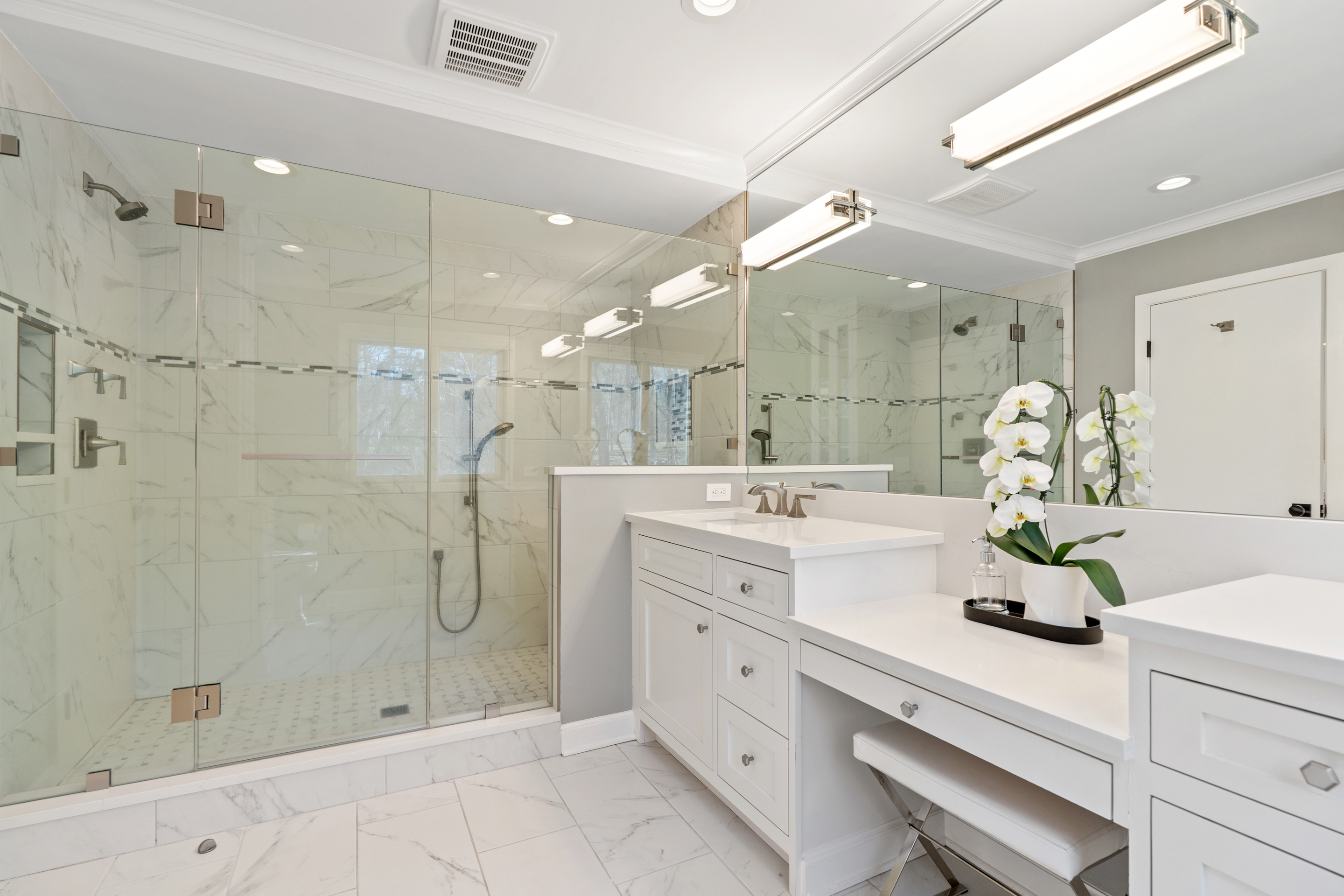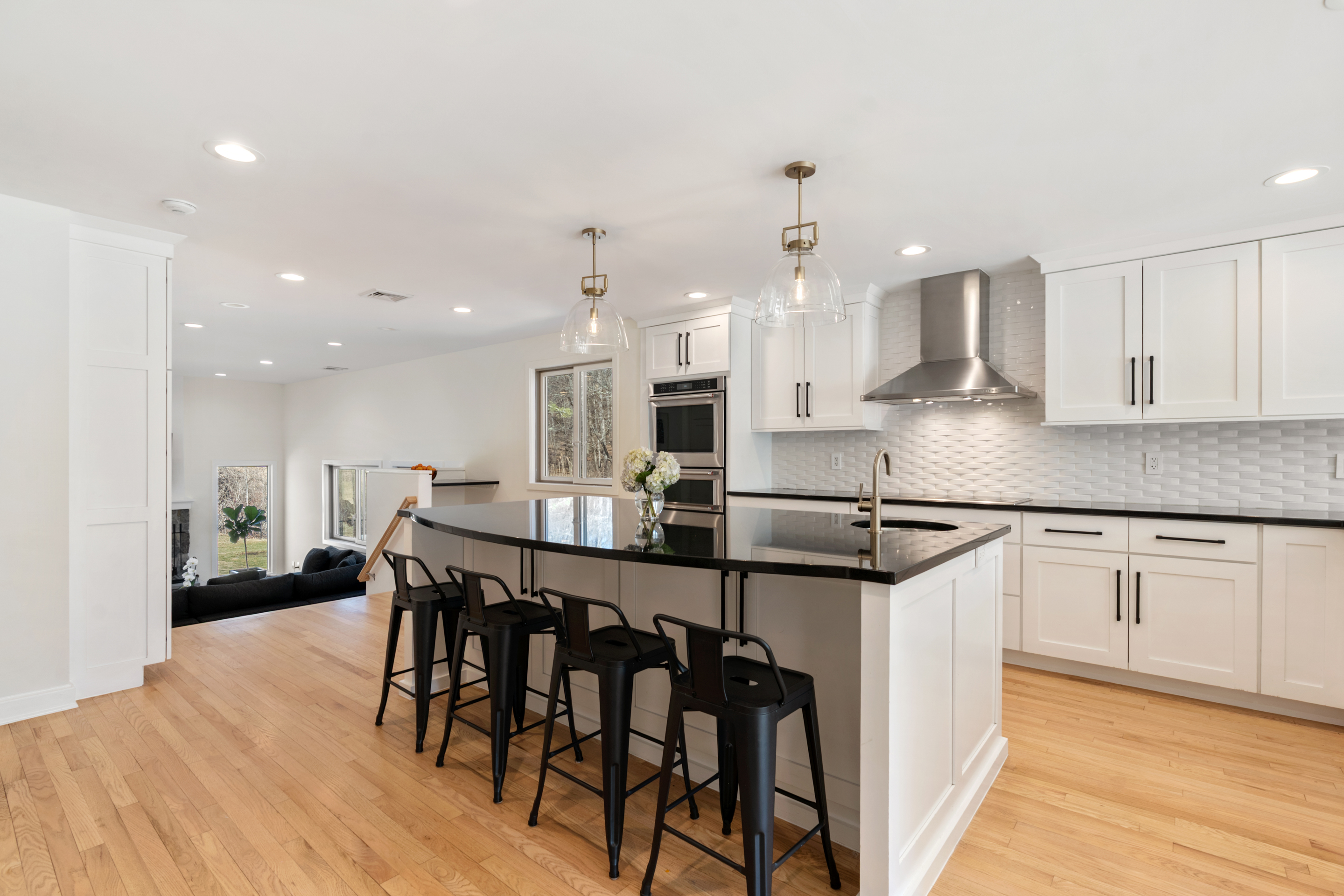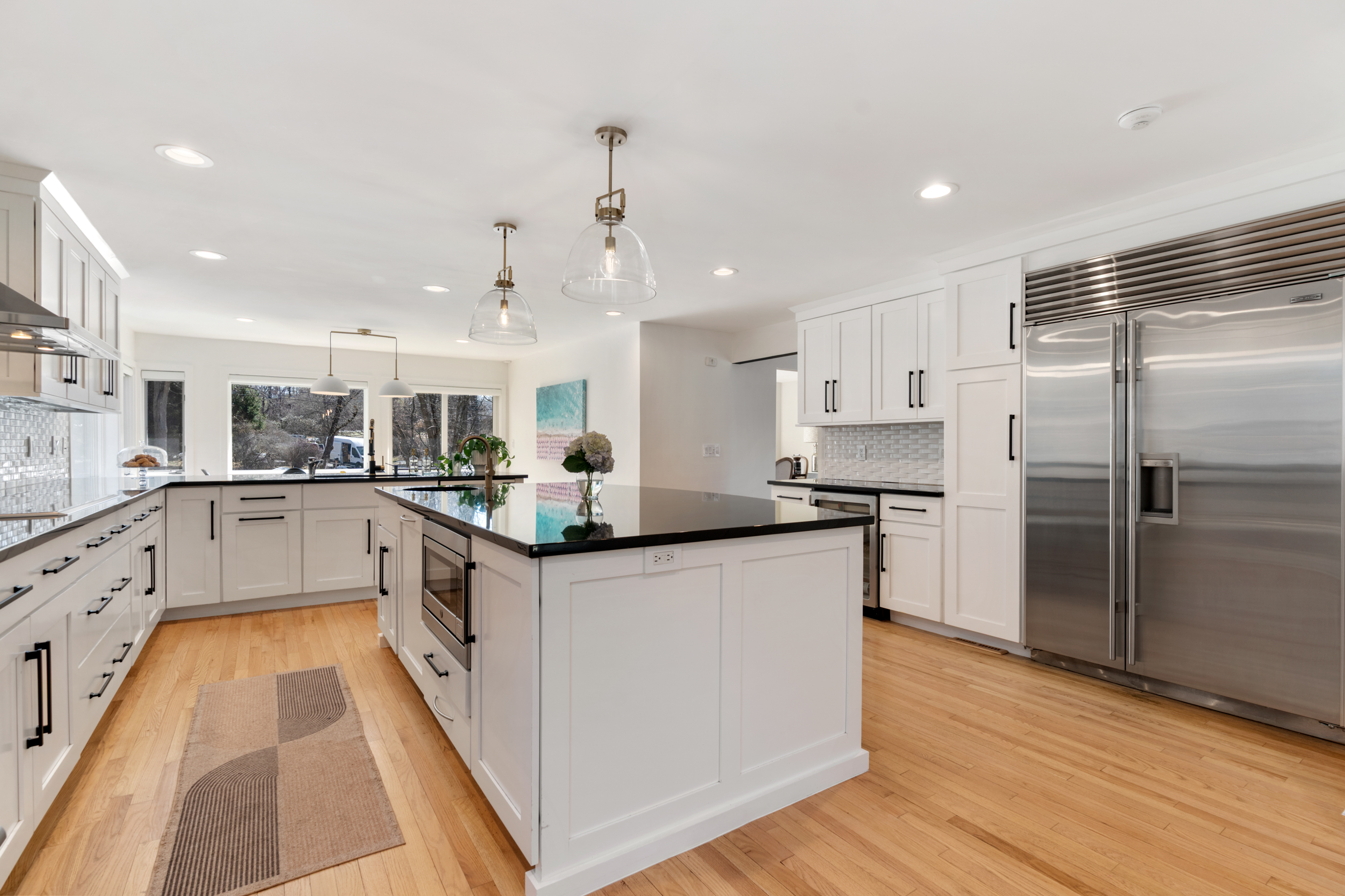 At the heart of the home, a beautifully renovated, oversized white Chef's kitchen with center island and sunlit breakfast area opens seamlessly to a dramatic family room with fireplace and multiple exposures.
