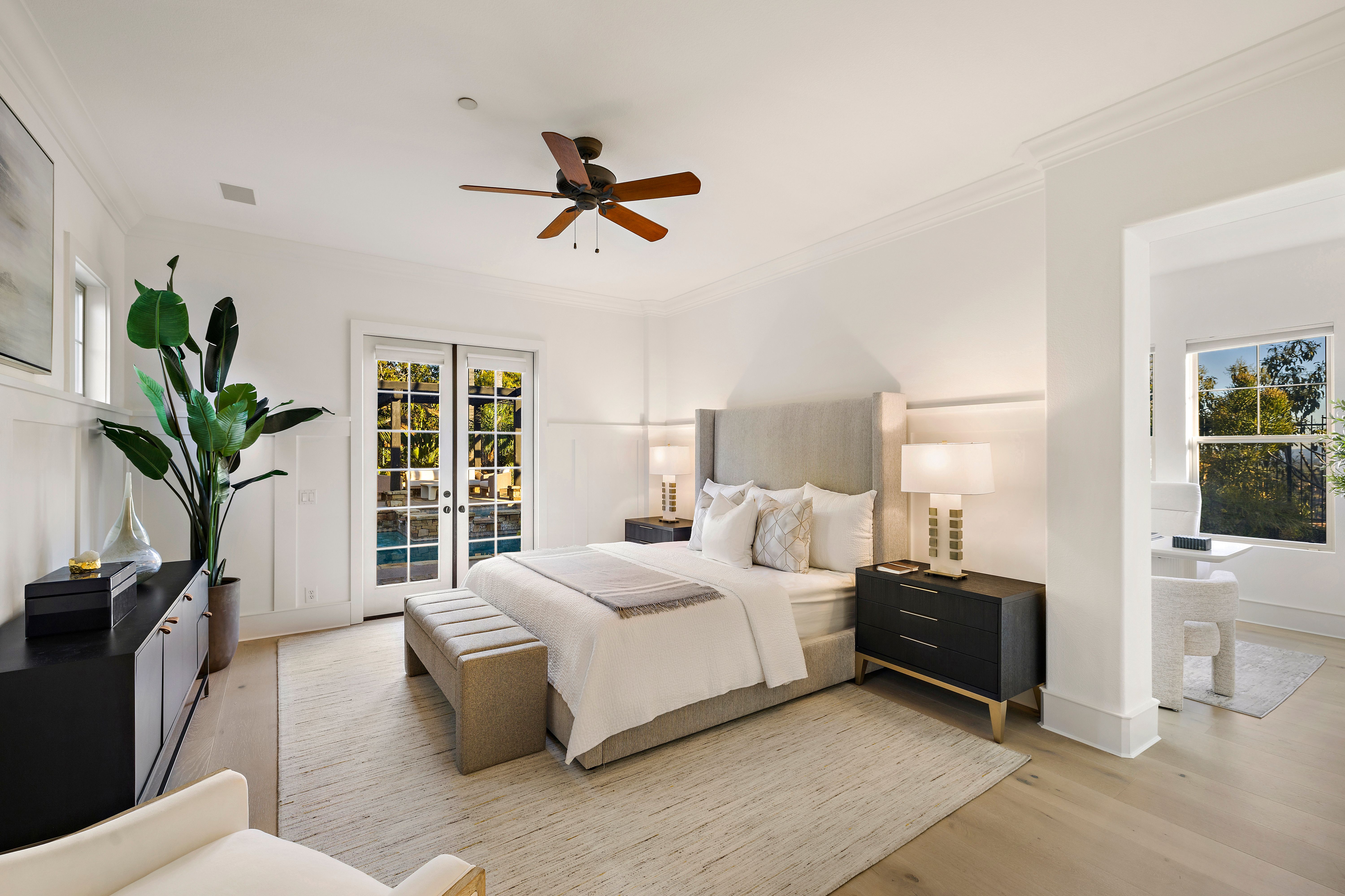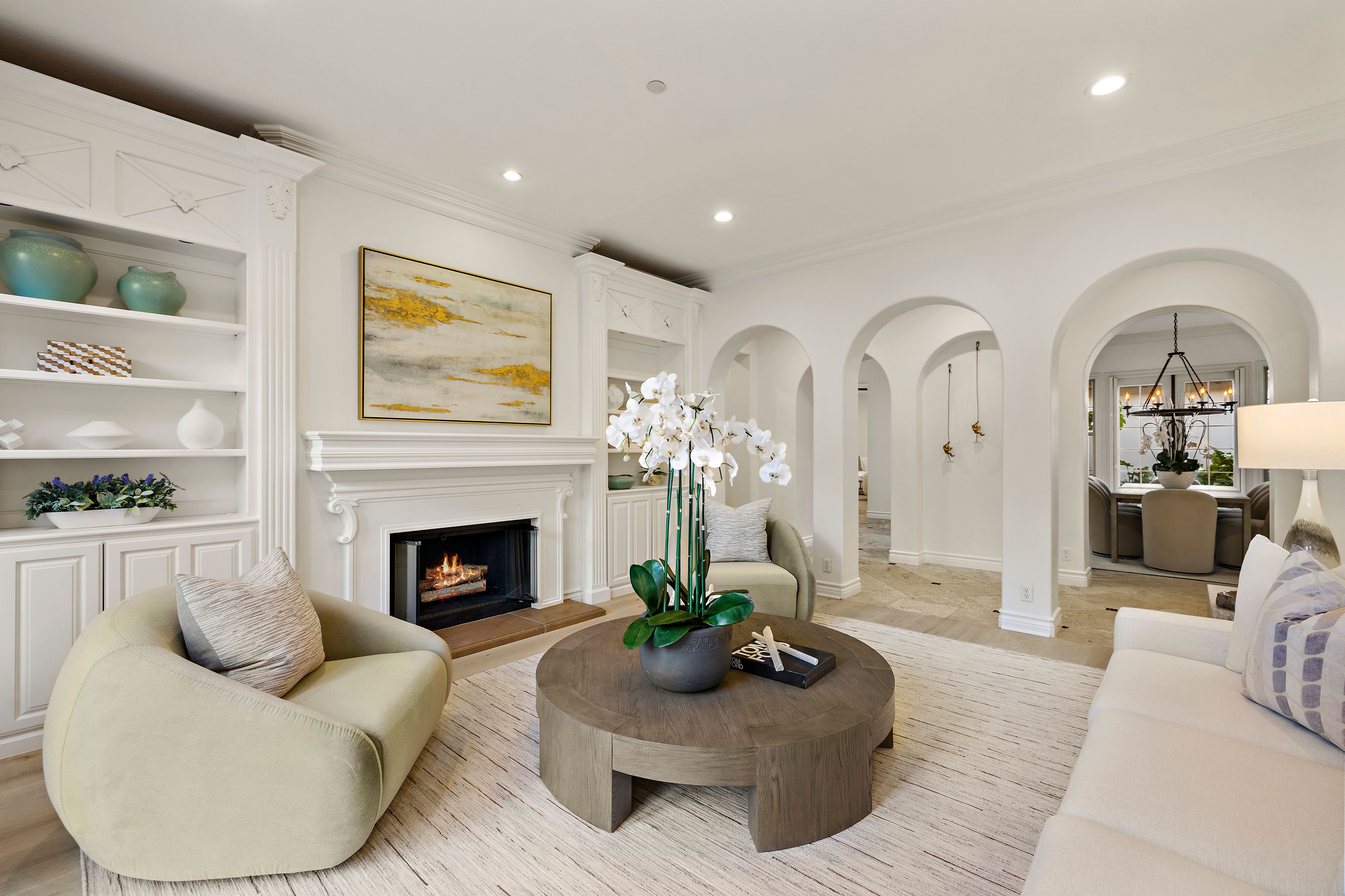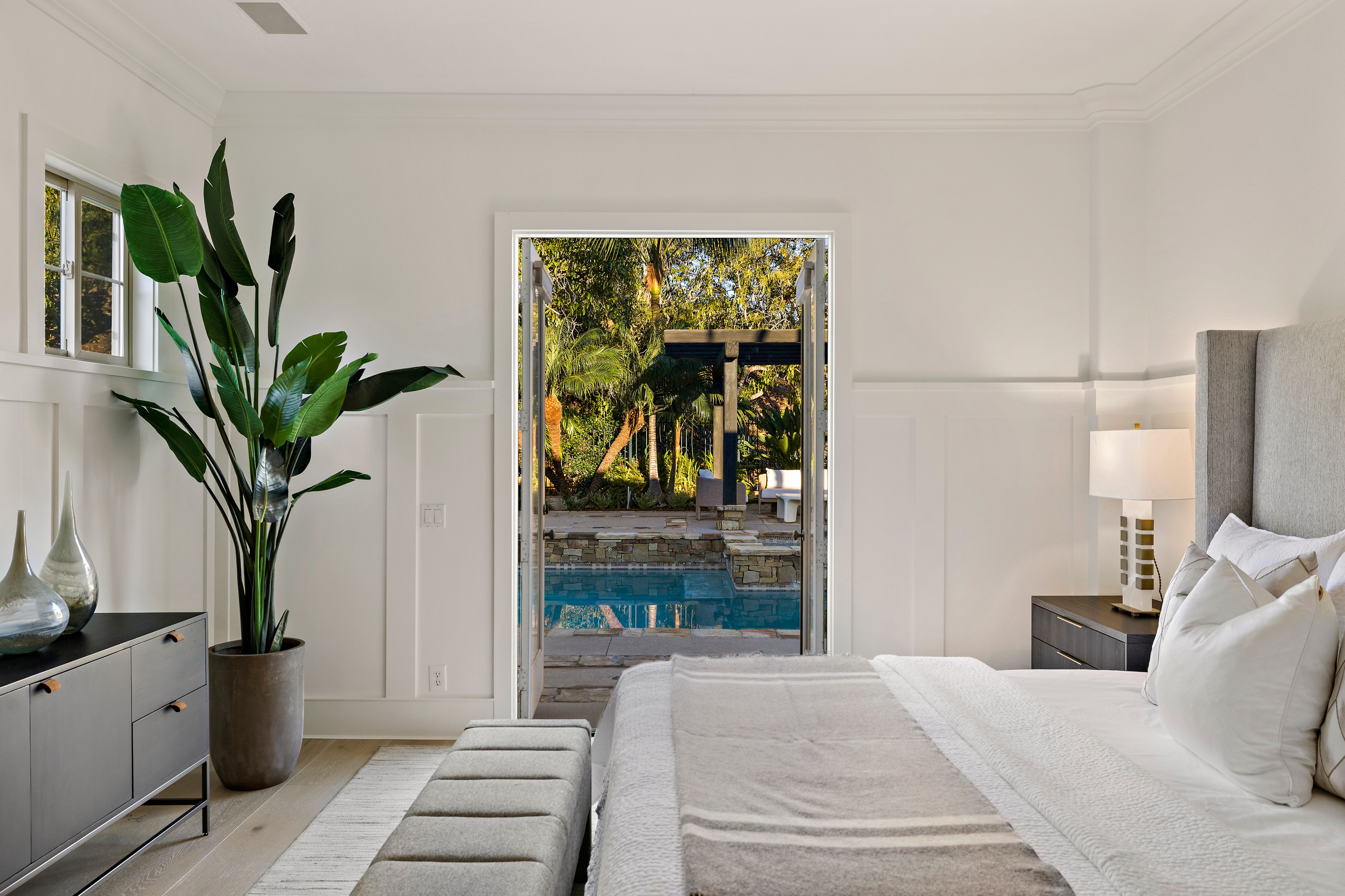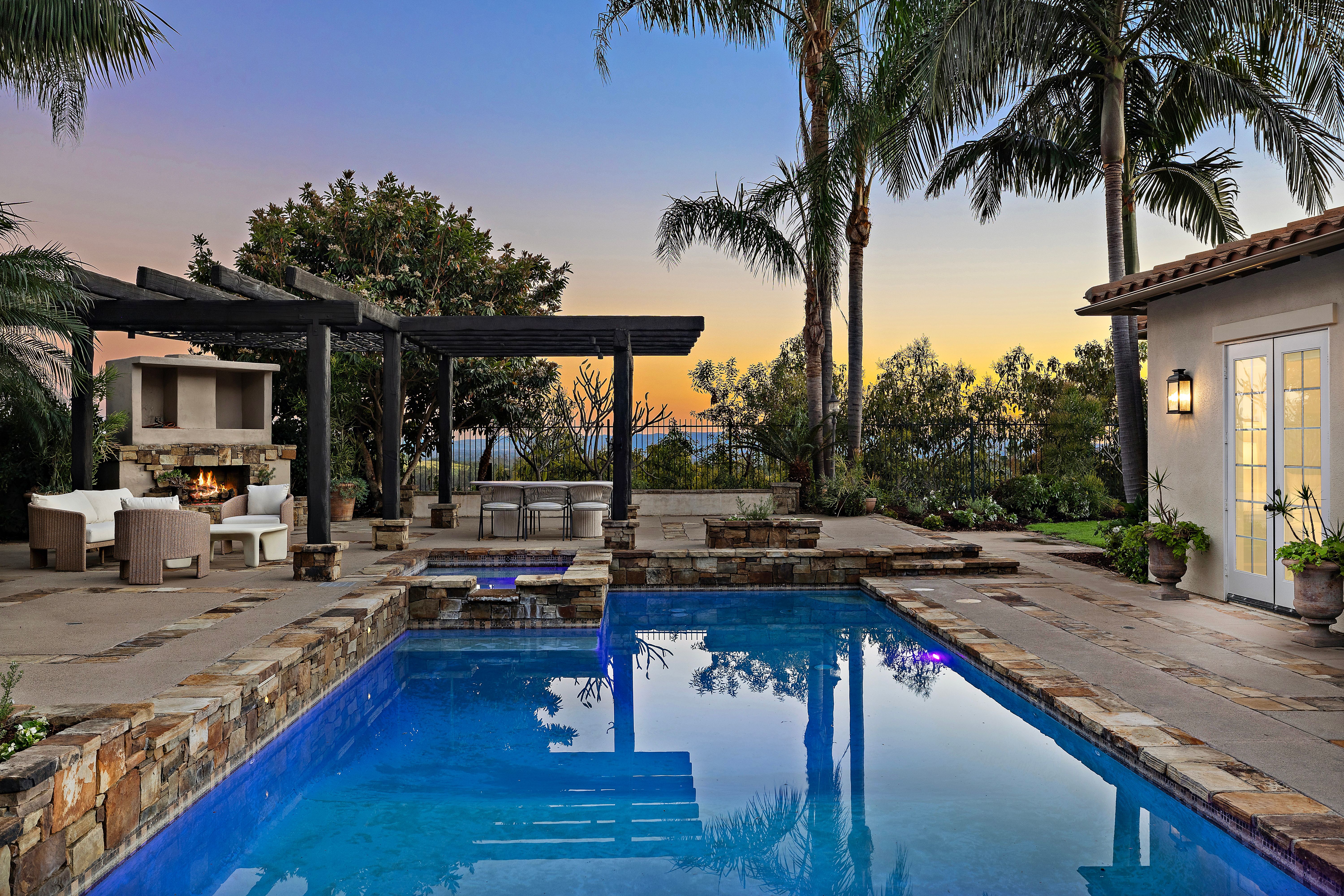 Set on one of the largest lots in the coveted, gate guarded community of Emerson, this rarely available single level estate offers 4,333 ± sf of refined living on an expansive 18,030 ± sf cul de sac lot. Nestled for exceptional privacy, the home is surrounded by avocado groves with city light and mountain views providing a quiet, scenic backdrop to everyday living. Step through a tranquil atrium and breezeway into the formal living and dining rooms, where elegance meets comfort. The chef’s kitchen, beautifully remodeled with a Black Leathered Granite island, Viking cooktop and microwave, Thermador double oven, KitchenAid dishwasher, and Dacor built in refrigerator, flows seamlessly into the informal dining and family room, both opening effortlessly to the backyard oasis. Outside, the estate is designed for relaxation and entertaining. Unwind in the sparkling pool and spa, gather around the built in fireplace, or enjoy alfresco dining at the fully equipped outdoor kitchen. The expansive grounds now feature generous, lush grassy areas, perfect for recreation, gatherings, or simply enjoying the home’s remarkable sense of space and privacy. The home has been thoughtfully expanded to include an additional bedroom and generous bonus room, ideal for extended family or guests. Built with steel beams for enduring stability and featuring dual whole house fans with independent controls, the residence combines durability with sophisticated luxury. This exceptional single level estate offers a rare blend of scale, privacy, and understated elegance within one of the area’s most desirable communities.