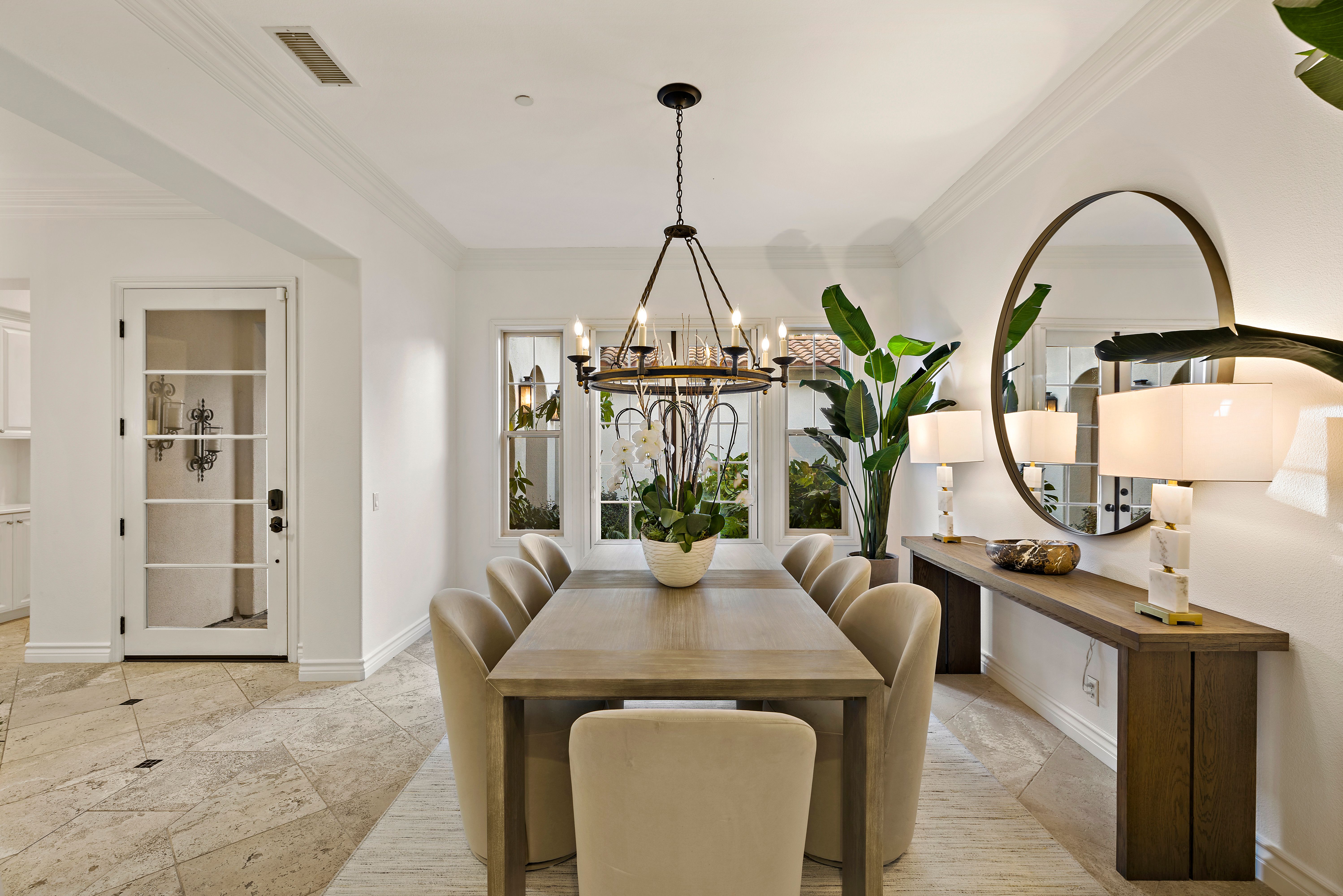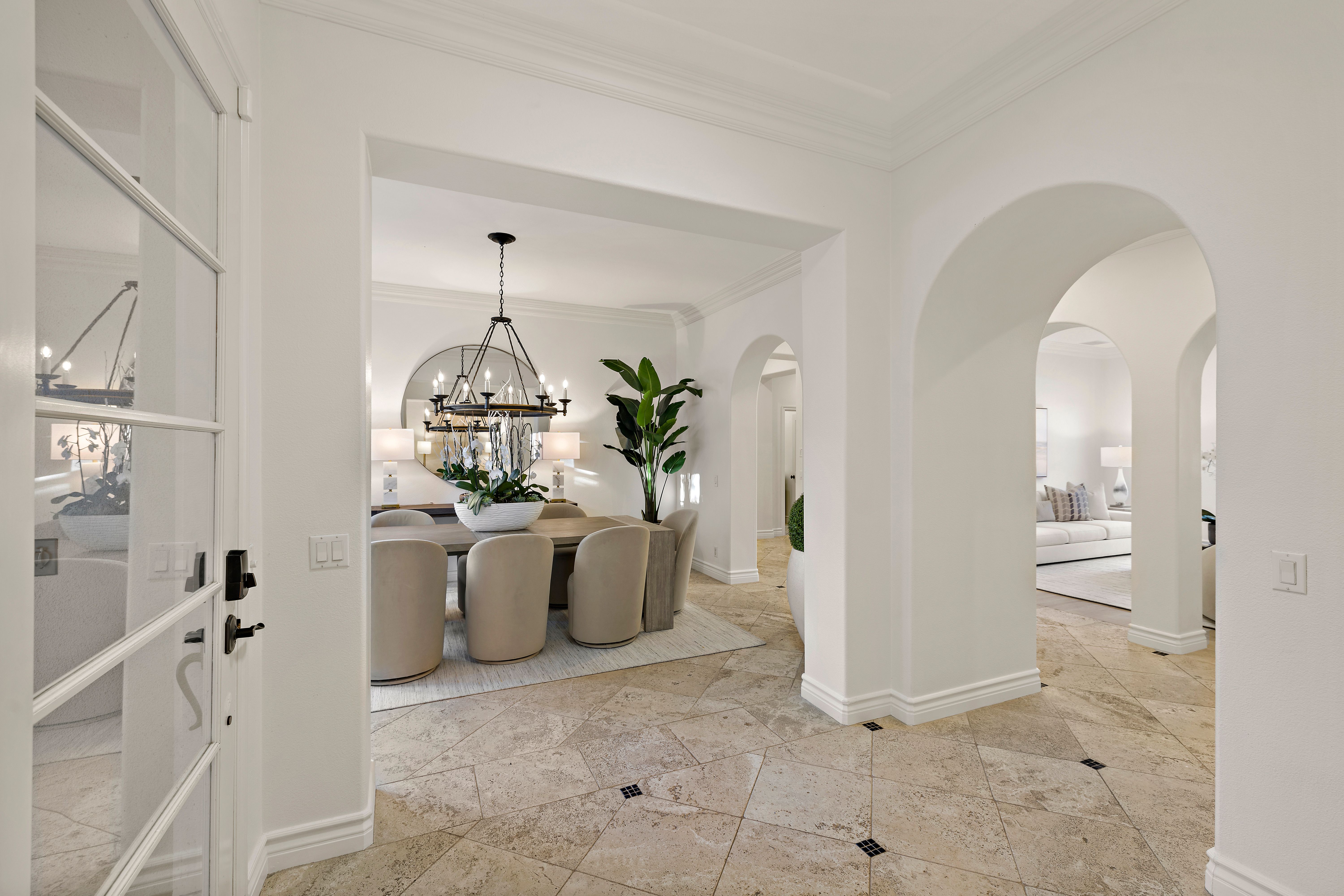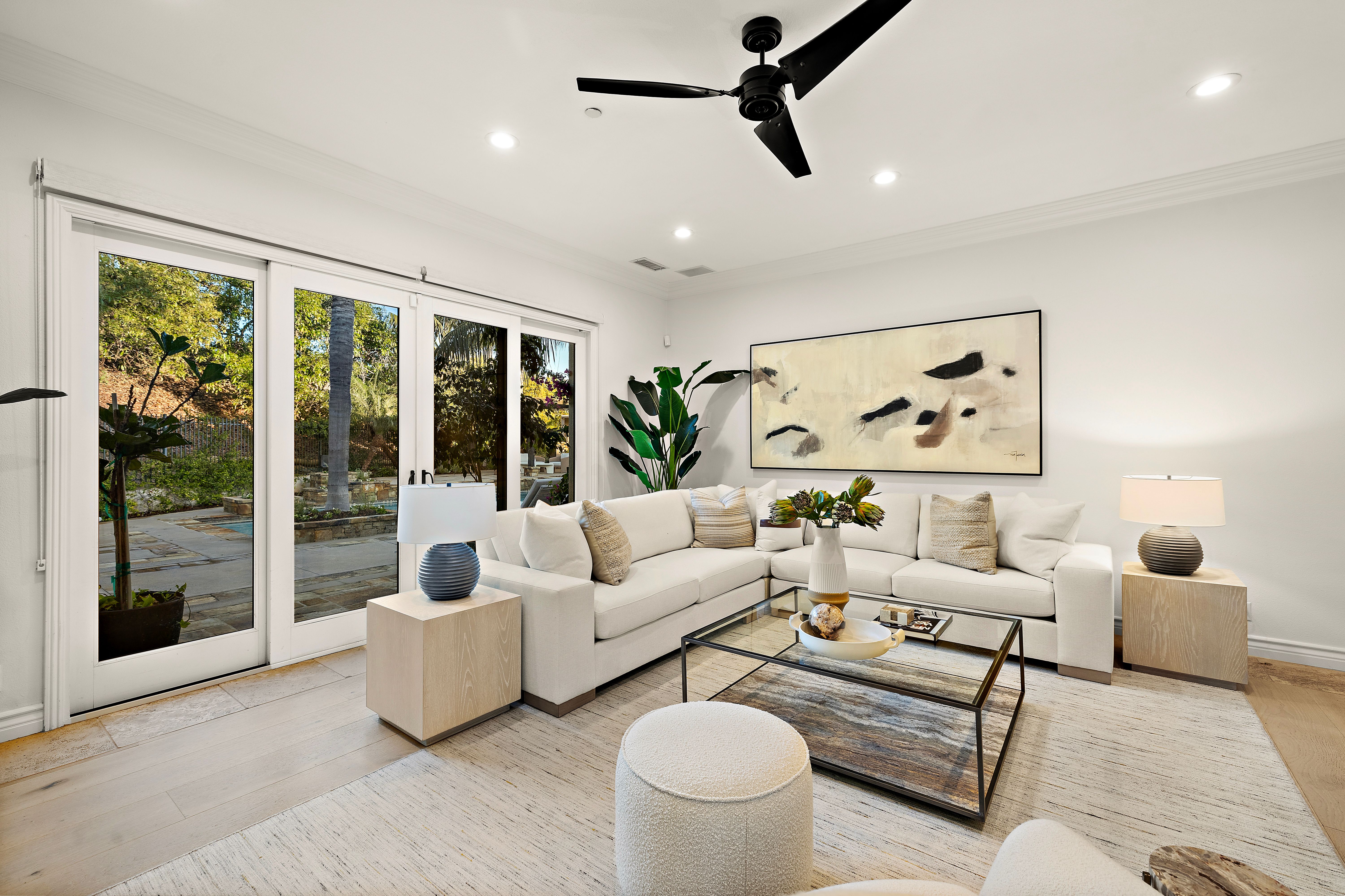 Set on one of the largest lots in the coveted, gate guarded community of Emerson, this rarely available single level estate offers 4,333 ± sf of refined living on an expansive 18,030 ± sf cul de sac lot. Nestled for exceptional privacy, the home is surrounded by avocado groves with city light and mountain views providing a quiet, scenic backdrop to everyday living. Step through a tranquil atrium and breezeway into the formal living and dining rooms, where elegance meets comfort. The chef’s kitchen, beautifully remodeled with a Black Leathered Granite island, Viking cooktop and microwave, Thermador double oven, KitchenAid dishwasher, and Dacor built in refrigerator, flows seamlessly into the informal dining and family room, both opening effortlessly to the backyard oasis. Outside, the estate is designed for relaxation and entertaining. Unwind in the sparkling pool and spa, gather around the built in fireplace, or enjoy alfresco dining at the fully equipped outdoor kitchen. The expansive grounds now feature generous, lush grassy areas, perfect for recreation, gatherings, or simply enjoying the home’s remarkable sense of space and privacy. The home has been thoughtfully expanded to include an additional bedroom and generous bonus room, ideal for extended family or guests. Built with steel beams for enduring stability and featuring dual whole house fans with independent controls, the residence combines durability with sophisticated luxury. This exceptional single level estate offers a rare blend of scale, privacy, and understated elegance within one of the area’s most desirable communities.