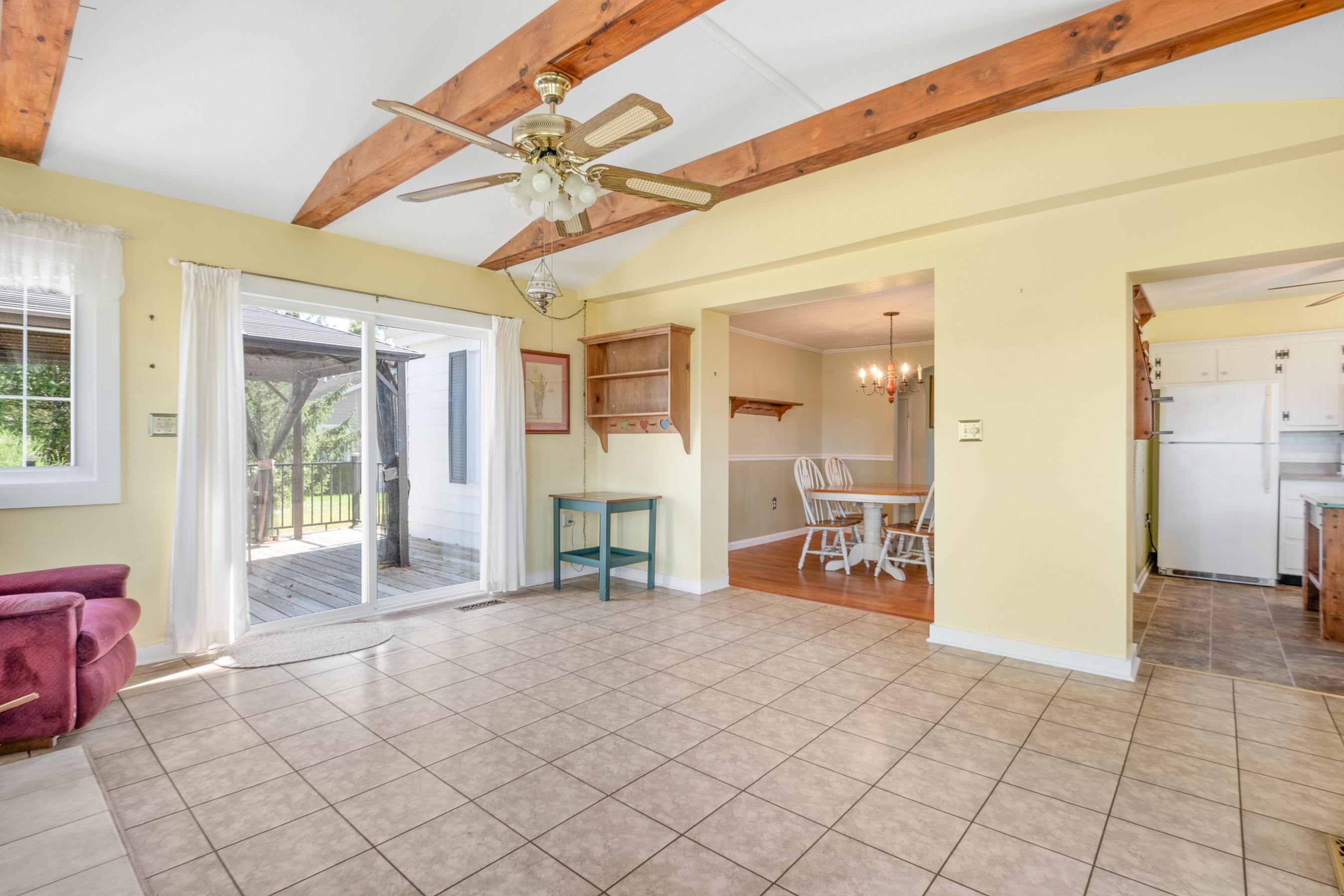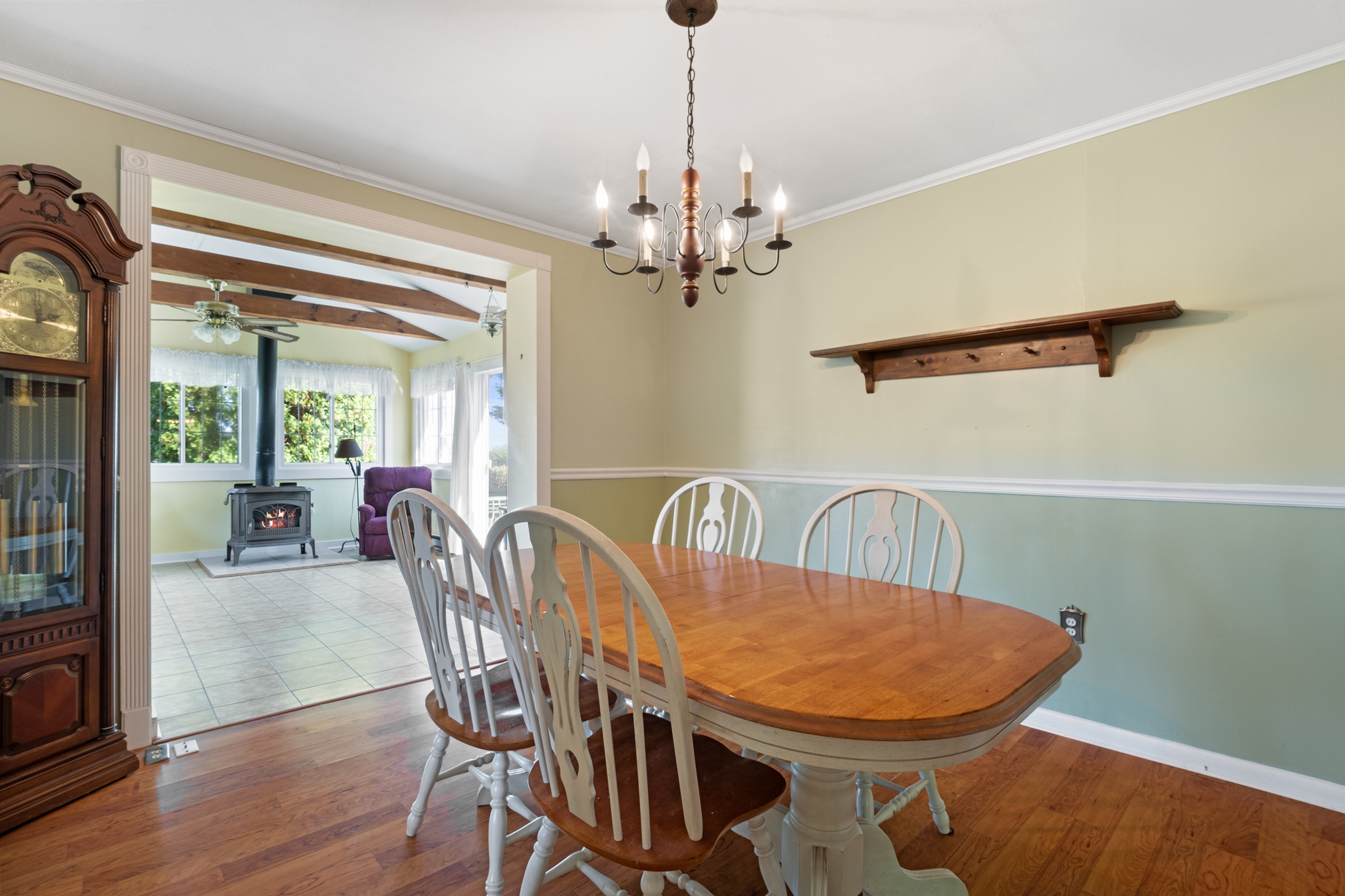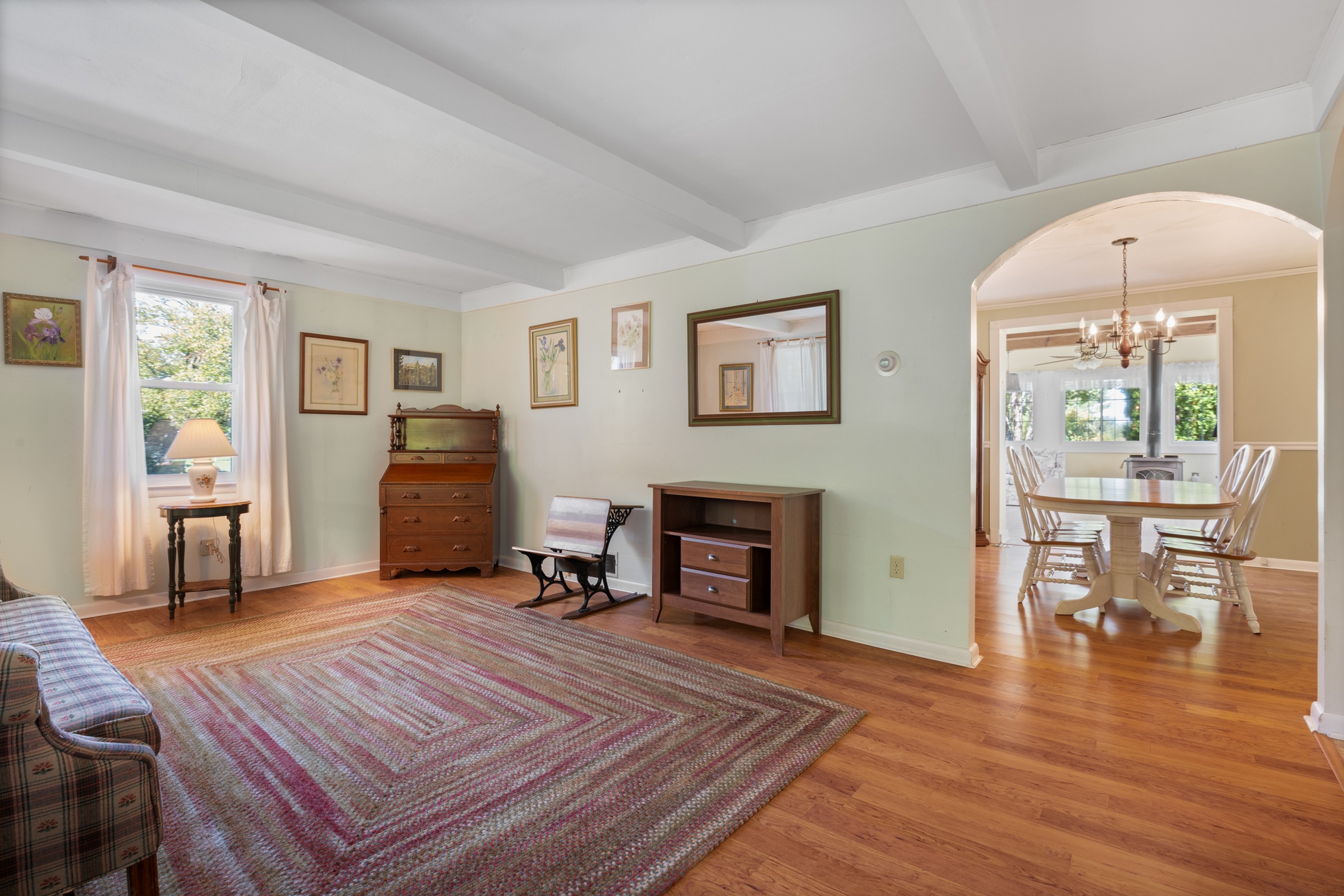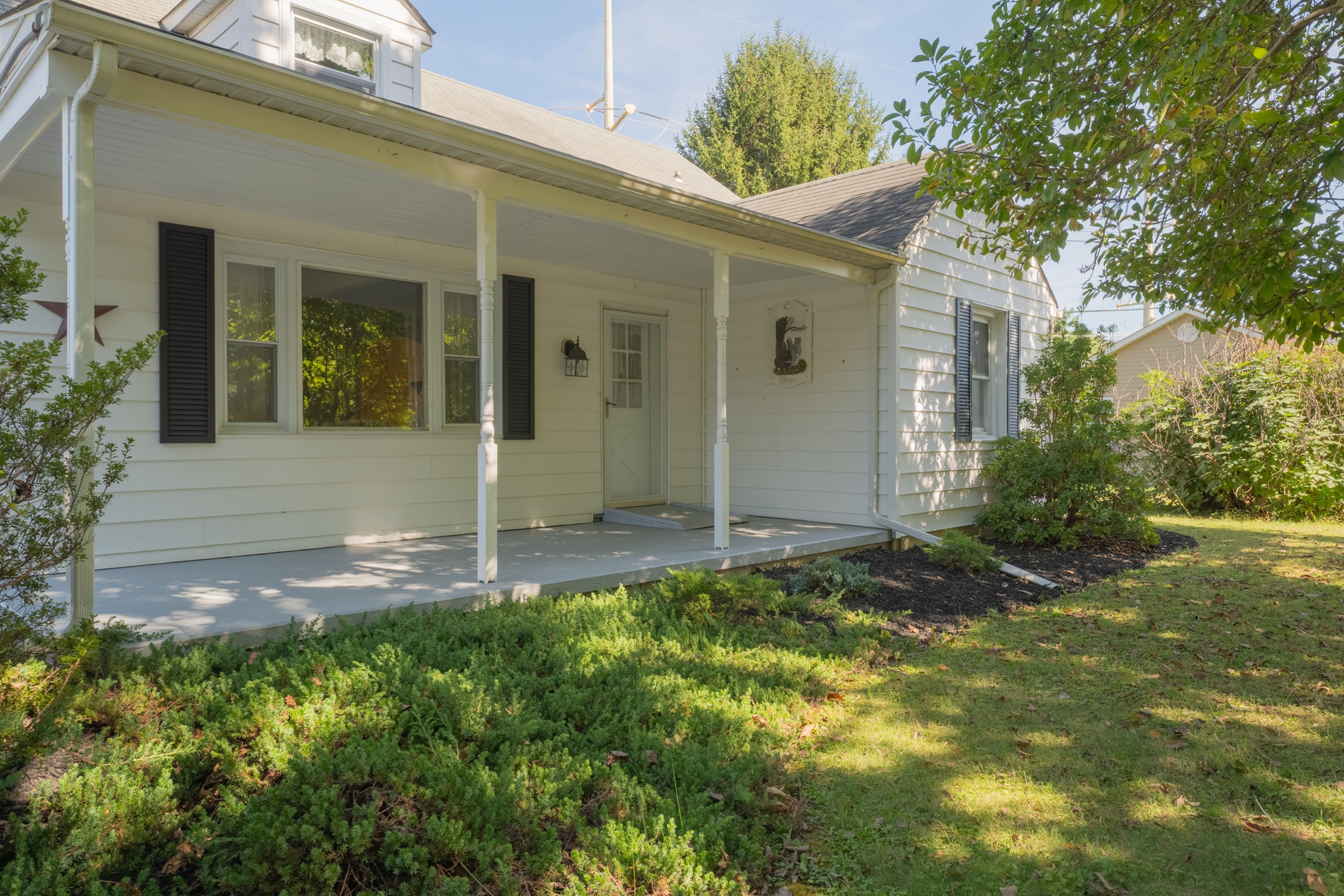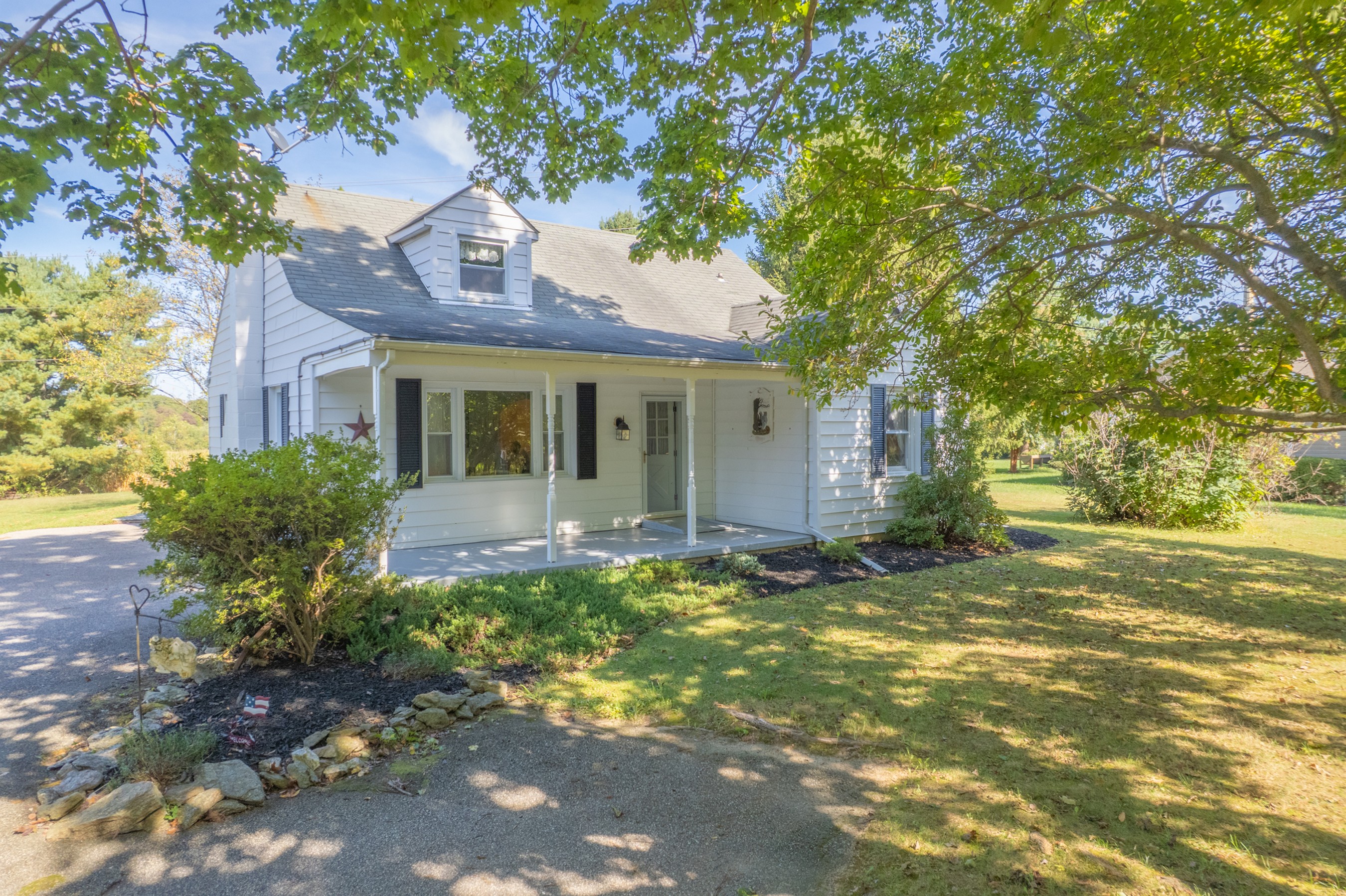 Charming Cape Cod residence, nestled in a serene suburban setting seamlessly blends classic architectural with tons of natural light, and a warm and inviting atmosphere. Beamed ceilings adorn the large living room that leads to the formal dining room and fully equipped kitchen, setting the stage for memorable meals. The spacious and bright family room, conveniently located off the kitchen, boasts tons of windows, a ceiling fan, vaulted and beamed ceilings, and provides access the to the deck, back yard, and patio. The remaining main level provides flexibility for your lifestyle with a bedroom with hardwood flooring, a full bathroom with a walk-in ceramic shower with glass doors and enjoy the convenience of a main-level laundry room, with a full-size washer and dryer and plenty of cabinetry. The upper-level features two cozy bedrooms with dormers and hardwood flooring. The large unfinished basement is your blank canvas. Outside, the expansive 0.48-acre lot offers a beautifully landscaped front yard and a level, open space perfect for outdoor activities. Relax on the front porch, the 18x16 deck with canopy or the paver patio with a built-in grill, soaking in panoramic views of the scenic pasture and corn field beyond. The property also includes a shed with electricity for additional storage and creative projects. The home has ample parking for five vehicles as well as handicap accessible ramps to enter the home. Embrace the tranquility of suburban living while being just moments away from local amenities.