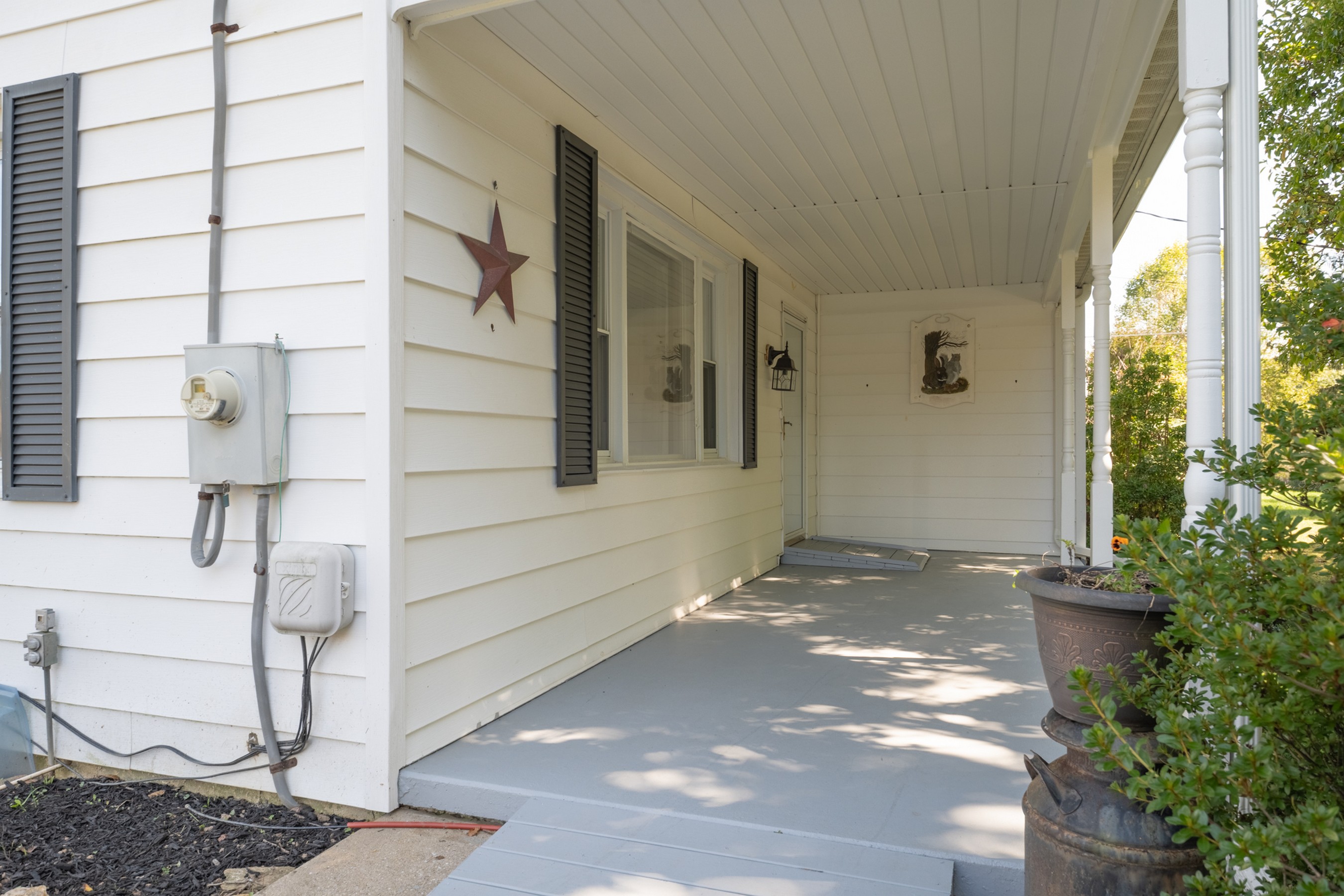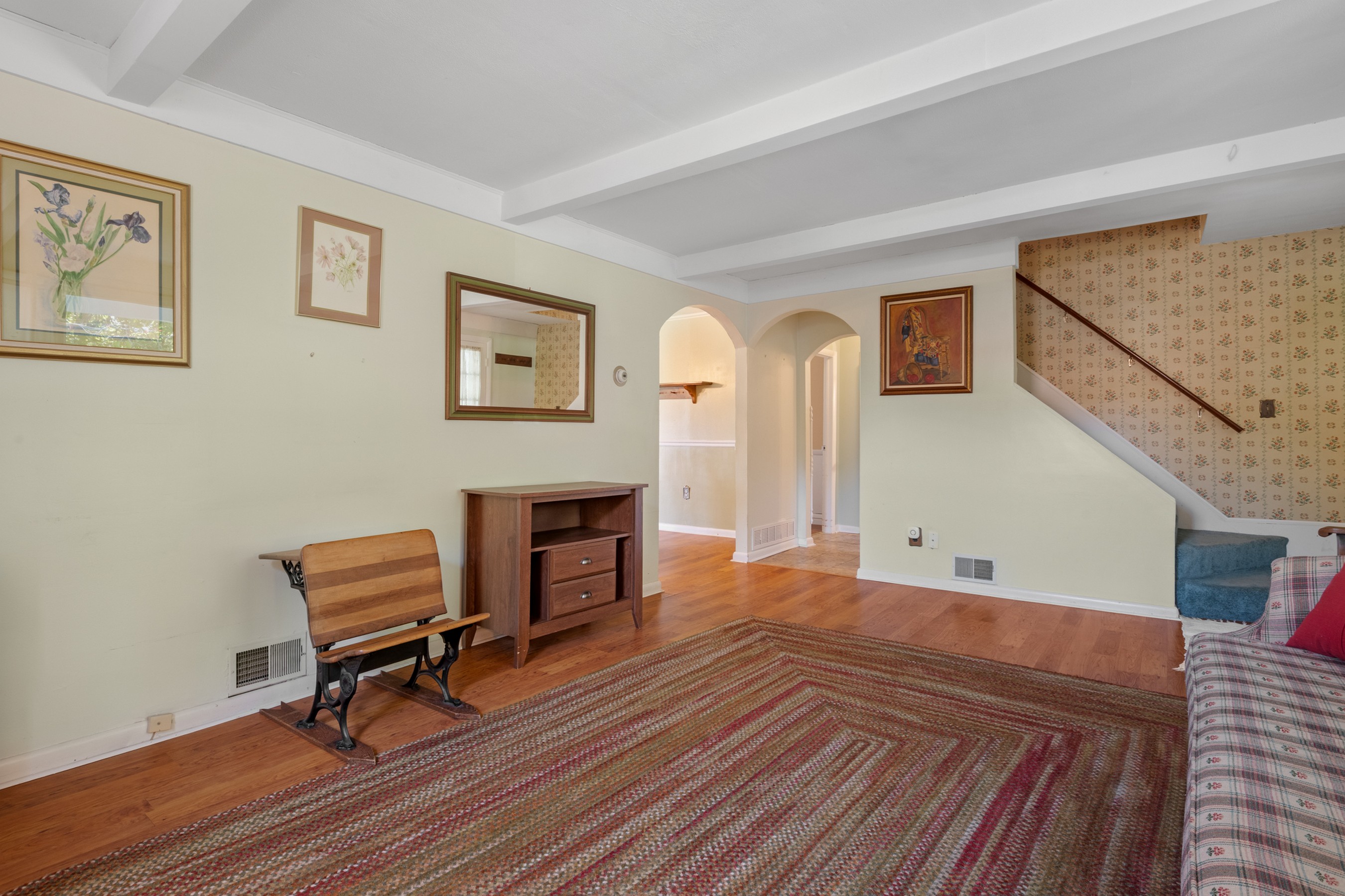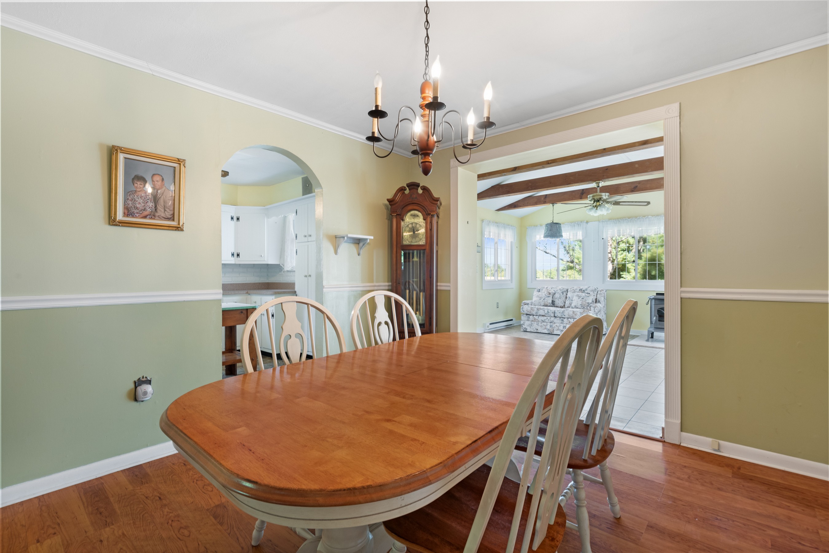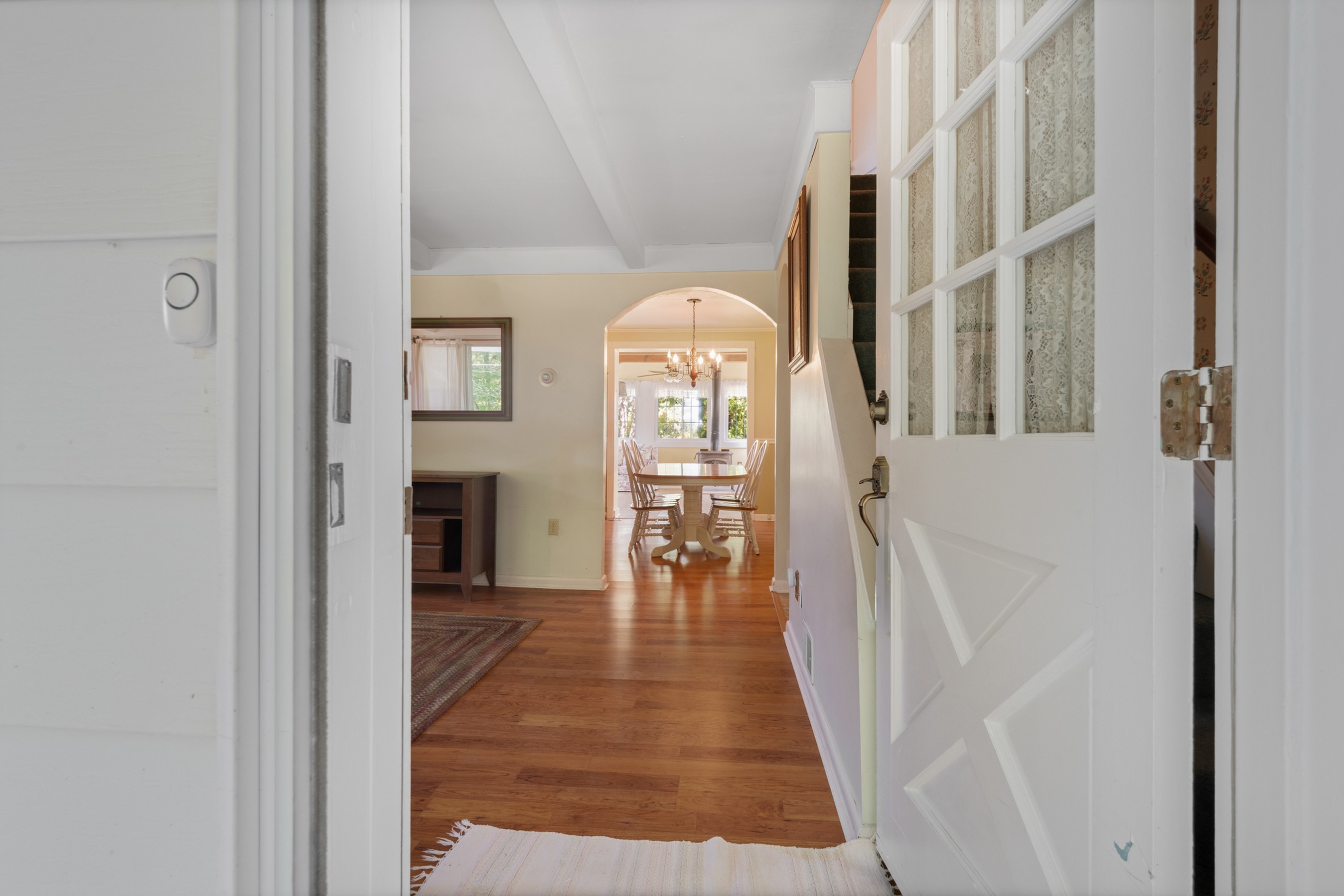 Charming Cape Cod residence, nestled in a serene suburban setting seamlessly blends classic architectural with tons of natural light, and a warm and inviting atmosphere. Beamed ceilings adorn the large living room that leads to the formal dining room and fully equipped kitchen, setting the stage for memorable meals. The spacious and bright family room, conveniently located off the kitchen, boasts tons of windows, a ceiling fan, vaulted and beamed ceilings, and provides access the to the deck, back yard, and patio. The remaining main level provides flexibility for your lifestyle with a bedroom with hardwood flooring, a full bathroom with a walk-in ceramic shower with glass doors and enjoy the convenience of a main-level laundry room, with a full-size washer and dryer and plenty of cabinetry. The upper-level features two cozy bedrooms with dormers and hardwood flooring. The large unfinished basement is your blank canvas. Outside, the expansive 0.48-acre lot offers a beautifully landscaped front yard and a level, open space perfect for outdoor activities. Relax on the front porch, the 18x16 deck with canopy or the paver patio with a built-in grill, soaking in panoramic views of the scenic pasture and corn field beyond. The property also includes a shed with electricity for additional storage and creative projects. The home has ample parking for five vehicles as well as handicap accessible ramps to enter the home. Embrace the tranquility of suburban living while being just moments away from local amenities.