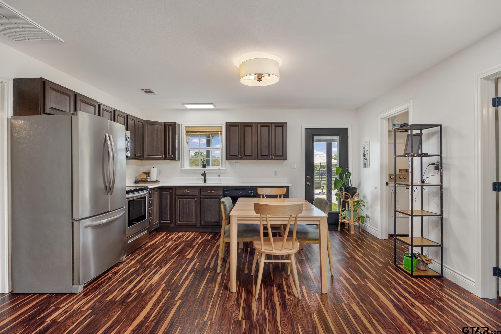 Discover a unique opportunity just minutes from Lake Palestine! Situated on just over 1 acre and only 3 minutes from a convenient boat launch, this versatile property offers incredible potential for both peaceful comfortable living and income generation. This thoughtfully designed home features, two separate living quarters, making it ideal for multi-generational living or rental opportunities. Step through the main front entrance into a spacious layout that includes a well-sized kitchen, inviting living area, laundry space, and a private master suite. Continue through a flexible room, perfect as a bedroom or office; into a second fully functional living space, complete with its own full kitchen, living area, bedroom, and private front and back entrances. Previous owners successfully utilized this space as a one-bedroom rental, creating immediate income potential. The exterior adds even more value, featuring an RV-ready hookups with electric and septic, opening the door for additional rental income or guest accommodations. In the back is a 12x12 shop, wood shop or organize your fishing gear! Another standout feature of this property is the roof runoff collection system, designed to capture and store rainwater in the underground tanks, an excellent resource for maintaining a water reserve, especially during those hot Texas summers. Located just around the corner from local bait shops and multiple boat launches, this property is perfectly positioned to attract weekend visitors and lake enthusiasts looking to enjoy everything Lake Palestine has to offer. Whether you're searching for a primary residence, investment property, or weekend retreat, this home offers endless possibilities.