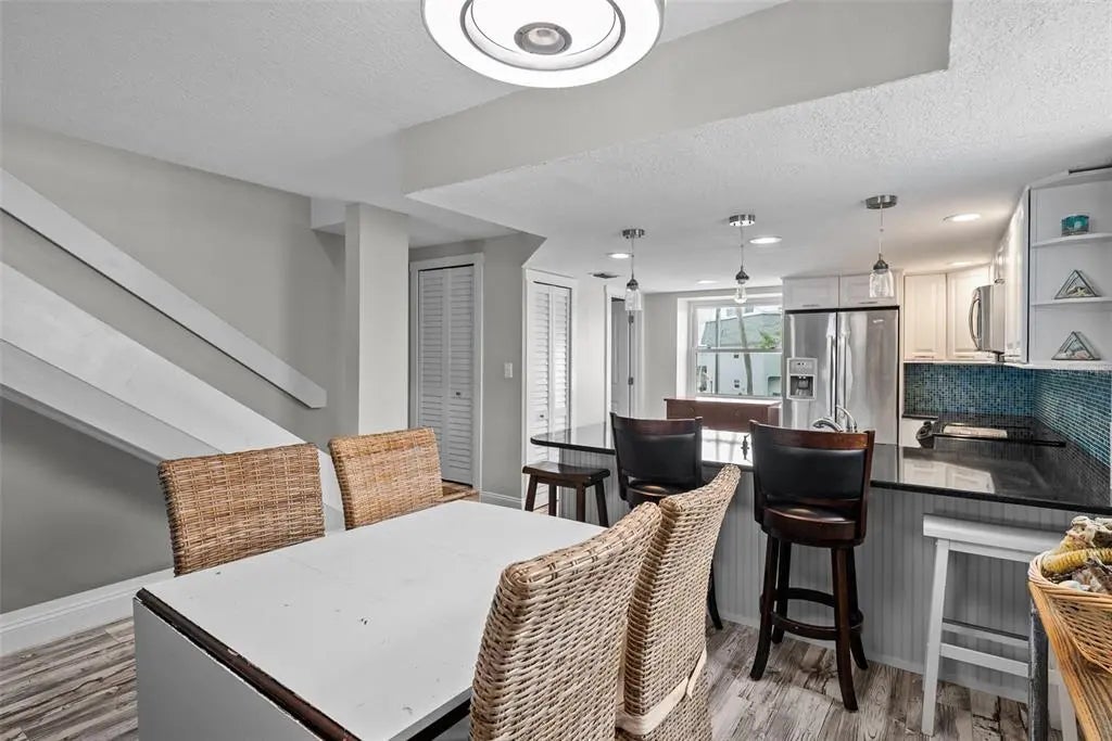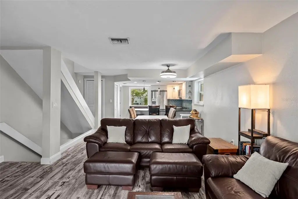 WALK TO THE BEACH! Just a few short blocks from beautiful Indian Rocks Beach, this light-filled three-story townhome offers comfort, style, and coastal convenience. The second level features a living and dining area, a convenient half bath, and a beautifully updated kitchen with white wood cabinetry, durable Cambria quartz countertops, stainless steel appliances, and a closet pantry. French doors that open to a screened balcony with stairs down to the patio and yard. Upstairs, you'll find two spacious bedrooms with ample closet space and a fully updated bathroom. On the ground level. behind the oversized garage, is a generous air conditioned laundry room/workshop with additional storage under the stairs-ideal for all your beach gear. Major updates include roof and siding (2017), plus AIC and water heater (2015). This self-managed, pet-friendly community offers an HOA that covers exterior insurance, termite and pest control, and reclaimed water. Only three units in this community and minimum 30 day rentals. Opportunity to use as a 2nd home and lease when you are away.