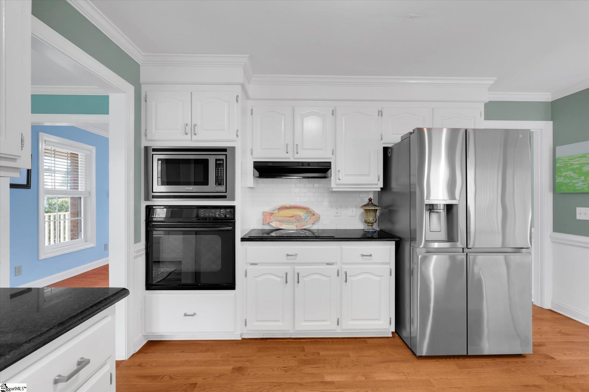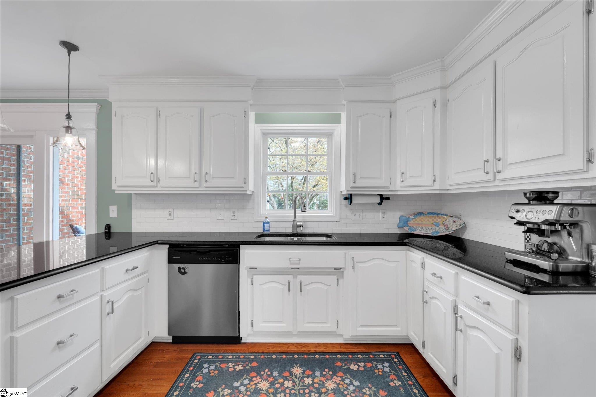 Welcome to this stunning all-brick home in the highly sought-after Partridge Ridge pool community! Perfectly situated on a beautifully landscaped corner lot, this home offers exceptional curb appeal and timeless charm. A welcoming wraparound front porch - complete with swings and rocking chairs - sets the tone for relaxed Southern living. Step inside to a grand two-story foyer that opens into an inviting living room featuring a cozy gas fireplace, gleaming wood floors and cordless blinds. The kitchen truly serves as the heart of the home, boasting abundant cabinetry, granite countertops, a stylish tile backsplash, built-in wall oven, and stainless steel appliances. The bright breakfast nook flows seamlessly onto the back deck, creating the perfect space for everyday living and entertaining. A charming formal dining room connects the kitchen and living room, while a pantry and convenient half bath complete the main living area. The main-level primary suite offers a private retreat with a beautifully appointed en suite bath featuring Carrera marble flooring, a tiled shower, jetted tub, double vanity, and a spacious walk-in closet. Upstairs, the main staircase leads to two generously sized bedrooms with oversized closets and a full bath in the shared hallway. A second staircase provides access to a versatile flex/family room over the garage - ideal for a home office, media room, or playroom - with easy-access storage in the eaves. The attached garage is thoughtfully equipped with a utility sink, half bath, and dedicated workspace or additional storage area. Outdoor living shines in the private, fully fenced backyard, complete with mature, vibrant landscaping and a spacious deck - perfect for relaxing or entertaining. A charming she shed with electricity and an overhead door offers endless possibilities as a potting shed, workshop, or creative space. Recent updates include new hardwood flooring in all bedrooms and the family room, along with major upgrades for peace of mind, including a whole-house generator and a new roof (2025). Ideally located just minutes from downtown Travelers Rest, Furman University, and the Swamp Rabbit Trail, this exceptional home truly offers the perfect blend of comfort and convenience with traditional charm.