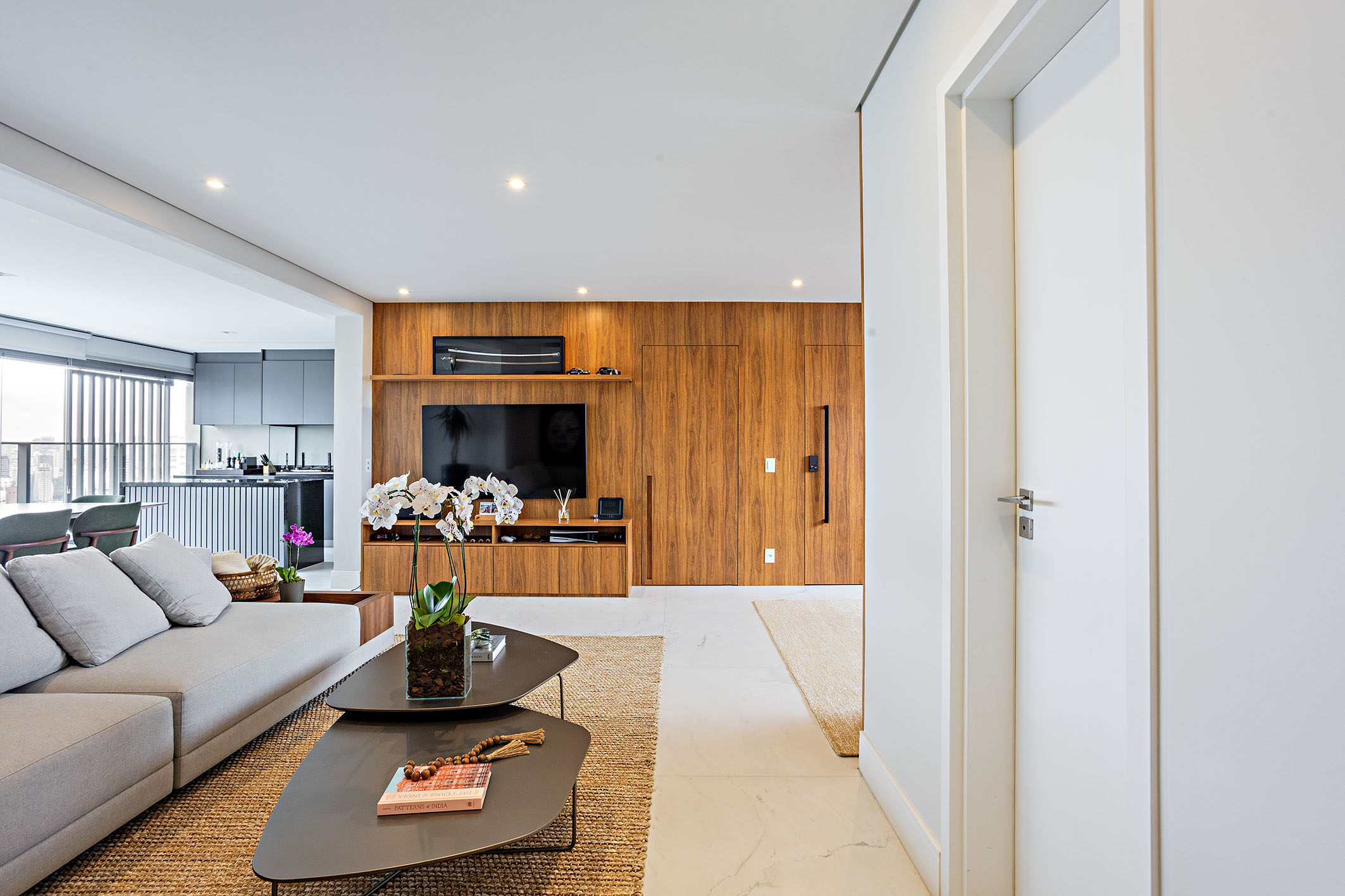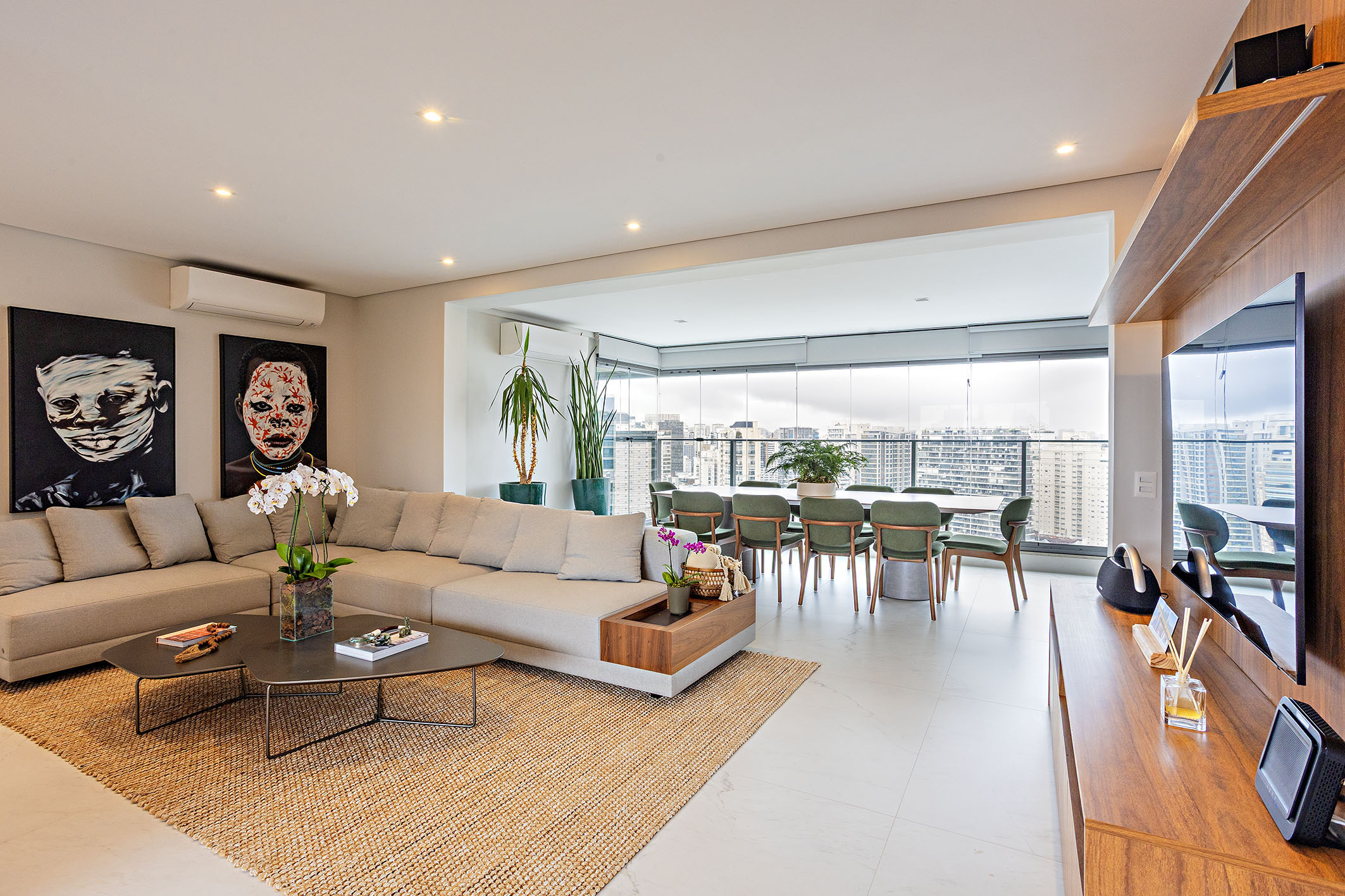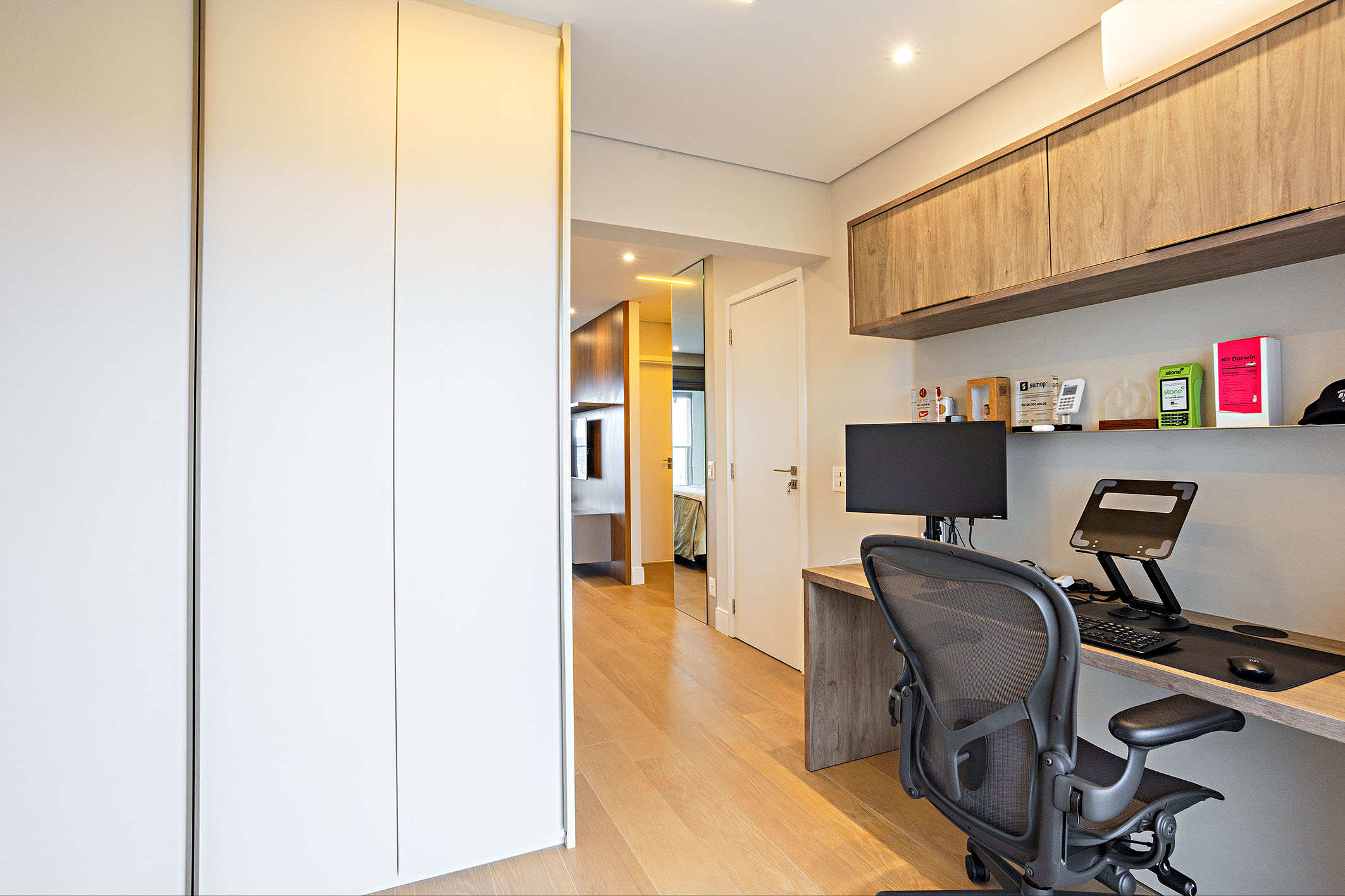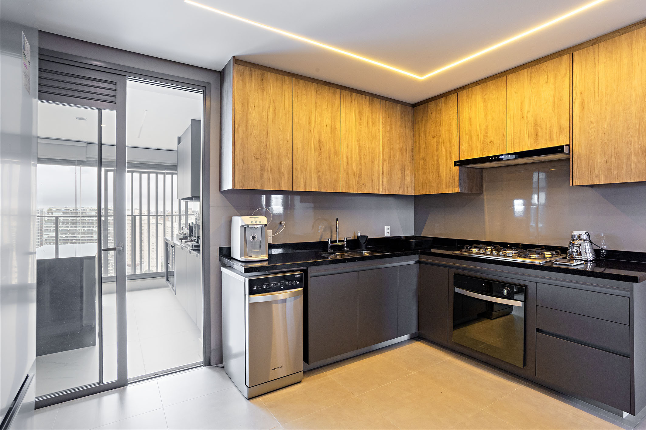 Newly built apartment, fully furnished and designed by an architect, located on the top floor with open views of the city skyline. The social area features a spacious living room organized into multiple settings, including a sitting area, home theater, bar and dining room integrated with the gourmet area and the Kitchens kitchen, creating a continuous environment designed for entertaining. The property also includes a powder room and a dedicated home office space. The private area offers a primary suite arranged in two environments, with a walk-in closet, two bathrooms and a private terrace, in addition to a second suite. All custom cabinetry was executed by Kitchens, and the apartment is equipped with air conditioning in every room. The unit includes three parking spaces. The condominium provides leisure amenities such as a swimming pool, solarium, party room, fully equipped fitness center and playroom, along with concierge service and security.