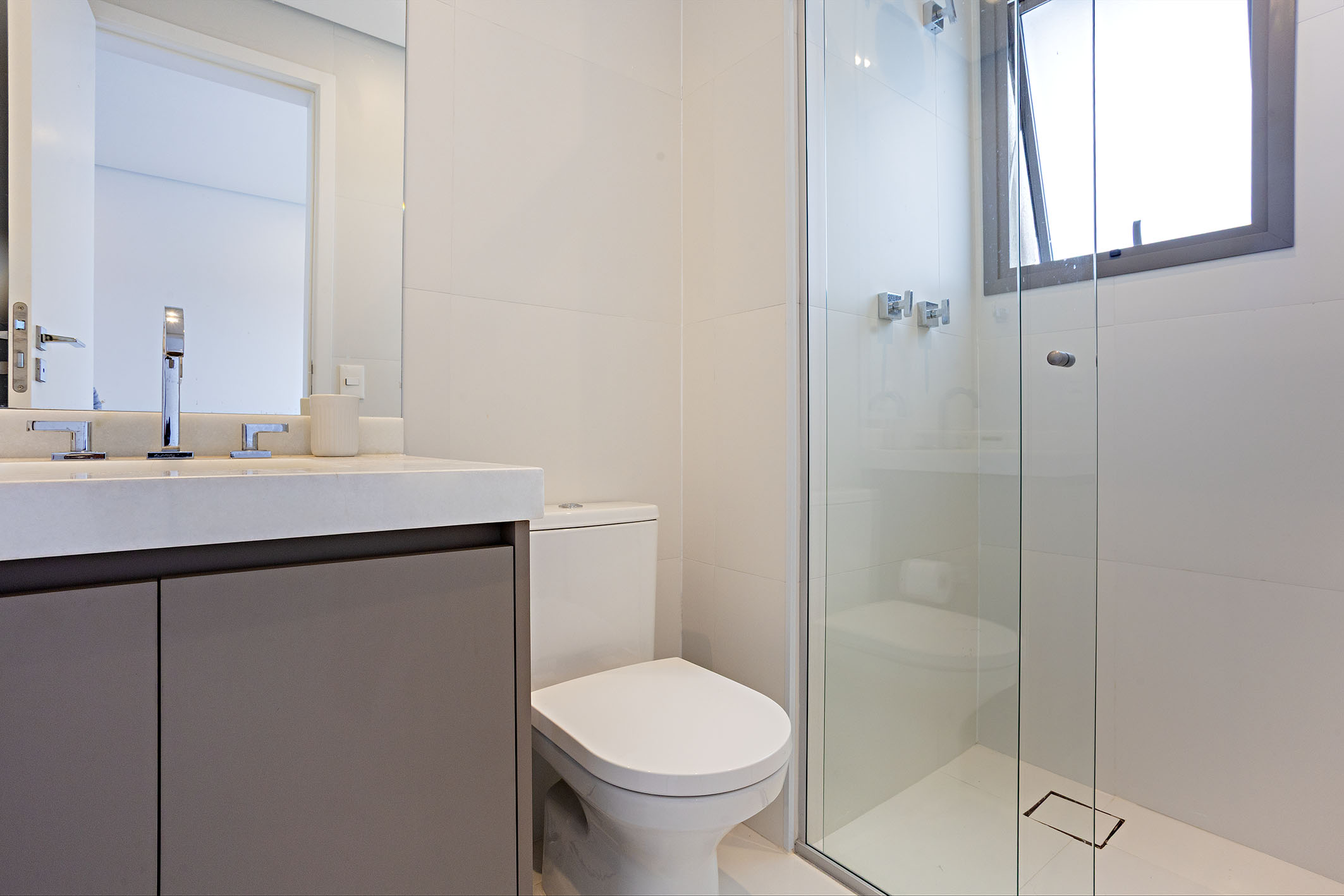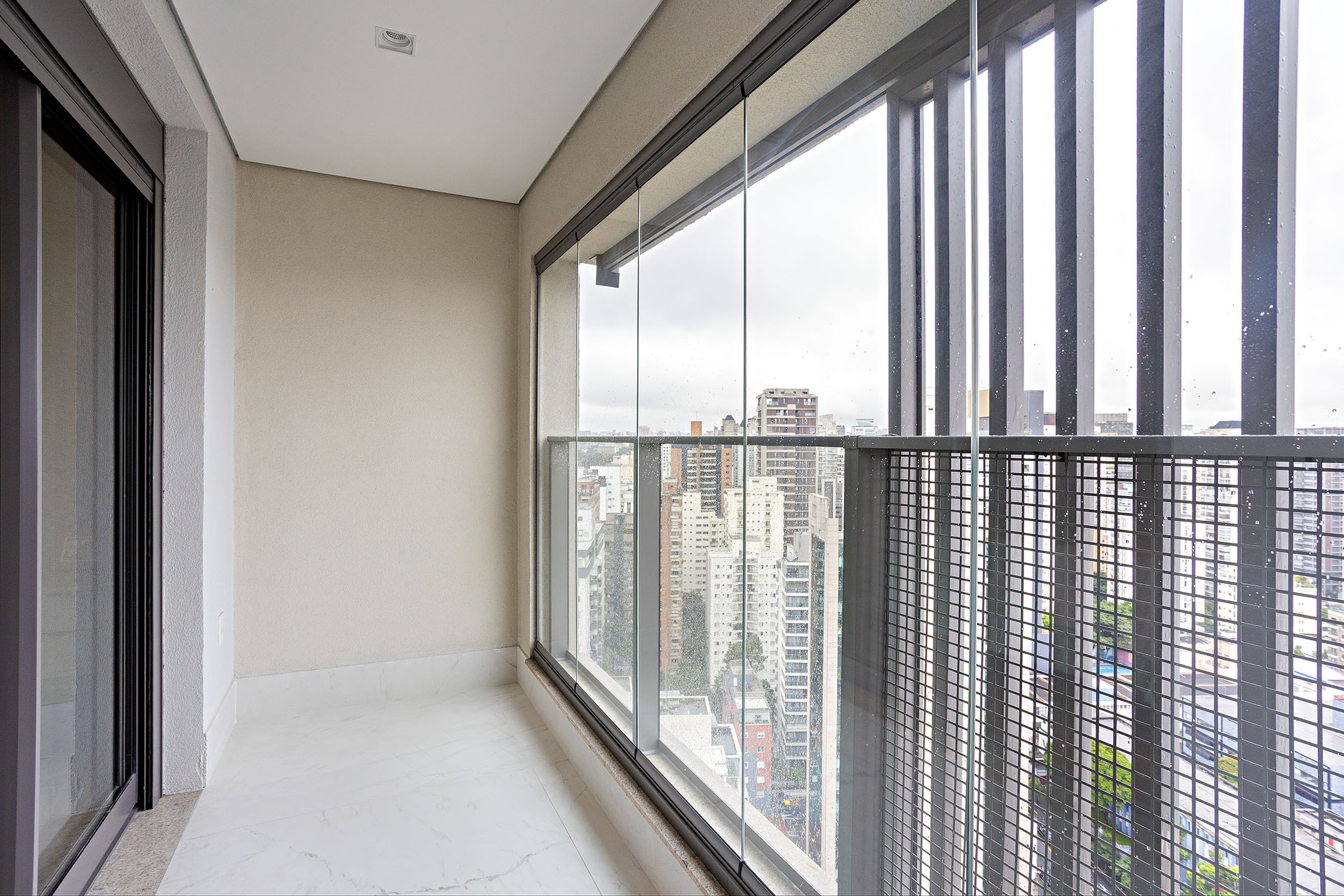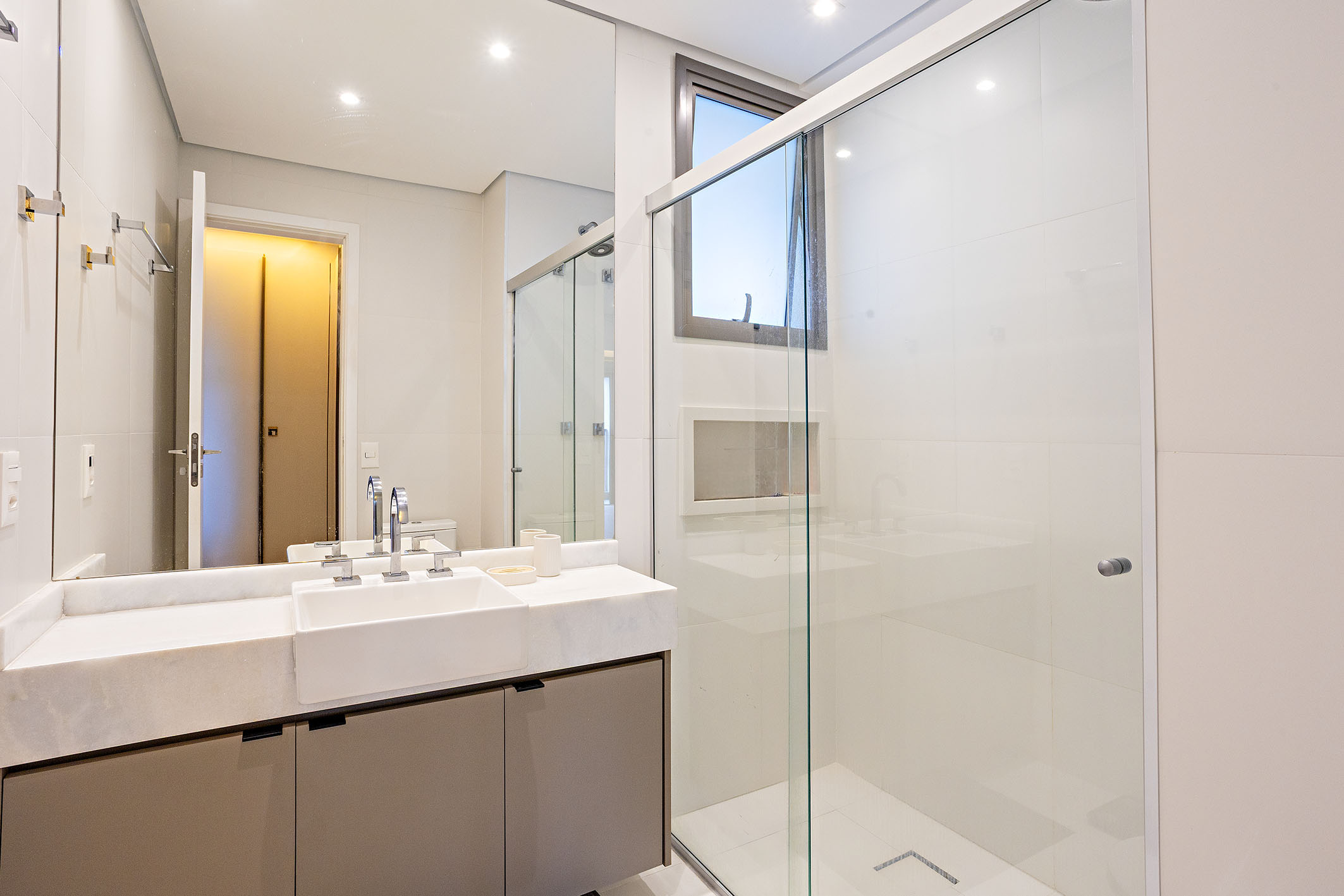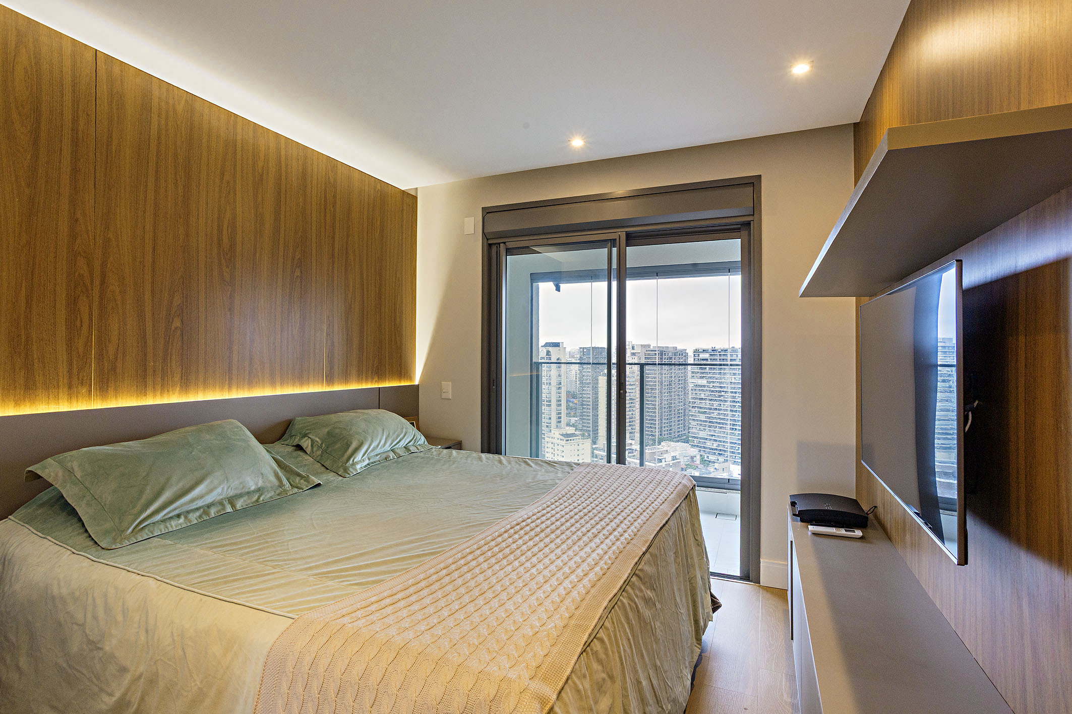 Newly built apartment, fully furnished and designed by an architect, located on the top floor with open views of the city skyline. The social area features a spacious living room organized into multiple settings, including a sitting area, home theater, bar and dining room integrated with the gourmet area and the Kitchens kitchen, creating a continuous environment designed for entertaining. The property also includes a powder room and a dedicated home office space. The private area offers a primary suite arranged in two environments, with a walk-in closet, two bathrooms and a private terrace, in addition to a second suite. All custom cabinetry was executed by Kitchens, and the apartment is equipped with air conditioning in every room. The unit includes three parking spaces. The condominium provides leisure amenities such as a swimming pool, solarium, party room, fully equipped fitness center and playroom, along with concierge service and security.
