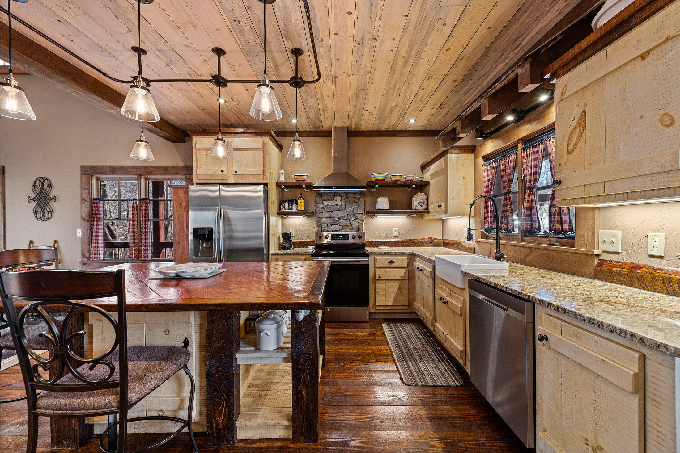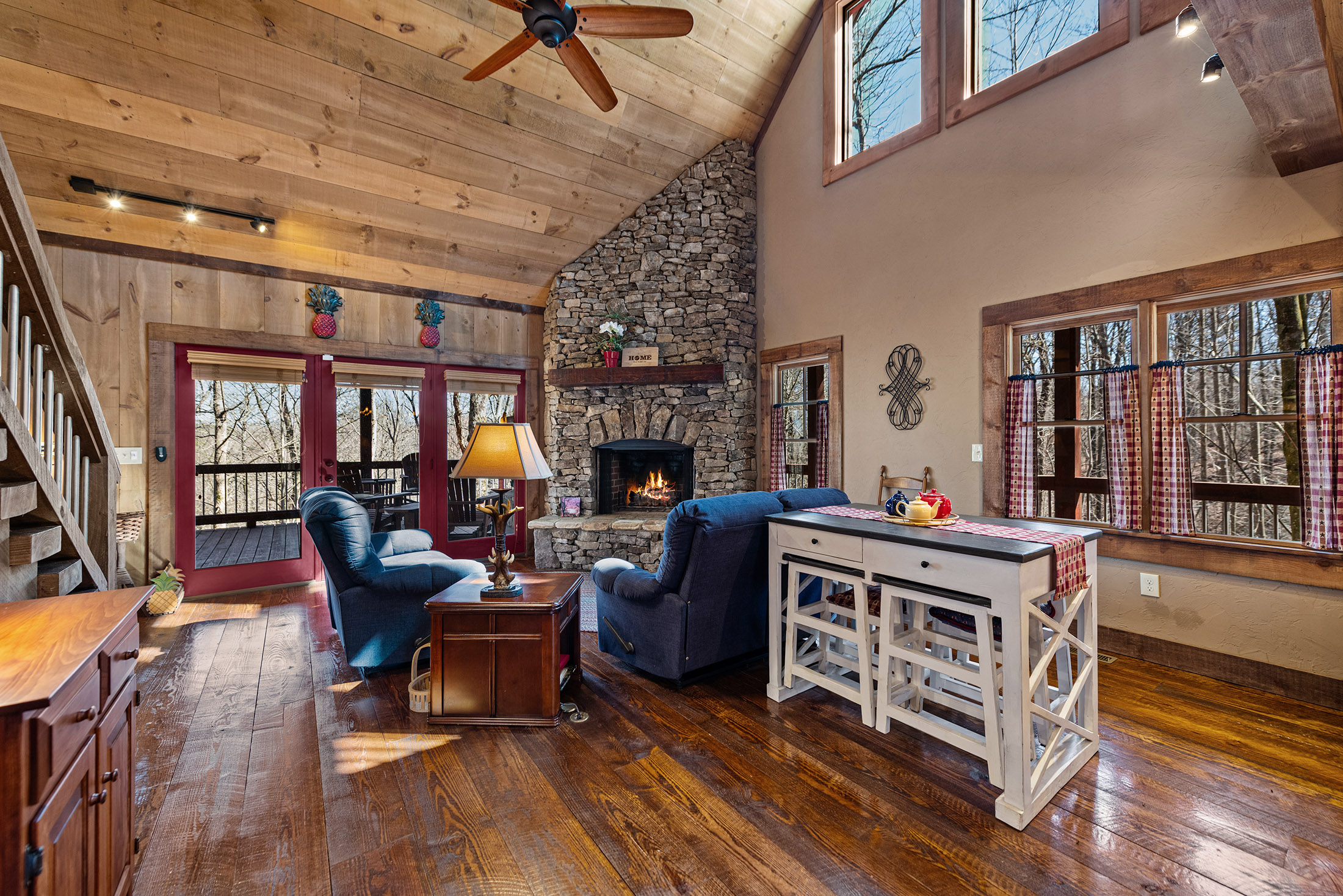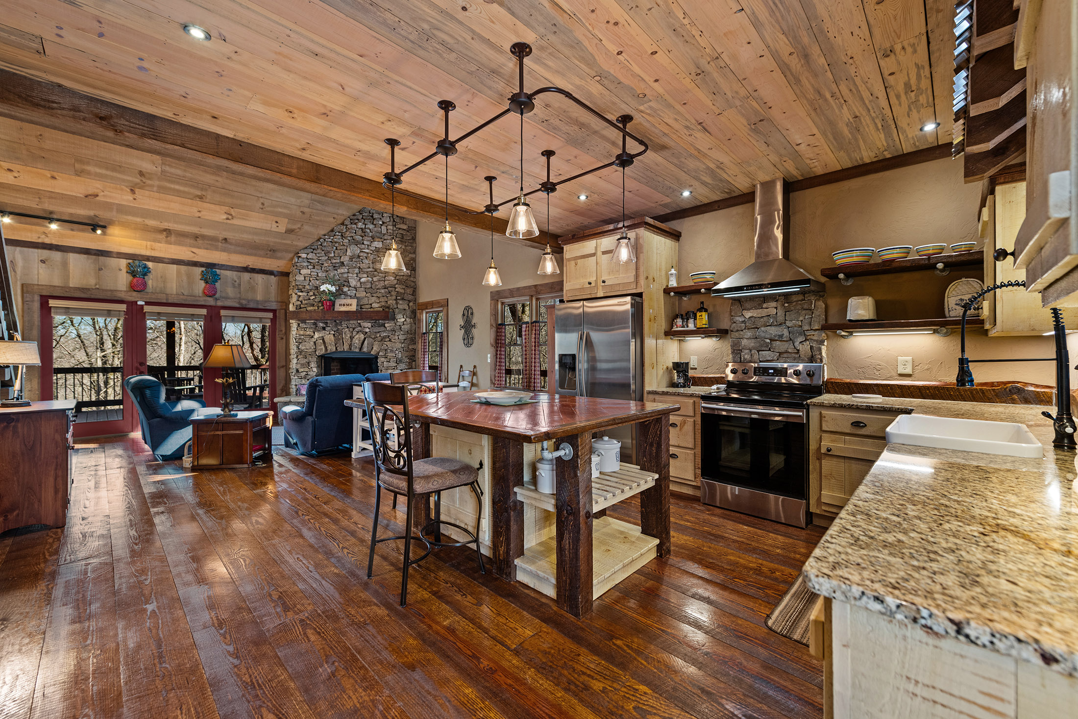 Rustic charm meets modern comfort in all the right ways, in this beautifully crafted Mountain Craftsman home. It offers 3 bedrooms and 3 full baths, along with access to the coveted Toccoa River community area complete with a pavilion, firepit, BBQ grill, and peaceful walking path, ideal for relaxing days by the water. Step inside to a warm and inviting main level featuring a spacious great room with soaring vaulted ceilings, a stunning blend of wood and drywall finishes, and an abundance of natural light pouring in through oversized windows. The custom kitchen is both stylish and functional, showcasing granite countertops, stainless steel appliances, and a generous island perfect for gathering with family and friends. The living area is anchored by a striking rock vented fireplace with gas logs, easily convertible to wood-burning for that classic mountain feel. The main floor also includes a convenient laundry room (already plumbed for a half bath), and a serene primary suite complete with a tile shower, double vanity, and a spacious closet. Step outside to the expansive covered porch, where a wood-burning fireplace sets the stage for cozy evenings while you take in the beauty of nature all around you. Upstairs, a large loft offers flexible space for a second living area, home office, or bunk room. A guest bedroom with its own private balcony and a full bath provides comfort and privacy for visitors. The terrace level is made for entertaining, featuring a den/media/game room with a bar area and an unvented fireplace (currently with an electric insert but can be converted to gas logs). This level also includes an additional guest bedroom, full bath, and access to a relaxing patio. All of this, just under five miles from the shops, dining, and charm of downtown Blue Ridge, making it the perfect blend of seclusion and convenience. Perfect for Full Time, Short Term Rentals or Private Vacation Home! Life is Good in Blue Ridge!