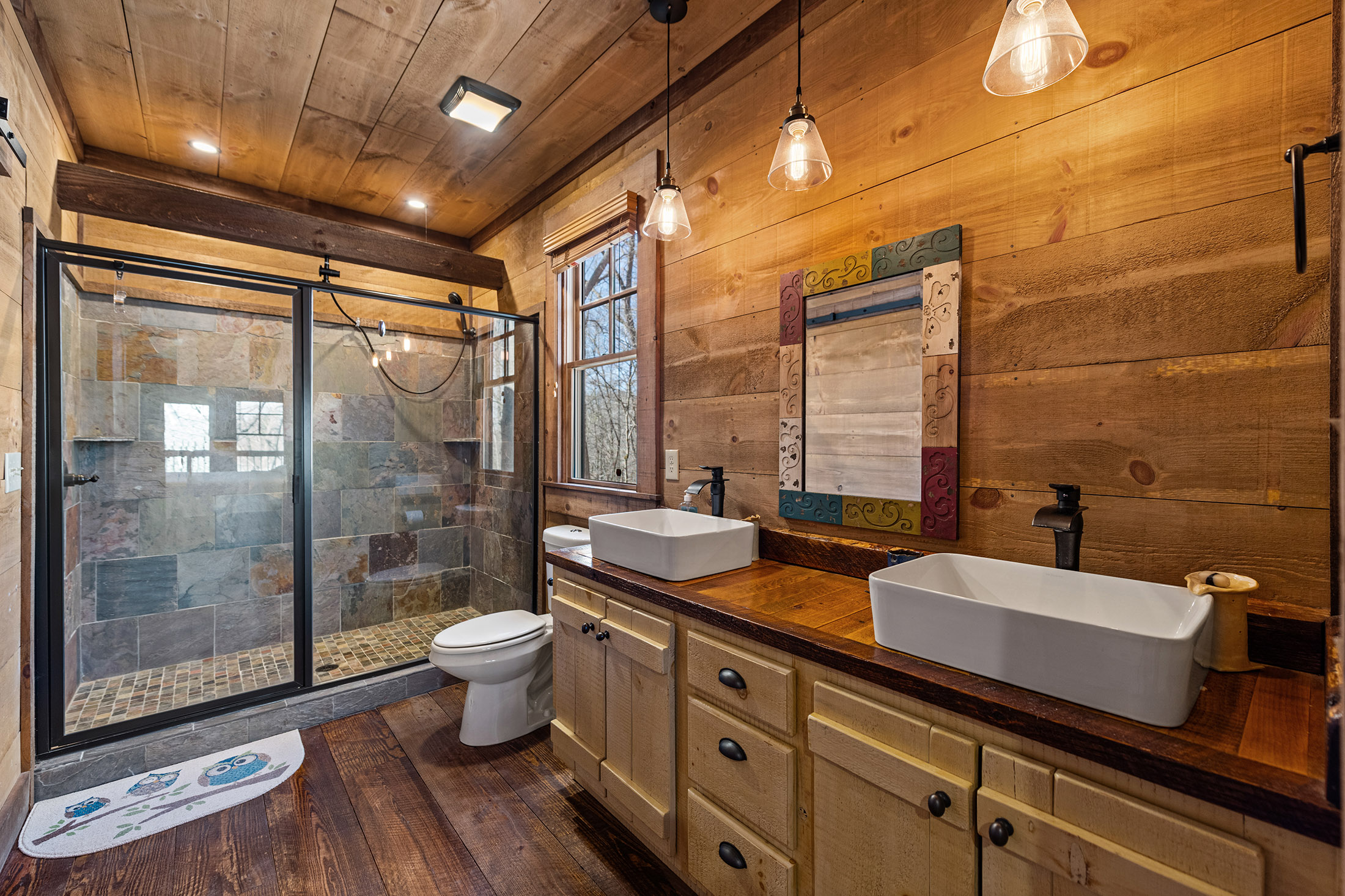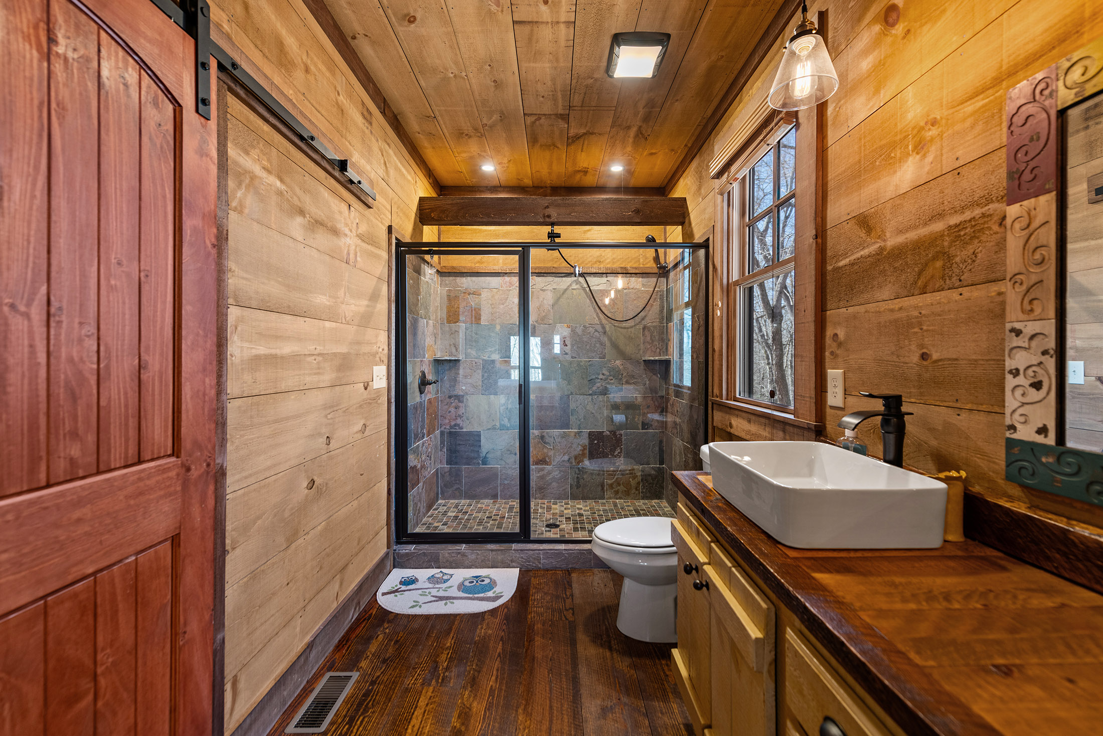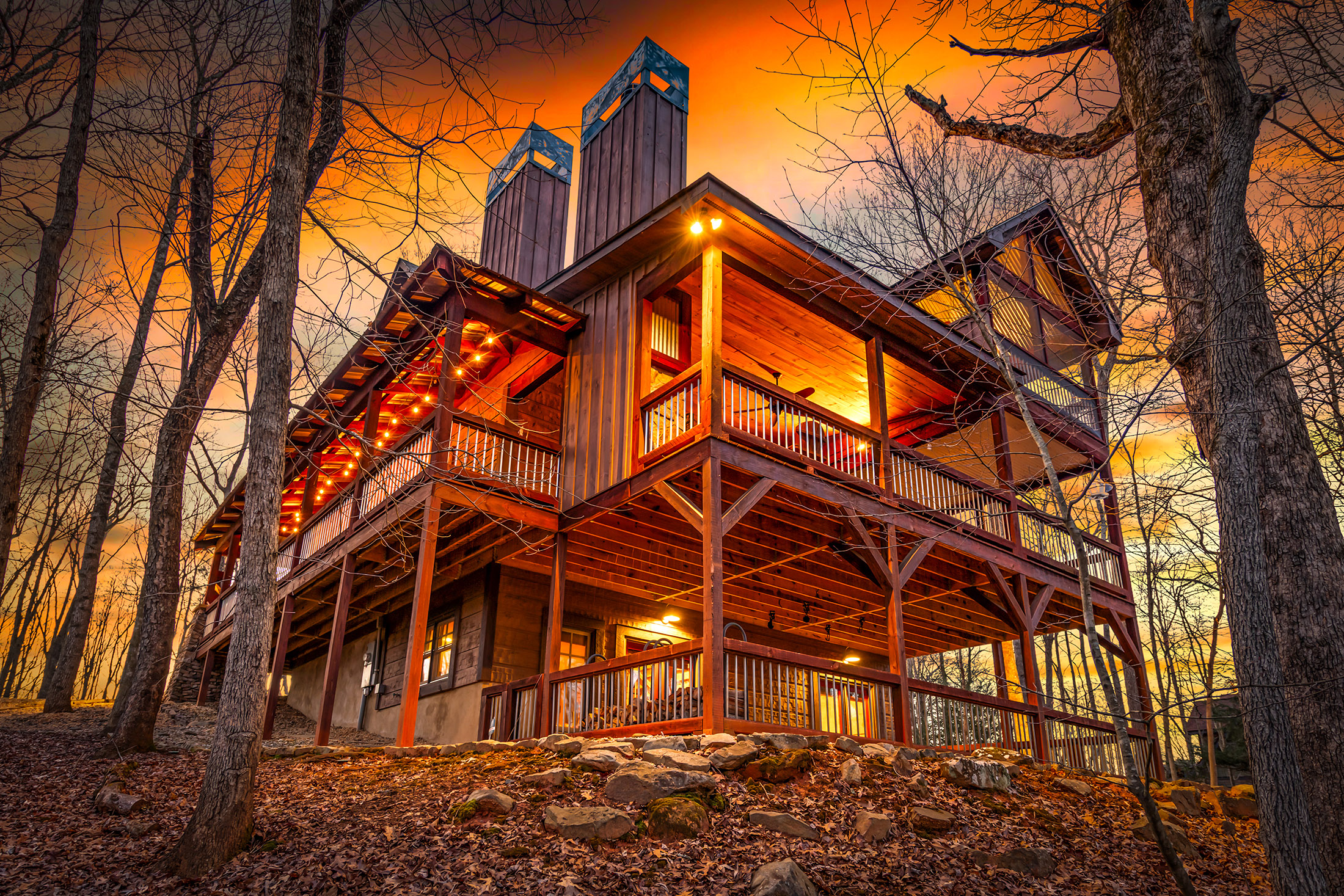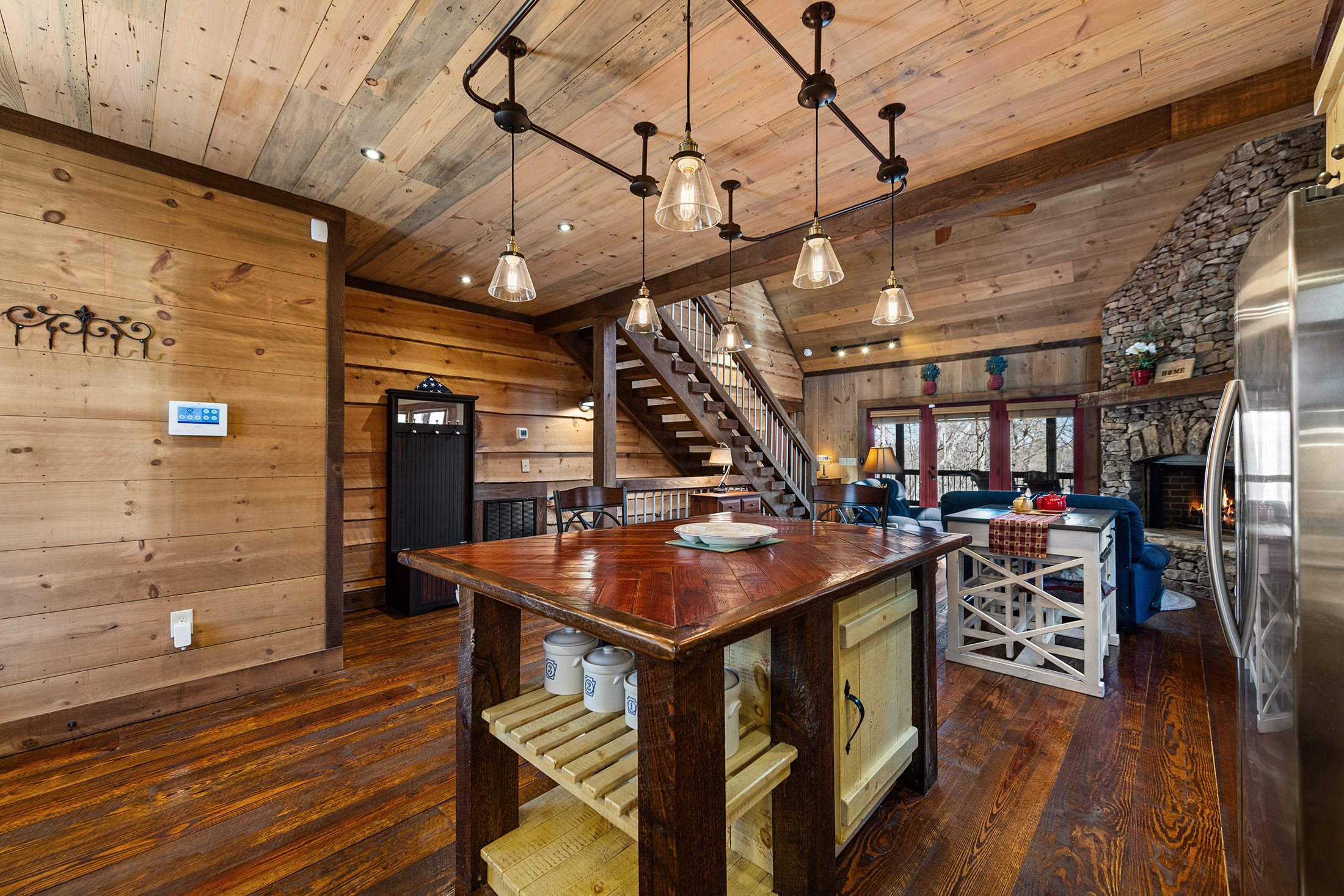 Rustic charm meets modern comfort in all the right ways, in this beautifully crafted Mountain Craftsman home. It offers 3 bedrooms and 3 full baths, along with access to the coveted Toccoa River community area complete with a pavilion, firepit, BBQ grill, and peaceful walking path, ideal for relaxing days by the water. Step inside to a warm and inviting main level featuring a spacious great room with soaring vaulted ceilings, a stunning blend of wood and drywall finishes, and an abundance of natural light pouring in through oversized windows. The custom kitchen is both stylish and functional, showcasing granite countertops, stainless steel appliances, and a generous island perfect for gathering with family and friends. The living area is anchored by a striking rock vented fireplace with gas logs, easily convertible to wood-burning for that classic mountain feel. The main floor also includes a convenient laundry room (already plumbed for a half bath), and a serene primary suite complete with a tile shower, double vanity, and a spacious closet. Step outside to the expansive covered porch, where a wood-burning fireplace sets the stage for cozy evenings while you take in the beauty of nature all around you. Upstairs, a large loft offers flexible space for a second living area, home office, or bunk room. A guest bedroom with its own private balcony and a full bath provides comfort and privacy for visitors. The terrace level is made for entertaining, featuring a den/media/game room with a bar area and an unvented fireplace (currently with an electric insert but can be converted to gas logs). This level also includes an additional guest bedroom, full bath, and access to a relaxing patio. All of this, just under five miles from the shops, dining, and charm of downtown Blue Ridge, making it the perfect blend of seclusion and convenience. Perfect for Full Time, Short Term Rentals or Private Vacation Home! Life is Good in Blue Ridge!