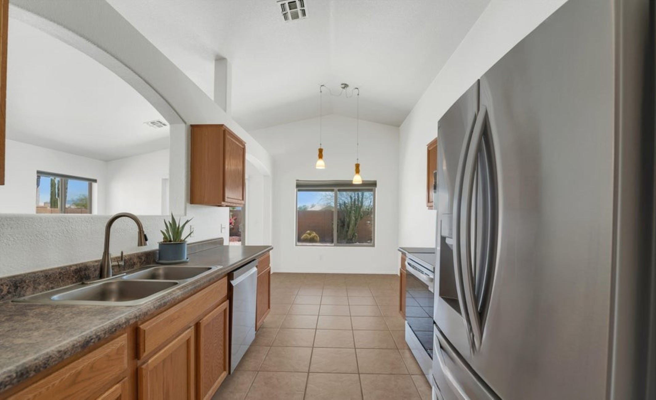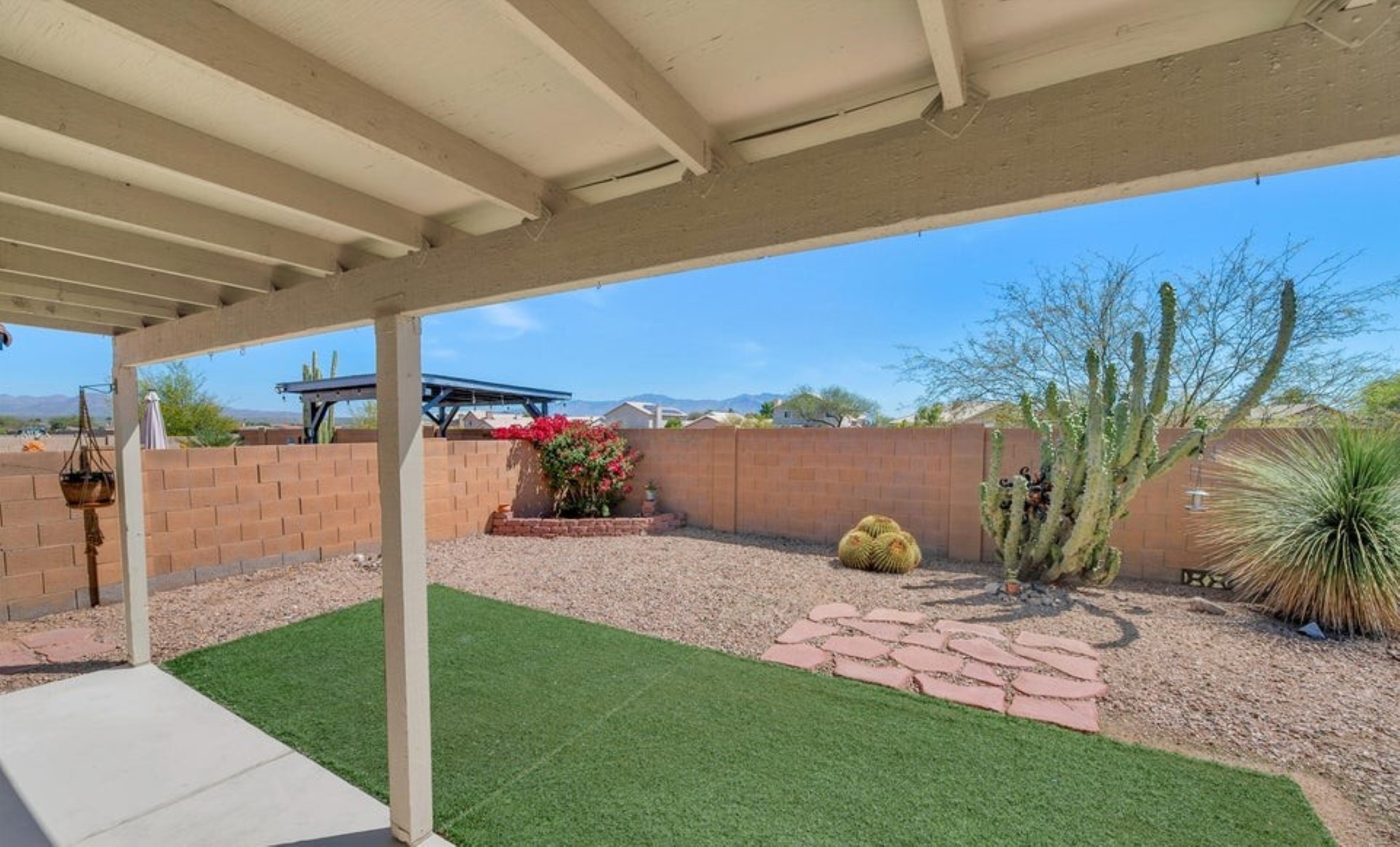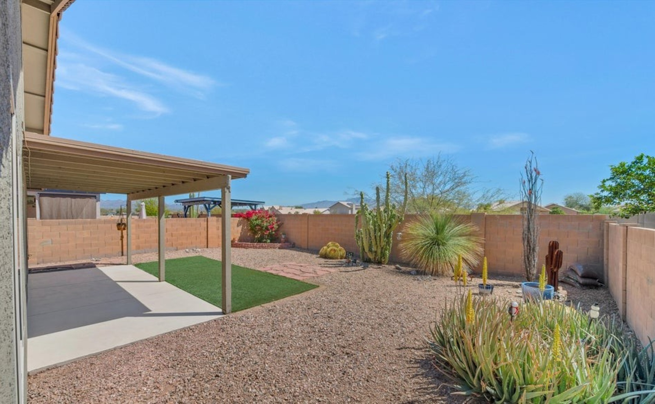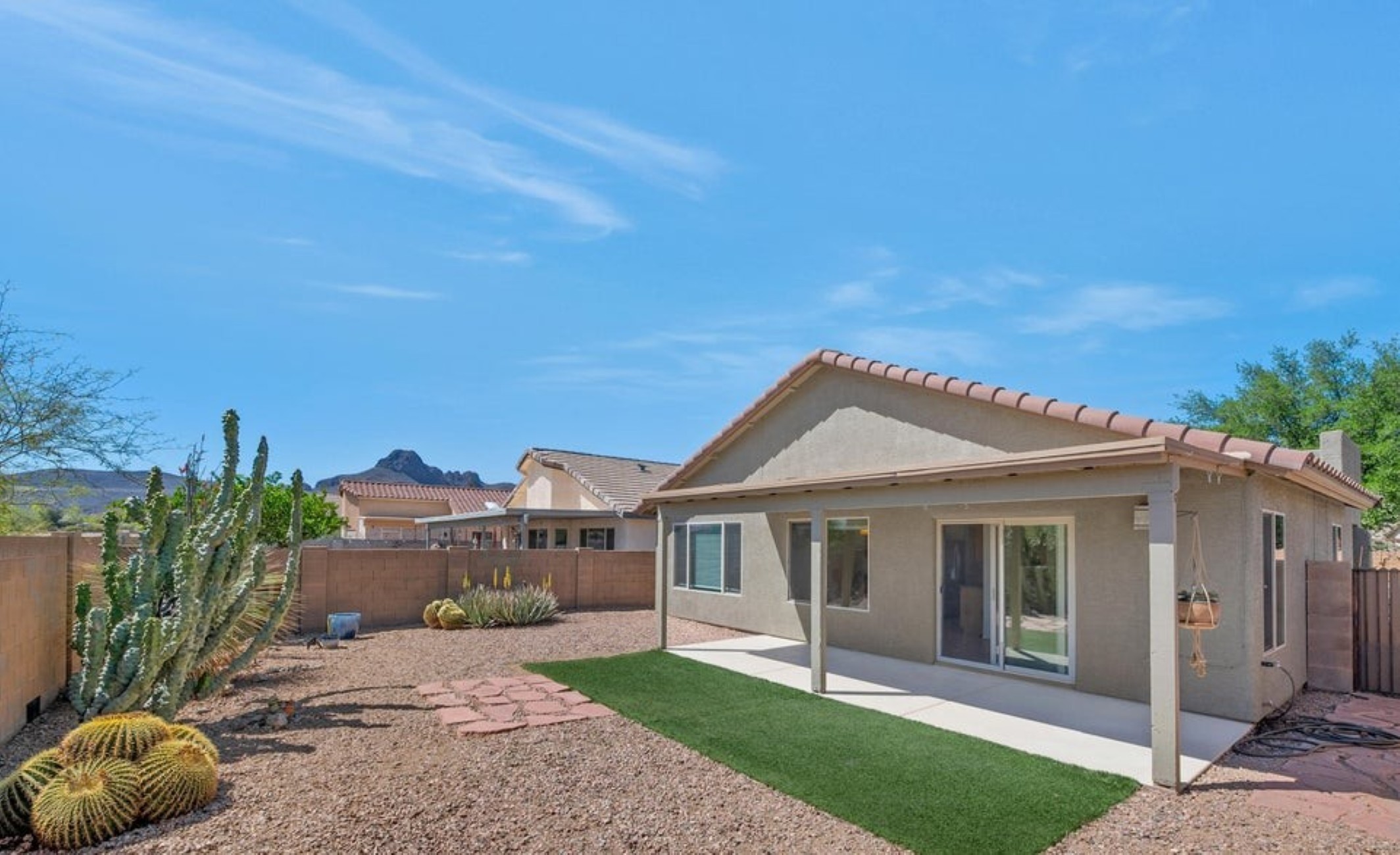 This little gem backs up to a natural wash with spectacular mountain views and offers a light and bright home! The open concept kitchen flows seamlessly into the spacious great room and features natural wood cabinetry, newer appliances, a cozy eating area, all highlighted by a large window overlooking the beautifully landscaped backyard.Step inside to a generous great room with vaulted ceilings and a sliding glass door that leads to an extended patio perfect for enjoying Arizona's outdoor living and breathtaking mountain scenery. The popular split-bedroom floor plan offers privacy and comfort.The master suite boasts tile flooring, a large walk-in shower, double sink vanity, and a spacious walk-in closet. Additional updates include newer appliances and freshly cleaned carpets making this home truly move-in ready. Don't miss out on this charming, well-maintained gem!