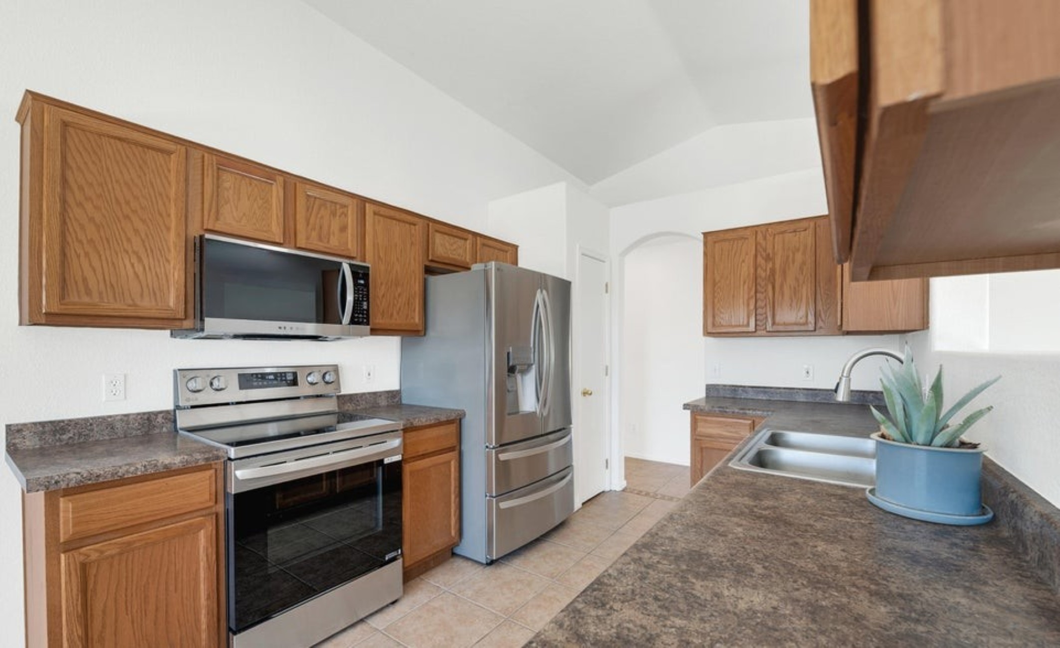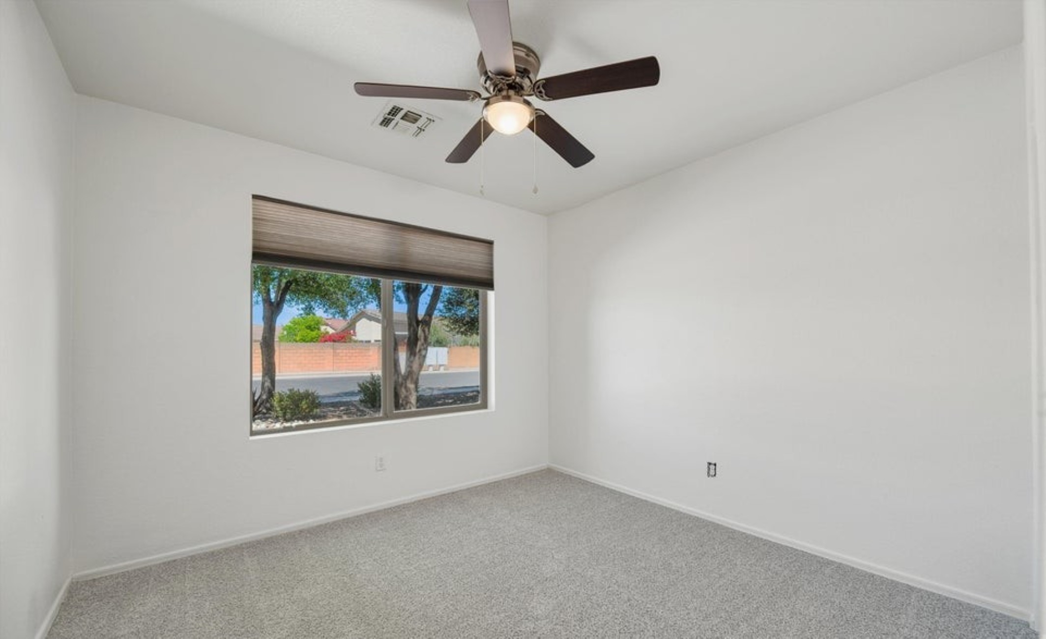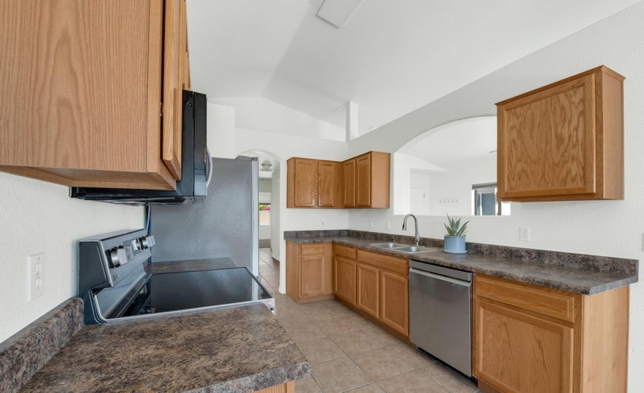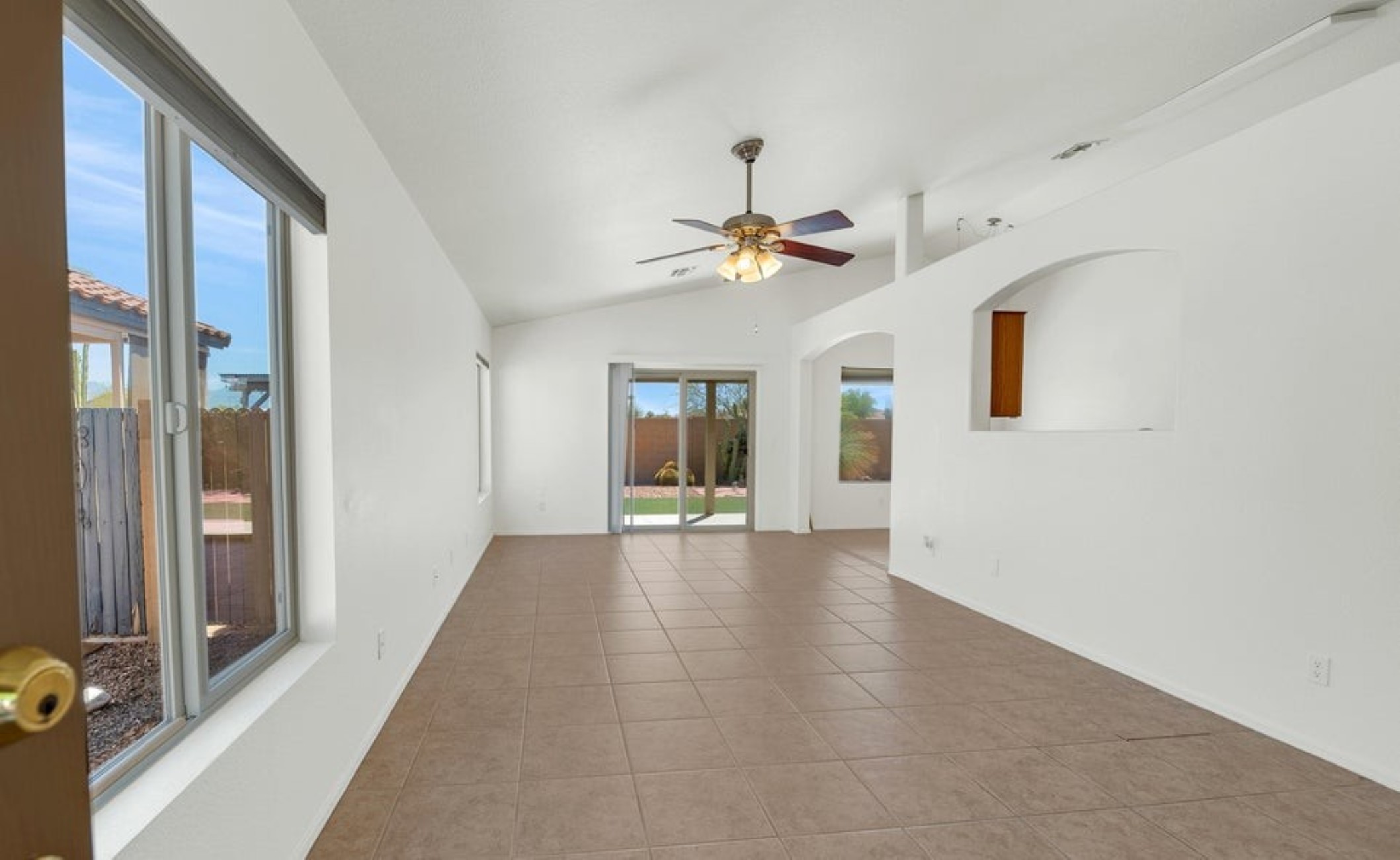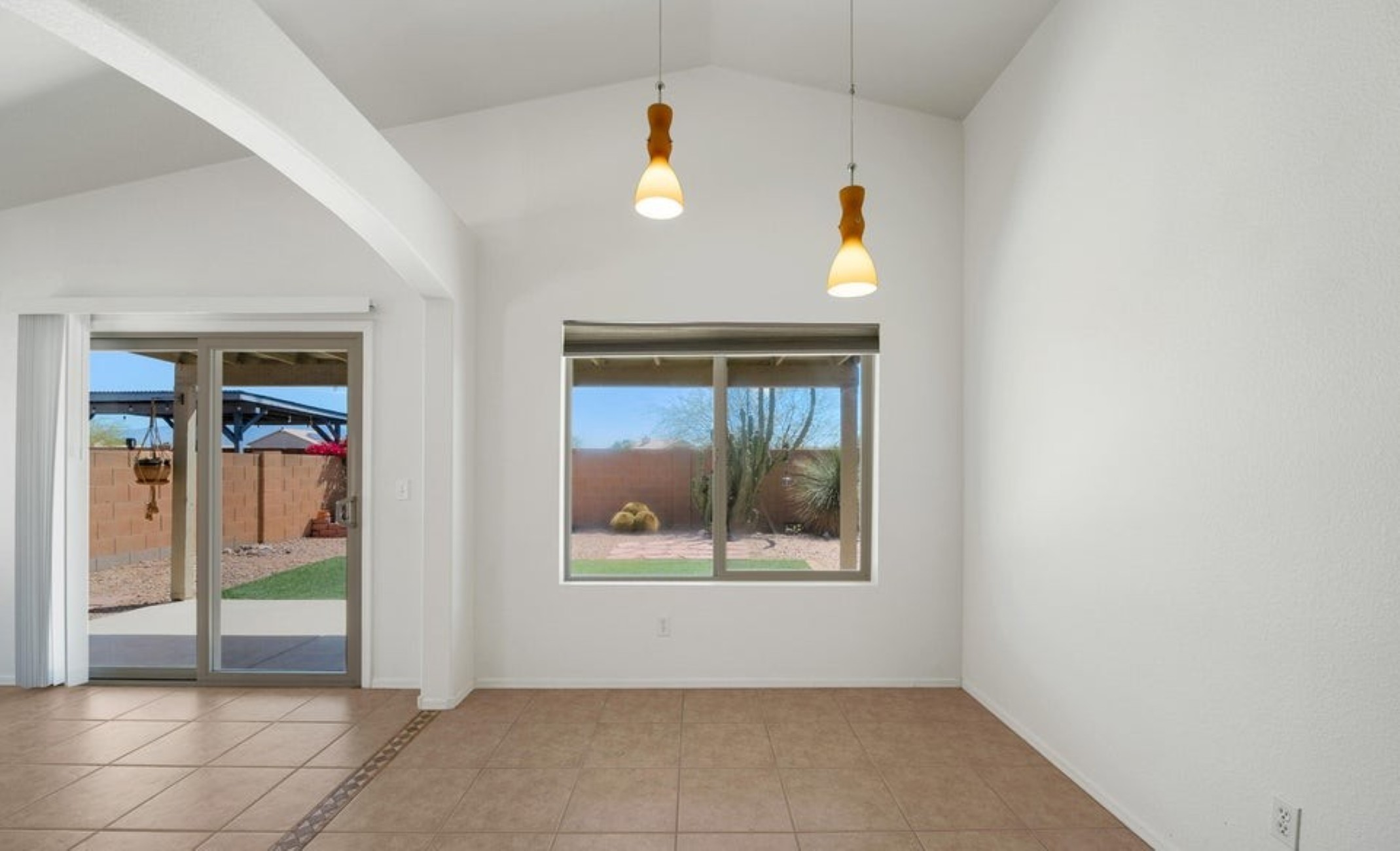 This little gem backs up to a natural wash with spectacular mountain views and offers a light and bright home! The open concept kitchen flows seamlessly into the spacious great room and features natural wood cabinetry, newer appliances, a cozy eating area, all highlighted by a large window overlooking the beautifully landscaped backyard.Step inside to a generous great room with vaulted ceilings and a sliding glass door that leads to an extended patio perfect for enjoying Arizona's outdoor living and breathtaking mountain scenery. The popular split-bedroom floor plan offers privacy and comfort.The master suite boasts tile flooring, a large walk-in shower, double sink vanity, and a spacious walk-in closet. Additional updates include newer appliances and freshly cleaned carpets making this home truly move-in ready. Don't miss out on this charming, well-maintained gem!