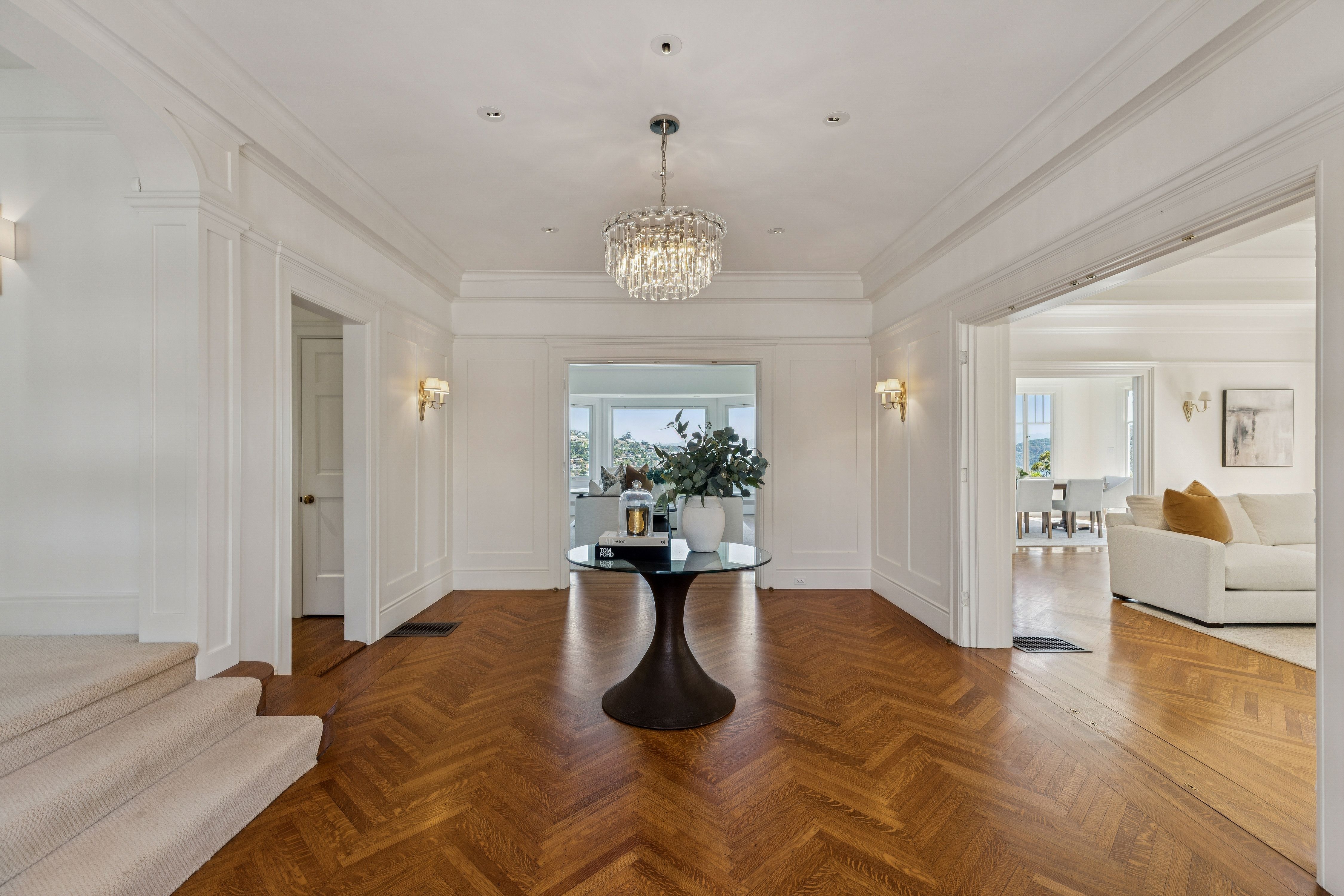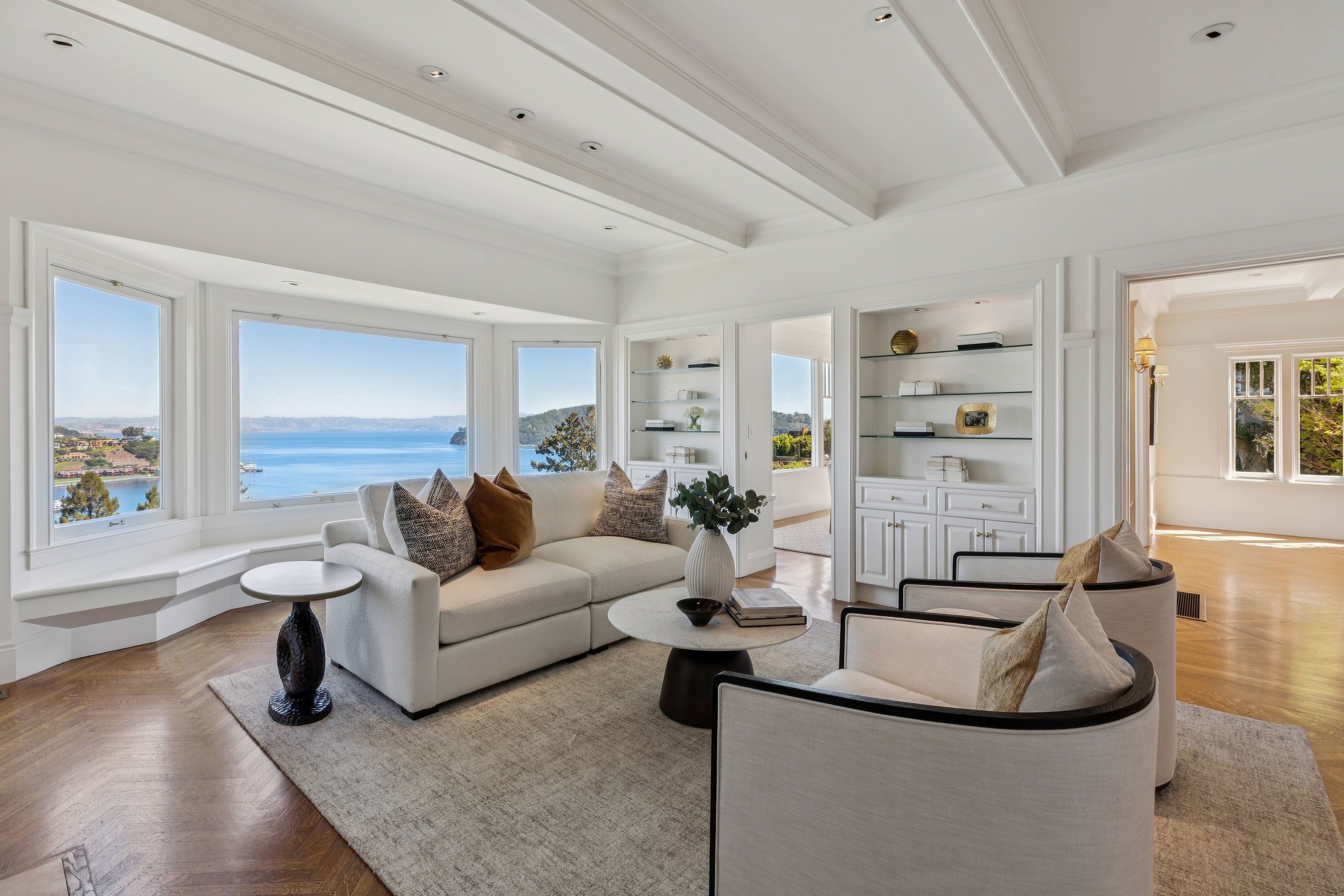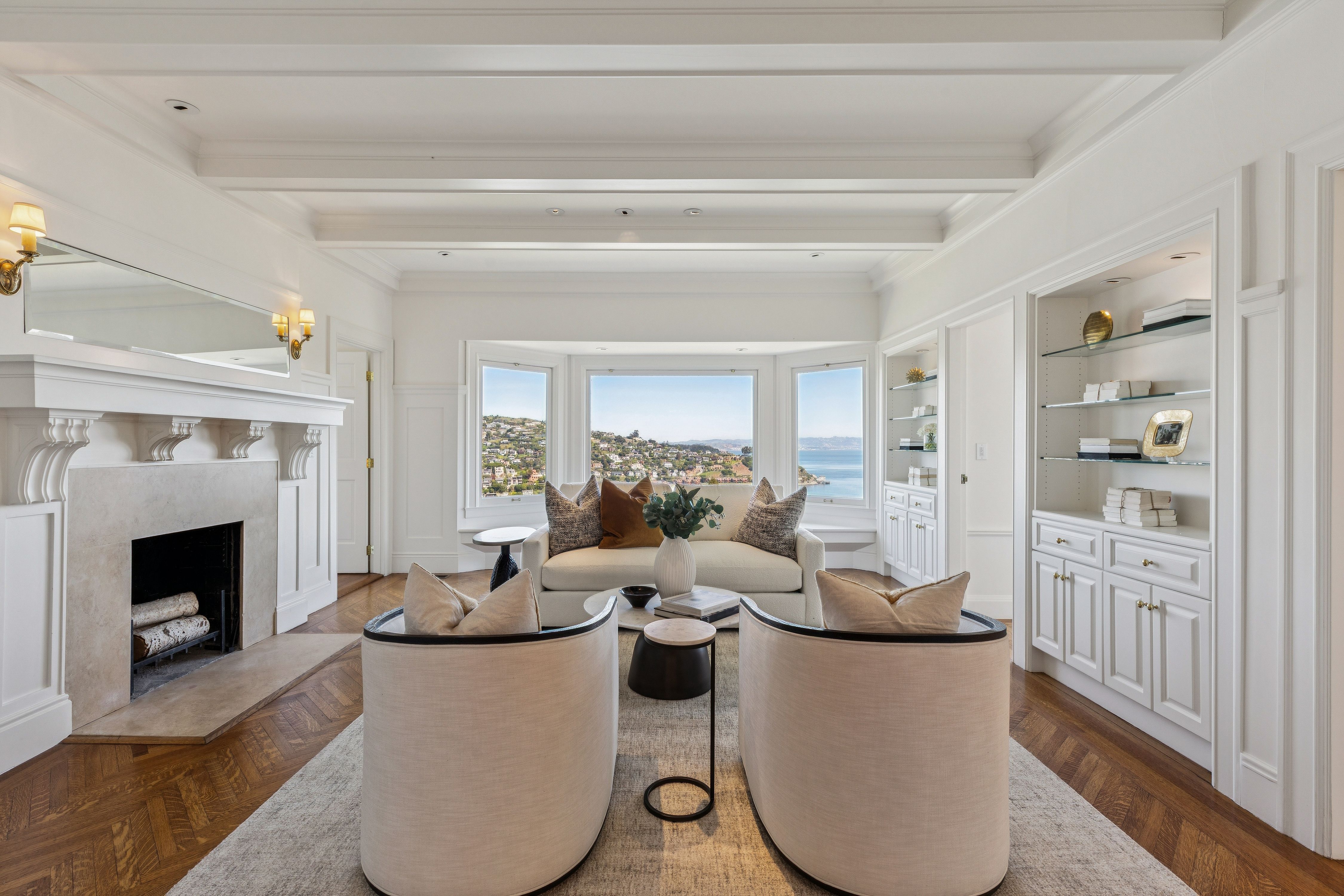 Set high above the shimmering Bay, this iconic Belvedere estate embodies the pinnacle of coastal luxury, commanding sweeping, uninterrupted views across Corinthian Island, Belvedere Cove, Old Town Tiburon, Raccoon Strait, and the San Francisco Bay. From sunrise to sunset, the ever-changing panorama offers a truly cinematic backdrop.Thoughtfully reimagined, the residence seamlessly blends timeless architecture with modern refinement. At its heart, a spectacular chef’s kitchen anchors the home—both elegant and inviting—framed by dramatic floor-to-ceiling glass doors that dissolve the boundary between indoors and out. The adjoining dining area opens effortlessly to the Bay, where breathtaking vistas become part of everyday living. From the moment of arrival, the home reveals itself with a striking sense of scale and light, offering an unforgettable first impression.Beyond a gracious courtyard entry with a tranquil fountain, approximately 7,700± square feet unfold with a sense of quiet grandeur. Classic architectural details—coffered ceilings, five wood-burning fireplaces, and walls of oversized windows—are paired with expansive terraces, a pool, and lush gardens, creating a seamless indoor-outdoor lifestyle designed for both intimate living and grand-scale entertaining.The primary suite is a private sanctuary of exceptional comfort and elegance, featuring dual dressing rooms and spa-inspired baths, radiant heated floors, and a steam shower. A secluded view lounge with kitchenette offers a peaceful retreat, all set against a backdrop of sweeping Bay vistas.In total, the estate offers eight bedrooms, seven full baths, and two half baths, including a separate au pair suite and a private-entry office or guest residence—providing flexibility and privacy for a variety of lifestyles.The resort-inspired grounds are equally compelling, with mature gardens, manicured lawns, a pool, and beautifully appointed terraces. Additional amenities include a wine cellar, a fitness and yoga studio with ballet barre, and a sauna—creating a true sanctuary for wellness and relaxation.Modern infrastructure enhances the home’s livability, with integrated security, CAT-6 wiring throughout, multiple laundry rooms, three separate entrances, abundant storage, and a two-car garage with additional carport.Ideally located just moments from downtown Tiburon, yacht clubs, scenic waterfront pathways, and an effortless ferry commute to San Francisco, this is a rare offering—where timeless design, extraordinary views, and an unparalleled setting converge to create a true legacy estate.