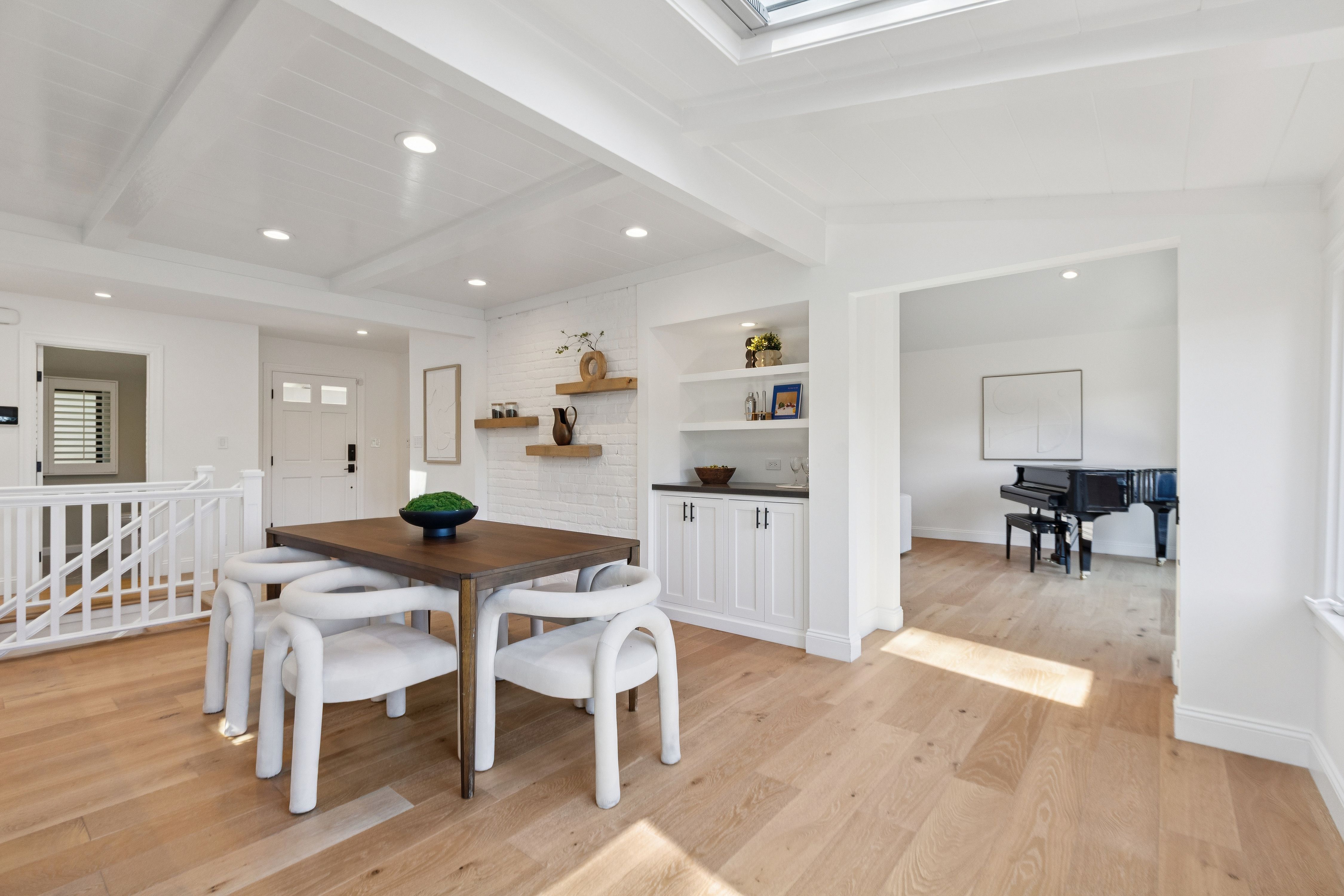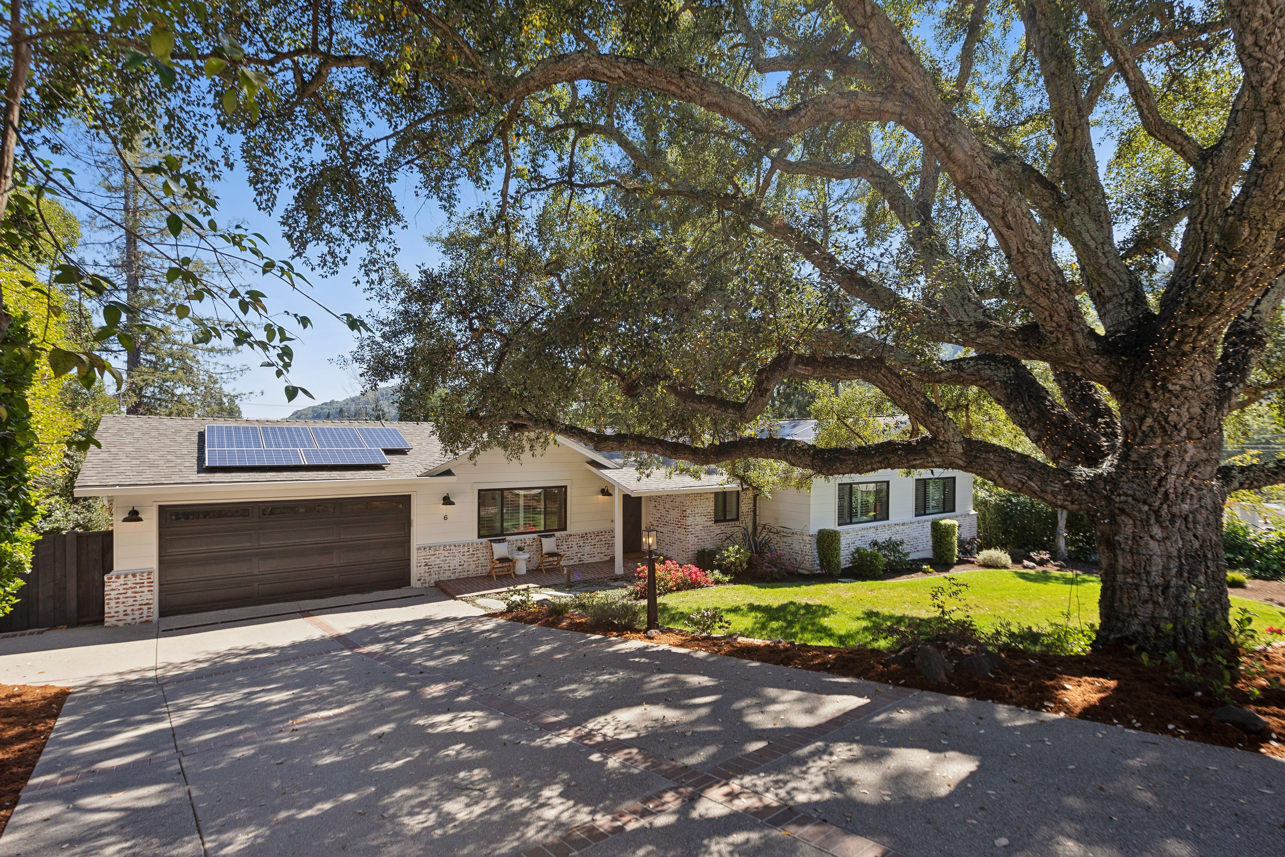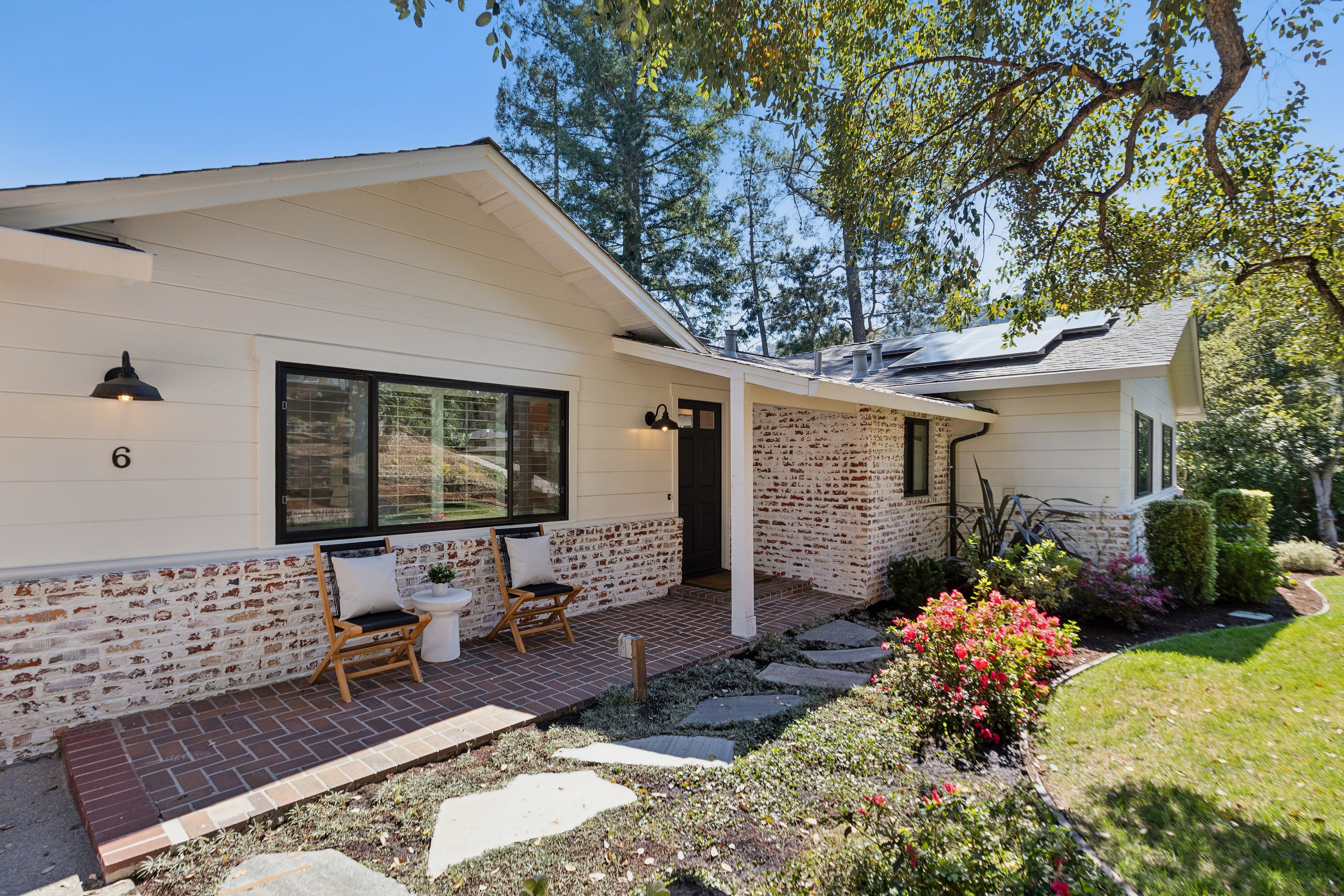 Set quietly in one of Orinda’s most desirable residential enclaves with close proximity to all three award winning public schools, this beautifully reimagined California Ranch style home offers an exceptional balance of refined living. The residence blends timeless character with modern systems, finishes, and amenities.Freshly painted and framed by stylish whitewashed brick, the home presents a welcoming presence from the moment of arrival. The front grounds were completely replanted and reseeded anchored by a magnificent historic oak cork tree whose sculptural form provides both shade and a sense of permanence. Automated irrigation and drip systems, ensure ease of maintenance while preserving the beauty of the landscape year-round. New Pella Impervia fiberglass windows in the front enhance both energy efficiency and architectural clarity while allowing natural light to fill the interior spaces.Inside, the home unfolds across approximately 2,789 square feet. Wide-plank engineered oak flooring runs throughout, fresh interior paint and carefully selected finishes that create a cohesive and calming environment. The kitchen serves as both a functional centerpiece and a place of gathering. Outfitted with a professional-grade Wolf range featuring double ovens, six burners, and integrated griddle, the space is equally suited for everyday meals or larger culinary pursuits. A Sub-Zero refrigerator, Bosch 800 Series panel-integrated dishwasher, and built-in Wolf microwave reflect a commitment to quality and performance. Ample cabinetry with integrated organizational systems provides exceptional storage, while expansive work surfaces and a large sink with filtered water ensure practical ease. The adjacent dining area introduces warmth and character through a distinctive brick accent wall and integrated bar area, complete with quartz countertop, shelving, and cabinet storage. Wall-to-wall sliding glass doors in the living room create a seamless transition to an expansive elevated deck overlooking the private rear yard and surrounding hillside. This elevated vantage point provides both visual openness and privacy. The living room itself is anchored by a mosaic tile fireplace and framed by custom floor-to-ceiling built-in shelving that offers both display and storage.The primary suite is a quiet retreat, defined by generous proportions, elevated ceilings, and French doors that open directly to a private deck. The walk-in closet offers ample storage, while the fully updated primary bath introduces spa-like elements through mosaic tile finishes, quartz surfaces, Kohler fixtures, skylight illumination, and an oversized jetted soaking tub designed for relaxation.Additional bedrooms provide flexibility for family, guests, or workspace, including a main-level bedroom equipped with a custom Murphy bed for a hybrid office/guest suite and three lower-level bedrooms featuring built-in shelving and direct access to the rear yard. Bathrooms throughout the home have been carefully remodeled with contemporary finishes, including quartz vanities, mosaic tile flooring, and tiled showers.The rear yard is designed for both leisure and utility. A six-person Jacuzzi hot tub surrounded by custom wood decking offers a peaceful place to unwind beneath the open sky. Raised planter beds, integrated with WiFi-controlled irrigation, provide opportunities for gardening while maintaining ease of care. A fully fenced perimeter ensures privacy and security, complemented by a gated dog run and drought-resistant landscaping.A detached 120-square-foot fully finished auxiliary structure offers exceptional flexibility as a home office, fitness studio, or creative workspace. Additional outdoor amenities include a bocce ball or horseshoe court.Set within a peaceful hillside setting yet steps from award-winning schools, Moraga Country Club, and commuter access, this property offers a rare combination of privacy, usability, and connection.