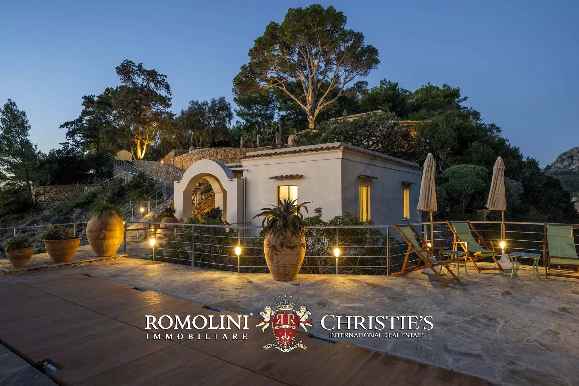The residence, embellished with polychrome ceramic floors and large panoramic windows, is on two levels connected by terraces that slope gently toward the water, creating a natural continuity between indoor and outdoor spaces. Next to the villa, a refined guesthouse and a series of service outbuildings – including a panoramic swimming pool with solarium area, bar and staff areas – make up a harmonious complex immersed in the Mediterranean bush, designed to welcome guests in a context of absolute comfort and privacy.