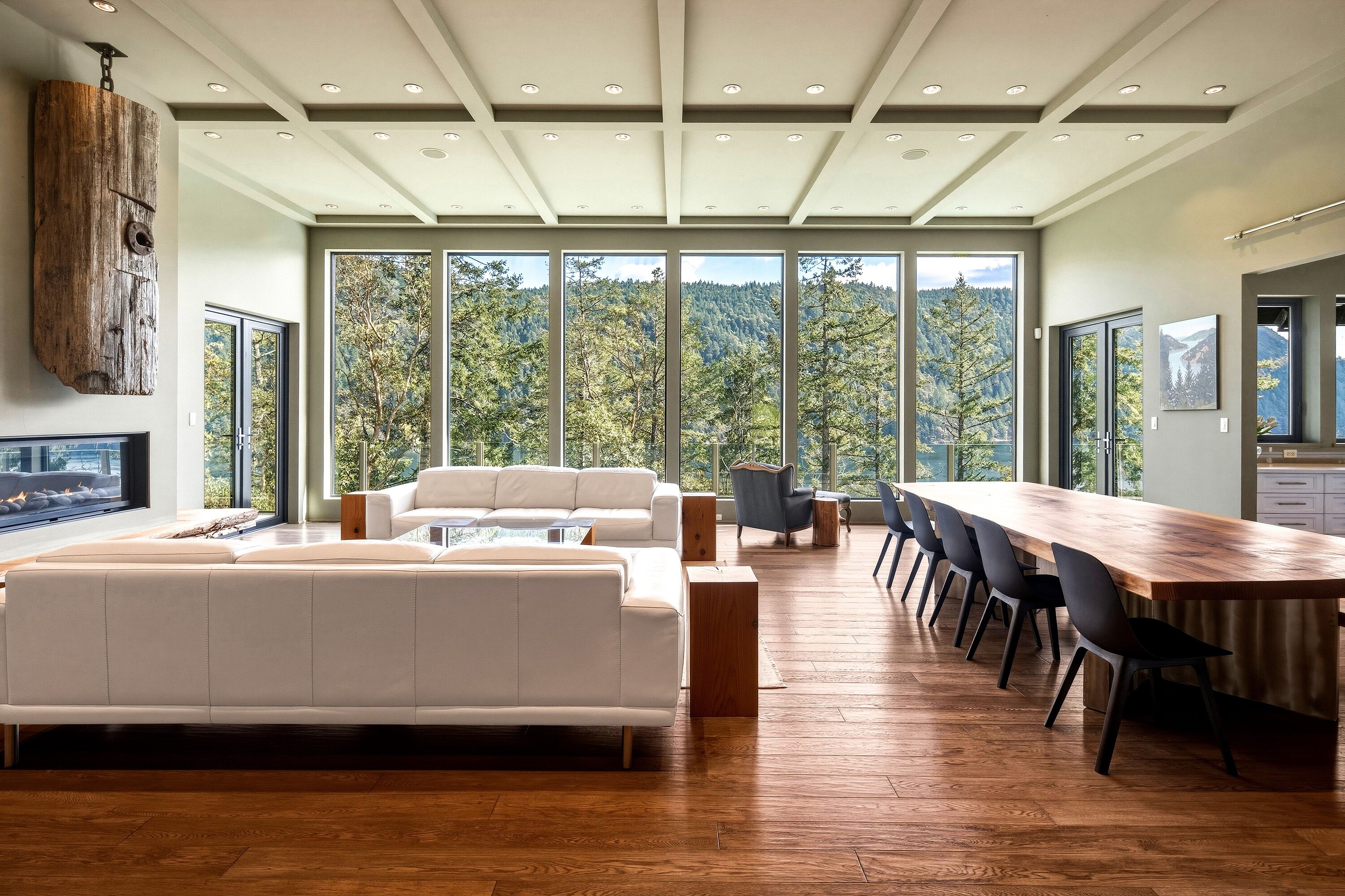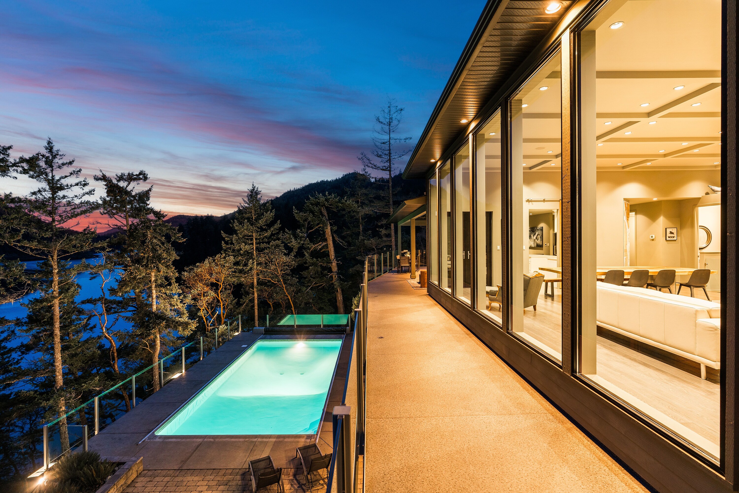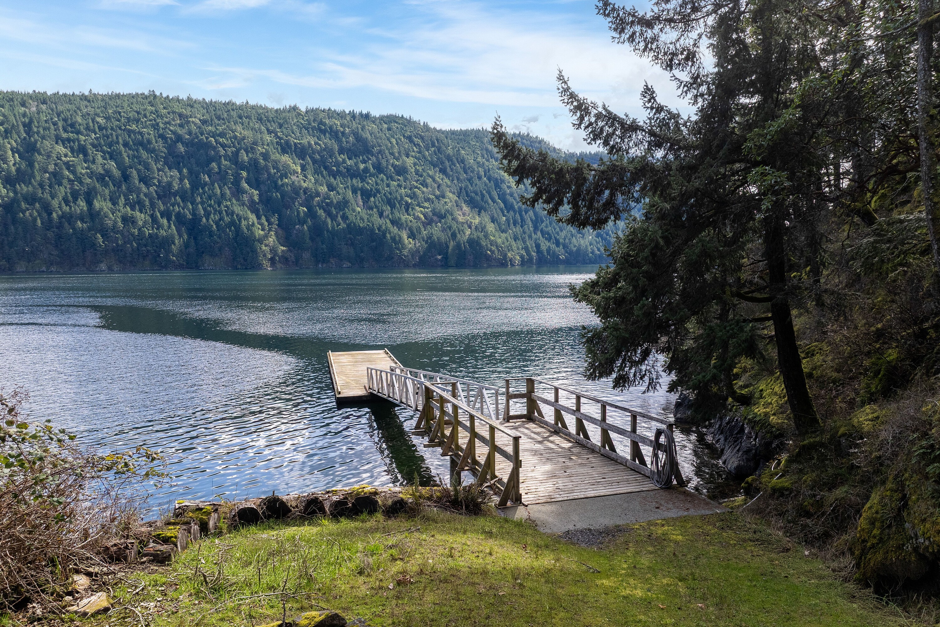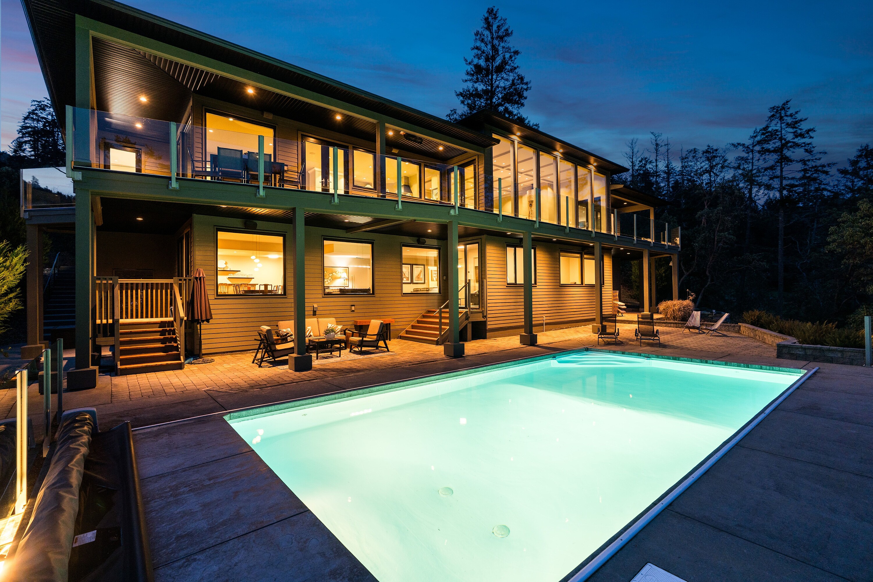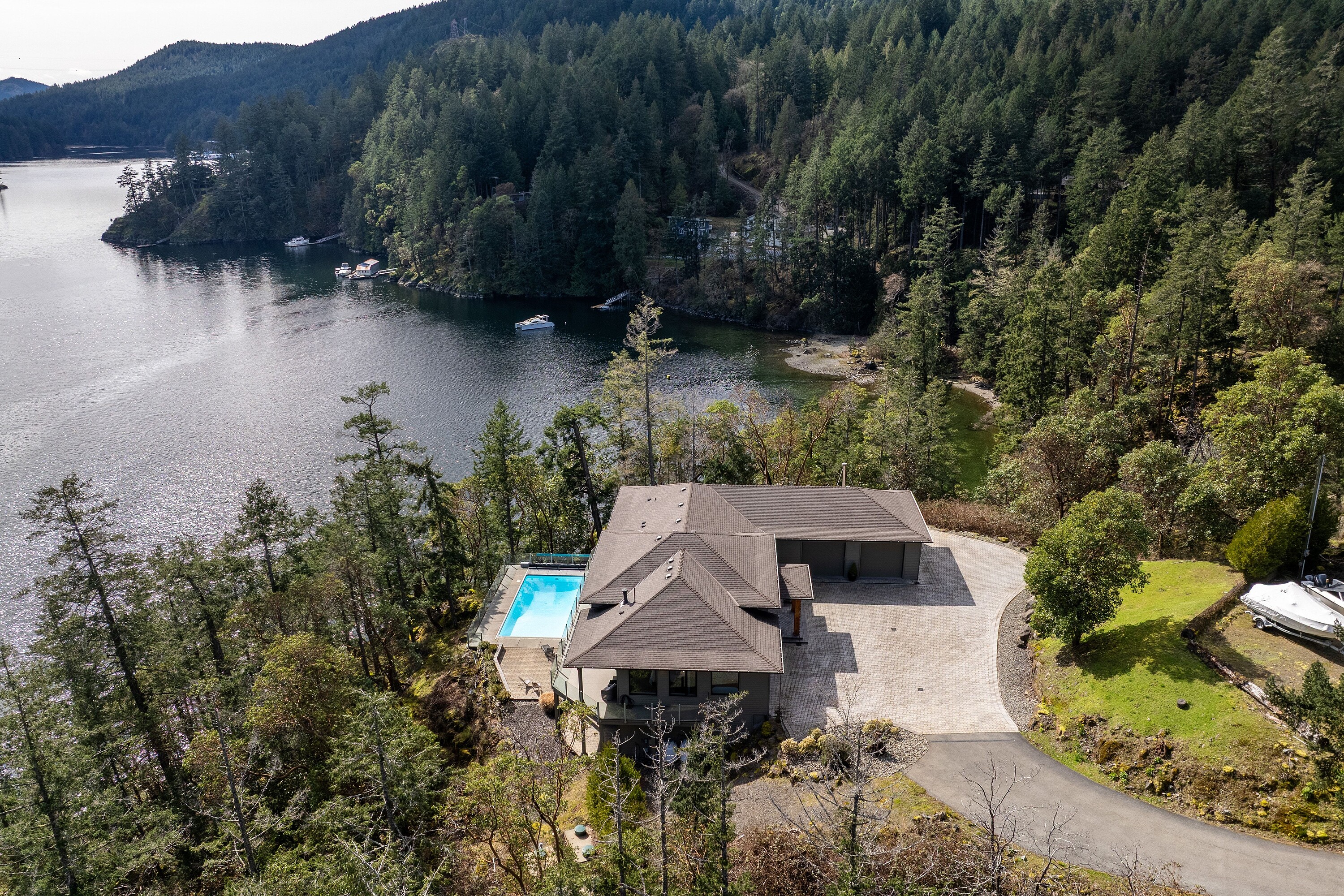A rare waterfront offering set on over five acres with over 650 feet of waterfrontage with a private dock, valuable foreshore lease, and deep-water moorage, providing direct access to the calm, protected waters of Finlayson Arm for year-round boating and fishing. Perched above the inlet, this private gated estate captures breathtaking ocean, mountain, and rugged West Coast views from an extraordinary vantage point. Thoughtfully designed to harmonize with its natural surroundings, the custom-built contemporary residence blends refined modern luxury with the serenity of coastal living. Over 4,600 square feet of beautifully finished living space, the home features five bedrooms and six bathrooms, expansive windows that frame the dramatic landscape, and generous living areas designed for both elegant entertaining and relaxed everyday living. Outdoors, a pool, hot tub, and outdoor shower create a private resort-like retreat overlooking the spectacular natural beauty of the inlet. An exceptional West Coast sanctuary.