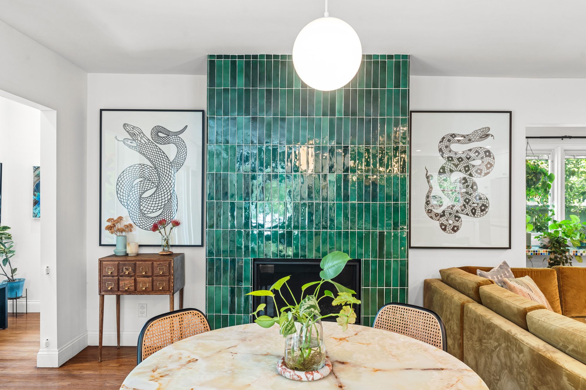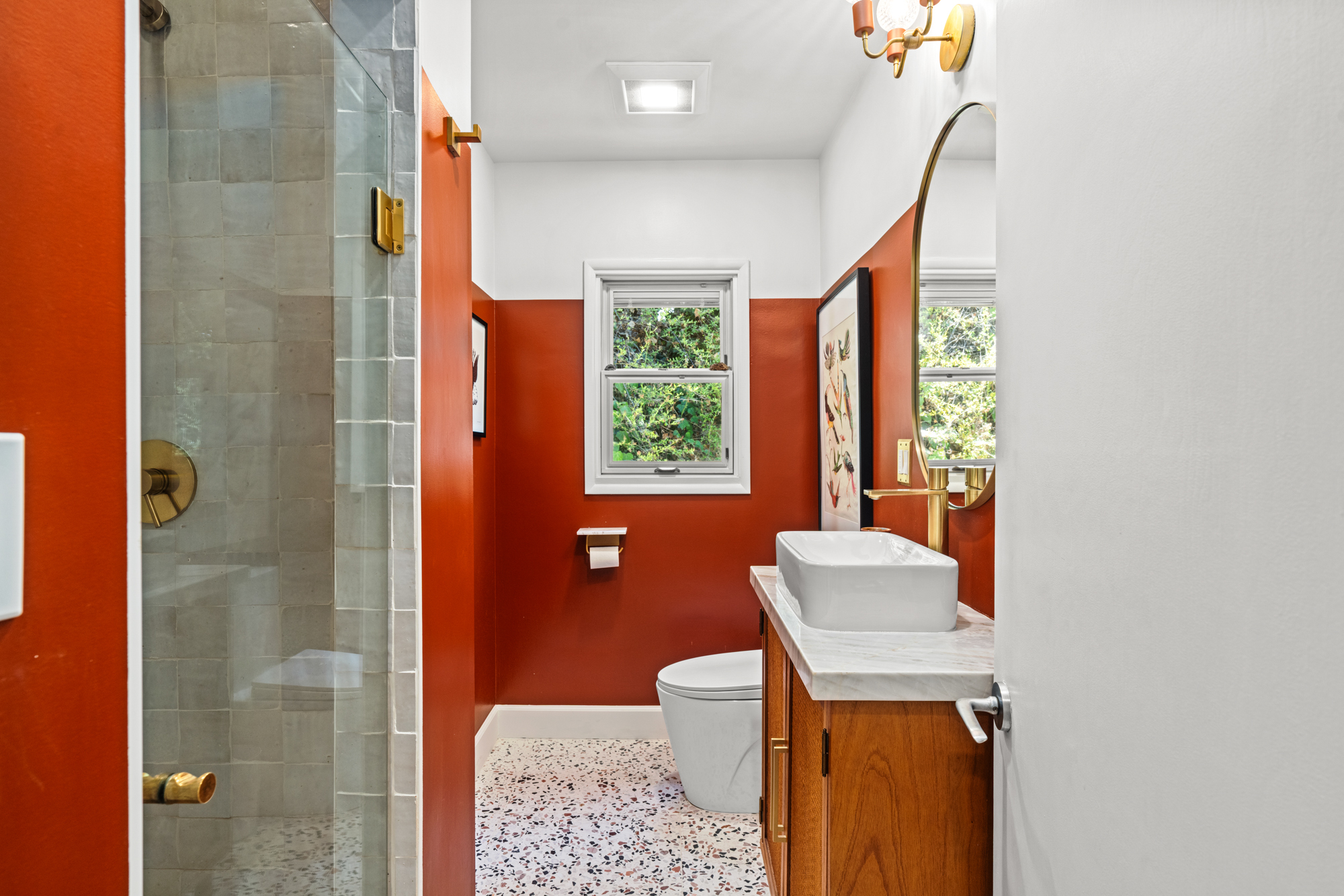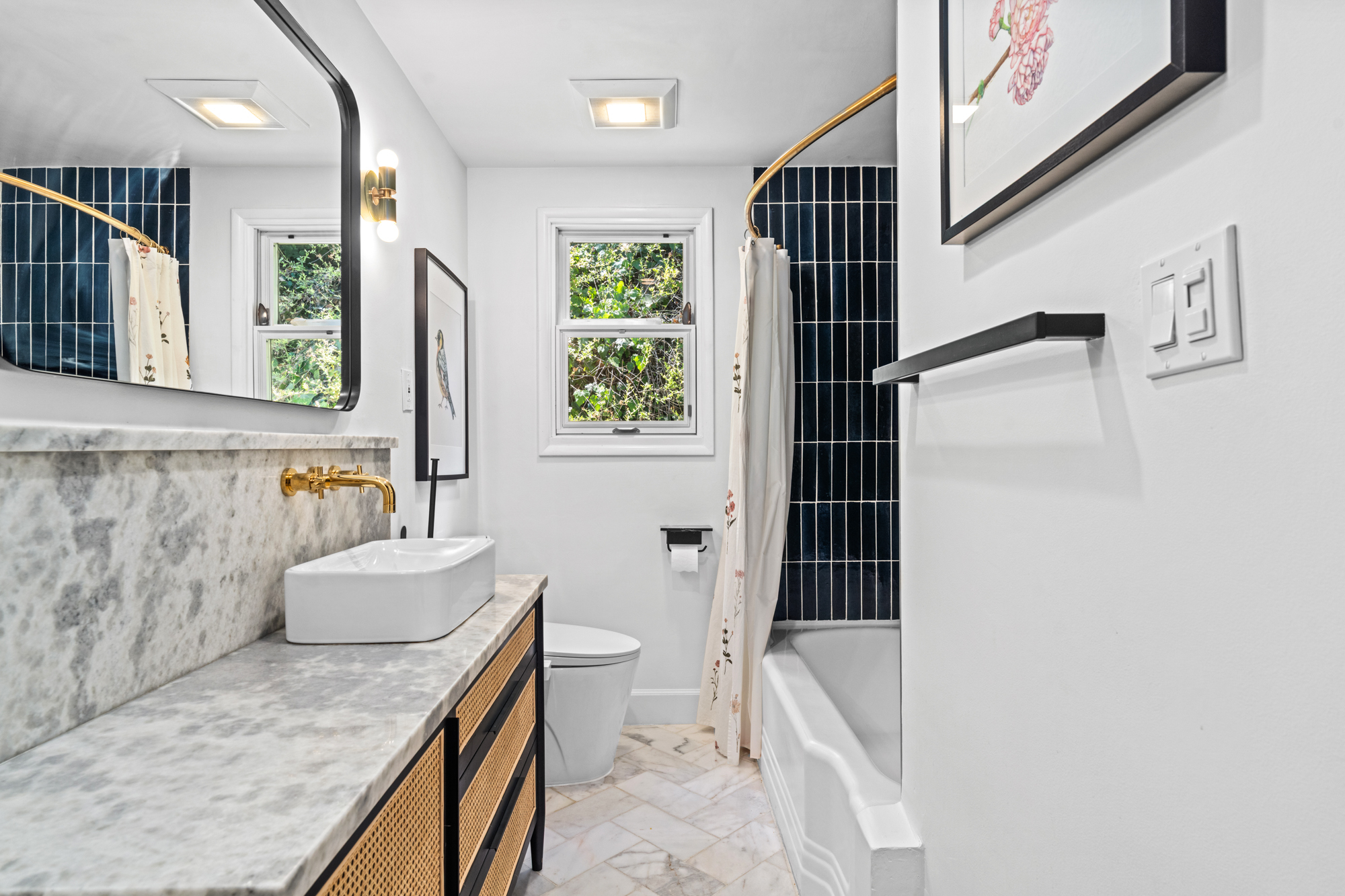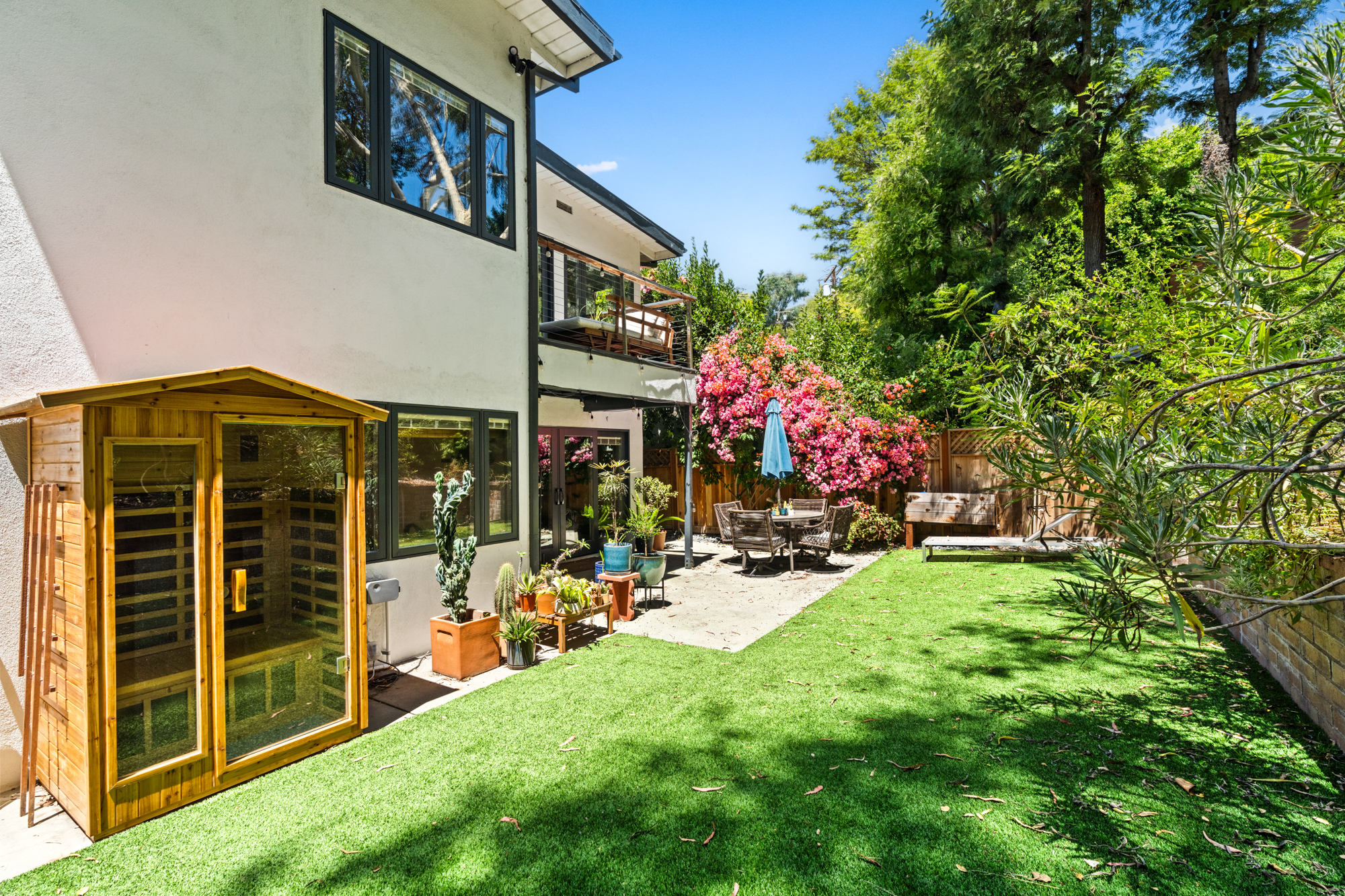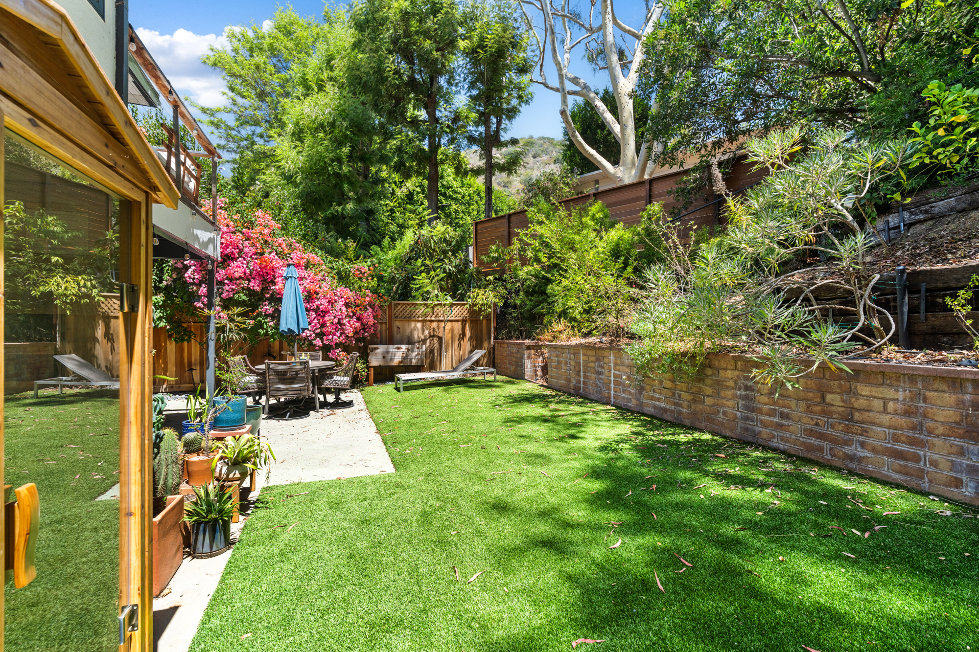 Nestled at the end of a quiet, non-through street and surrounded by lush greenery, this 1,978-square-foot, three-bedroom, three-bathroom home offers a rare sense of privacy paired with effortless indoor-outdoor living. Beautifully upgraded with designer finishes throughout, this charming retreat offers an abundance of natural light, with space to entertain on all scales. At the heart of the home, an open concept living and dining area flow seamlessly into the gourmet kitchen - complete with a large center island with breakfast bar, and professional-grade appliances. Dramatic emerald ceramic tile, bespoke marble surfaces and custom walnut cabinetry further enhance the space, which opens directly to an oversized outdoor terrace - perfect for alfresco dining. Three-bedroom suites consist of a lower-level primary, complete with sumptuous en-suite bathroom, large walk-in closet and sliding doors that open to a private covered patio, and the charming back yard with lush, mature landscaping. Two guest bedrooms share an outdoor terrace with views of the back garden, with an additional two designer-guest bathrooms for added convenience. A finished two car garage and ground floor storage room complete the home. This is a prime opportunity to own a turn-key property in the heart of Bel Air - moments from the best dining, leisure and transportation links Los Angeles has to offer.