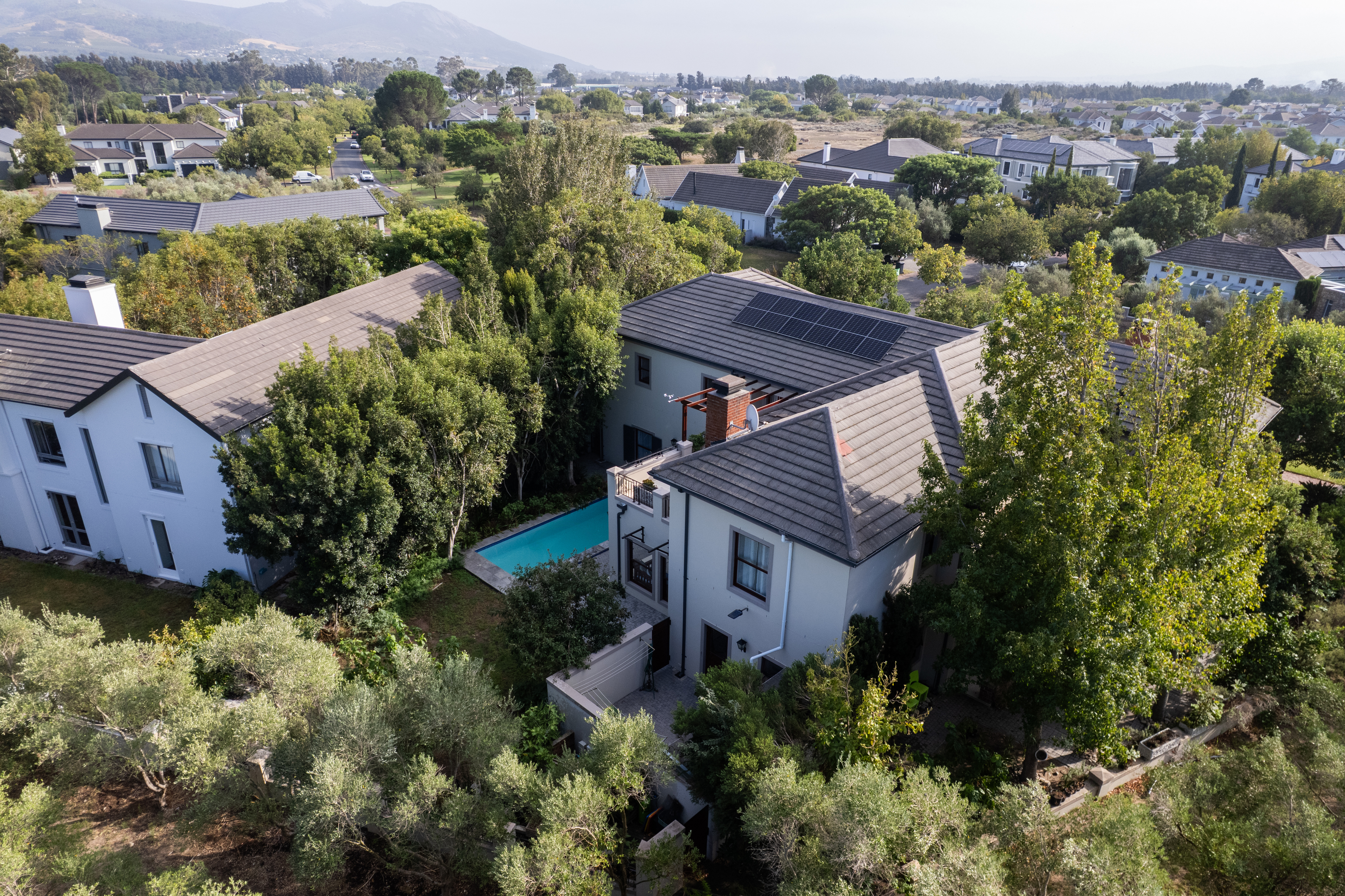 Set within the world-renowned Val de Vie Estate in the heart of the Paarl–Franschhoek Valley, this elegant double-storey residence captures the essence of luxury Cape Winelands living. Surrounded by meticulously landscaped gardens, mature trees and an adjoining olive orchard greenbelt, the home enjoys exceptional privacy and a tranquil, nature-rich setting within one of South Africa’s most prestigious lifestyle estates.