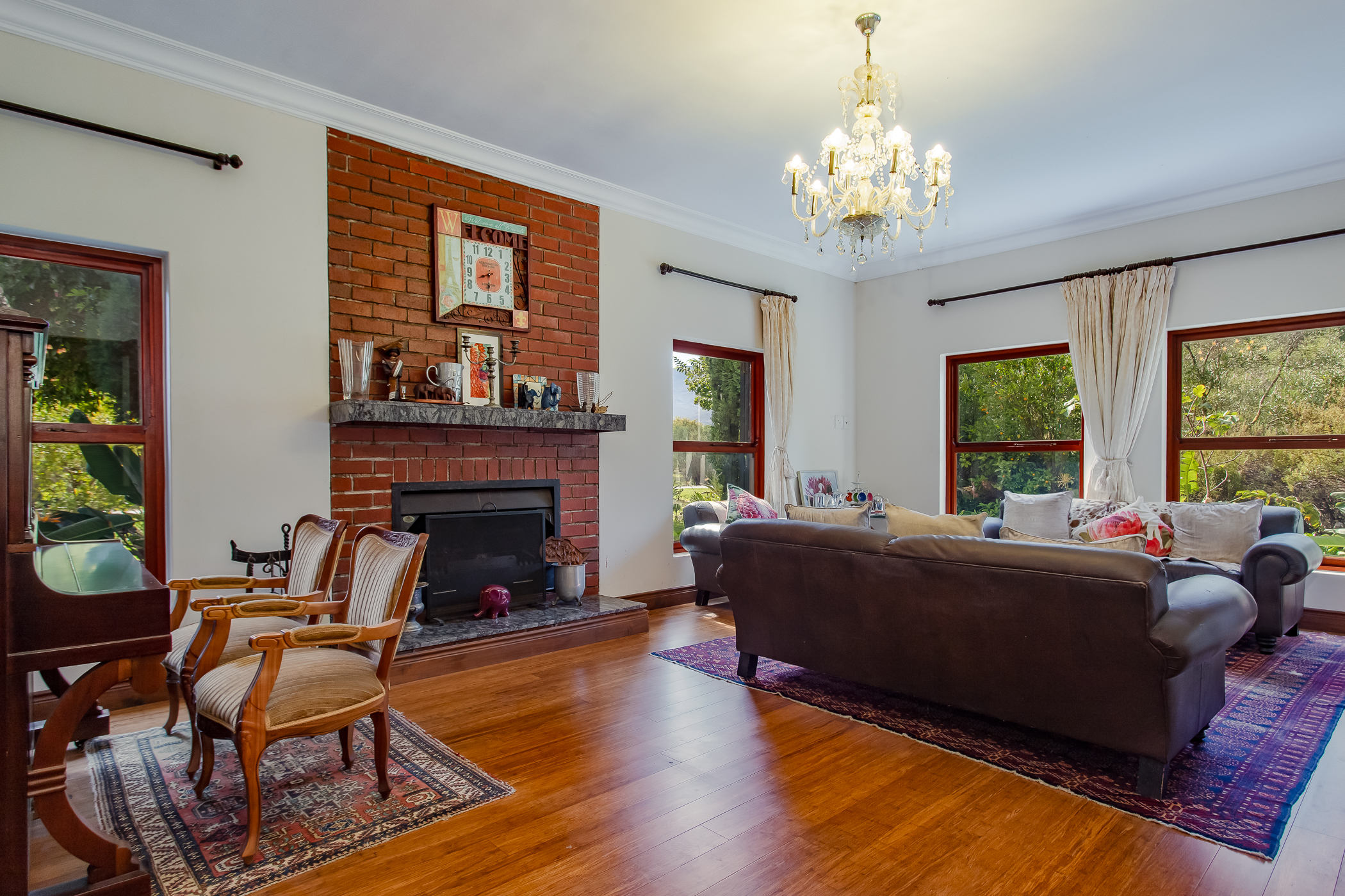 Sustainability and modern convenience are key features of this home, with a comprehensive solar energy system comprising 14 solar panels, two large batteries and a solar geyser, supporting energy efficiency and reduced reliance on the grid. Air-conditioning and two fireplaces provide year-round comfort, enhancing the home’s warm and inviting atmosphere.