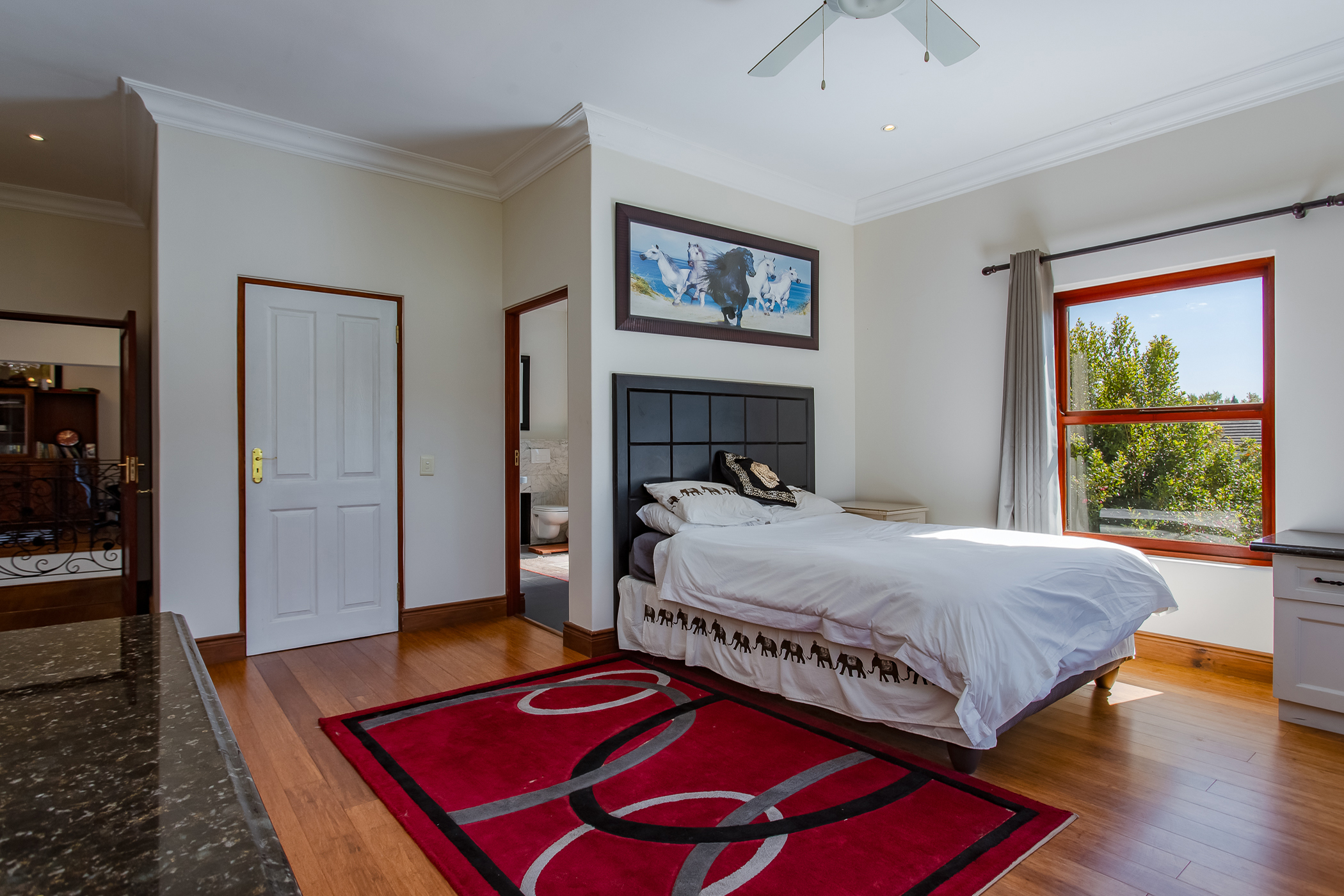 A striking double-volume entrance hall with a sweeping staircase creates an immediate sense of grandeur and leads to four generously sized en-suite bedrooms. Each bedroom opens onto balconies that capture sweeping mountain views and overlook a pristine 4-hectare nature reserve where zebra and springbok roam freely, reinforcing the estate’s unique connection to nature. The expansive upper landing offers a versatile space ideal for a home office or informal pajama lounge, adding flexibility to the home’s family-oriented design.