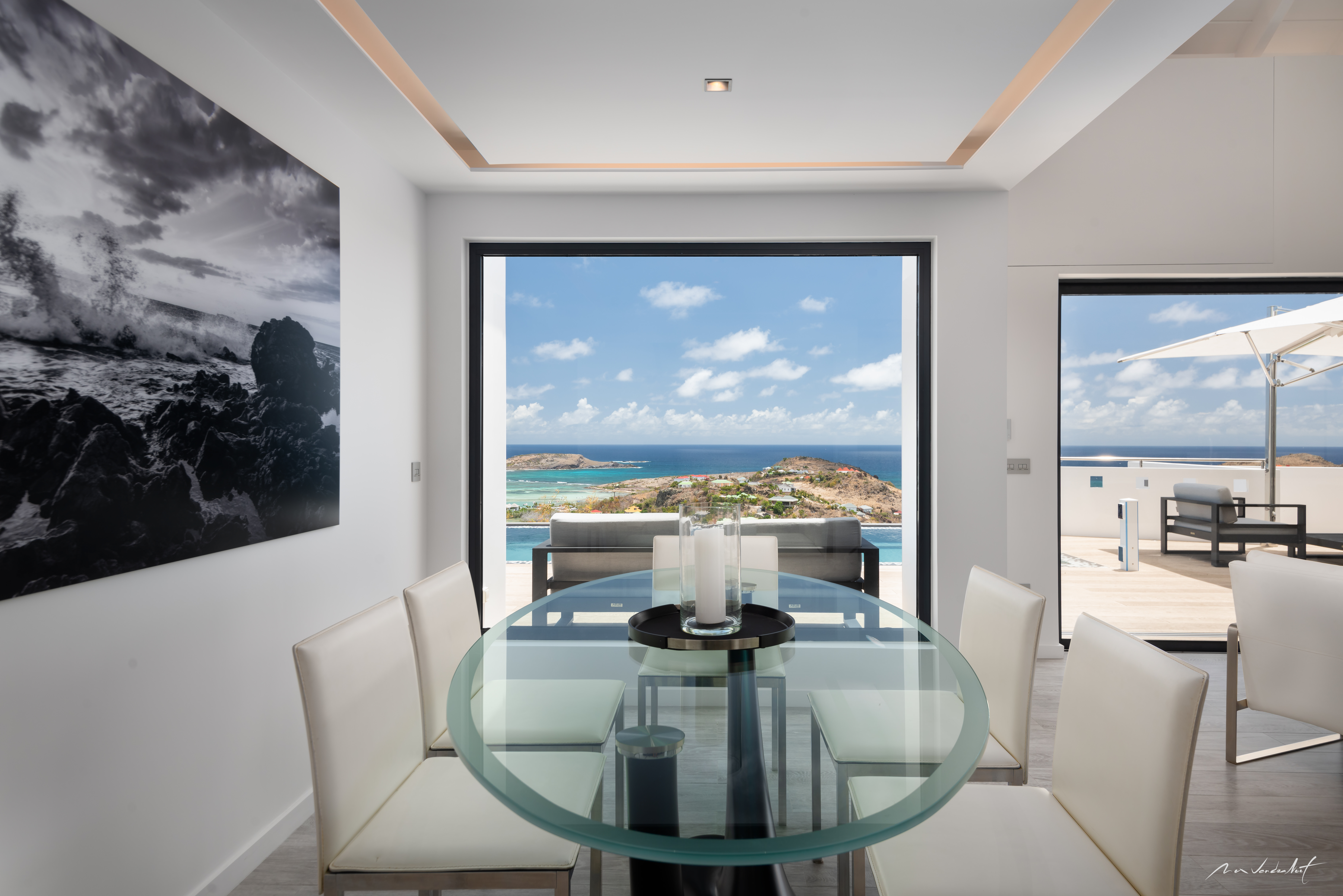 Set across two levels, the villa features a bright and open living space with high vaulted ceilings and seamless indoor-outdoor flow. Floor-to-ceiling glass doors open onto a spacious terrace, inviting in natural light and cooling trade winds. The fully equipped modern kitchen and stylish dining areas—both indoors and al fresco—make it ideal for relaxed island living and entertaining.