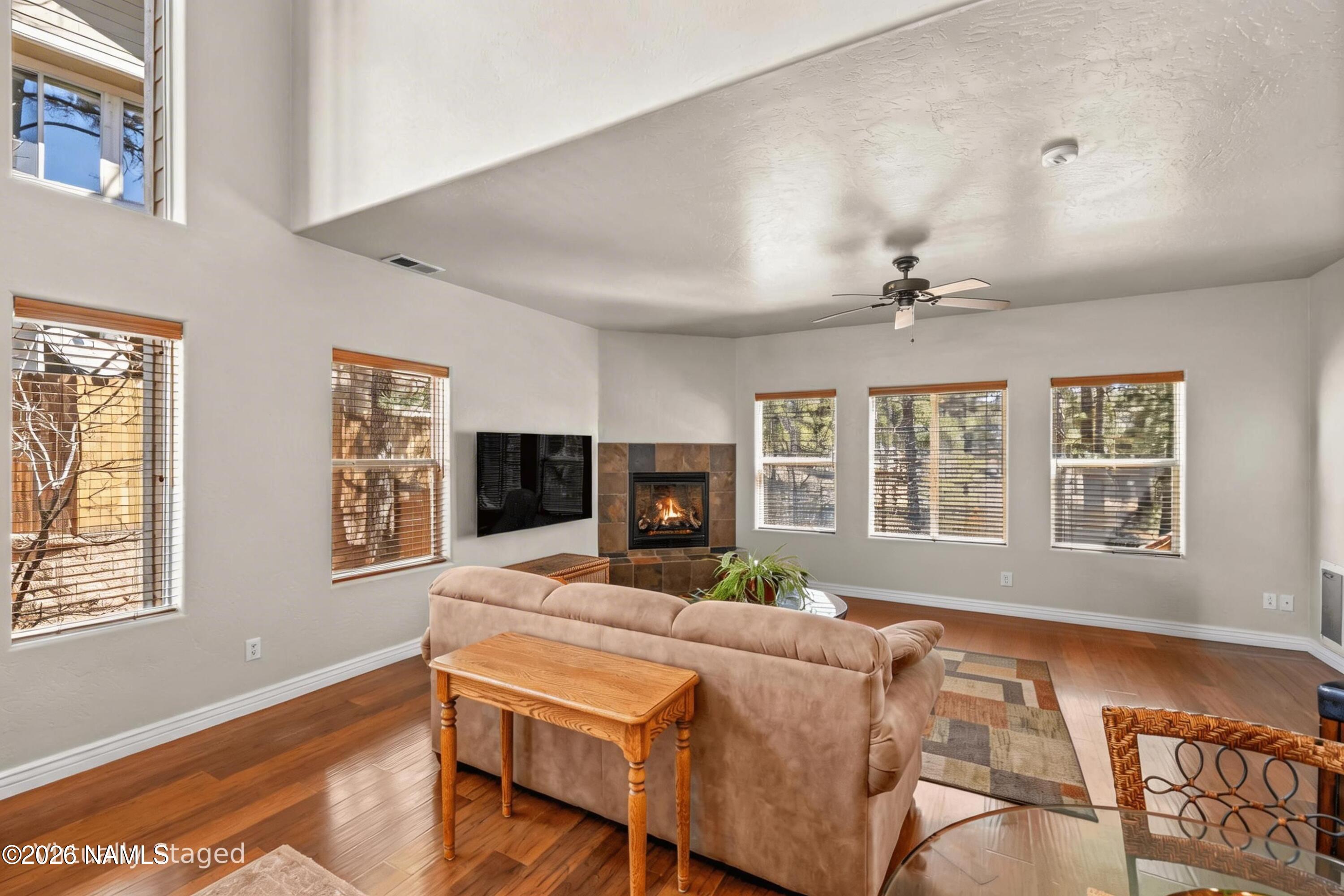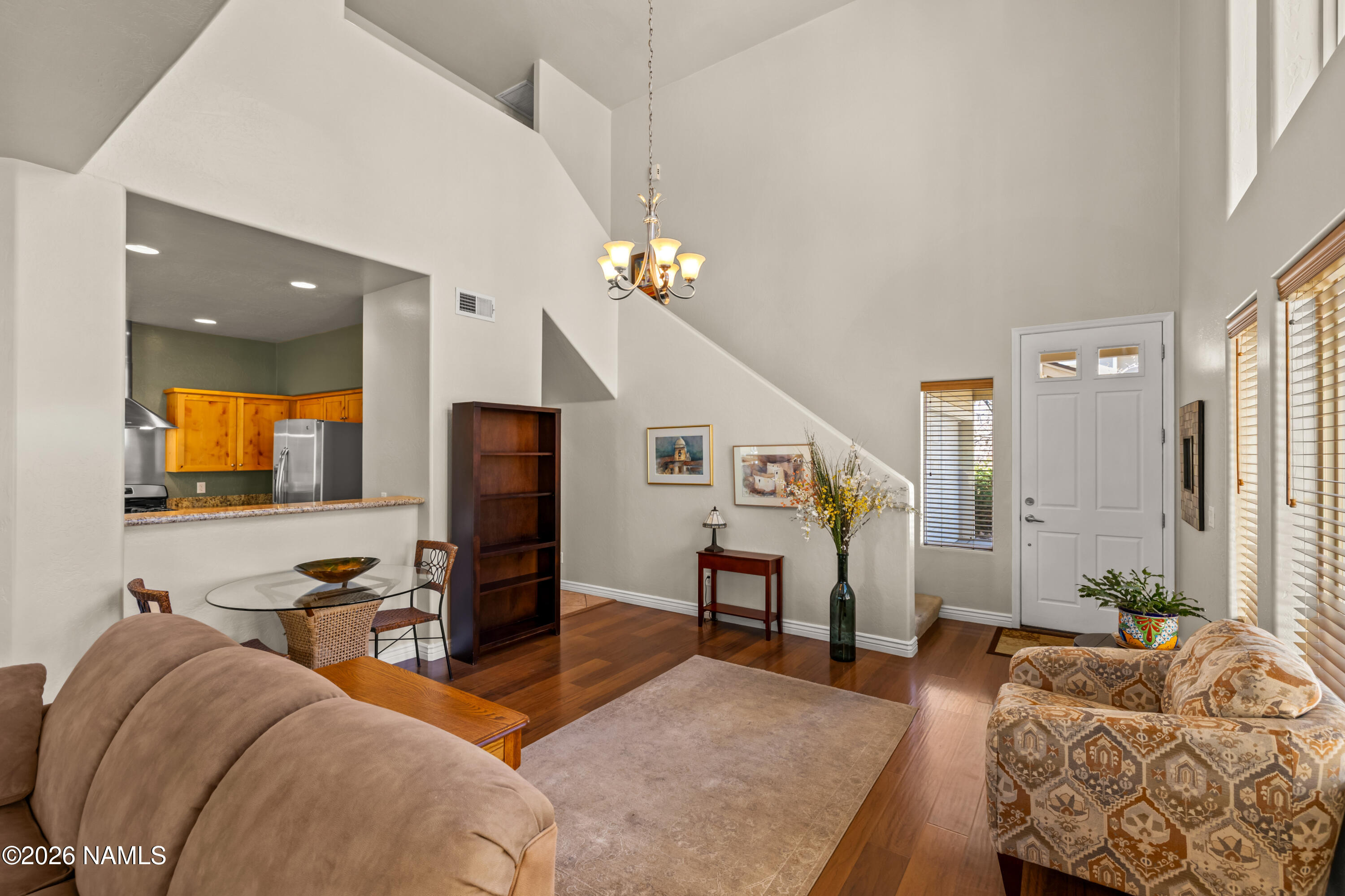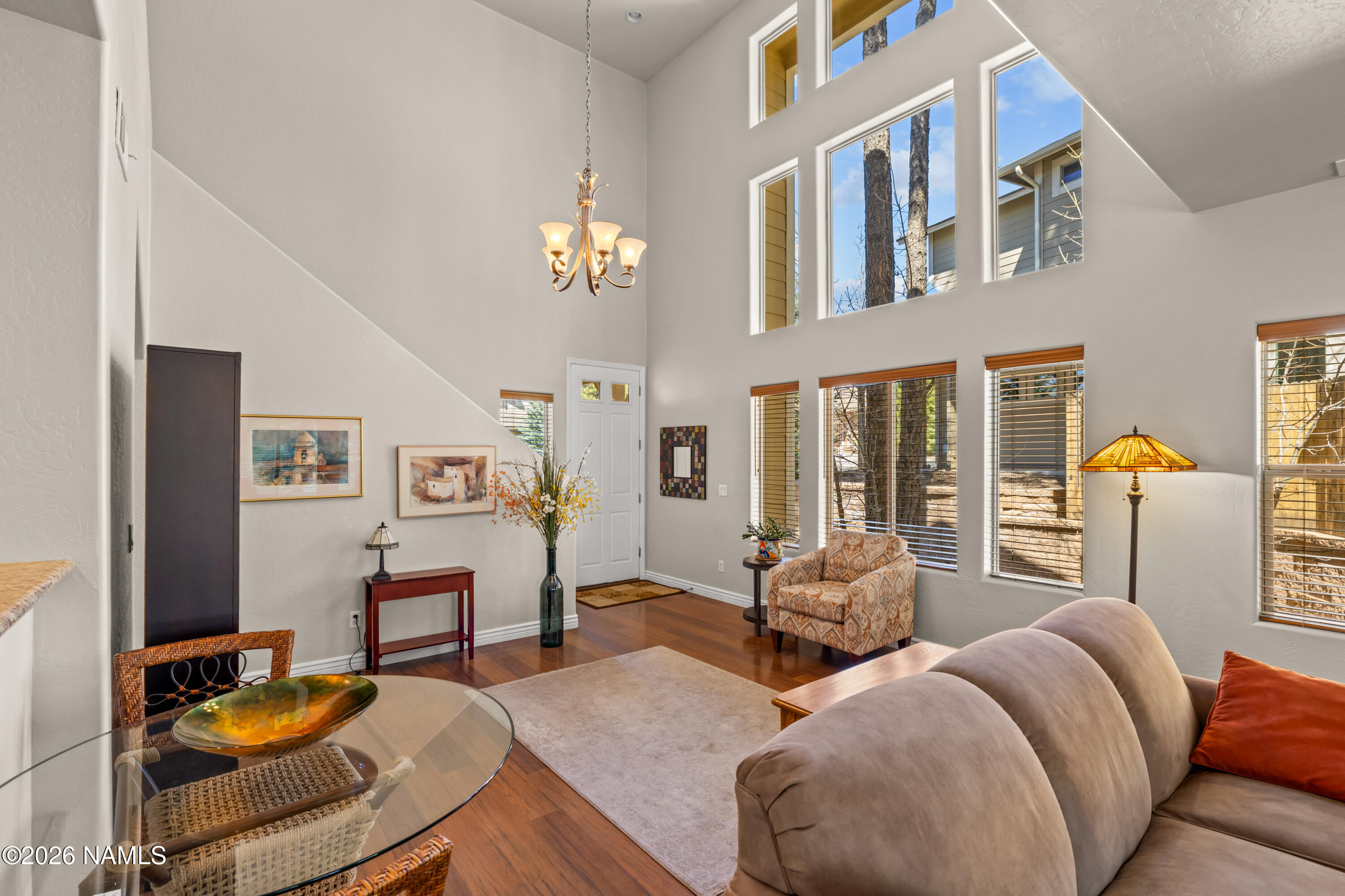 Do you dream of a welcoming, open, light-filled mountain oasis in the cool pines of Flagstaff, centrally located near Flagstaff's best amenities, that feels like you are in your own private, magical forest? 1152 Flowing Springs is your dream come true! Walk into the artrium-style entryway with soaring ceilings and clerestory windows that fill the home with natural light. Enjoy views of the lush pines and your landscaped garden through the greatroom windows. It's like being tucked away in the forest! Cook and create to your heart's content in the spacious, open kitchen. Indoor-outdoor living is effortless here. Dine, relax, entertain, garden, and play in the uniquely large fenced yard, thoughtfully curated and privately set apart from the outside world by a beautiful berm. This impeccabl maintained 3-bedroom, 2.5-bath townhome is move-in ready, with the inspection completed and repairs already made. The beauty and privacy of the large forested yard in a low-maintenance, centrally located Flagstaff home is a rare find! Please note: some photos are digitally staged.