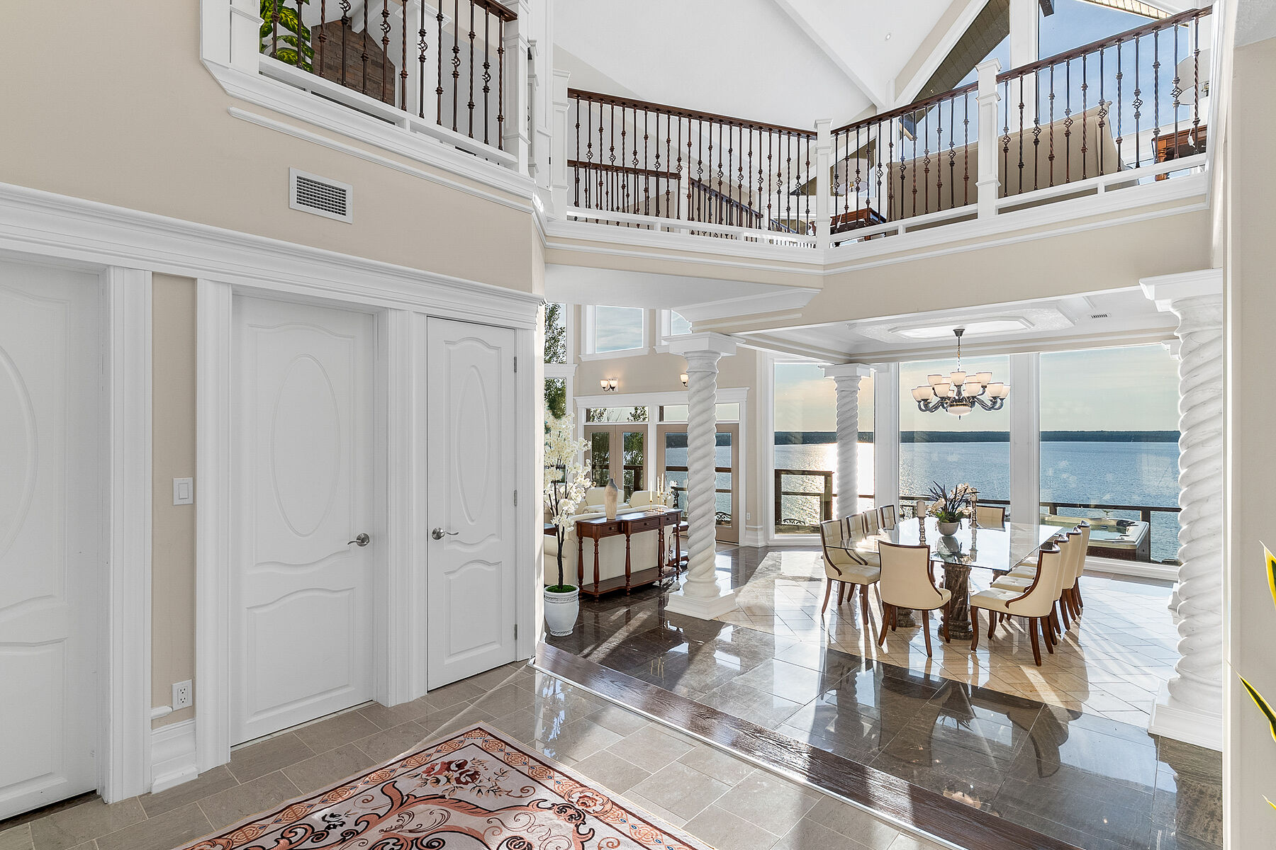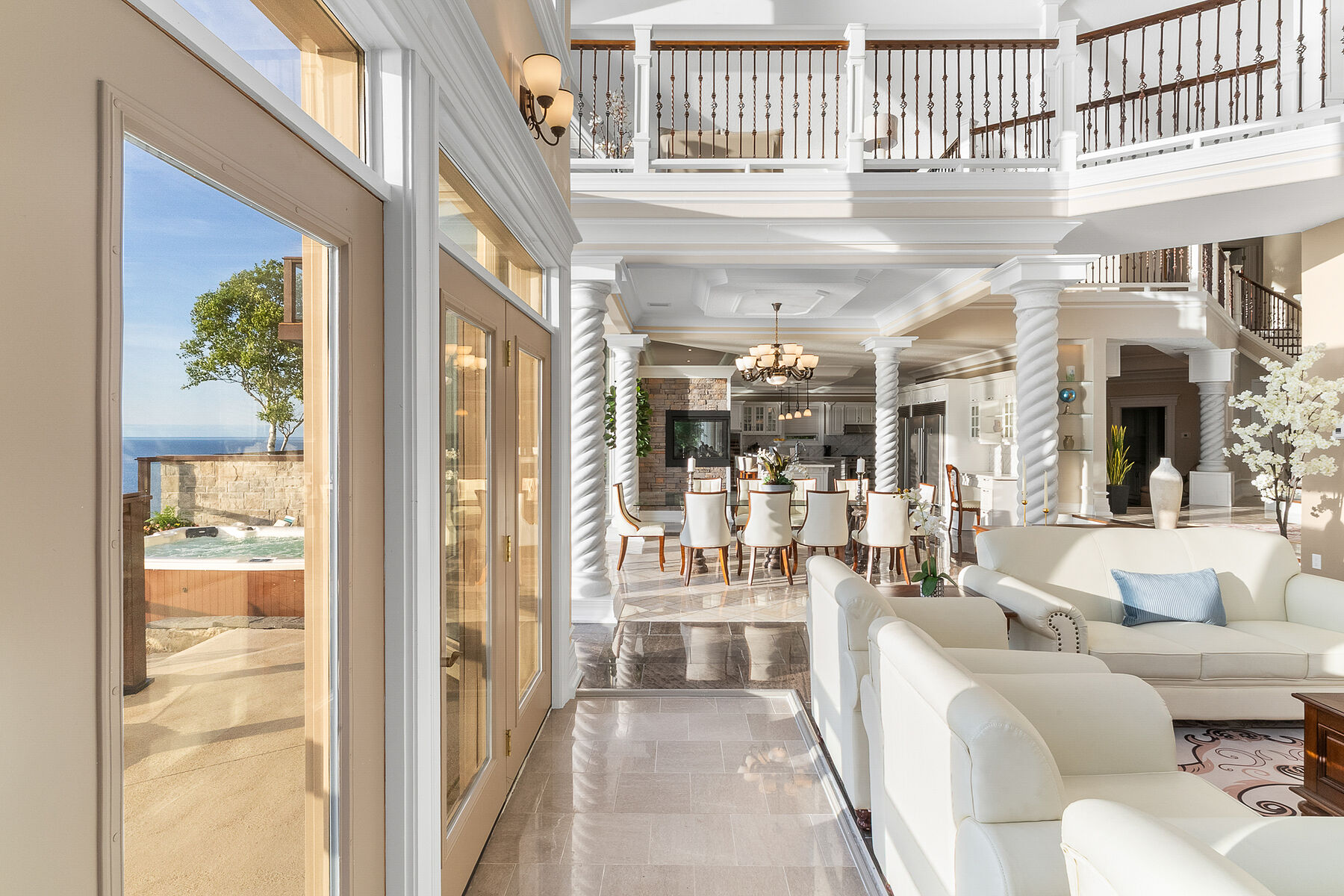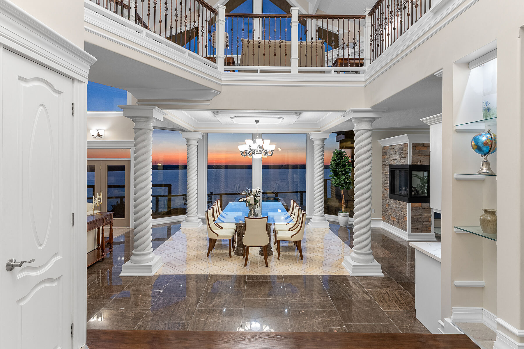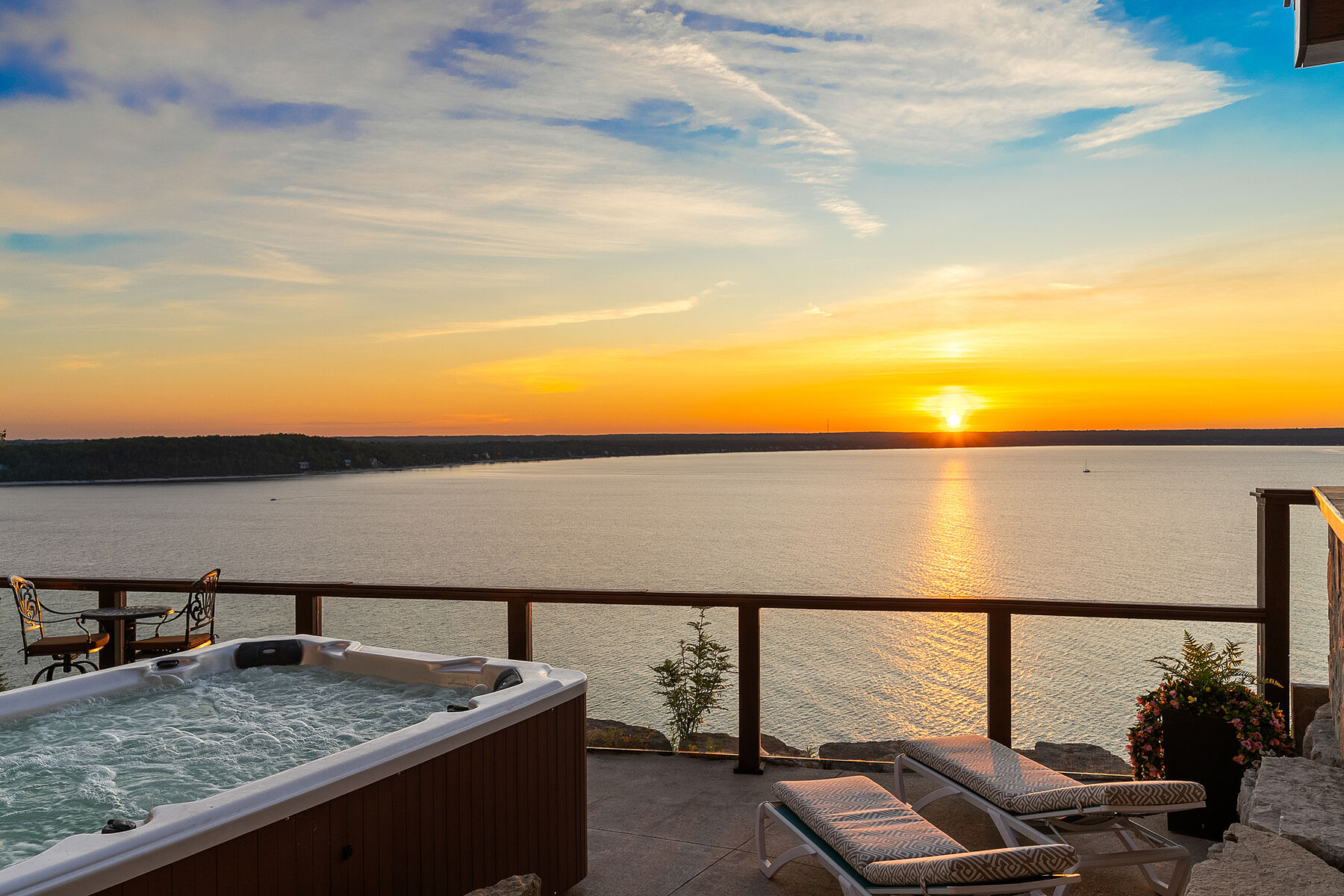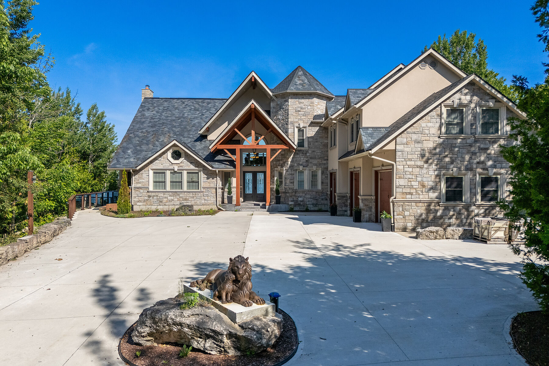 The Peninsula Perch is a 6,418 square foot cliffside masterpiece perched 300 feet above the turquoise waters of Georgian Bay, offering nearly four kilometres of uninterrupted northwest-facing views and world-class sunsets over Whippoorwill Bay. This architectural feat features R45 ICF construction from foundation to trusses, topped with a timeless slate roof and a concrete driveway leading to a triple-car garage with heated floors and EV charger rough-in. Inside, the great room boasts soaring 33-foot ceilings anchored by solid marble pillars and a grand fireplace with a custom marble mantle, while the mezzanine sitting area and primary bedroom balcony offer a front-row seat to the escarpment. The professional chef's kitchen is equipped with a large island induction cooktop with a pop-up air vent, a walk-in pantry, four Sub-Zero fridge/freezer units, two dishwashers, and an ice maker. Designed for comfort and efficiency, the home features radiant heated floors throughout and the convenience of primary bedroom laundry. The outdoor living space is a maintenance-free oasis with a covered porch, large hot tub, and high-end AstroTurf grounds, all situated in a designated Dark Sky community just 30 minutes from the 5,000-foot runway at Wiarton Keppel International Airport.