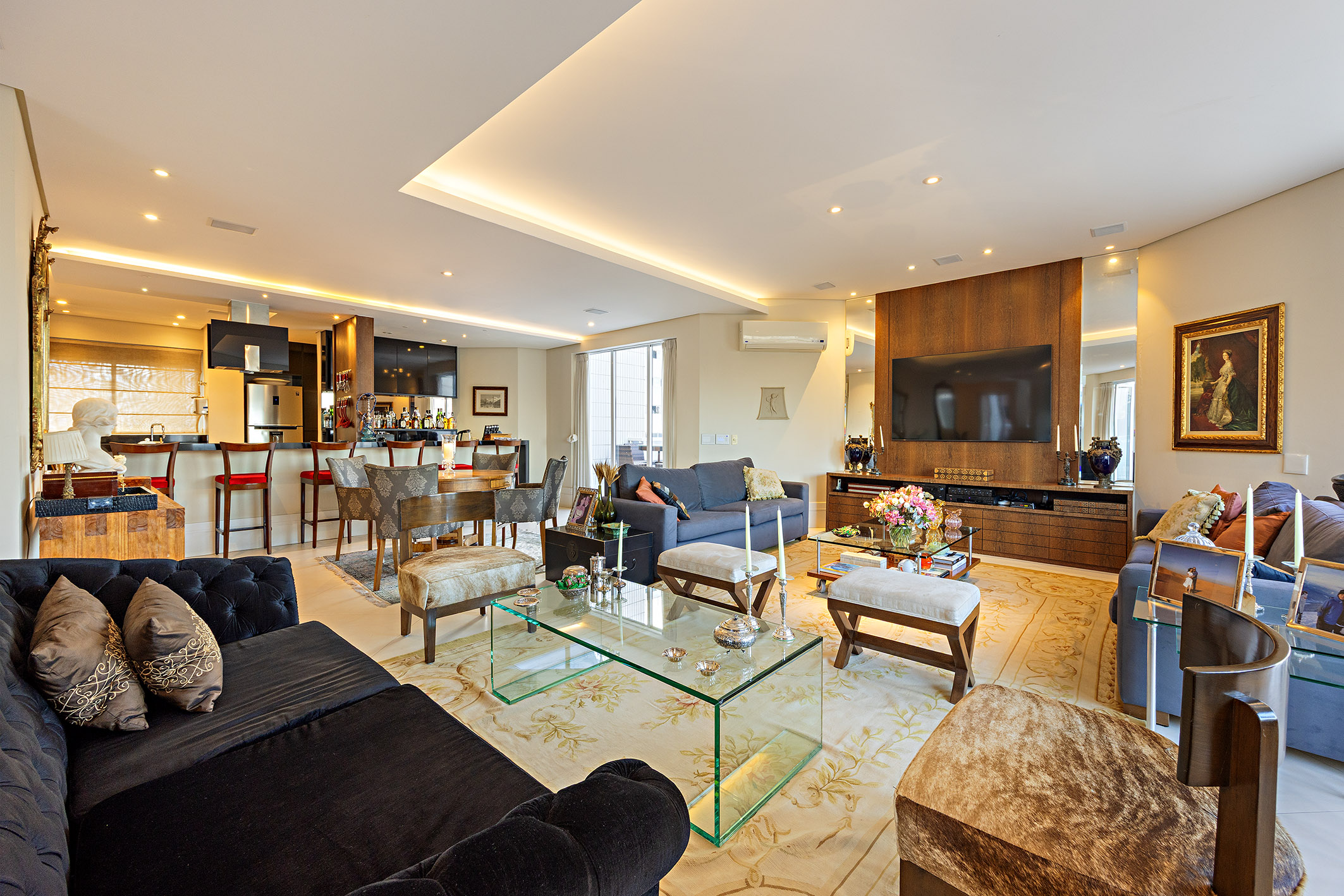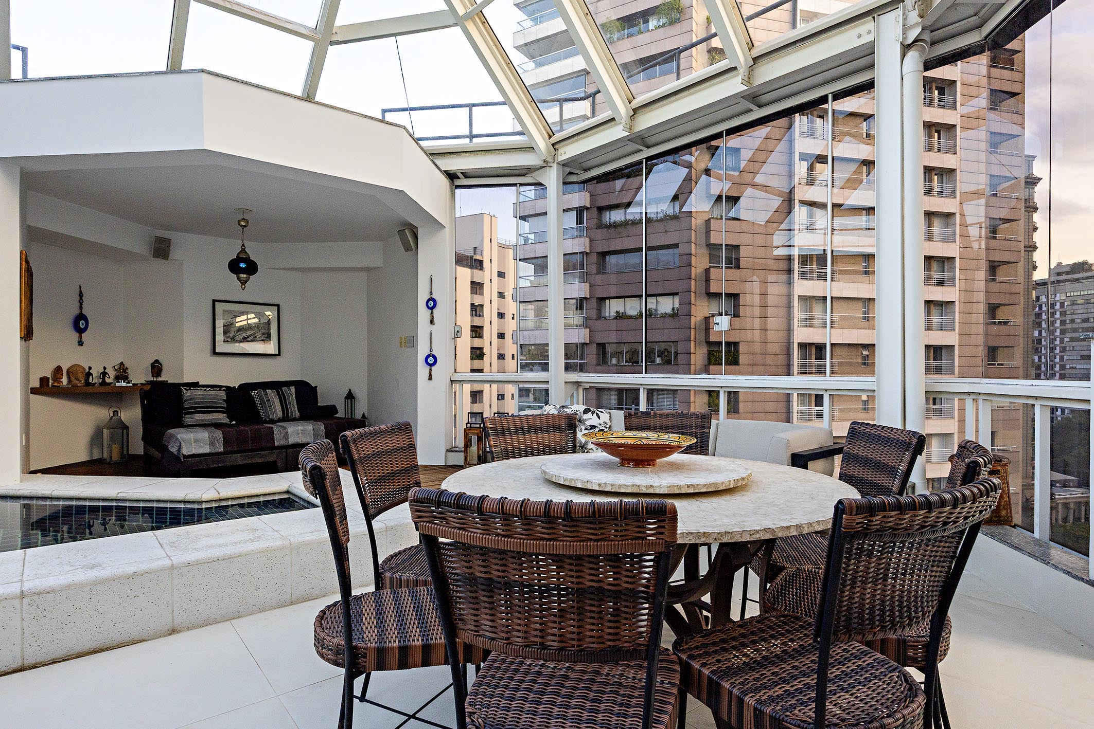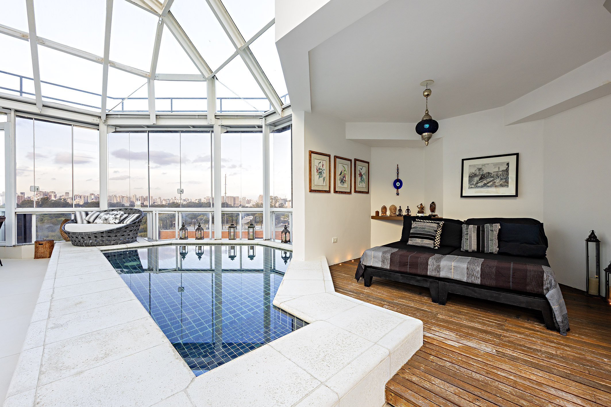 Located in one of São Paulo's most sought-after areas, just steps from Ibirapuera Park and Praça Milão, this duplex penthouse features an architectural design focused on open integration and maximizing skyline views. On the first floor, a spacious living room with multiple settings opens to terraces enclosed with retractable glass panels, creating a fluid and bright atmosphere. The social area also includes a fireplace, breakfast room, guest bathroom, pantry, planned kitchen, china cabinet, and storage room, along with four well-distributed suites. The second floor offers another expansive living space integrating a bar, dining area, game room, gourmet kitchen, and a covered gazebo with a pool, deck, sauna, and barbecue space—ideal for entertaining. The third level houses a cinema room that can also function as a private guest apartment, complete with a full bathroom, kitchenette, and office. The property includes six marked parking spaces and a storage unit. The building features a fully equipped gym and a security system with specialized infrastructure.