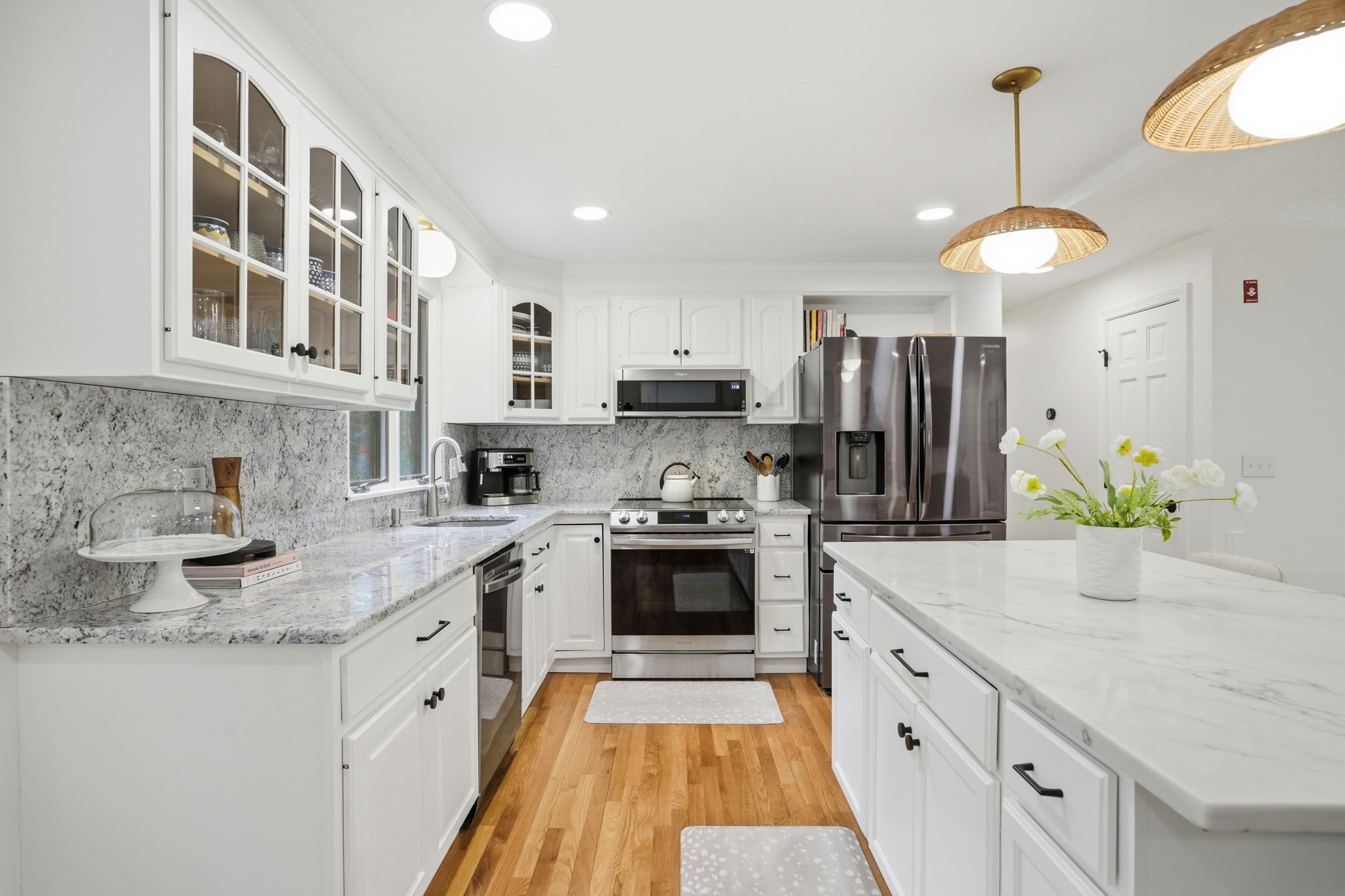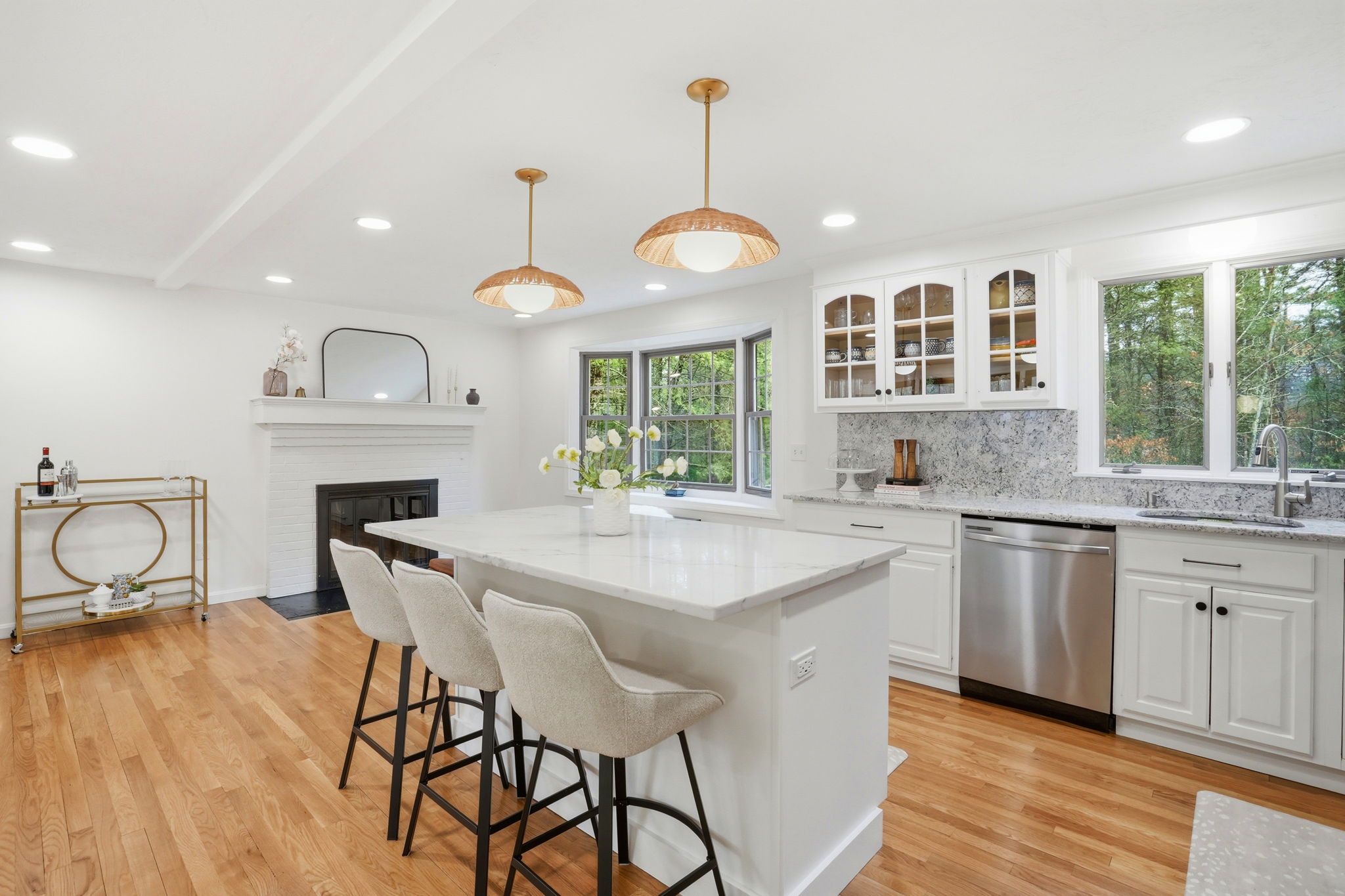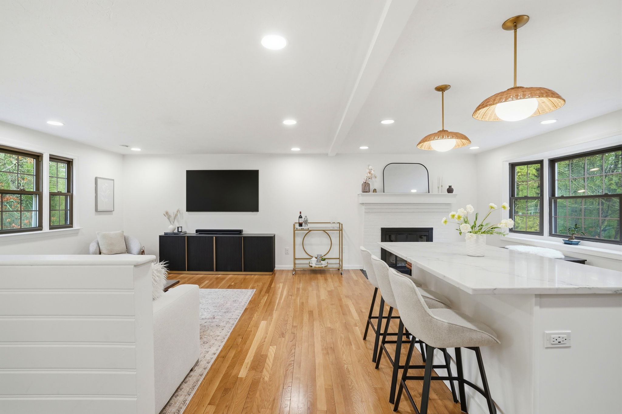 A pleasant surprise—spacious, bright, and beautifully updated, this 3–4 bedroom home is nestled in the heart of an established neighborhood. The main level offers open-concept living with a seamless flow ideal for everyday living and entertaining. Thoughtful updates include wood floors, marble countertops, a newer center island, and updated lighting, fixtures, and hardware throughout. The lower level provides exceptional flexibility with a playroom or family room, a three-season porch, and a unique guest or primary suite—perfect for extended living or private space. Step outside to a backyard designed for enjoyment, featuring an in-ground pool and a freestanding fireplace, creating the perfect setting for recreation and entertaining. Well maintained inside and out, this home offers space, comfort, and a lifestyle to be enjoyed year-round.