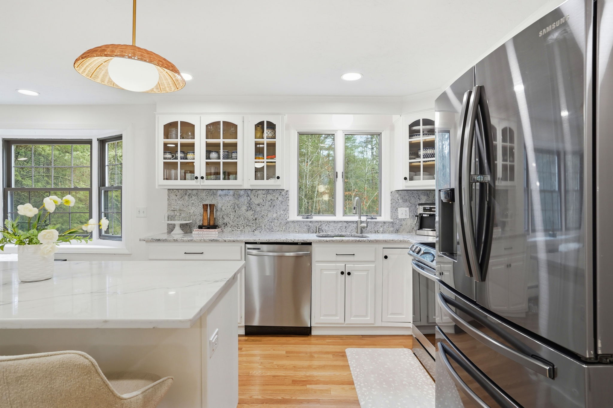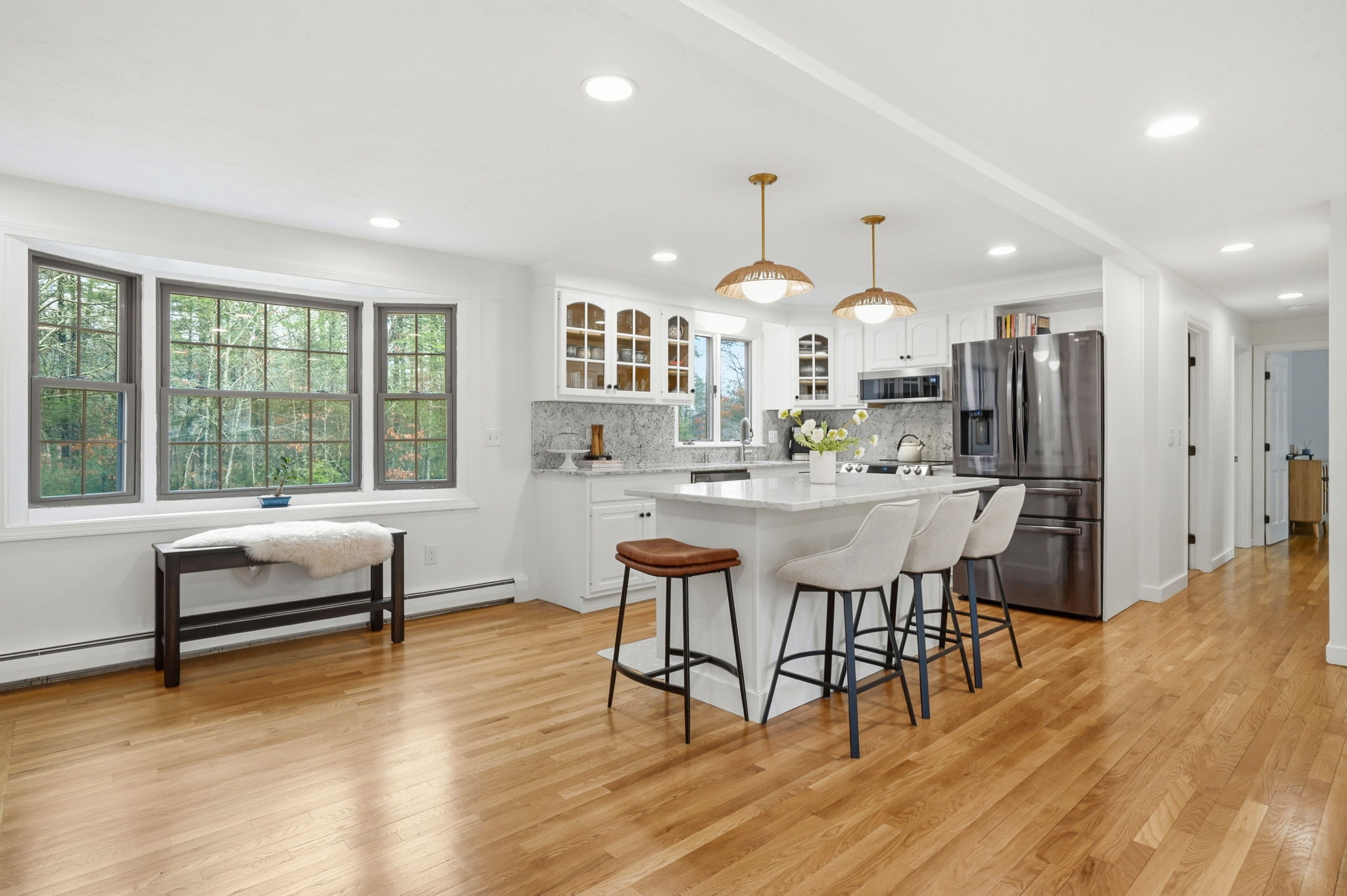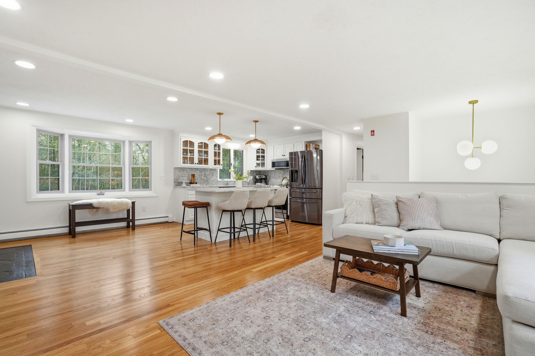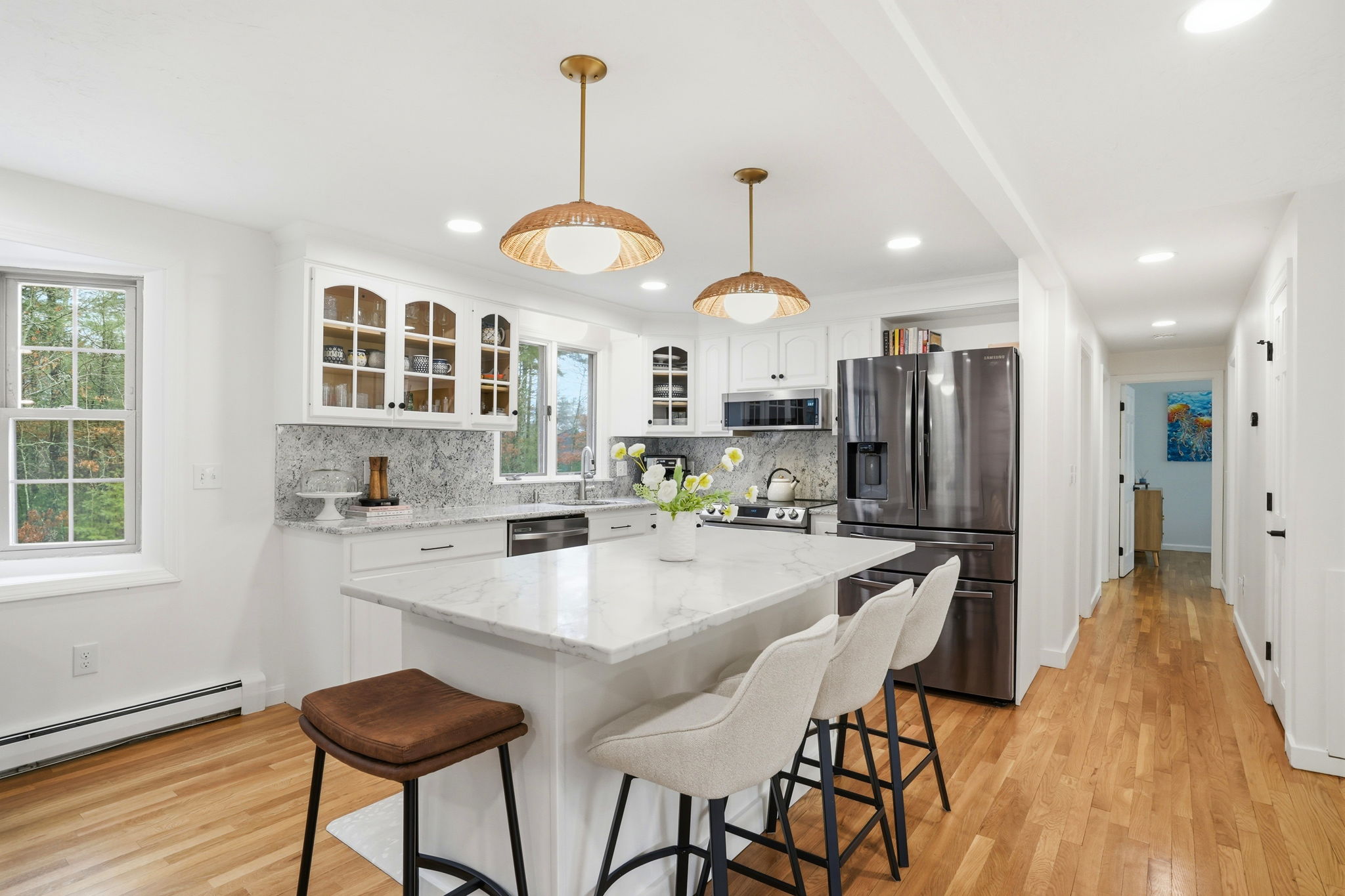 A pleasant surprise—spacious, bright, and beautifully updated, this 3–4 bedroom home is nestled in the heart of an established neighborhood. The main level offers open-concept living with a seamless flow ideal for everyday living and entertaining. Thoughtful updates include wood floors, marble countertops, a newer center island, and updated lighting, fixtures, and hardware throughout. The lower level provides exceptional flexibility with a playroom or family room, a three-season porch, and a unique guest or primary suite—perfect for extended living or private space. Step outside to a backyard designed for enjoyment, featuring an in-ground pool and a freestanding fireplace, creating the perfect setting for recreation and entertaining. Well maintained inside and out, this home offers space, comfort, and a lifestyle to be enjoyed year-round.